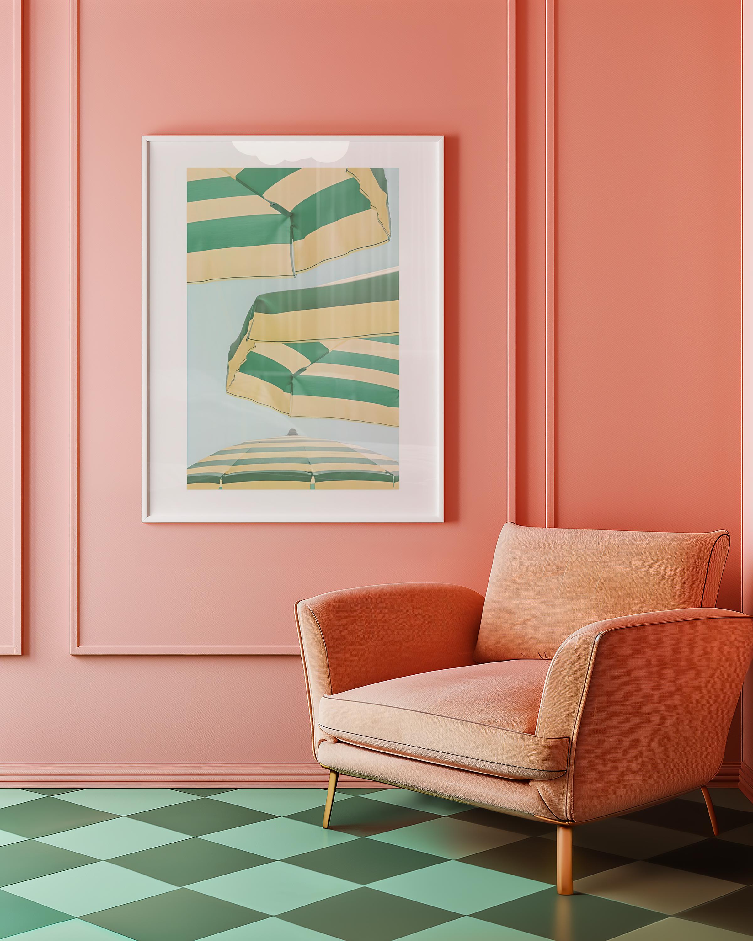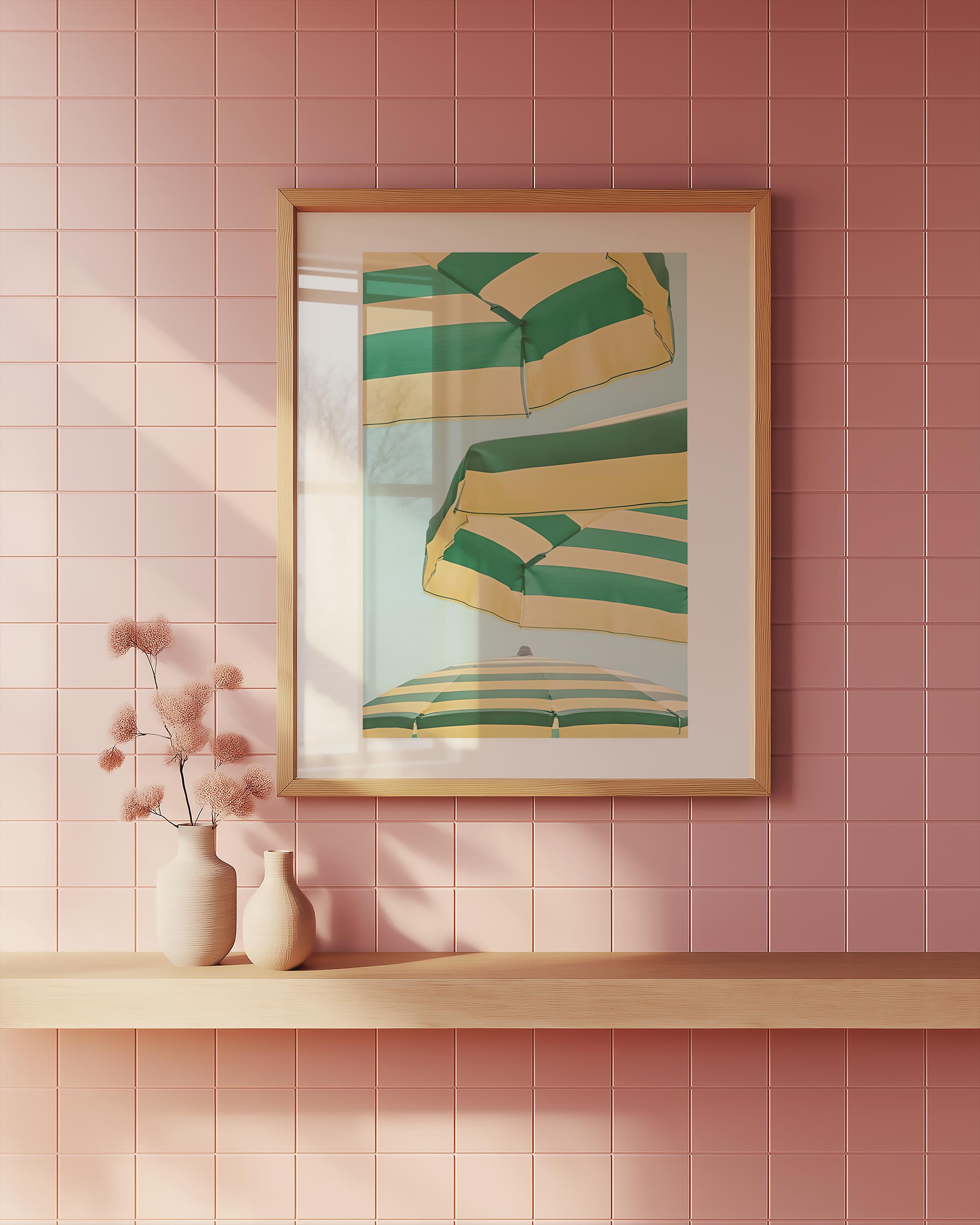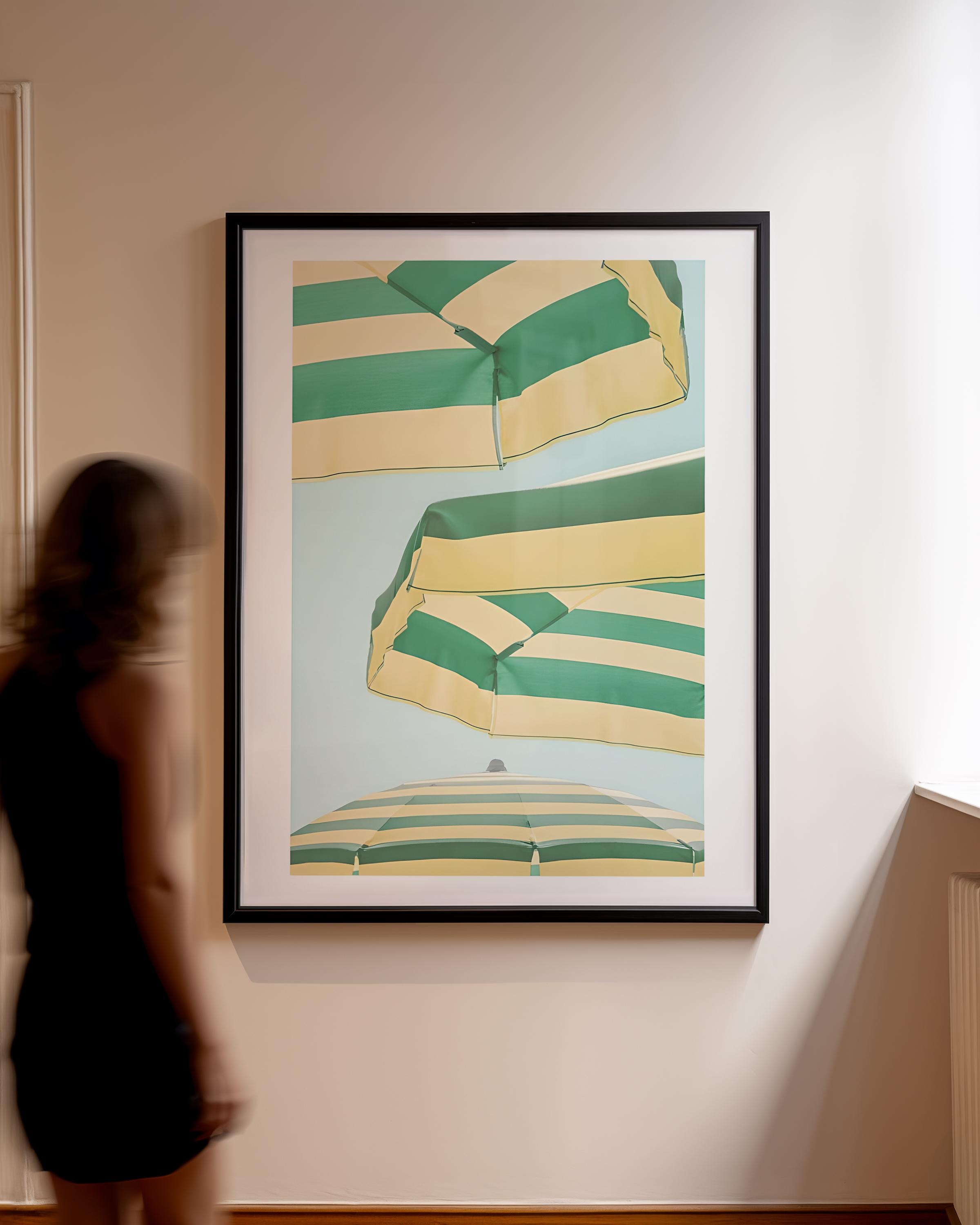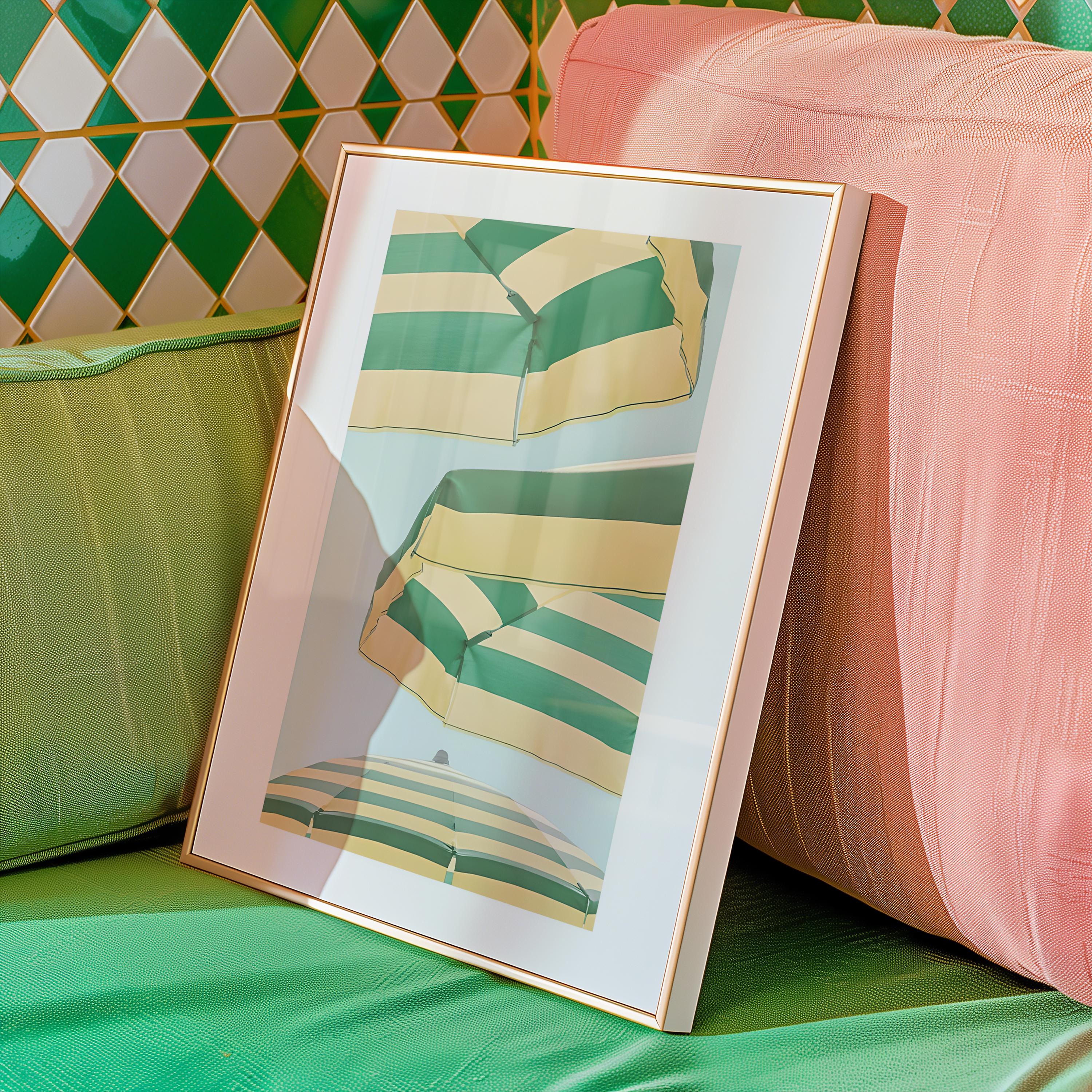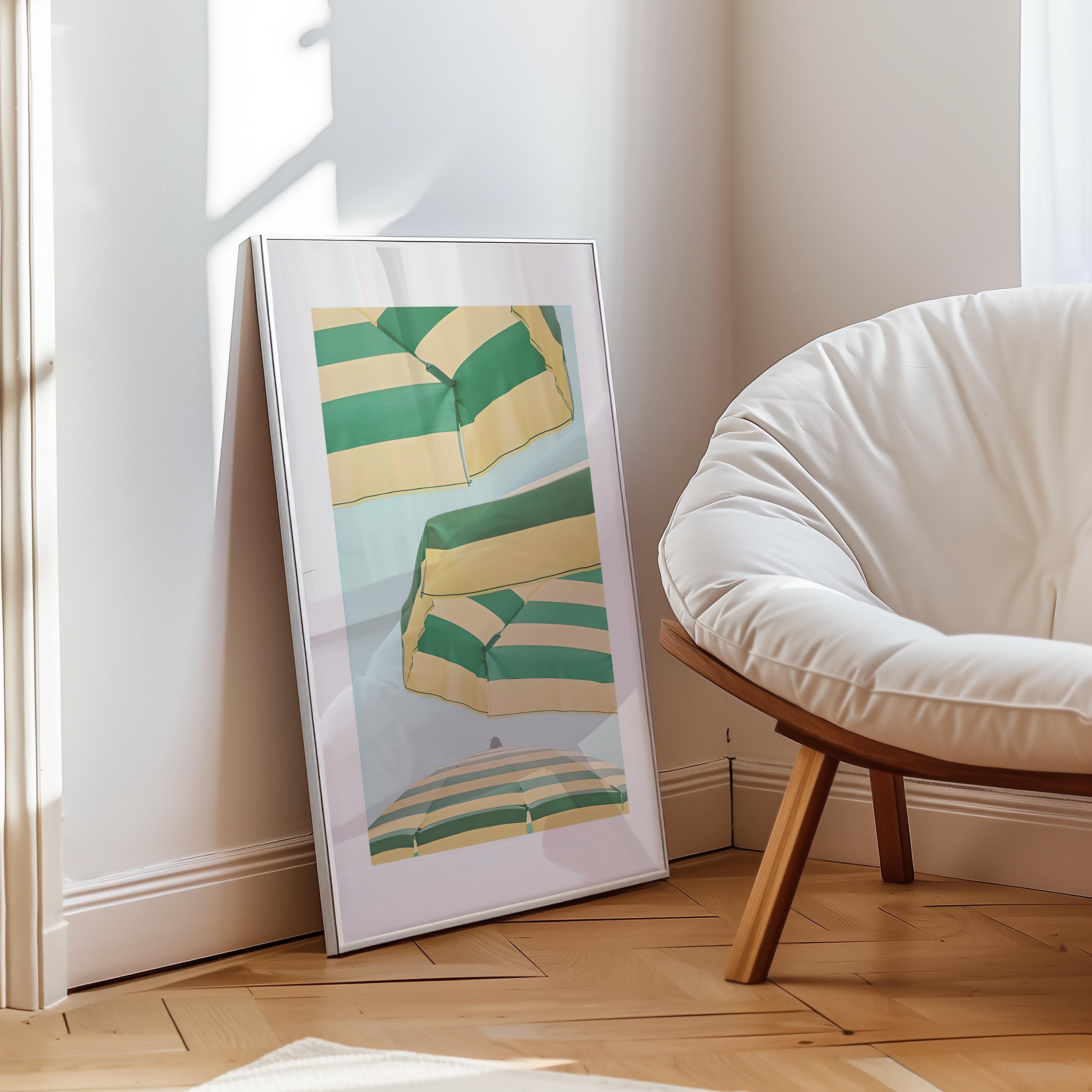 Digital Download | This minimalist coastal umbrella digital download is a perfect digital download for anyone looking to add a fresh, modern touch to their summer decor. Featuring calming green and yellow stripes that evoke beachside relaxation, this piece stands out with its clean lines and airy composition, making it a tasteful, easy-to-access wall art option.