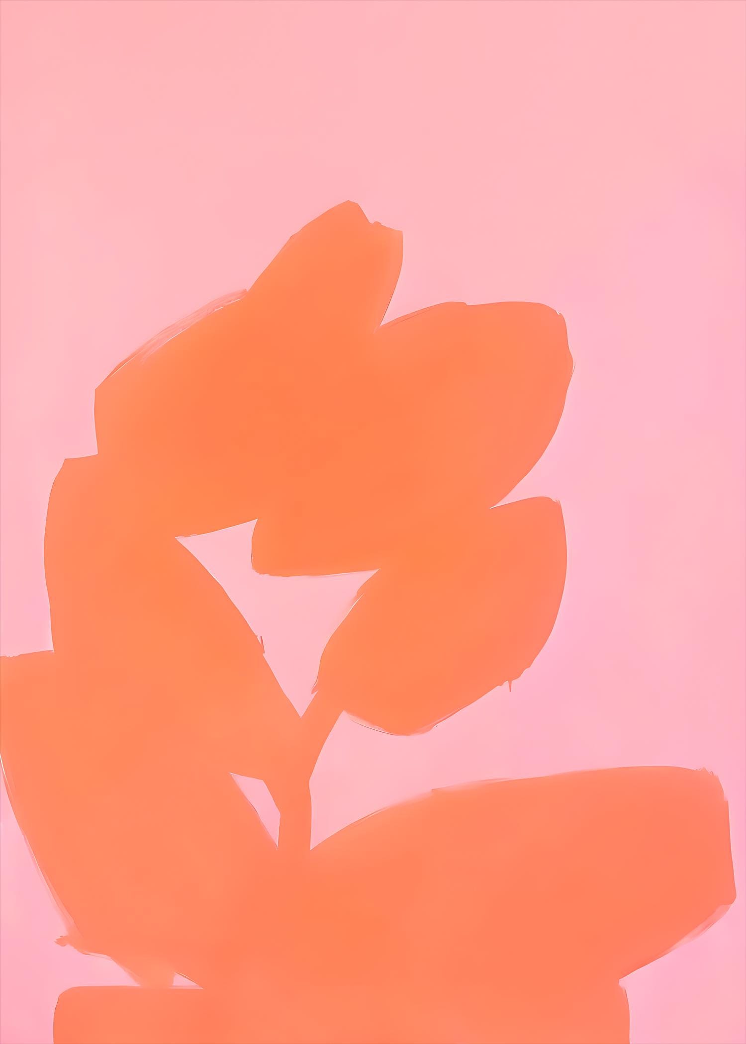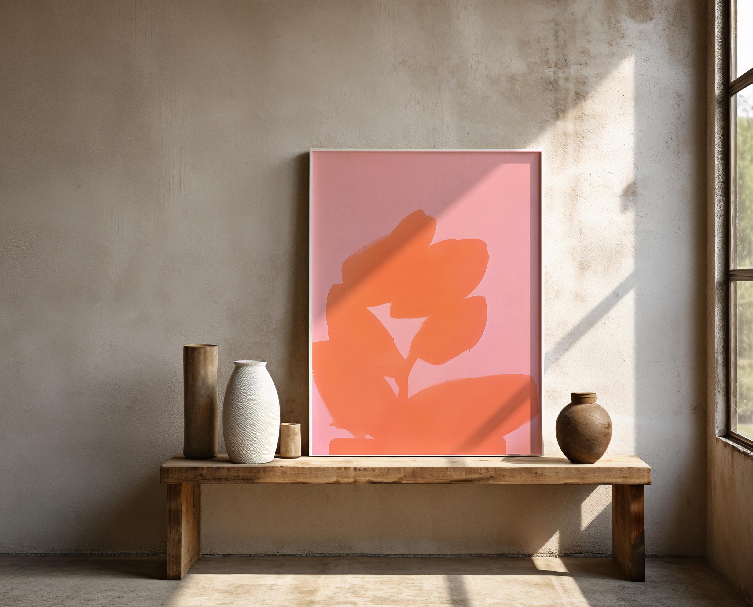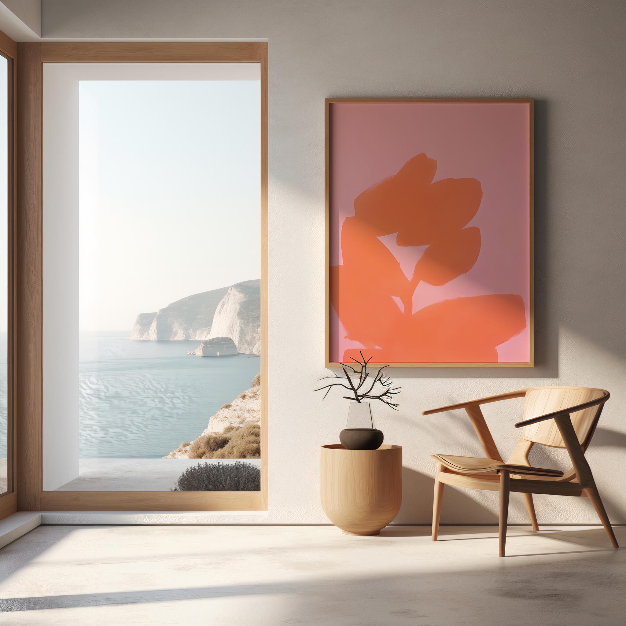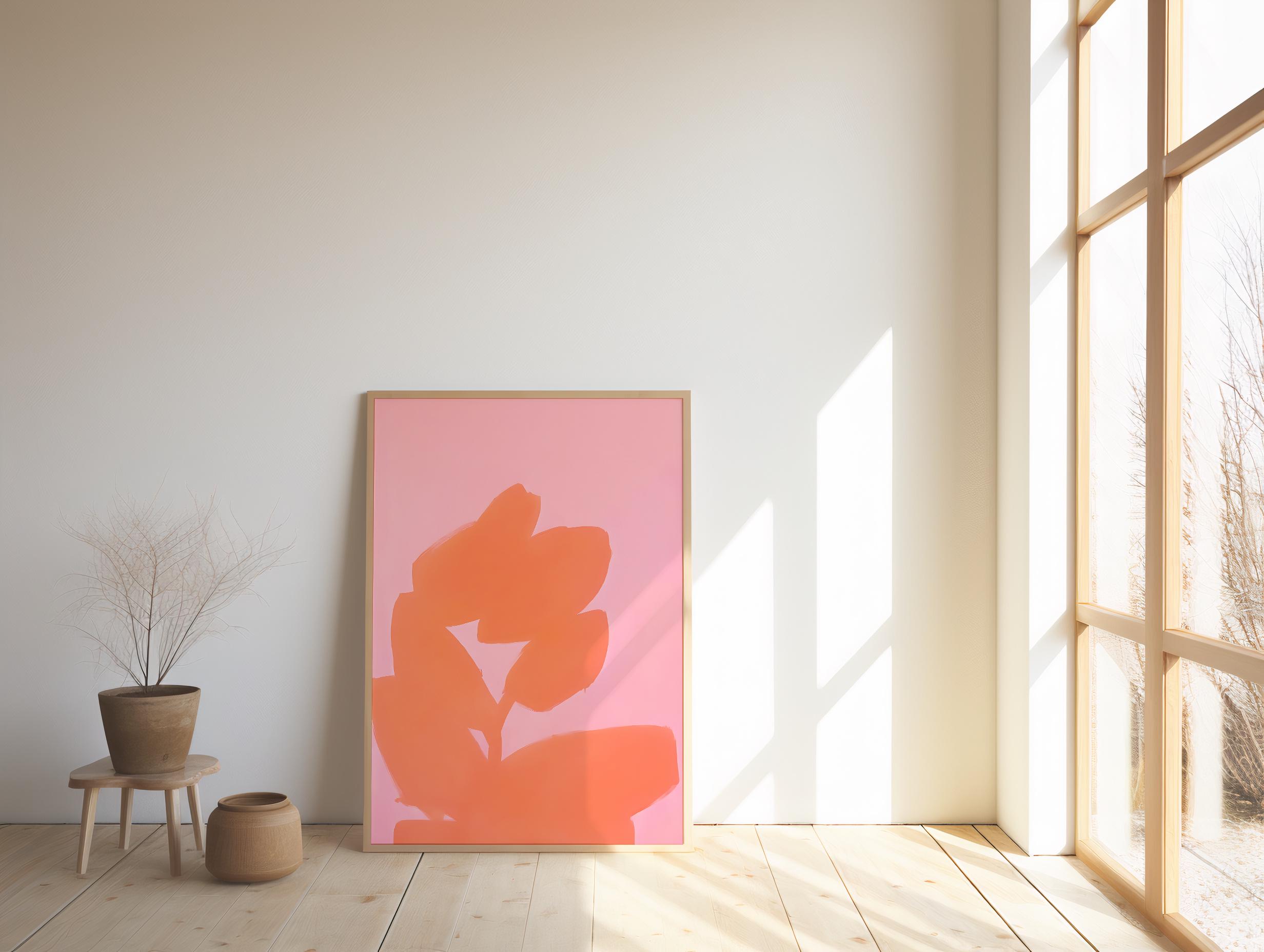 A bold yet minimal abstract composition featuring soft blush pink paired with a vibrant coral brushstroke form. The organic shape creates movement and warmth while maintaining a clean, modern aesthetic.