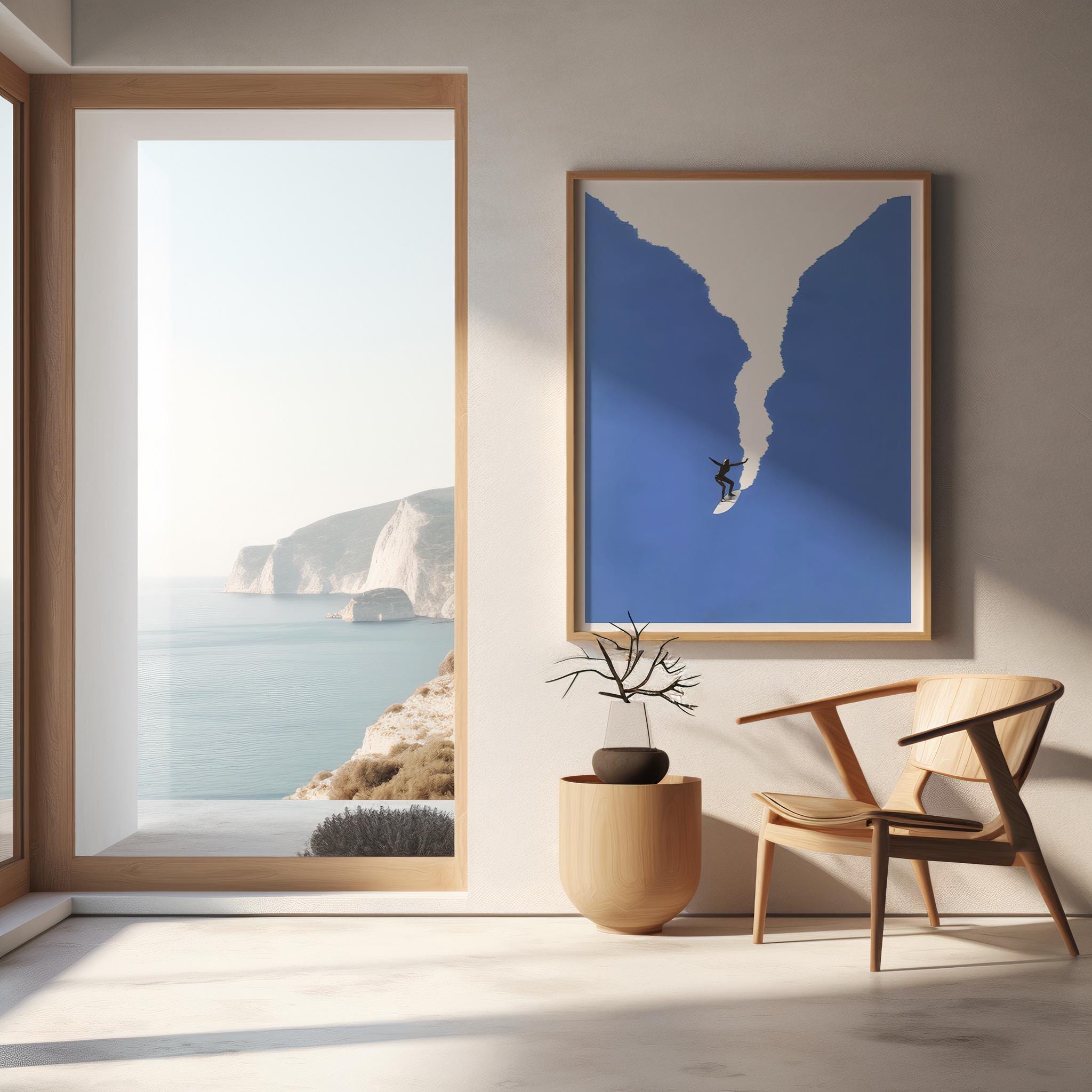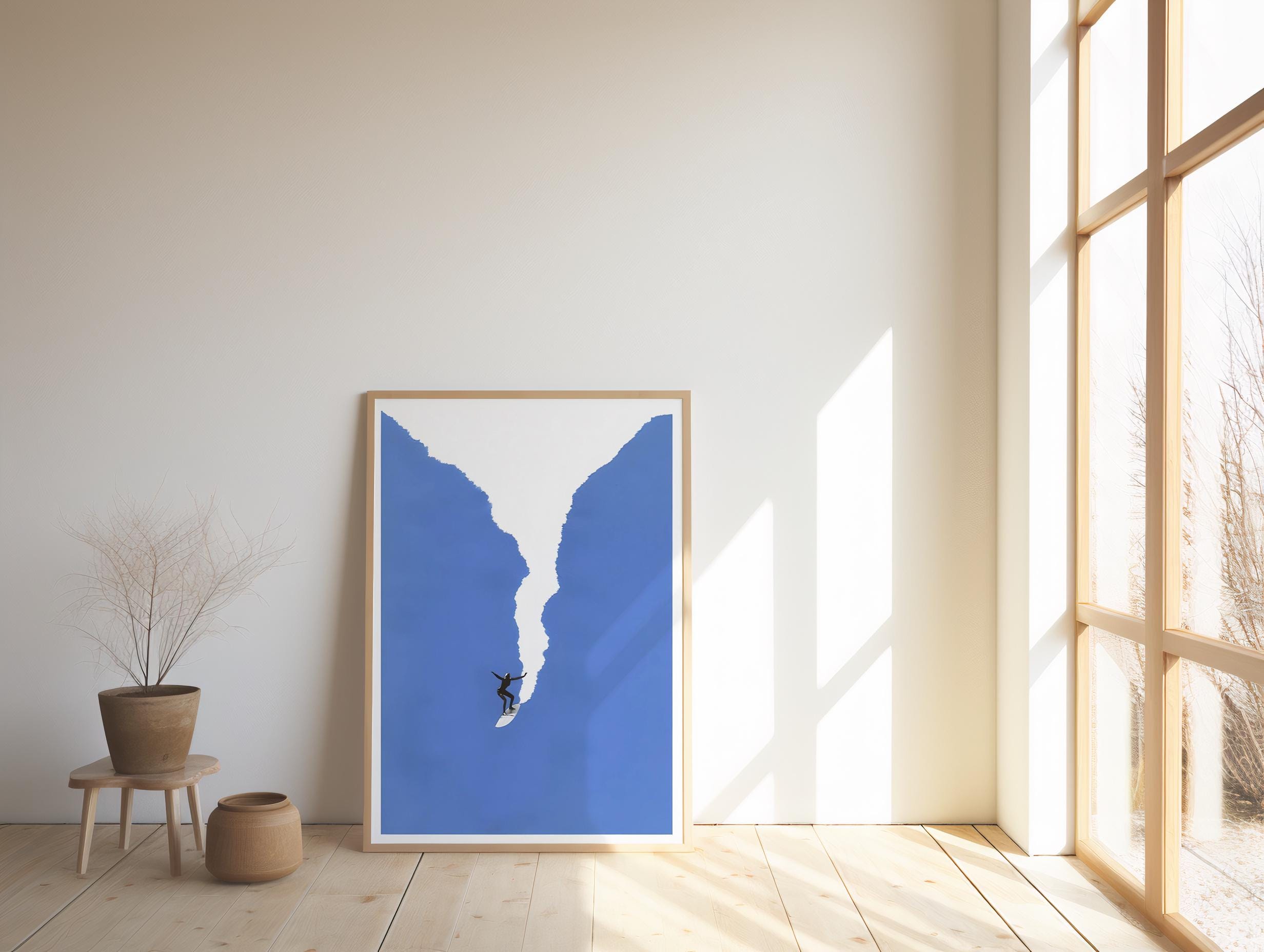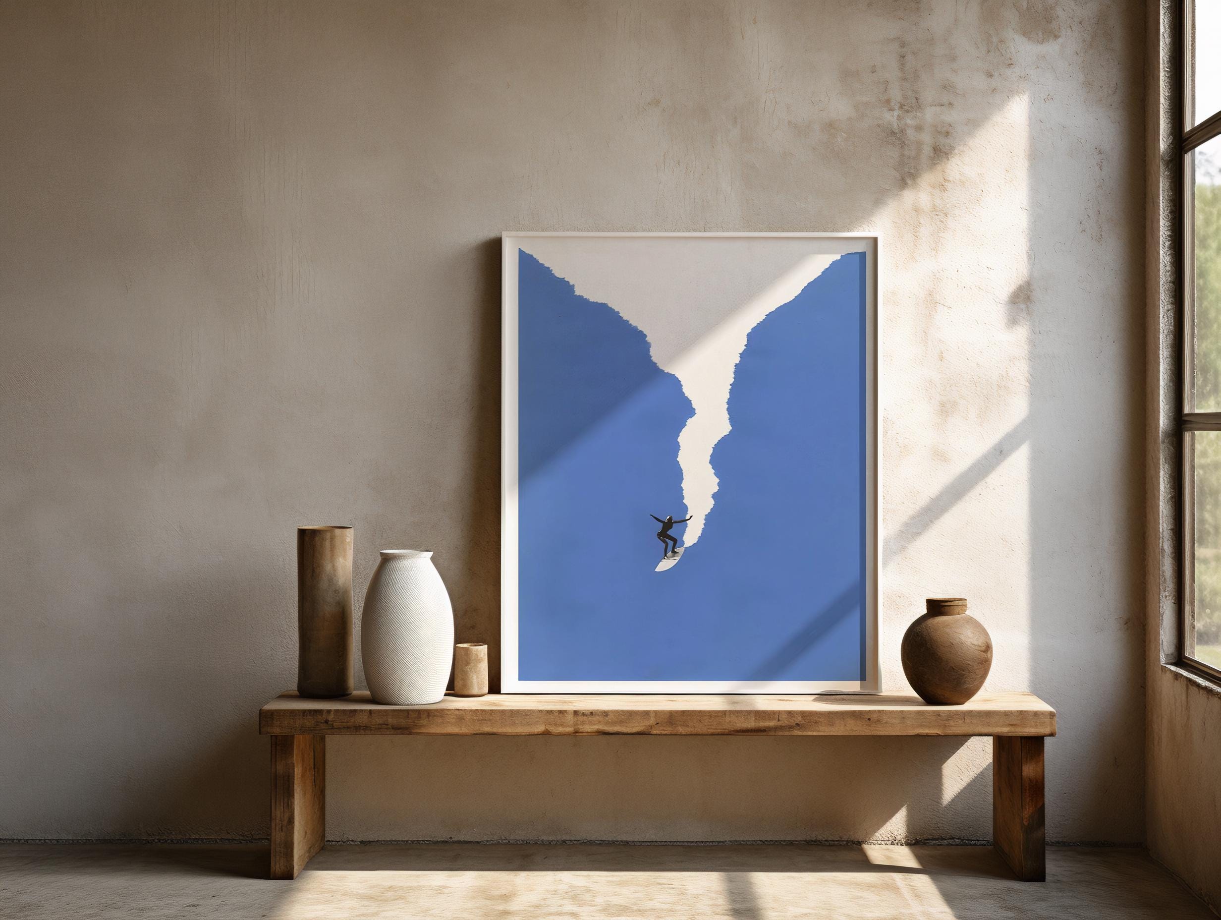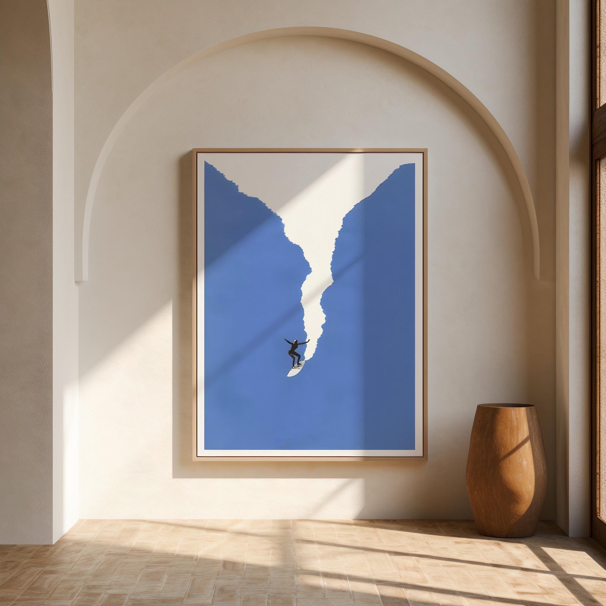 A bold minimalist surf artwork featuring a lone surfer riding a dramatic white break against a deep blue backdrop. Perfect for coastal interiors, beach homes, modern minimal spaces, and anyone who loves surf culture with a clean aesthetic.