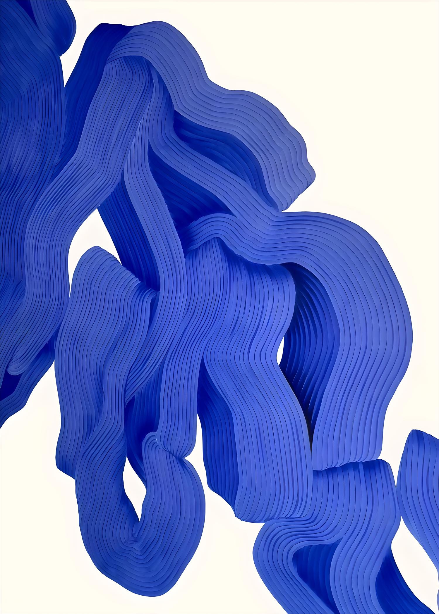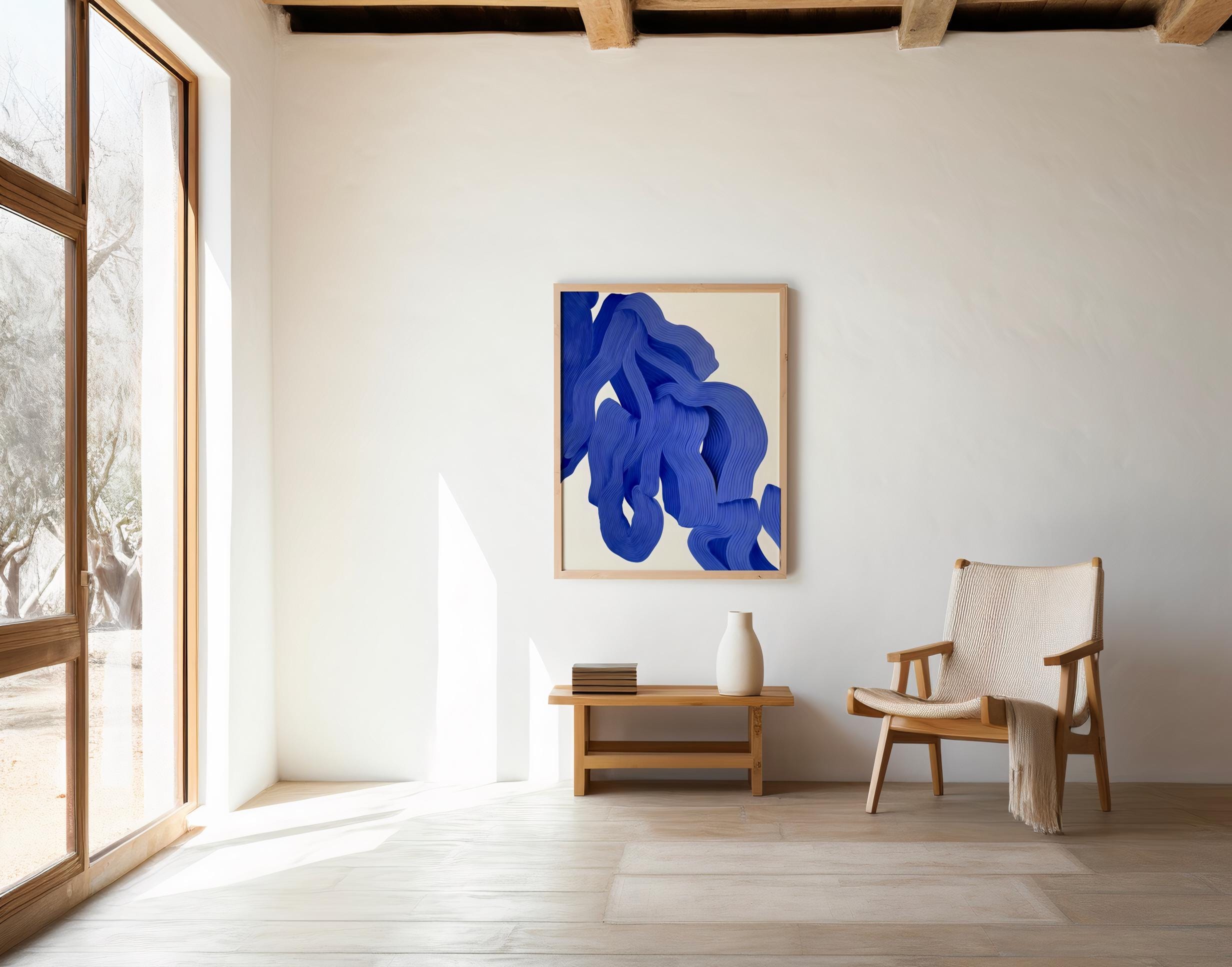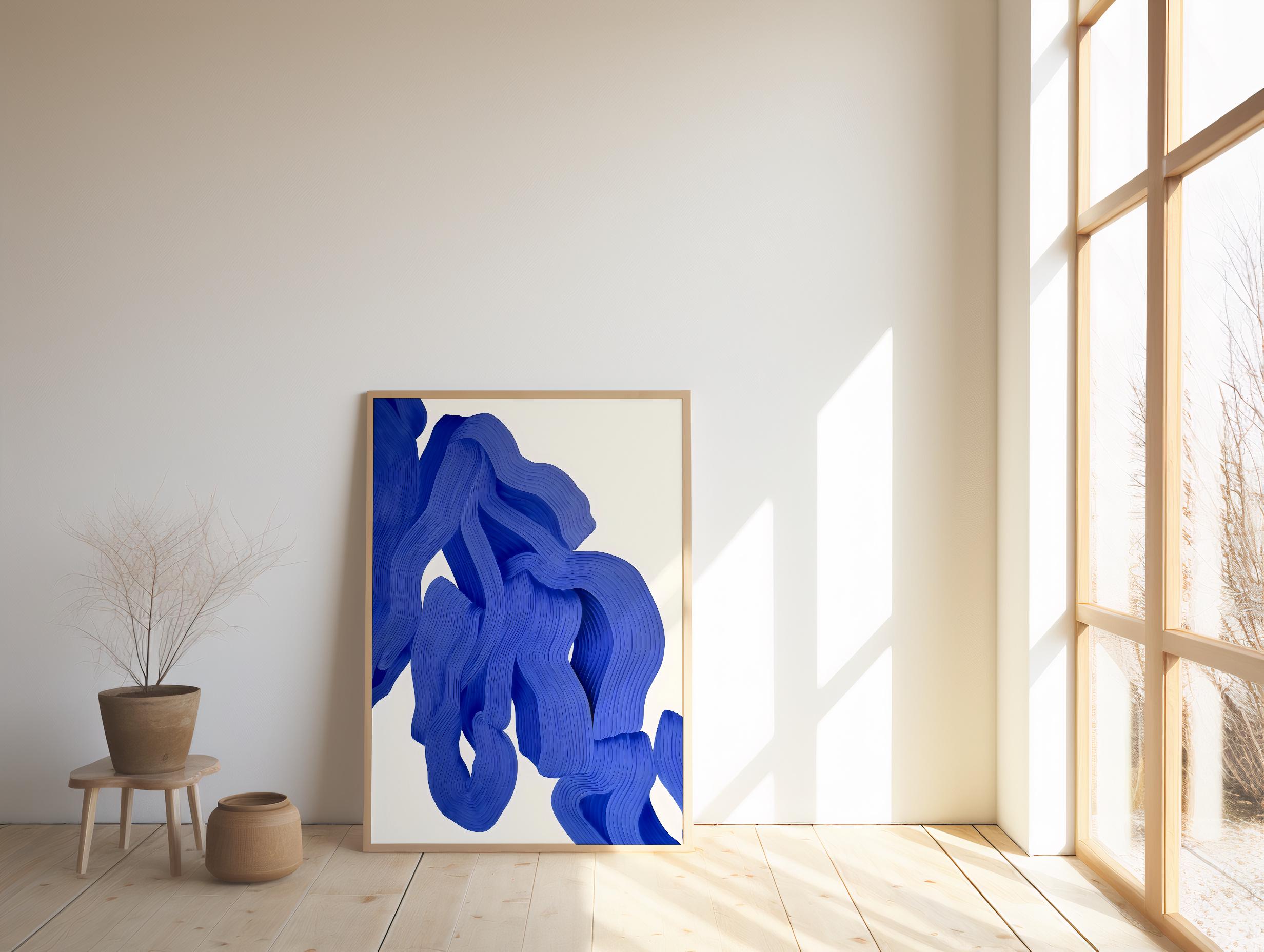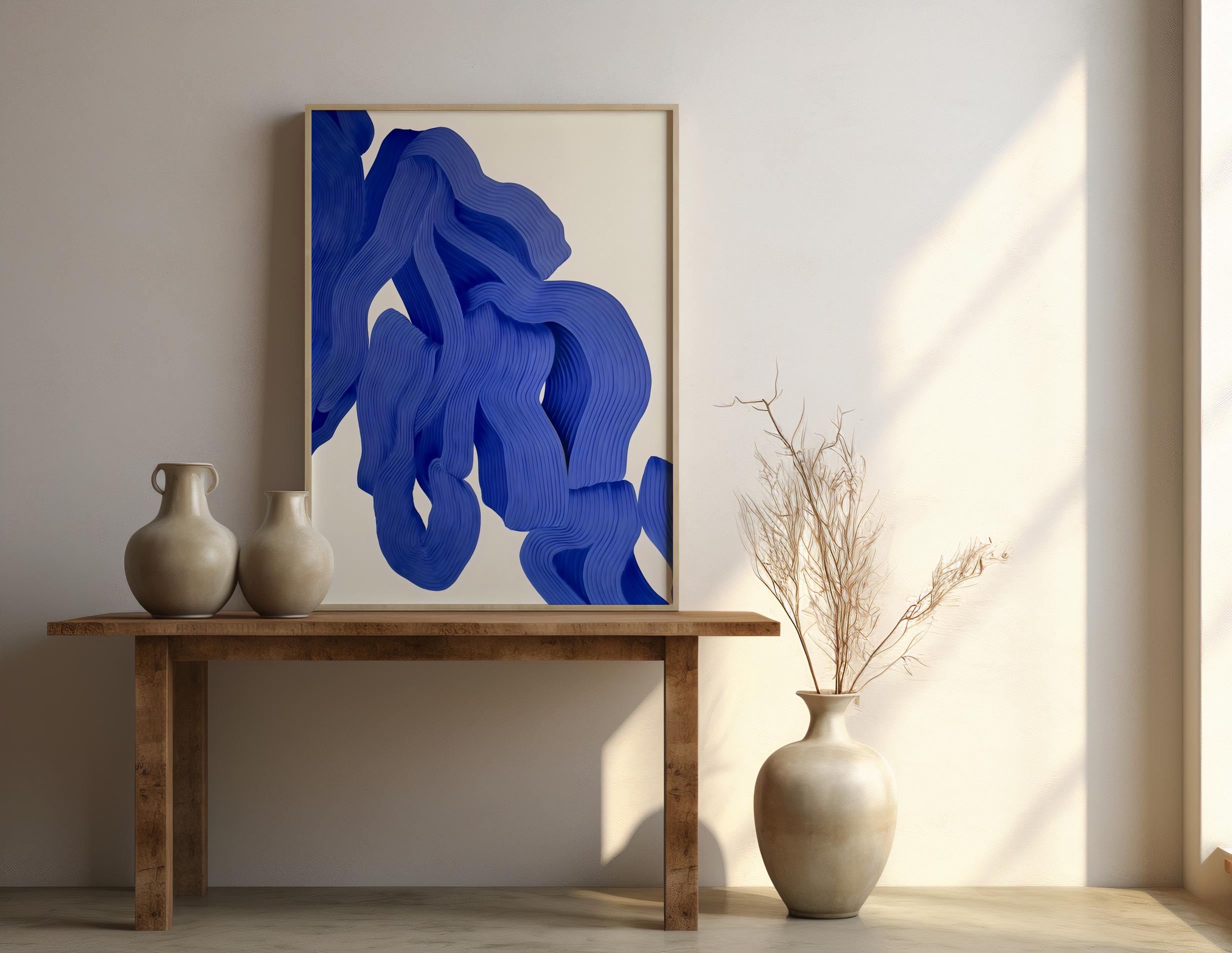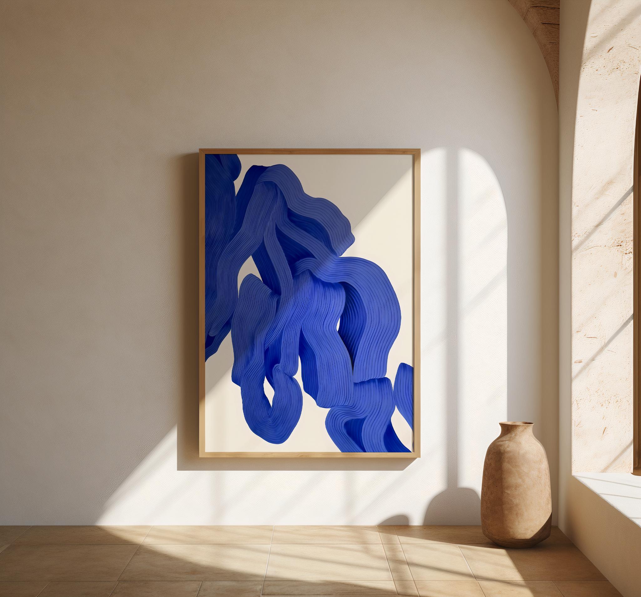 A striking modern abstract artwork featuring flowing blue forms with sculptural, layered line detail. Bold yet refined, this piece adds depth, movement, and contemporary elegance to any space while maintaining a clean, minimalist feel.