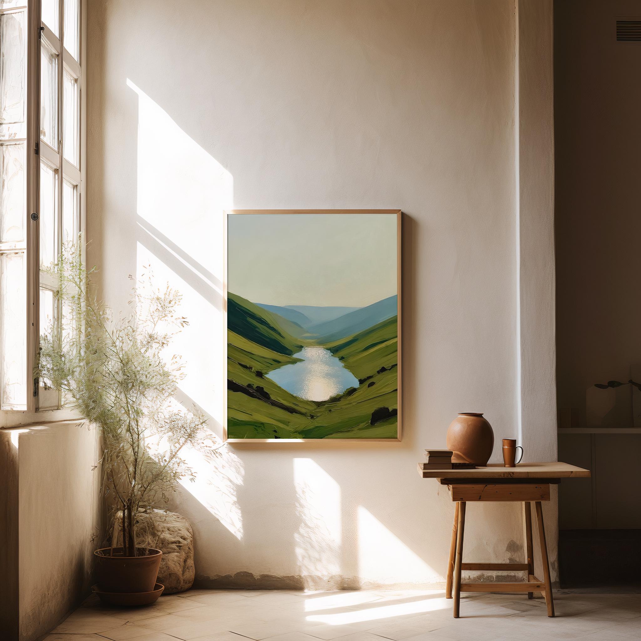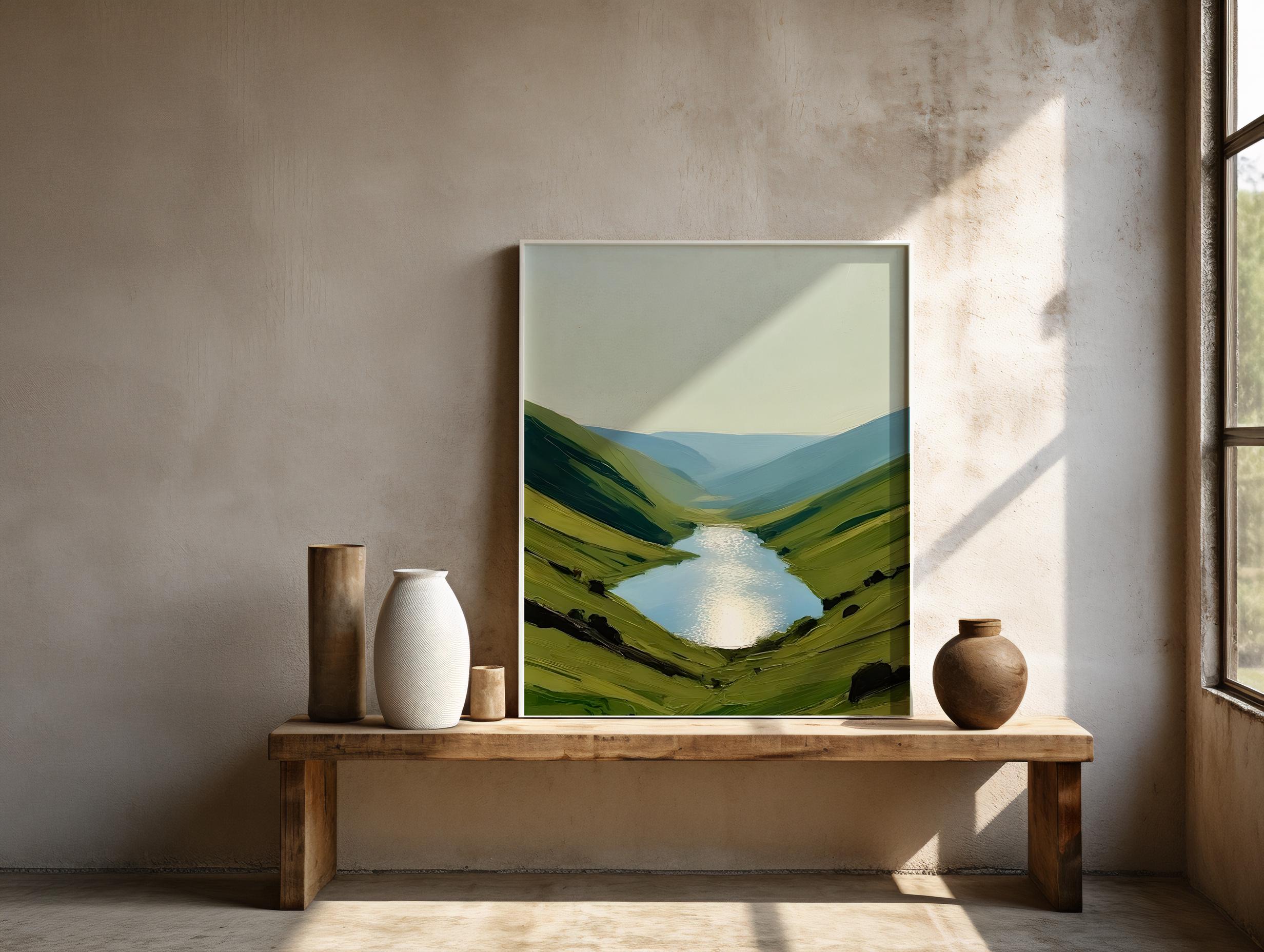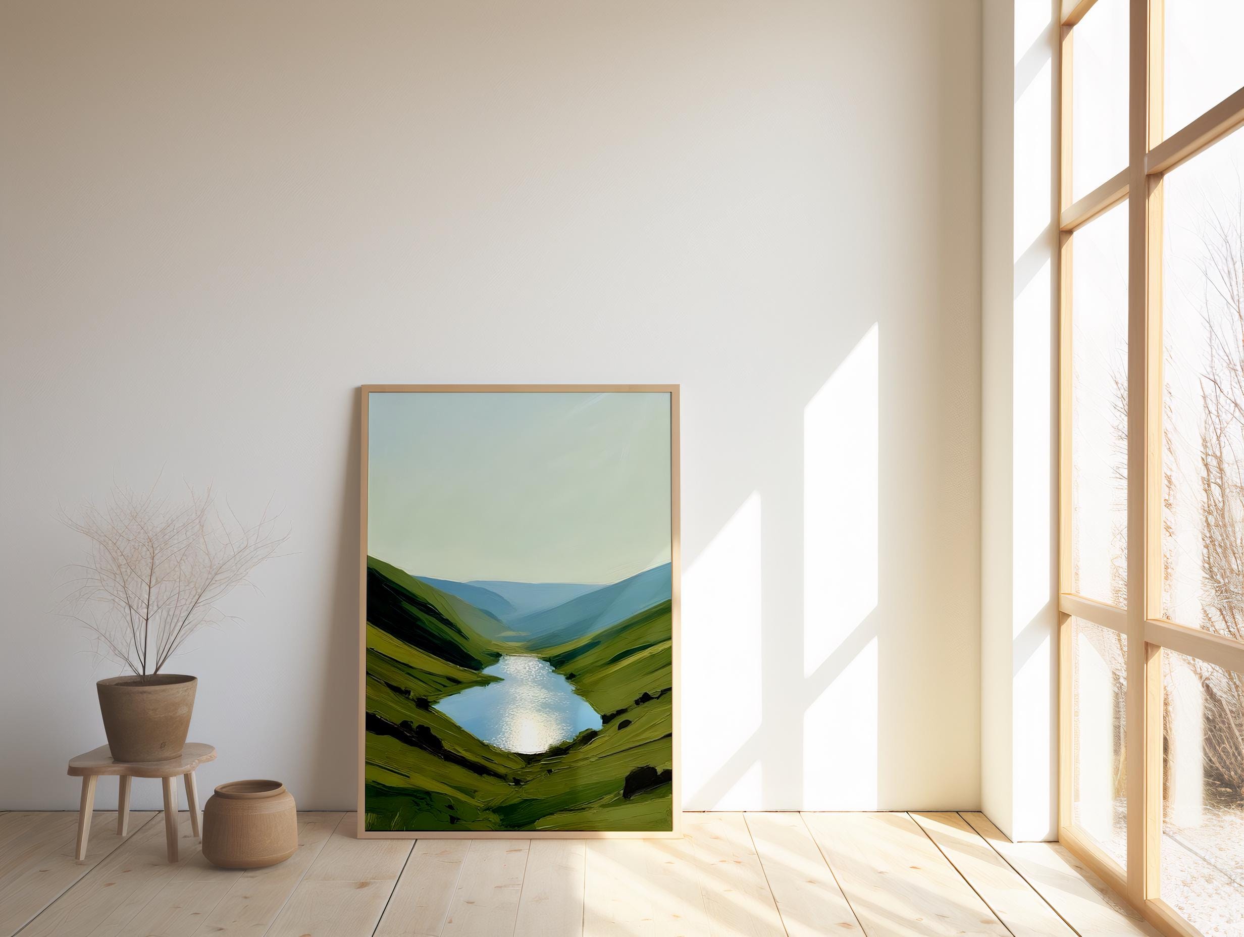 Experience the calming beauty of nature with this digital download of a serene landscape featuring reflective waters and rolling hills. This high-resolution artwork is perfect for adding a peaceful touch to any room, ideal for those seeking tranquility in their home or office. Offered as a downloadable file, you can print it in a variety of sizes that suit your space and style.