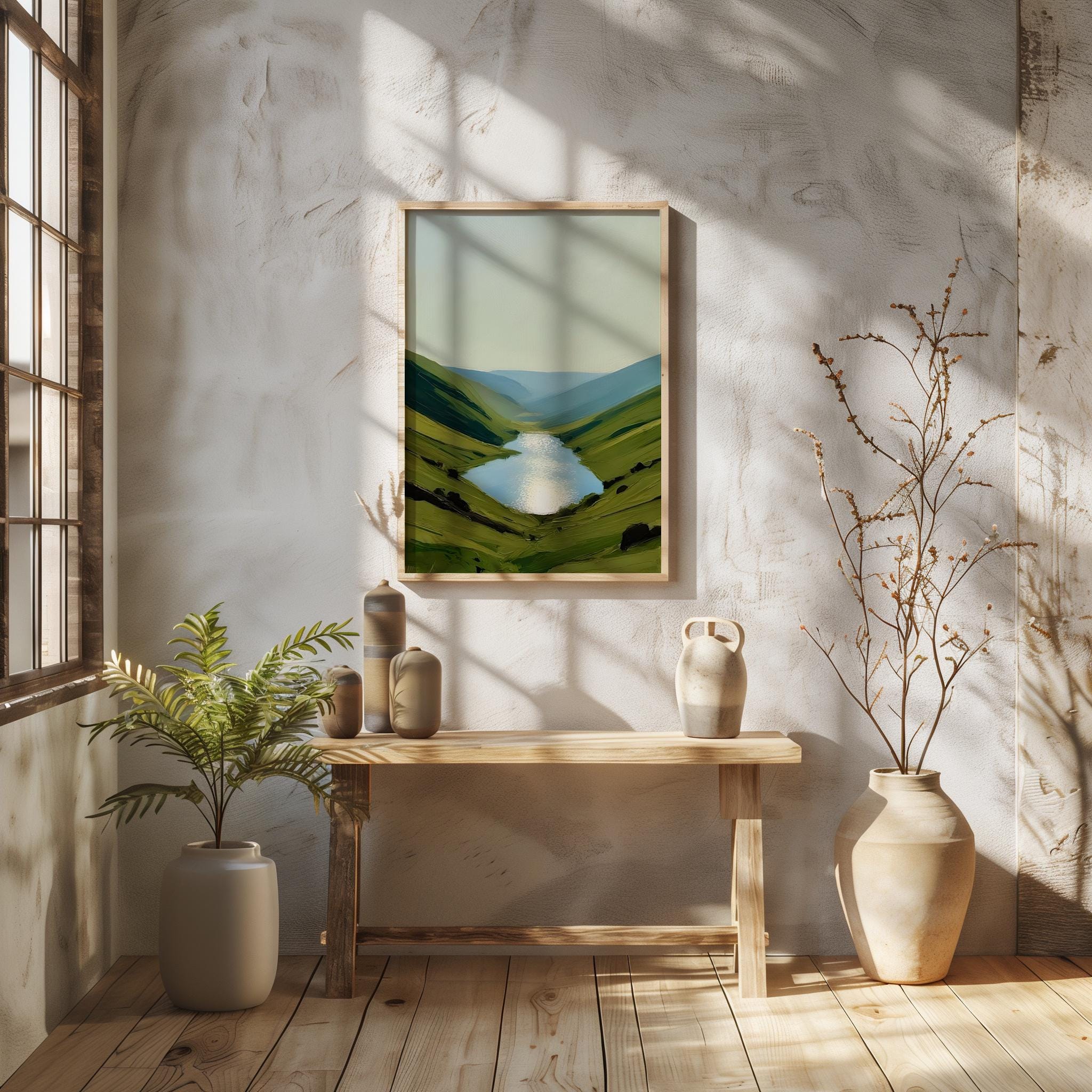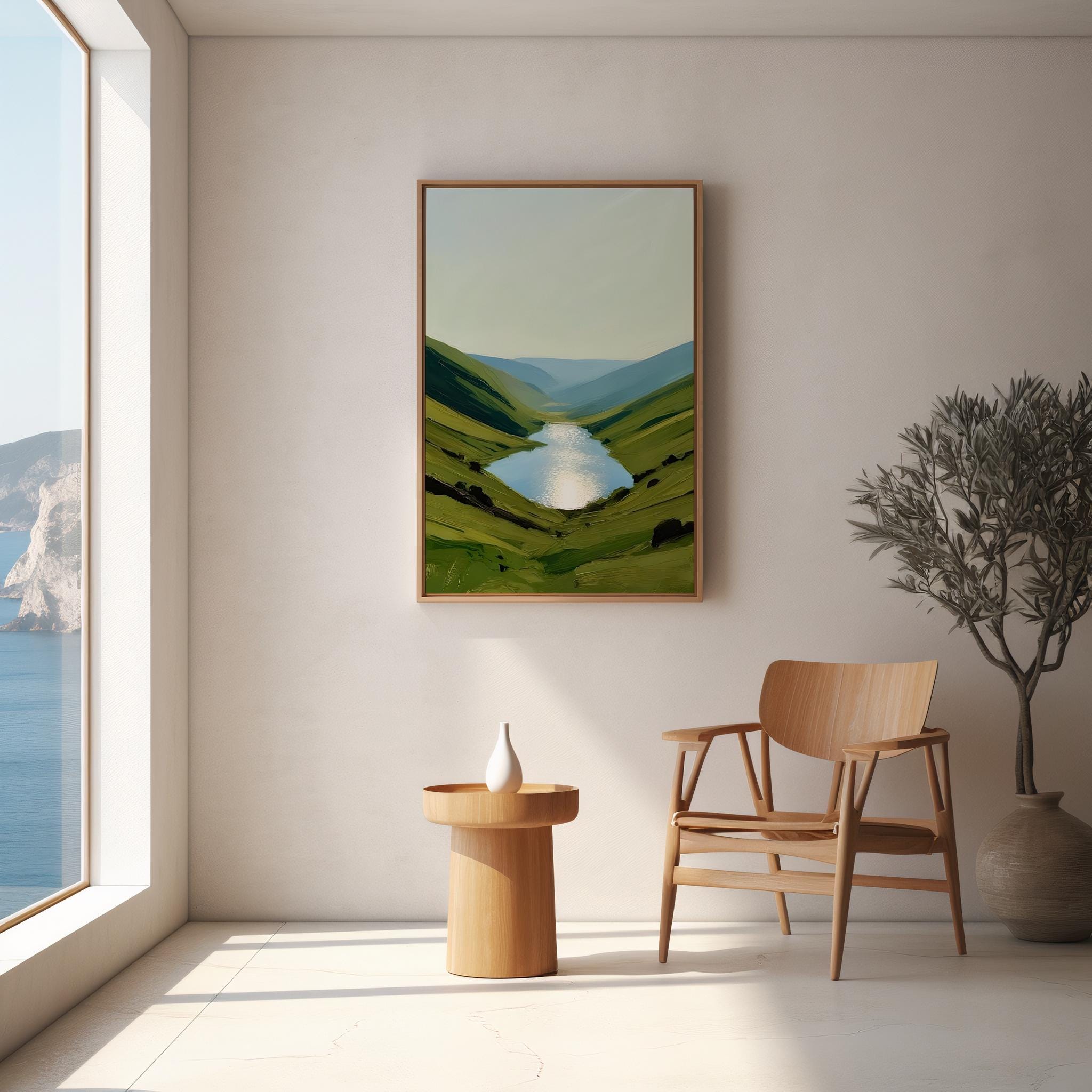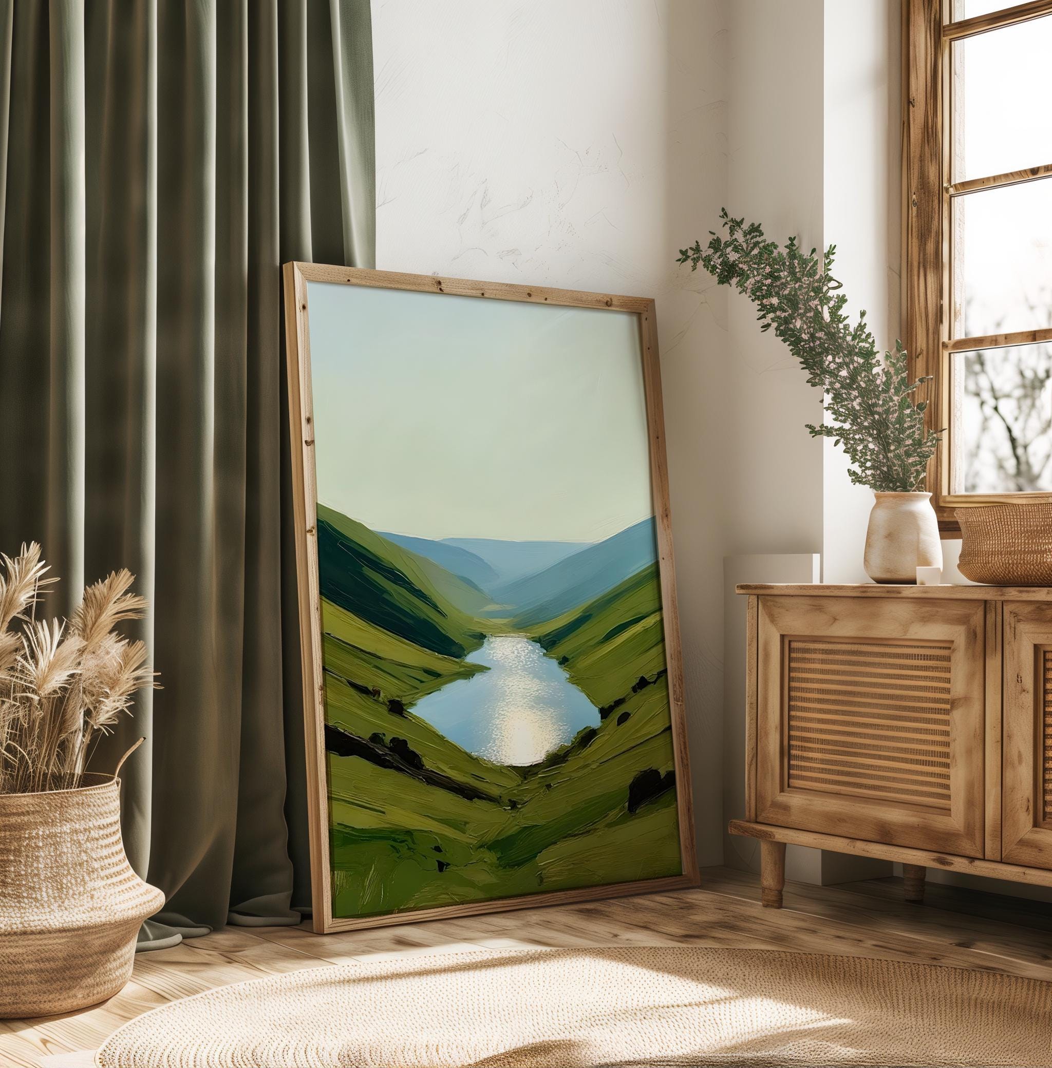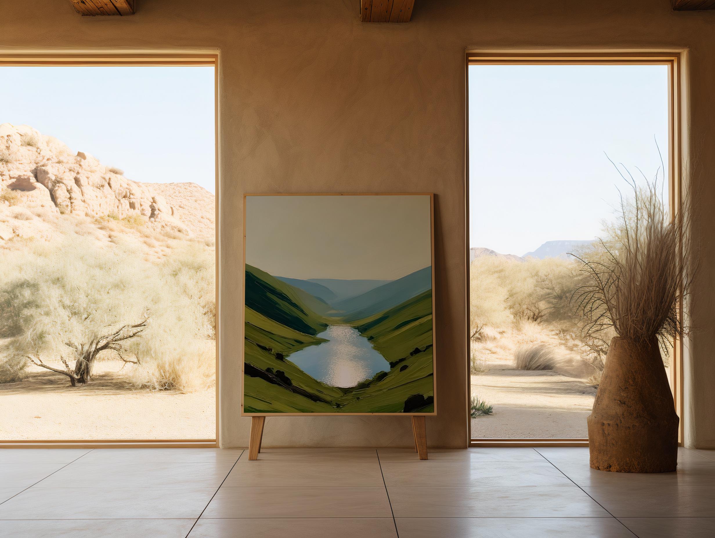 Experience the calming beauty of nature with this digital download of a serene landscape featuring reflective waters and rolling hills. This high-resolution artwork is perfect for adding a peaceful touch to any room, ideal for those seeking tranquility in their home or office. Offered as a downloadable file, you can print it in a variety of sizes that suit your space and style.
