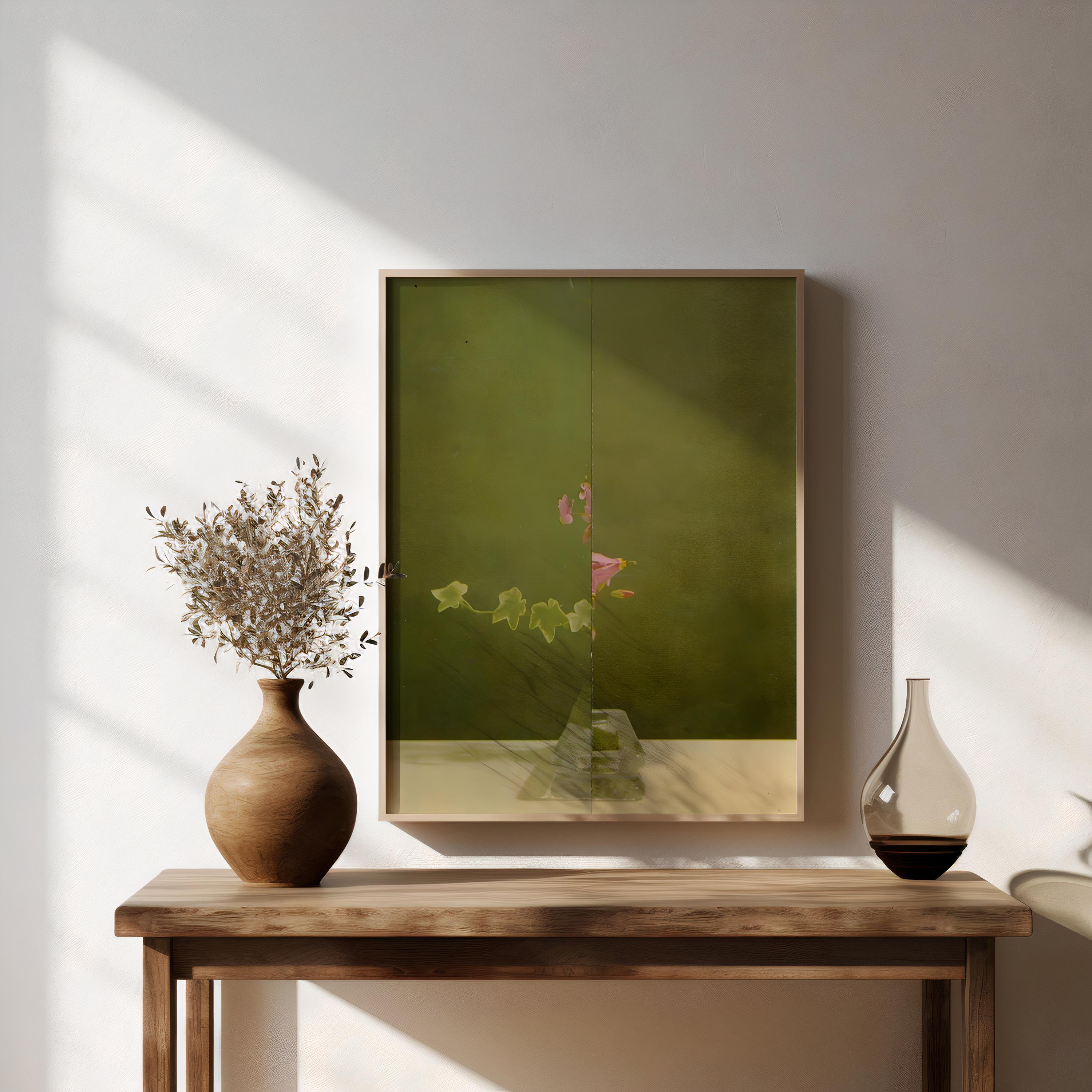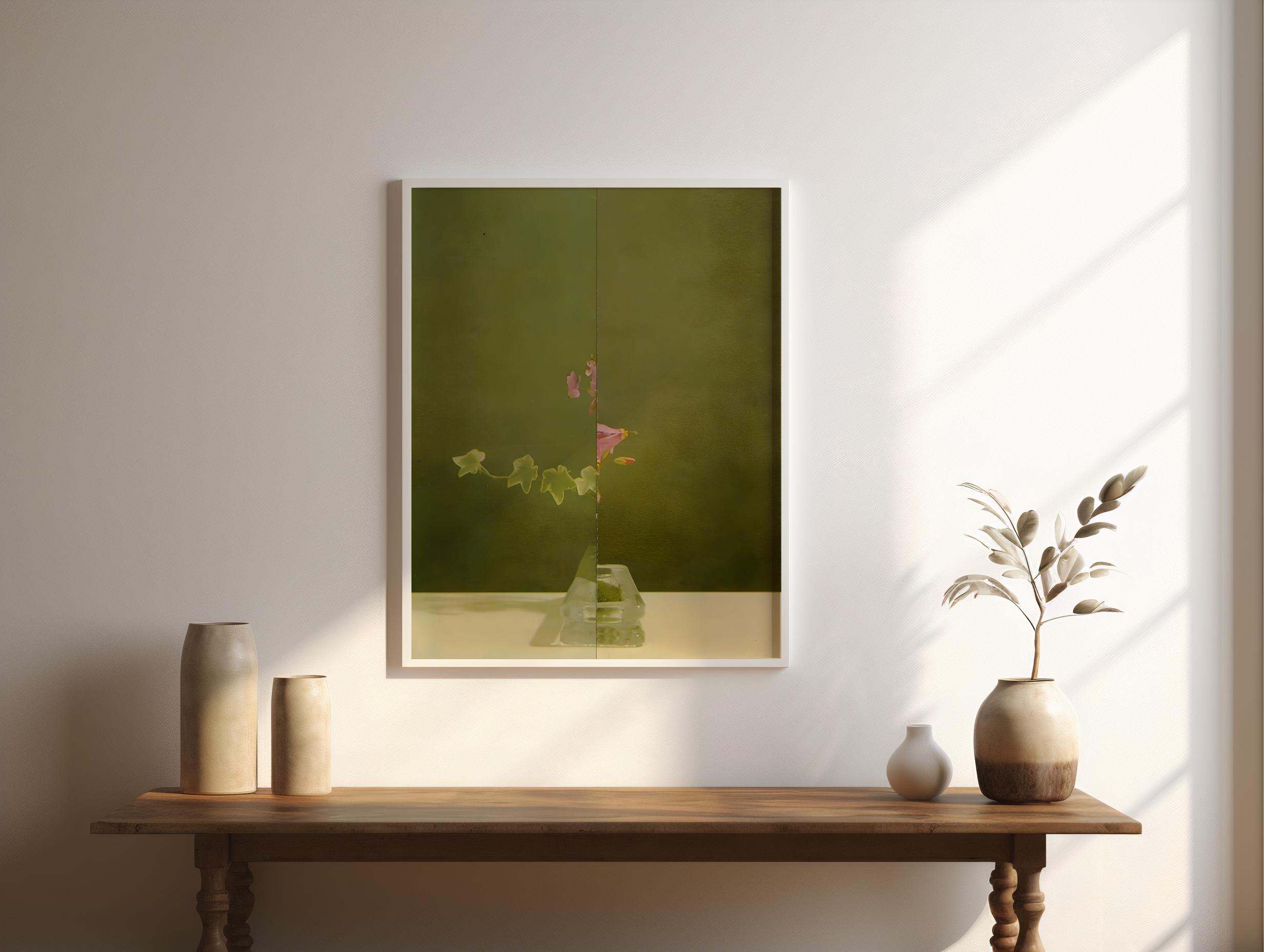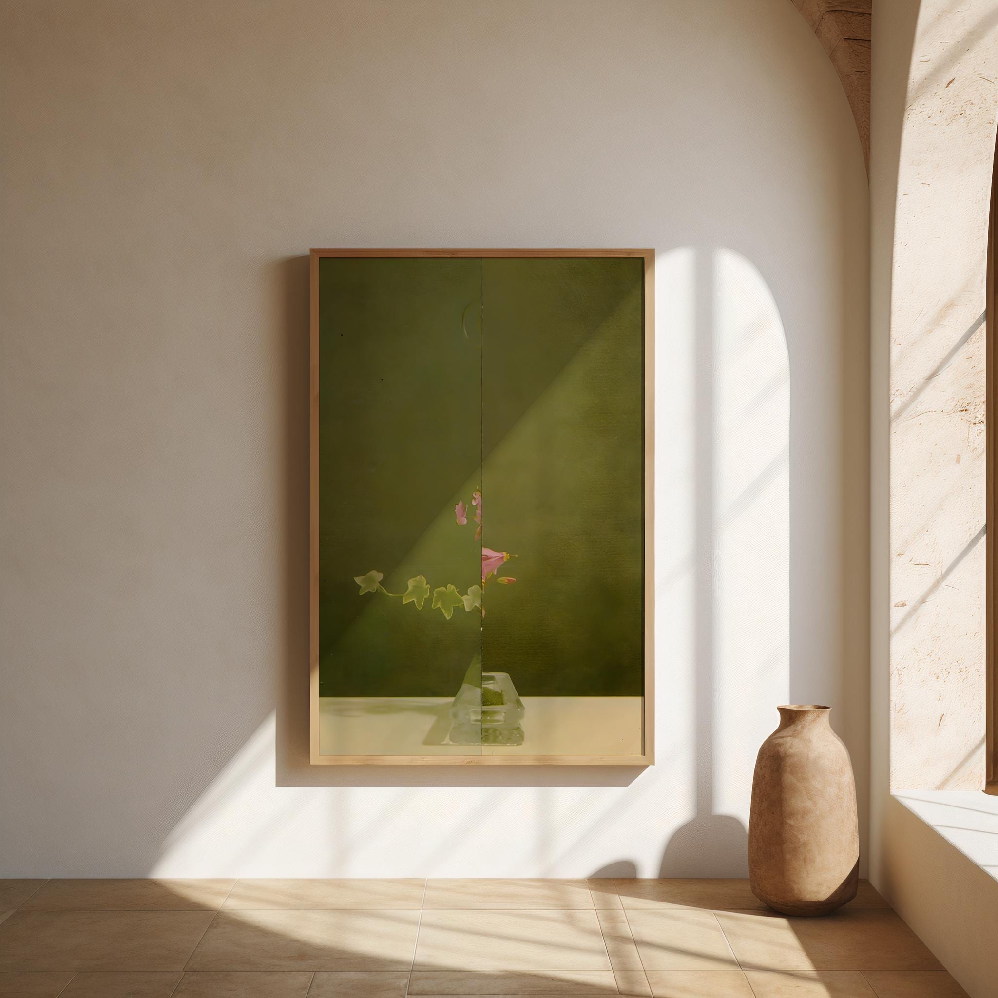 Digital Download | Bring a serene and modern touch to your space with this minimalist floral art print. Featuring a delicate pink orchid in a glass vase, split by a subtle vertical line, this piece blends photography and abstract composition to create a unique conversation starter. The olive green background and soft lighting give it a sophisticated, organic feel—perfect for living rooms, bedrooms, or office spaces.