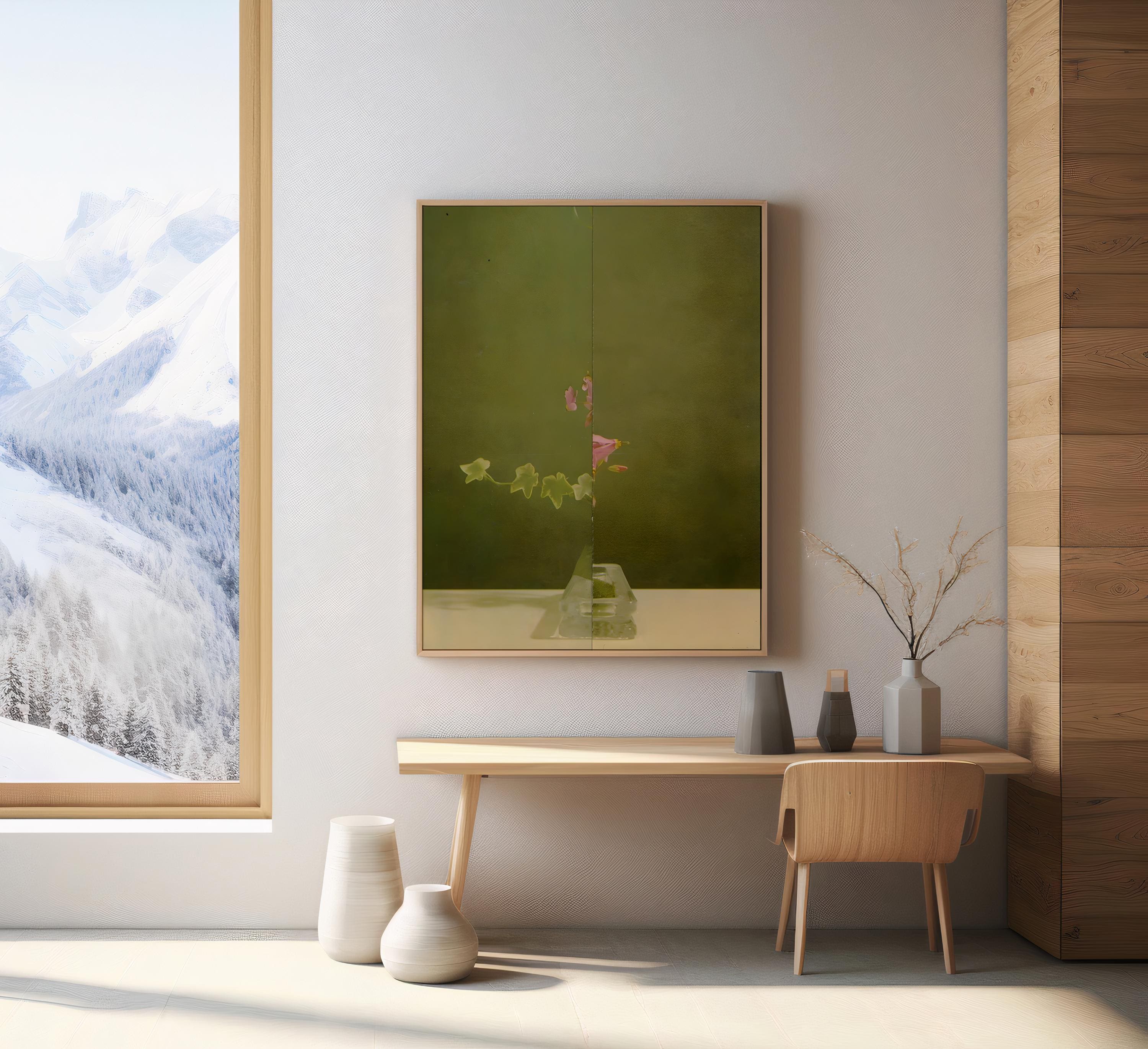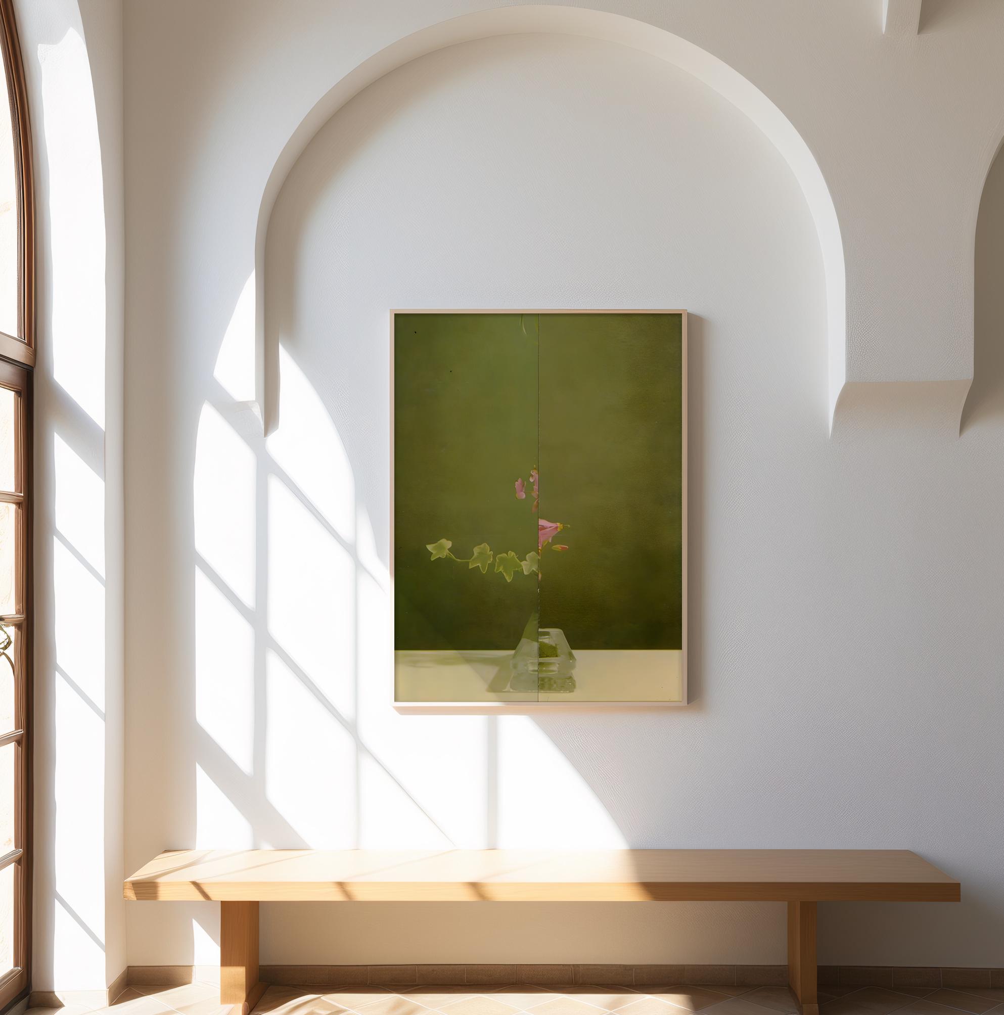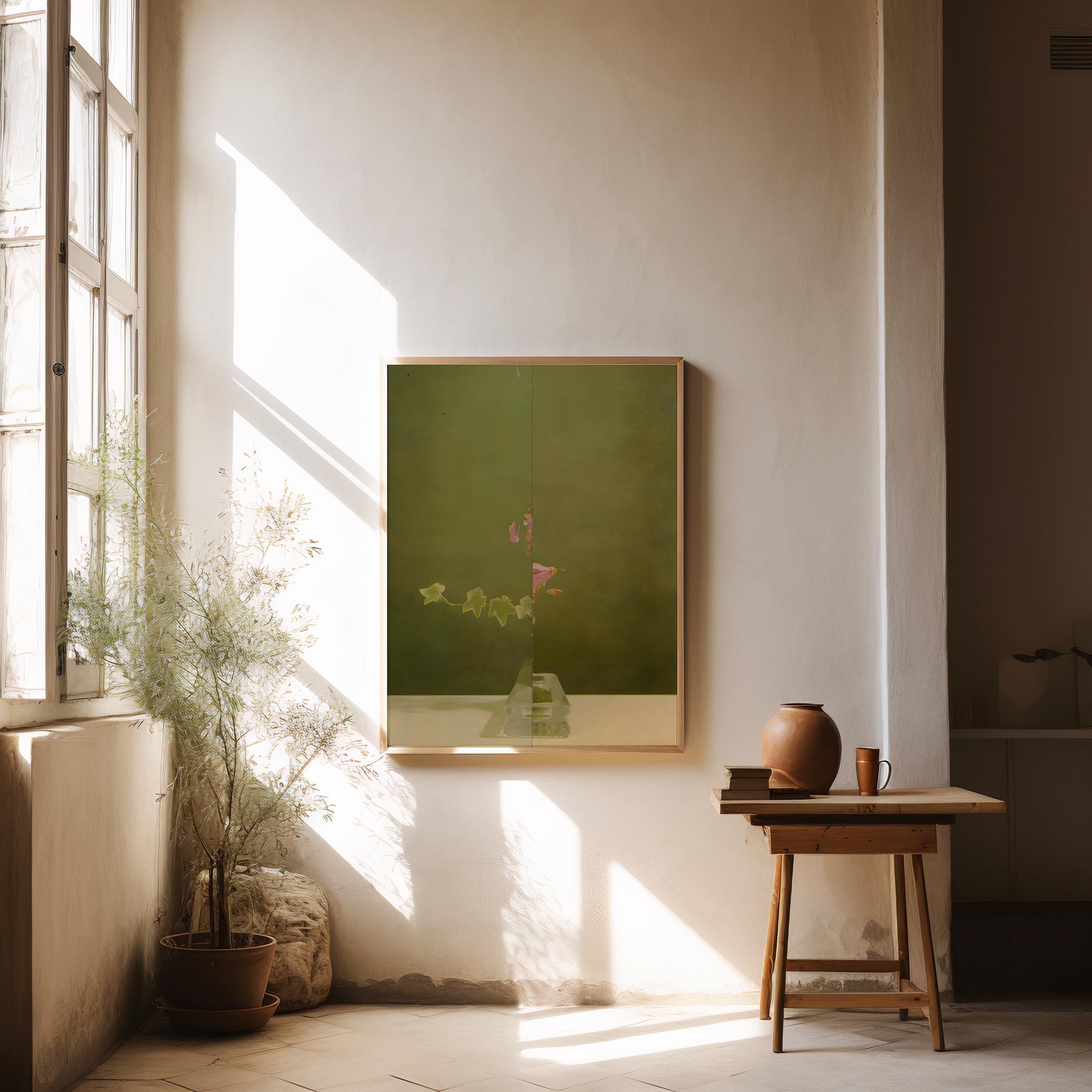 Digital Download | Bring a serene and modern touch to your space with this minimalist floral art print. Featuring a delicate pink orchid in a glass vase, split by a subtle vertical line, this piece blends photography and abstract composition to create a unique conversation starter. The olive green background and soft lighting give it a sophisticated, organic feel—perfect for living rooms, bedrooms, or office spaces.