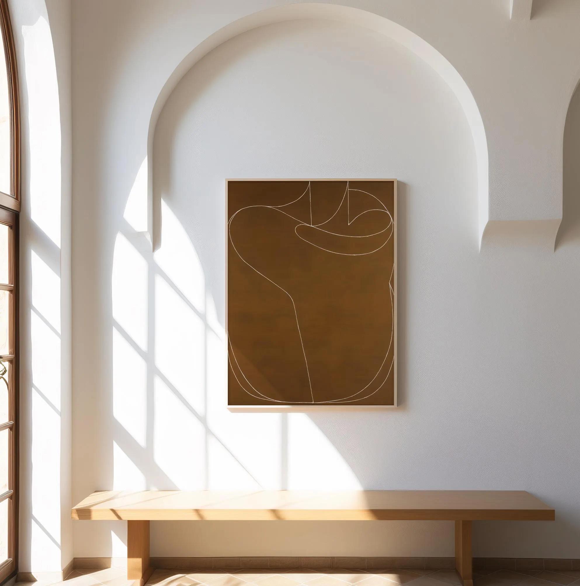 Elevate your space with this captivating modern abstract line art print. This piece features a continuous, flowing white line that creates an organic, figurative shape against a rich, warm brown background. The minimalist design and earthy color palette offer a sense of quiet sophistication and artistic intrigue, making it a perfect addition to a gallery wall or a striking standalone piece.