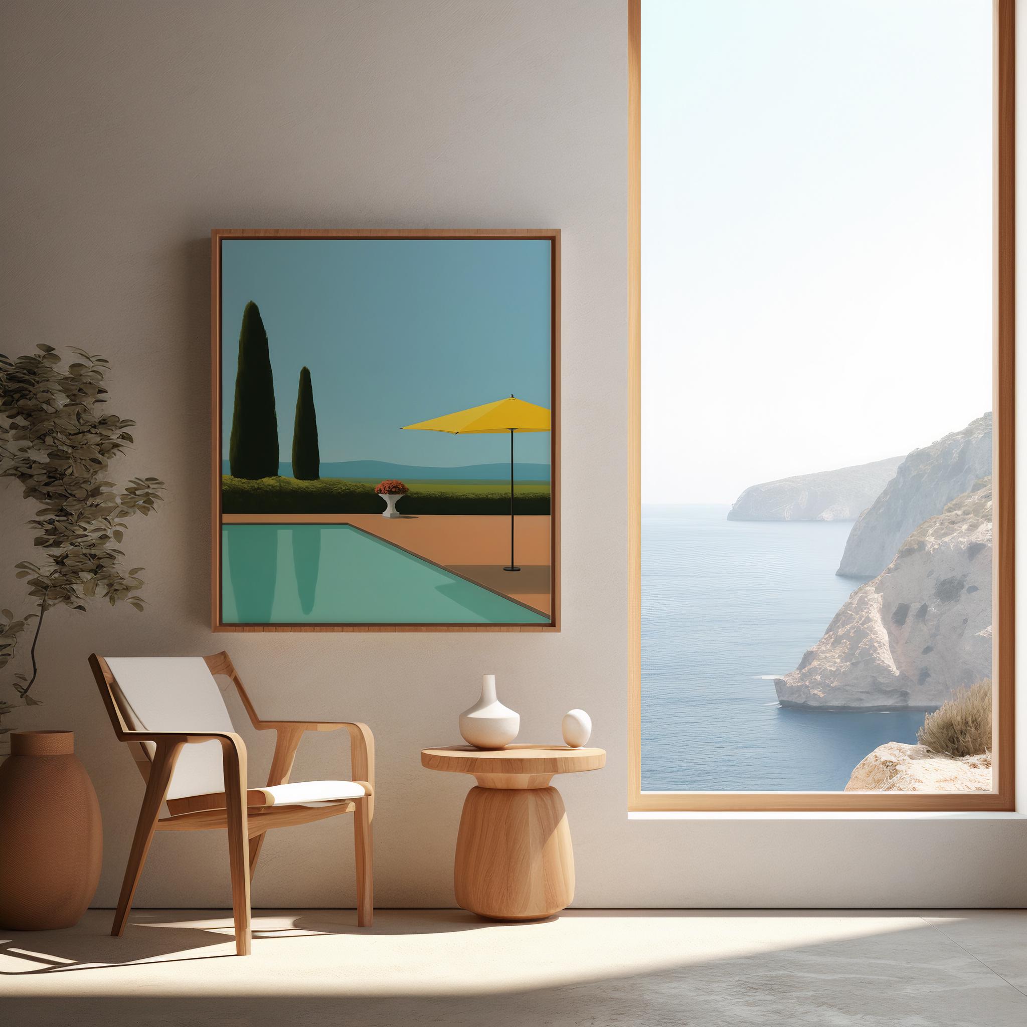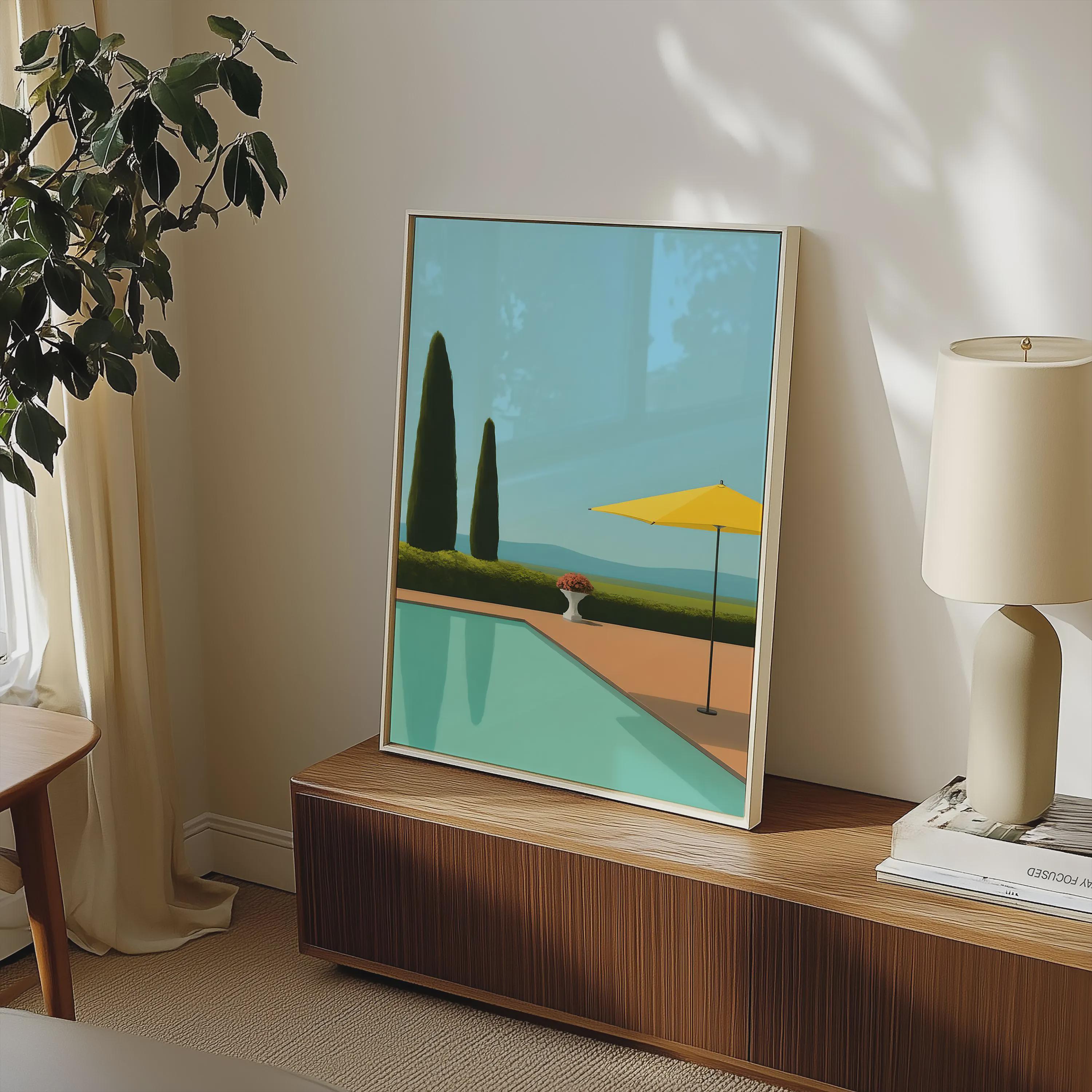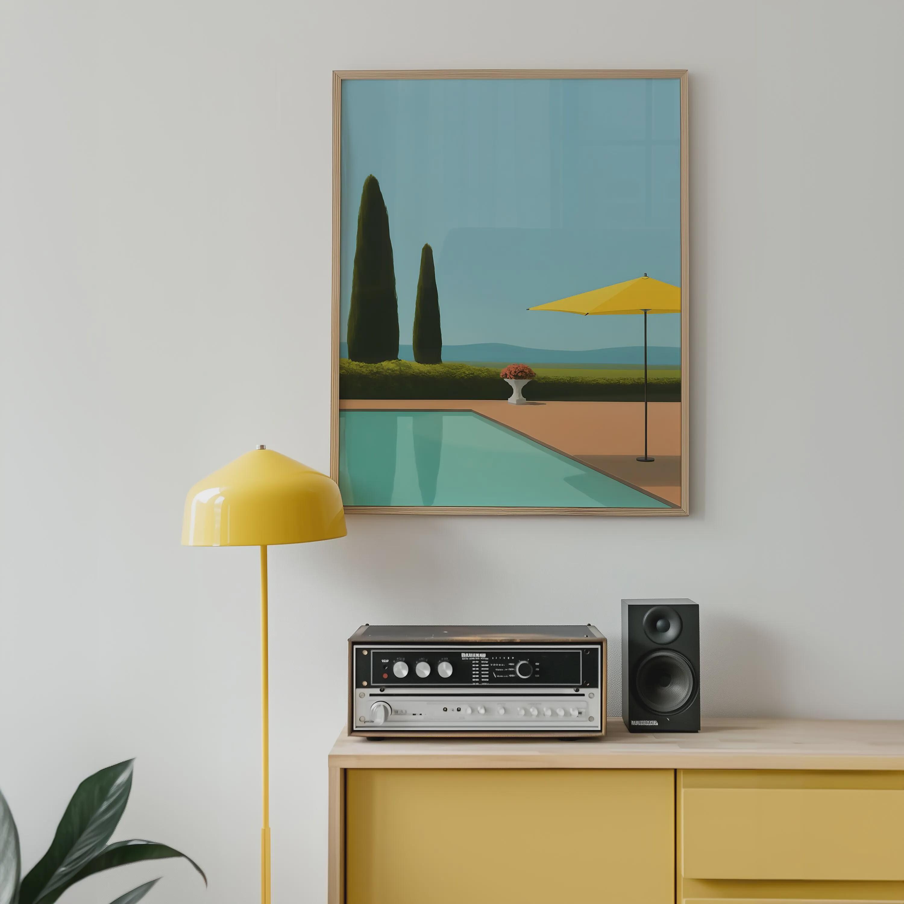 Transport yourself to a tranquil summer day with this stunning art print. Inspired by a mid-century modern aesthetic, this piece features a serene poolside scene with a clean, minimalist design. The composition includes striking cypress trees, a bright yellow umbrella, and the clear blue water of a pool, all set against a calm, sky-blue background. This artwork captures a feeling of quiet luxury and peaceful relaxation.