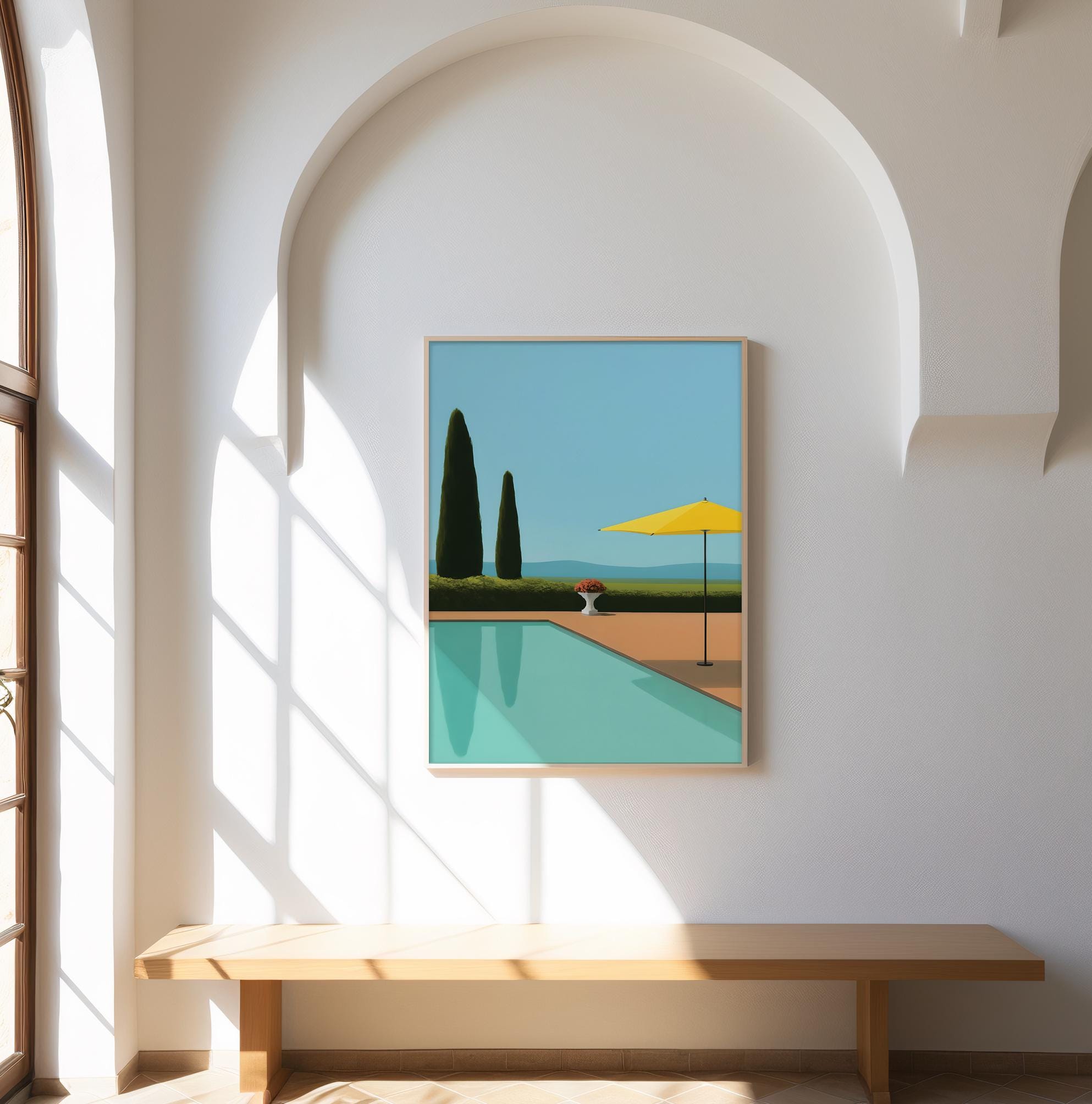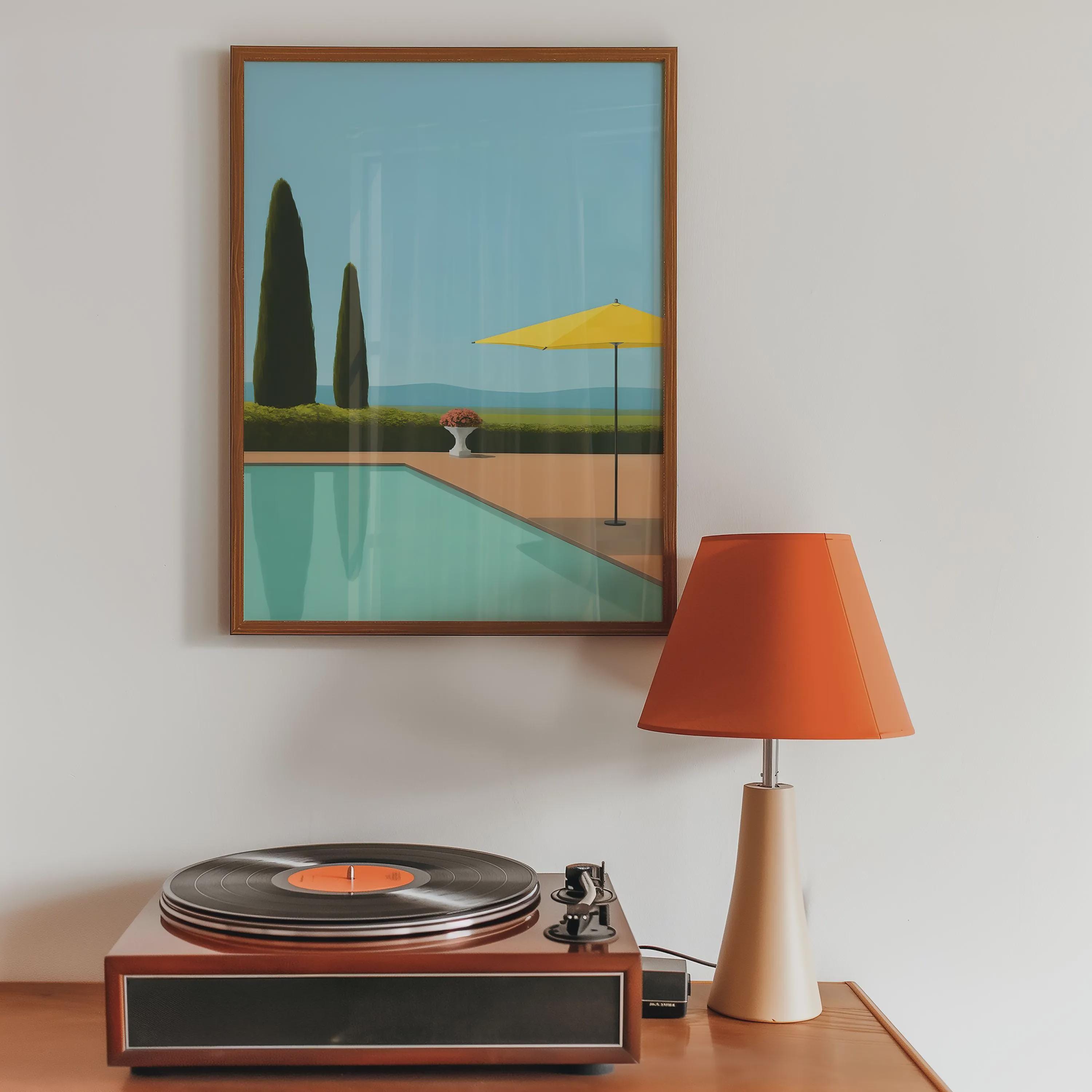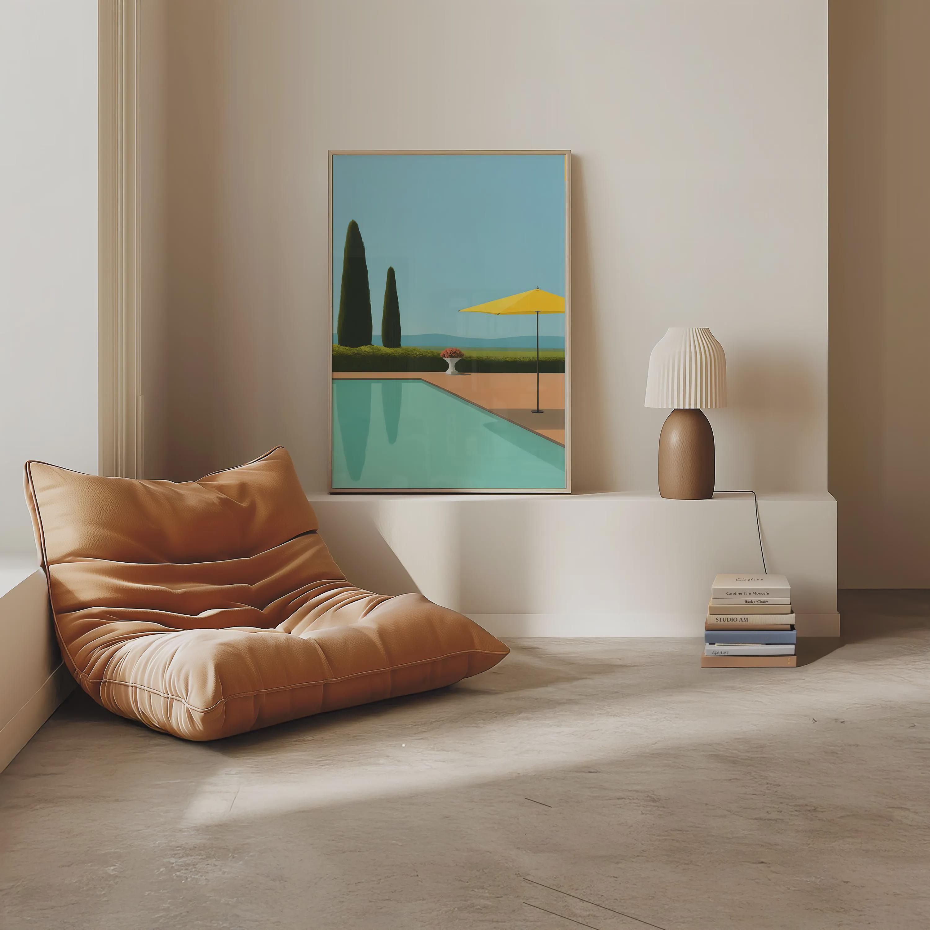 Transport yourself to a tranquil summer day with this stunning art print. Inspired by a mid-century modern aesthetic, this piece features a serene poolside scene with a clean, minimalist design. The composition includes striking cypress trees, a bright yellow umbrella, and the clear blue water of a pool, all set against a calm, sky-blue background. This artwork captures a feeling of quiet luxury and peaceful relaxation.