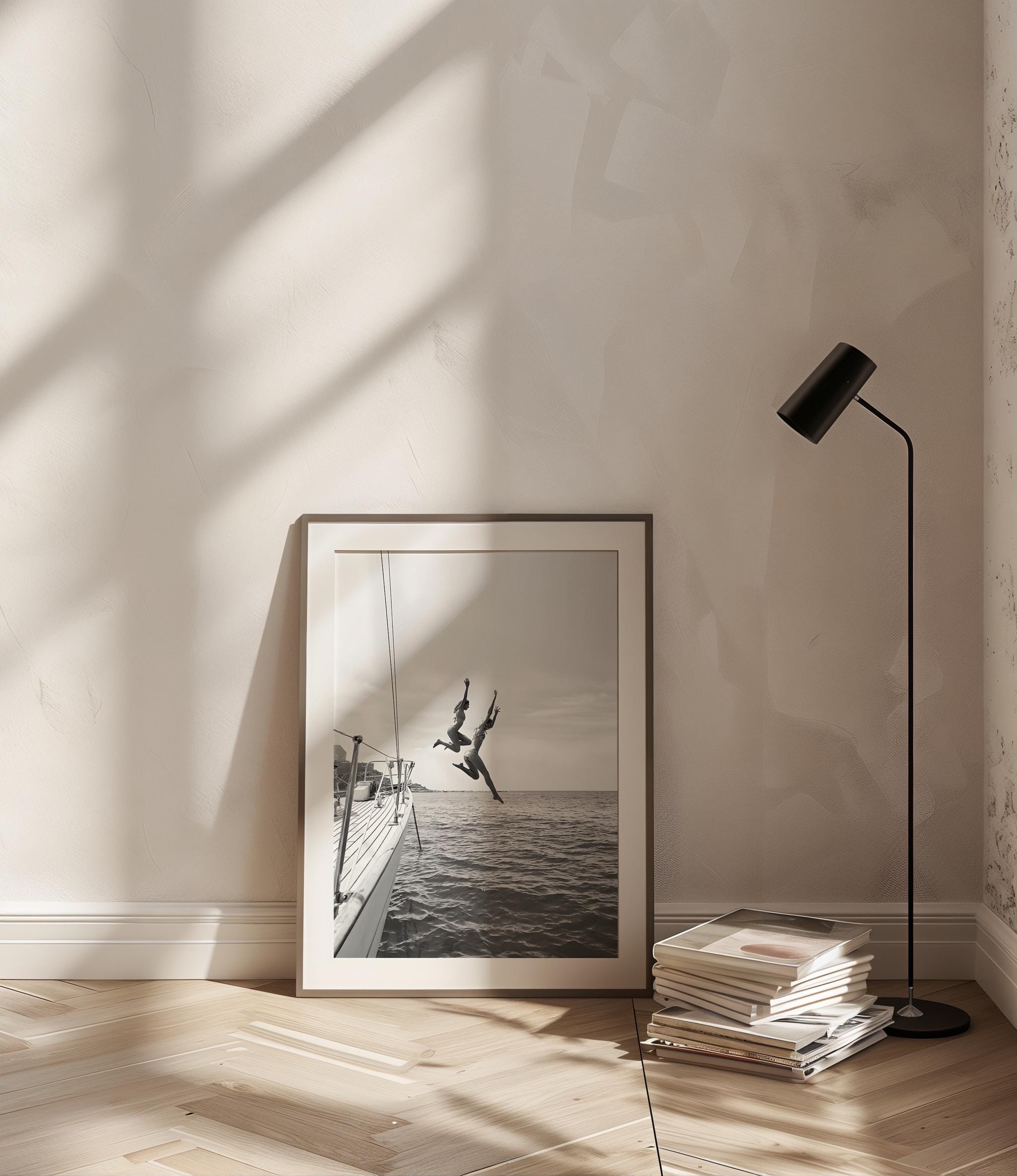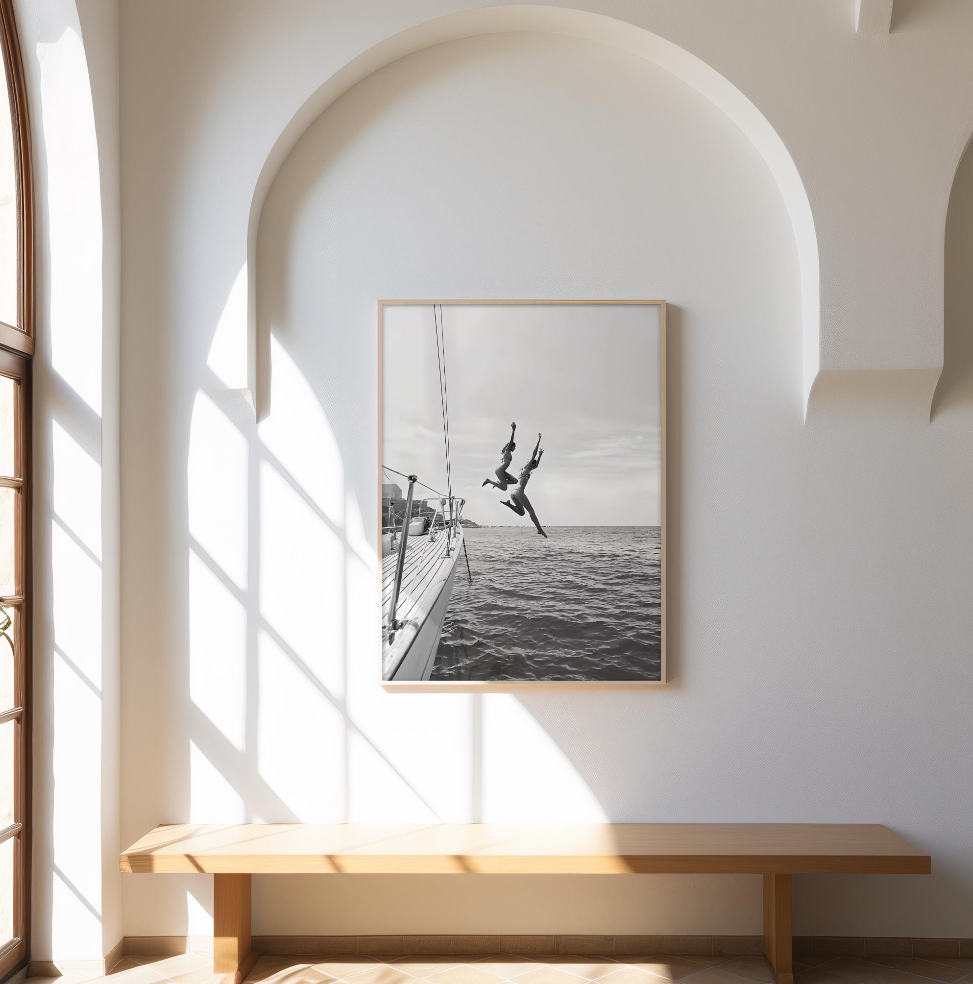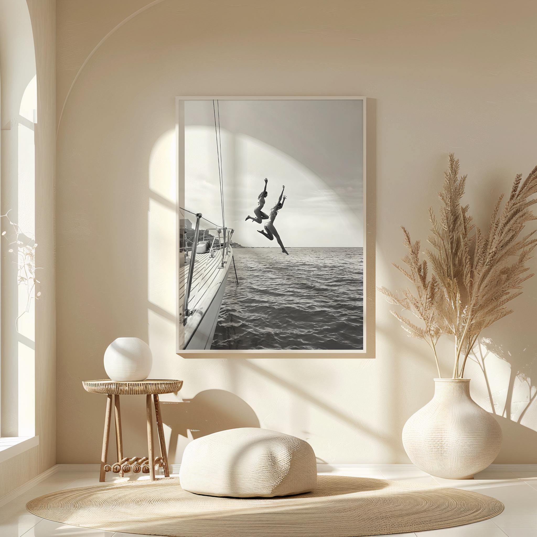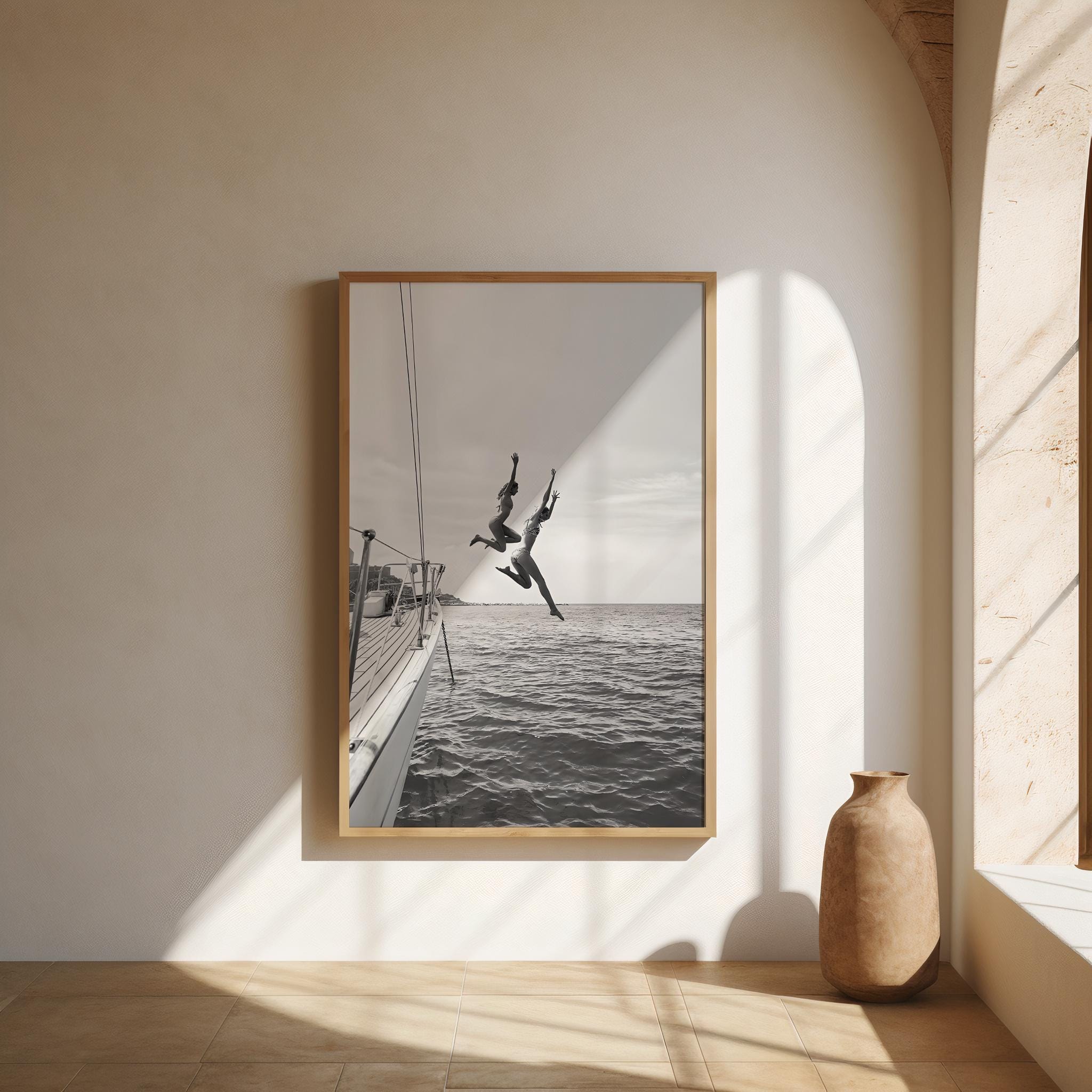 Digital Download | A stunning black and white photograph capturing a moment of pure joy and freedom. This high-quality digital download features two women in mid-air, leaping from the side of a sailboat into the open sea. The minimalist composition and dramatic contrast make this a perfect piece for modern, coastal, or bohemian decor.