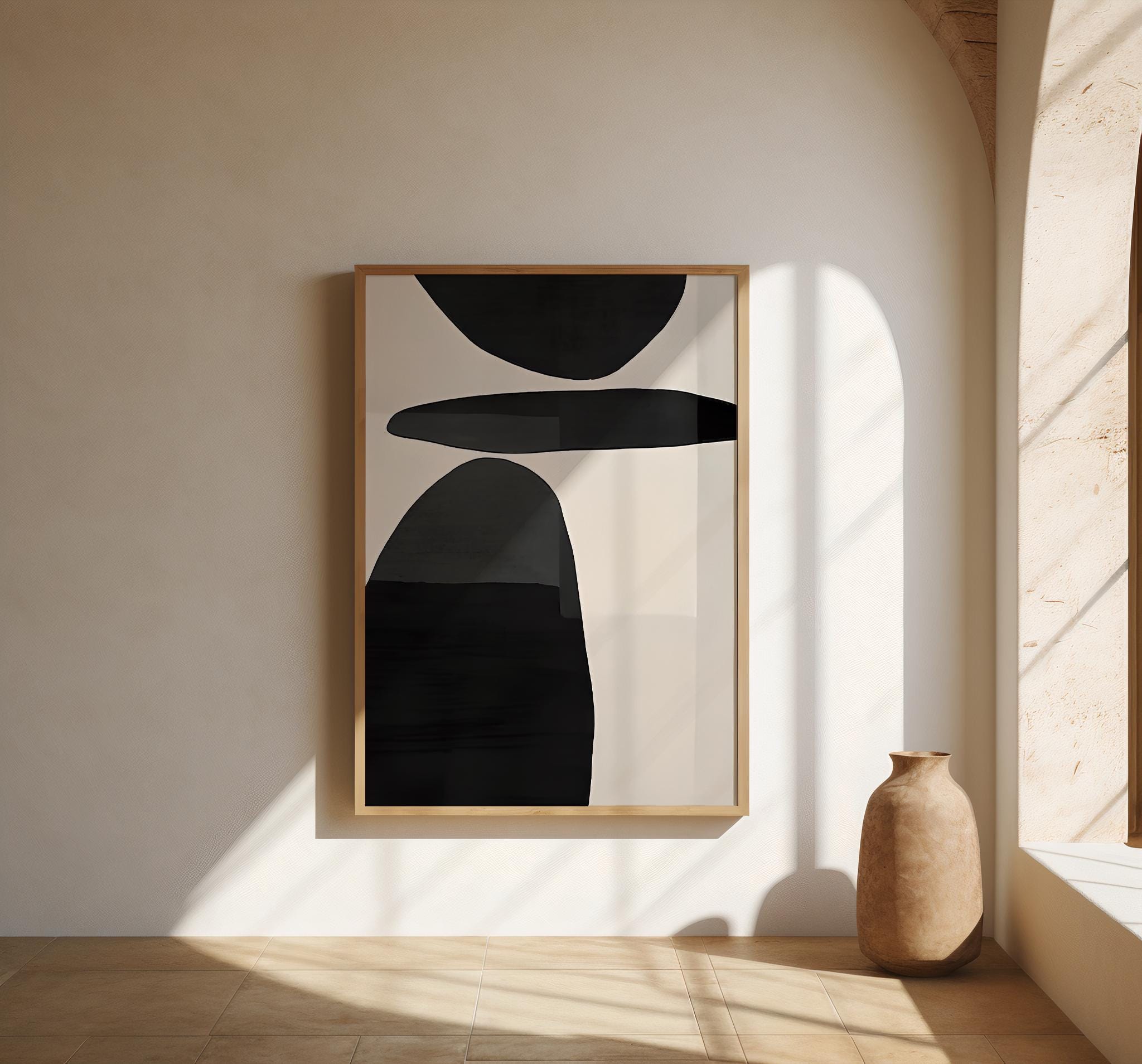 A minimalist abstract composition featuring bold black forms layered against an ivory and off-white background. The strong contrast and organic shapes create a refined, modern statement designed to anchor contemporary interiors.