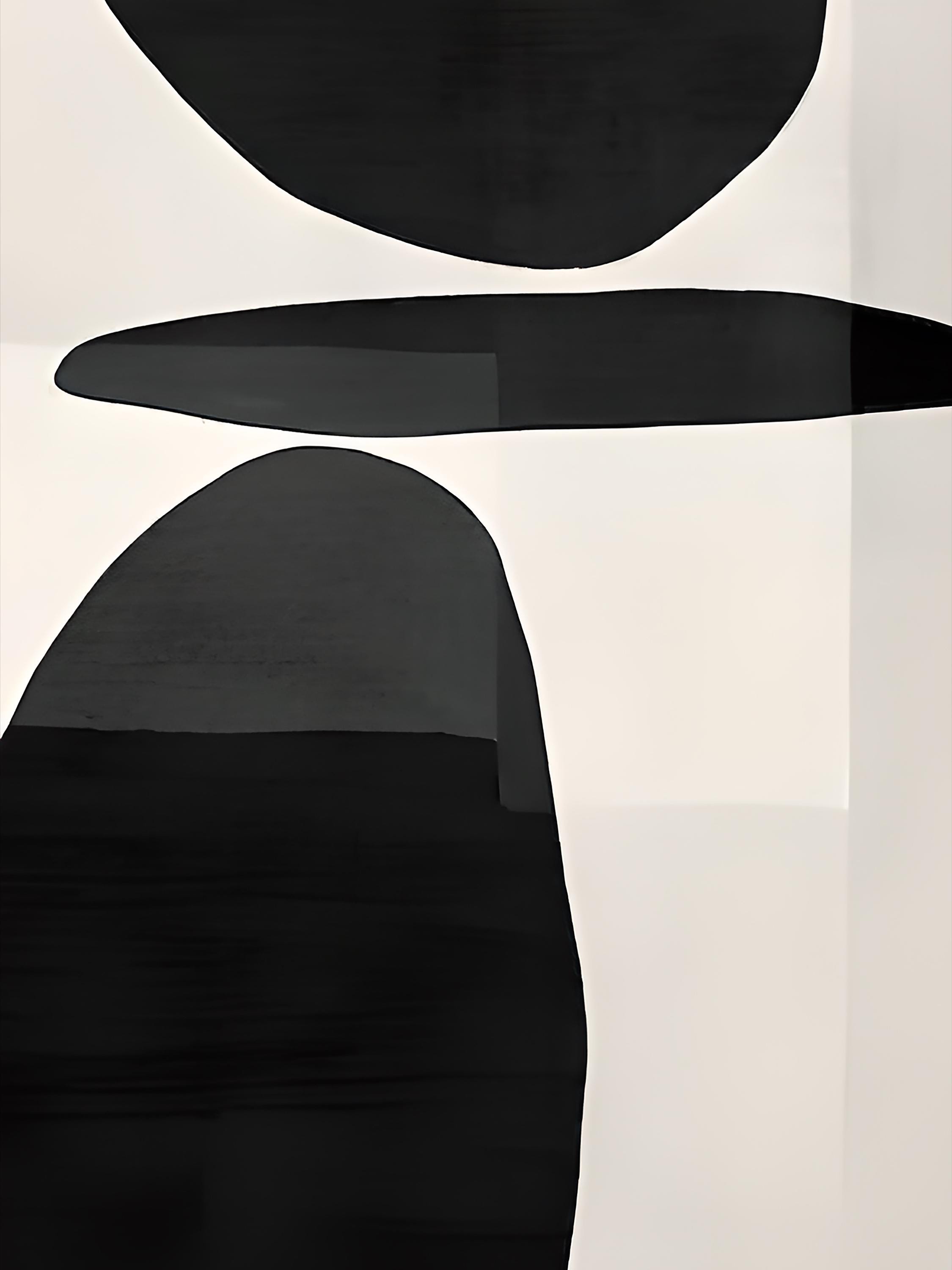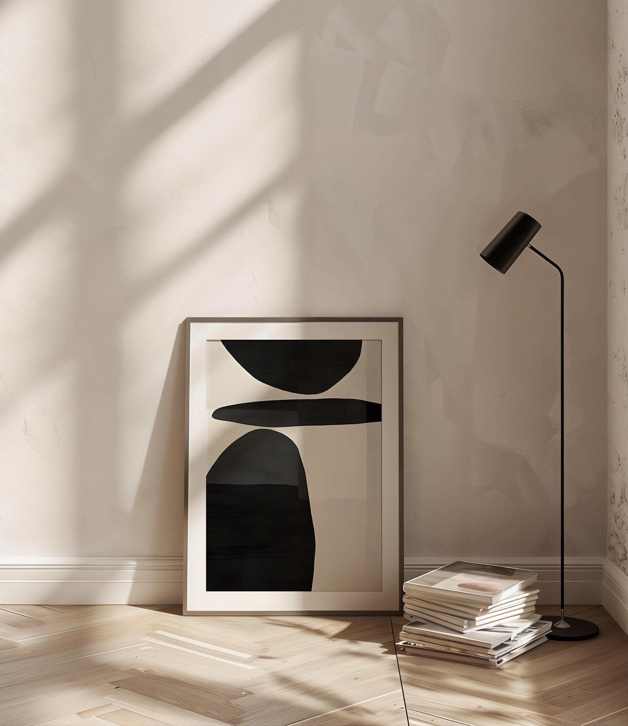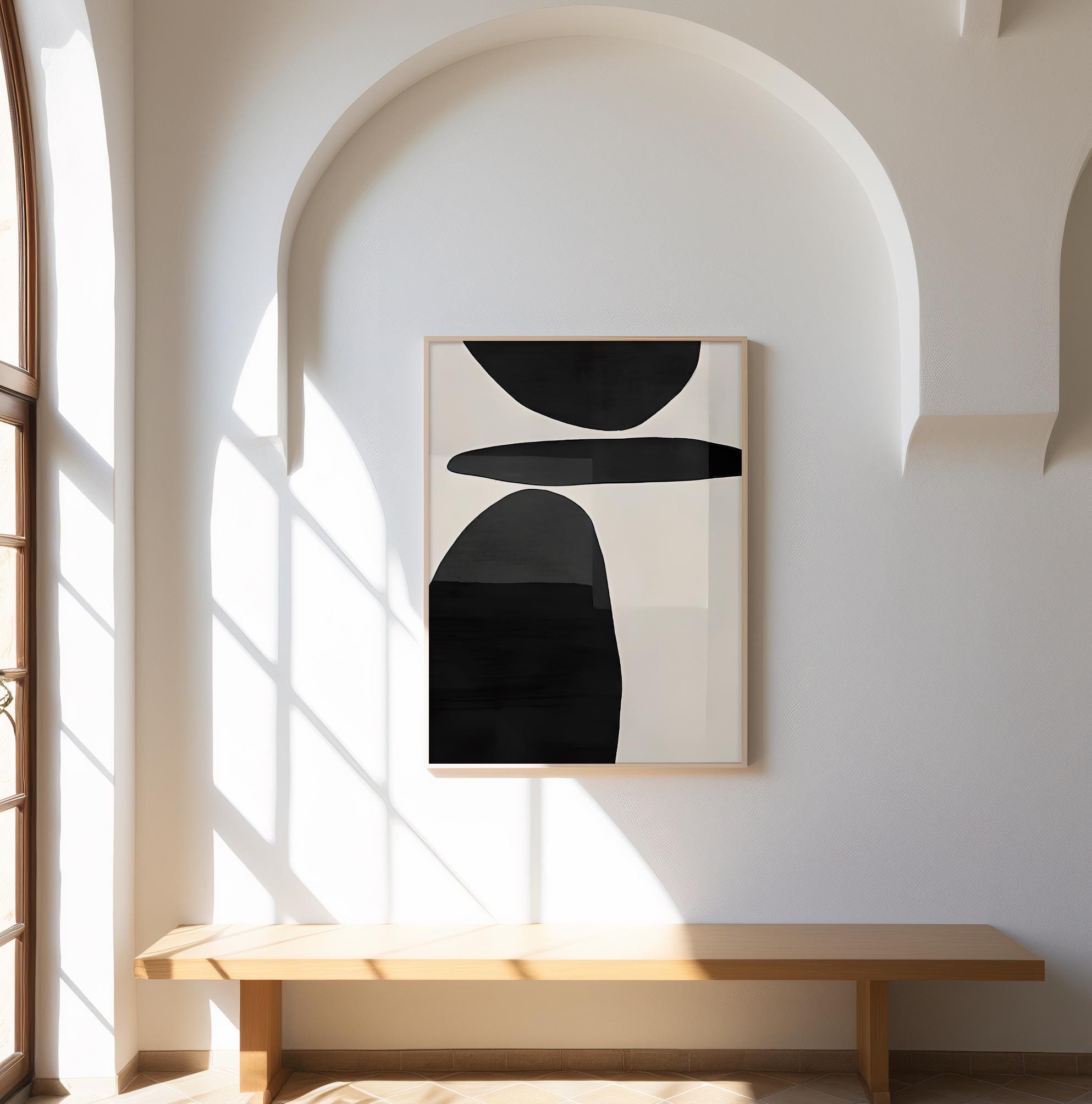 Elevate your space with this stunning, high-quality physical print of our original abstract artwork. This piece features a sophisticated composition of bold, organic black shapes set against a light, neutral background, creating a sense of calm and modern elegance.