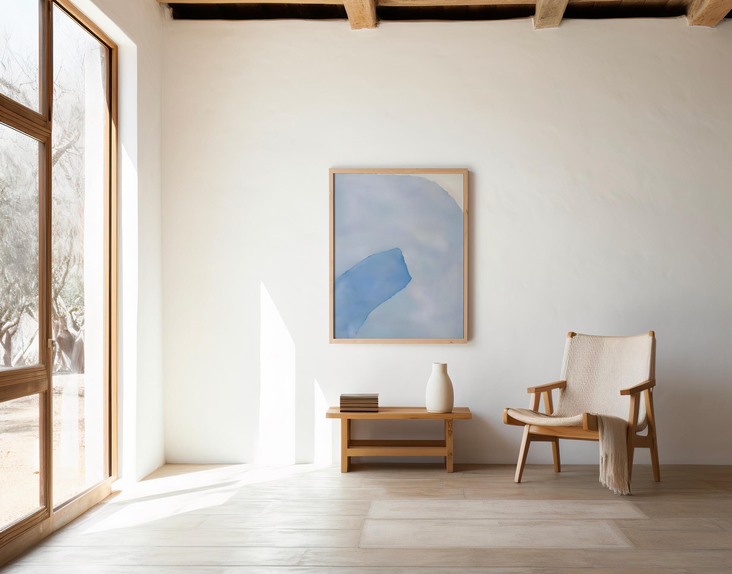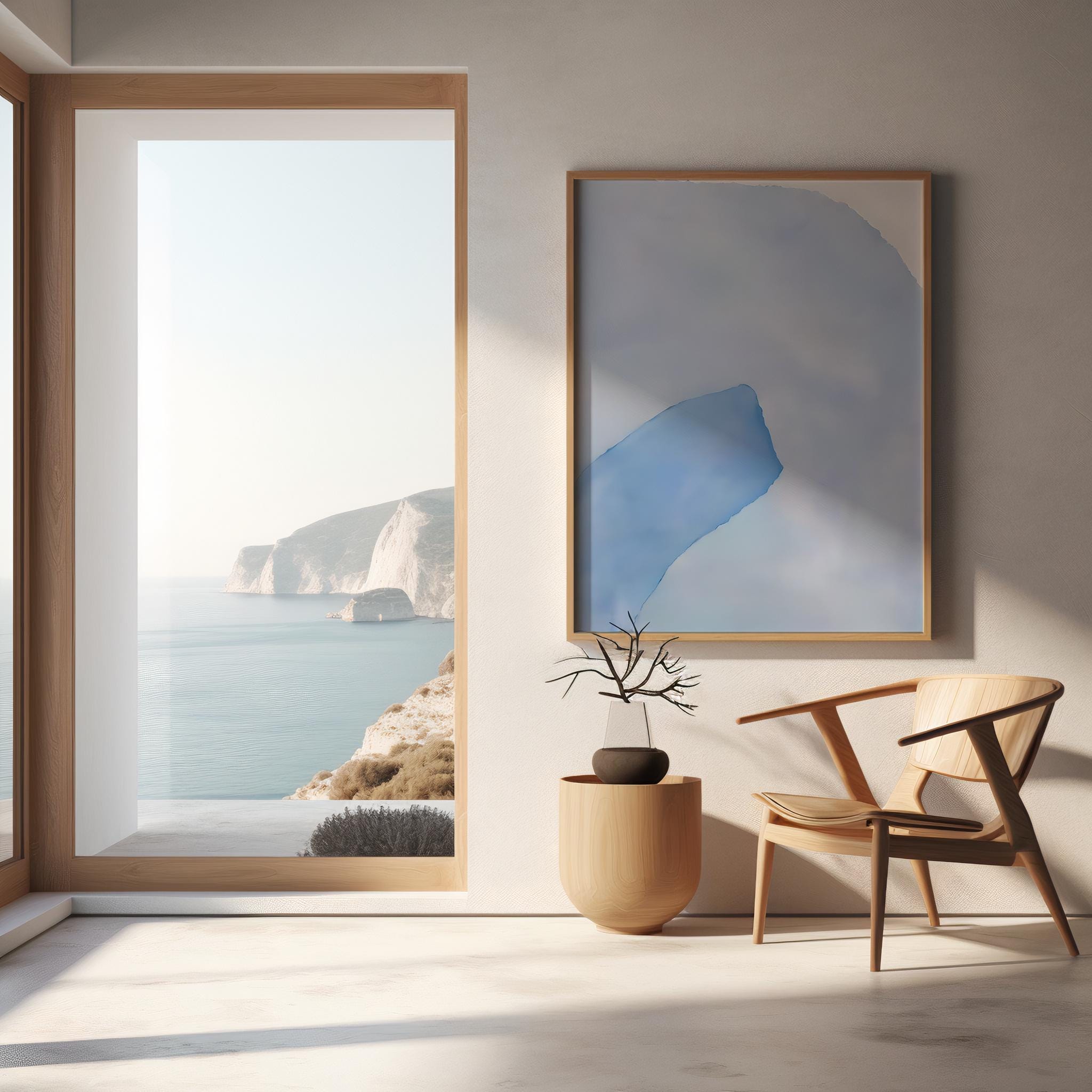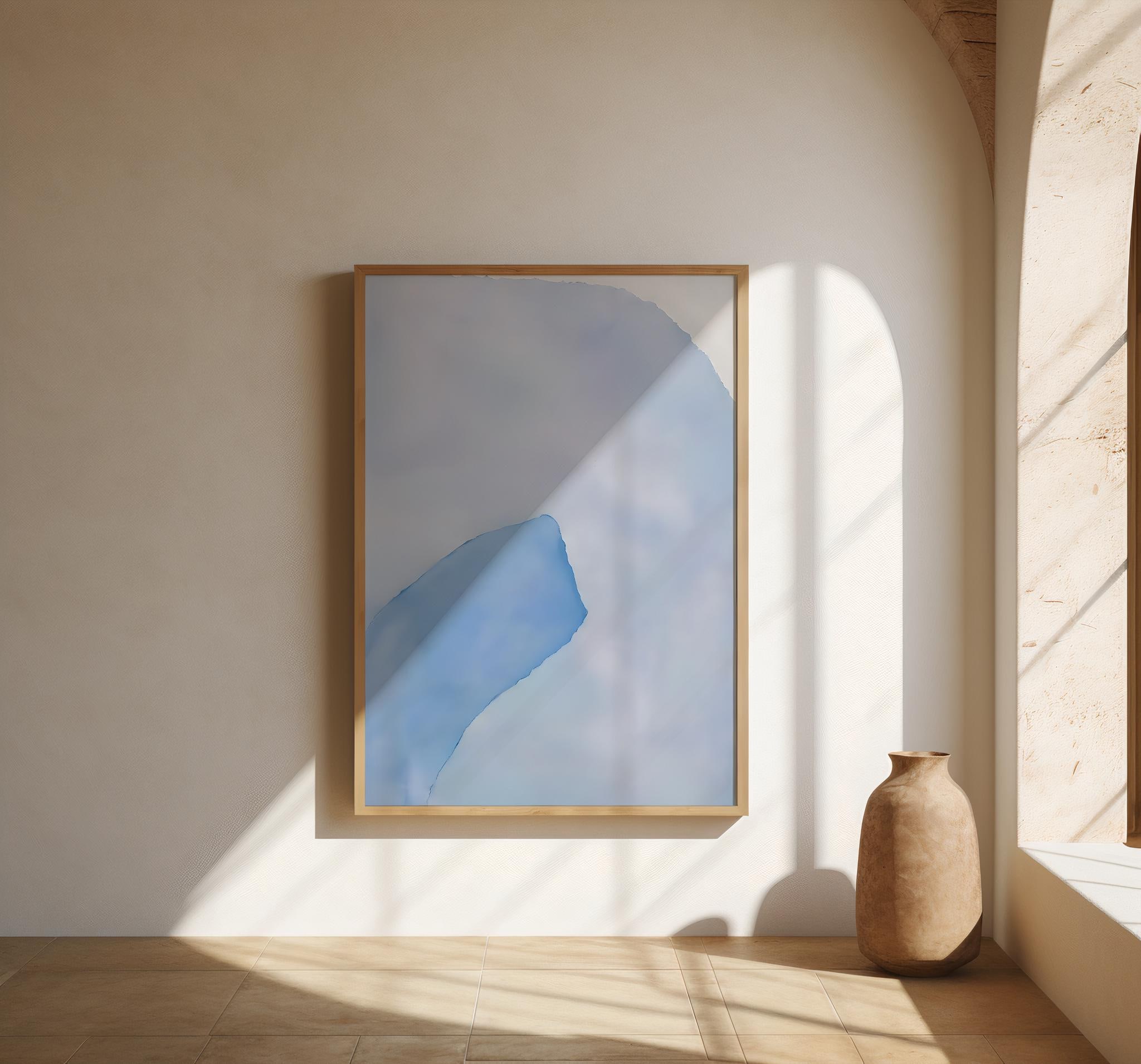 This abstract fine art poster features soft blue shapes layered over cool neutral tones, creating a calm, airy composition with subtle movement. The muted palette and organic form make it an effortless fit for modern, coastal, Japandi, and organic modern interiors.