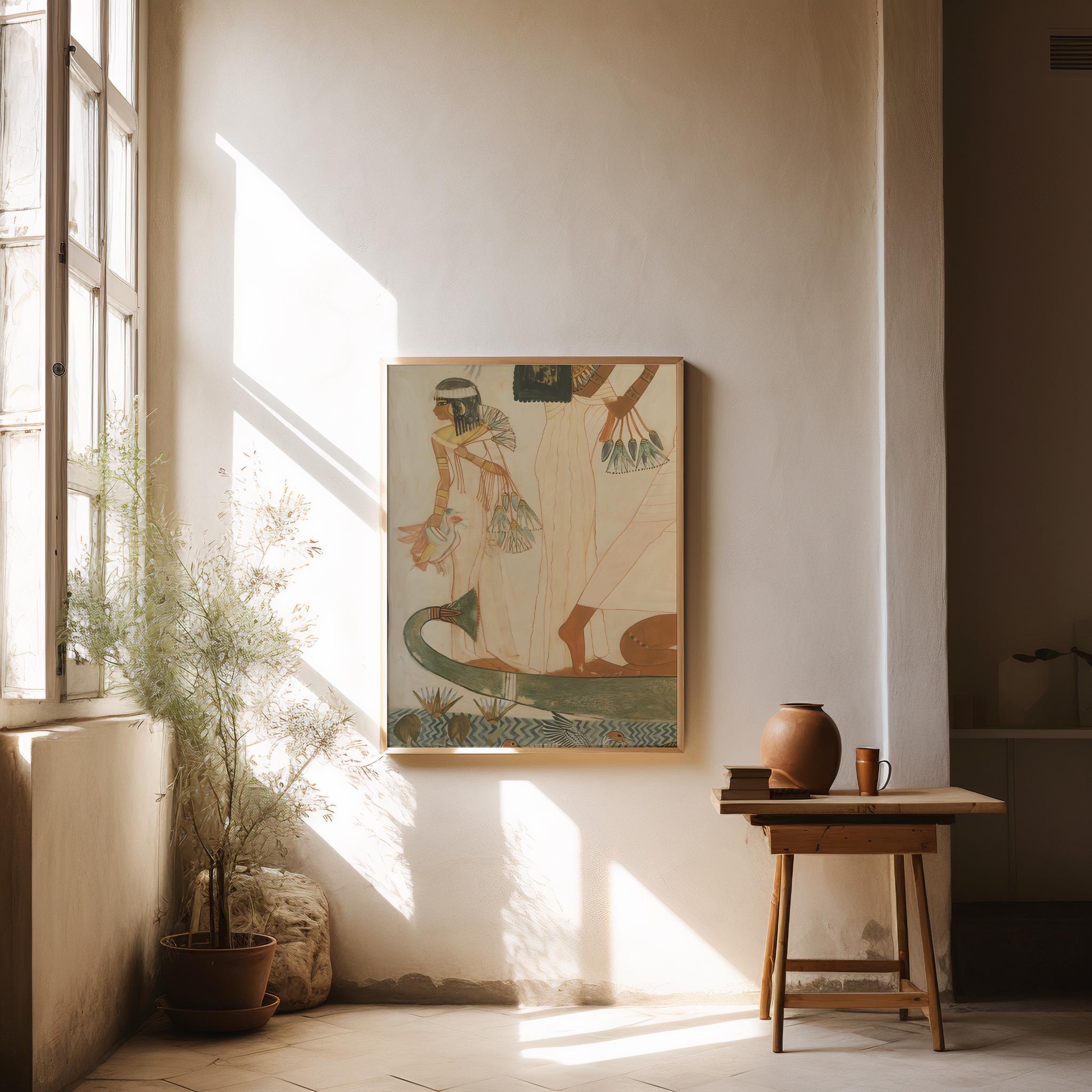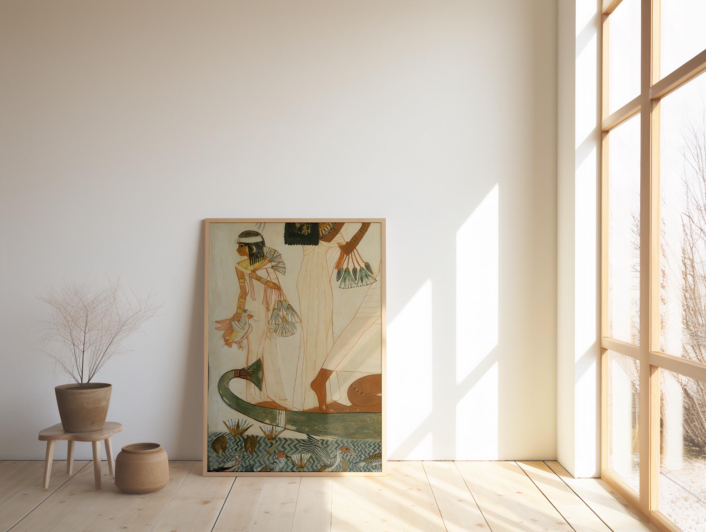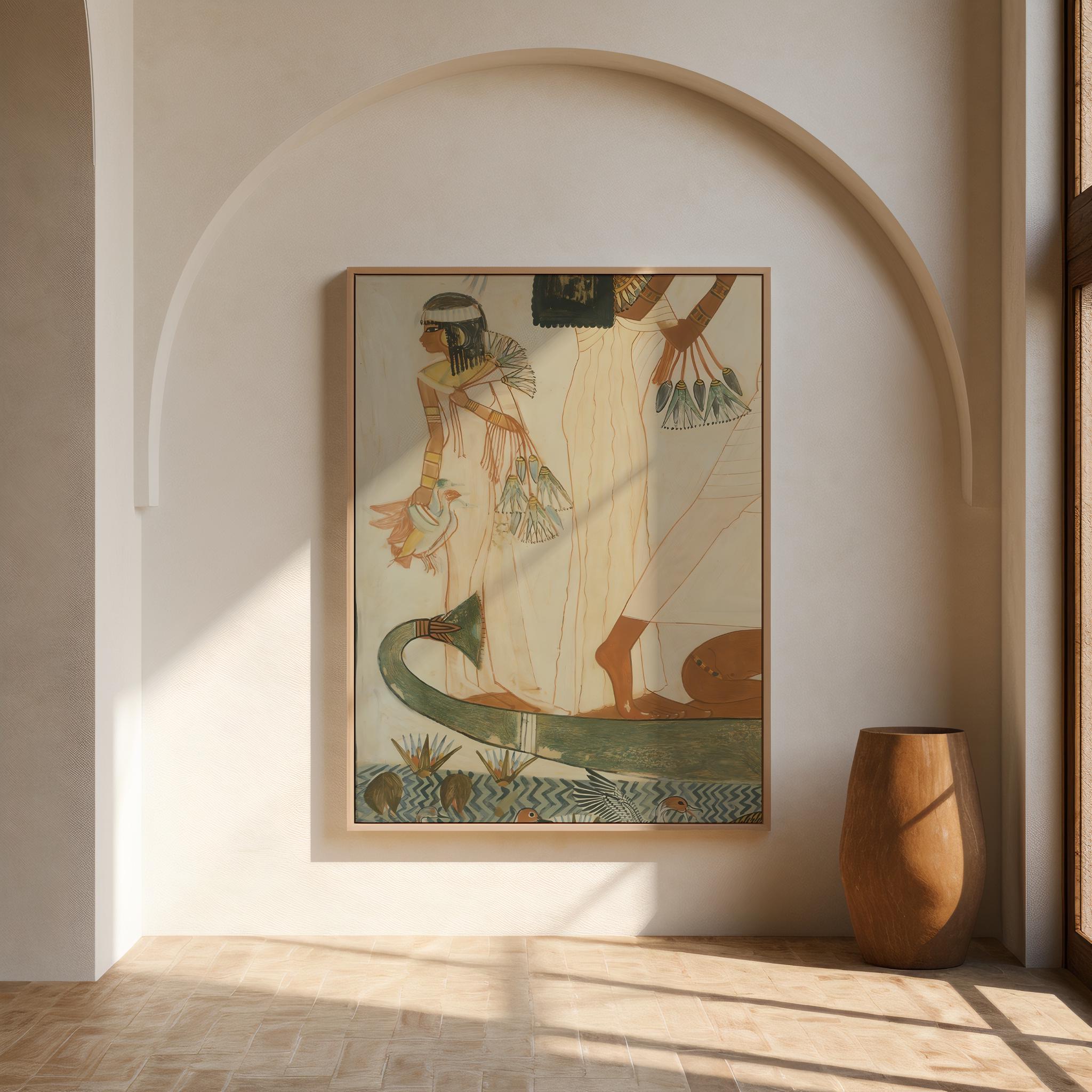 Digital Download | This digital download features a stunning art print inspired by the rich history of ancient Egyptian tomb paintings. The artwork captures a serene scene with a noble figure holding delicate lotus flowers and a bird, painted in beautiful earth tones of ochre, gold, and vibrant teal.