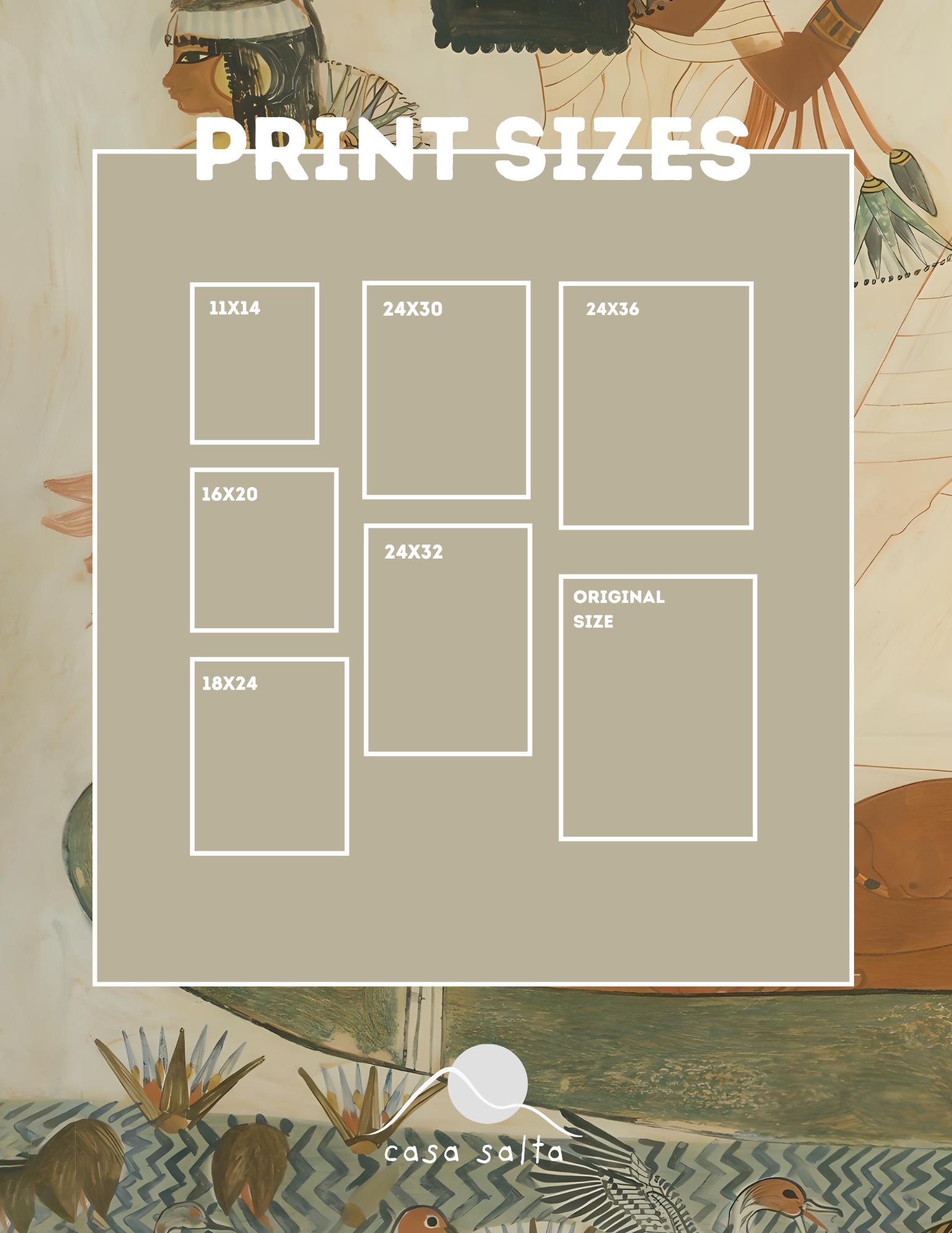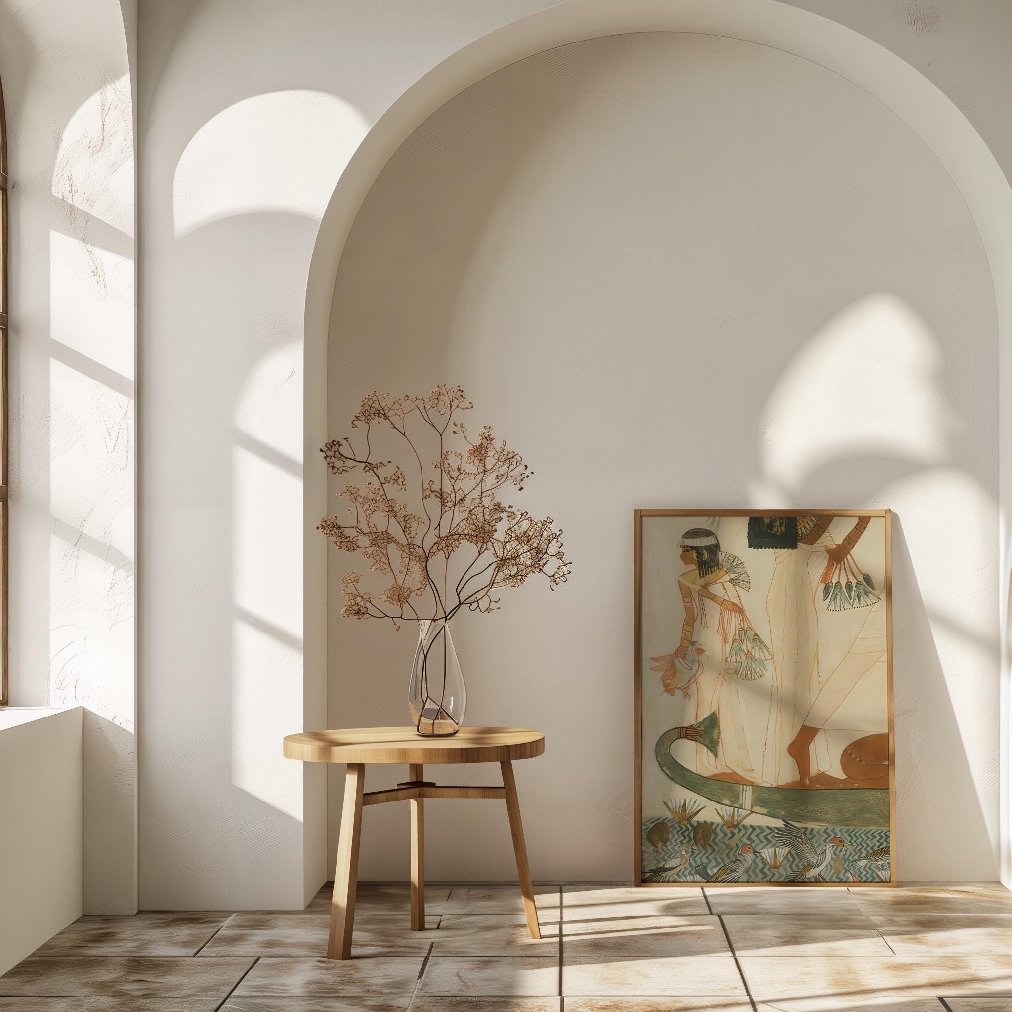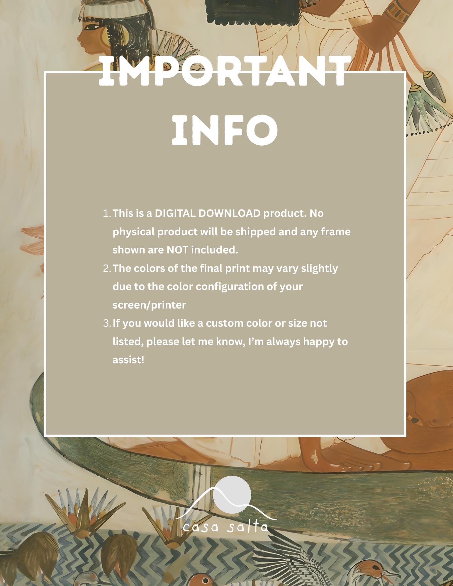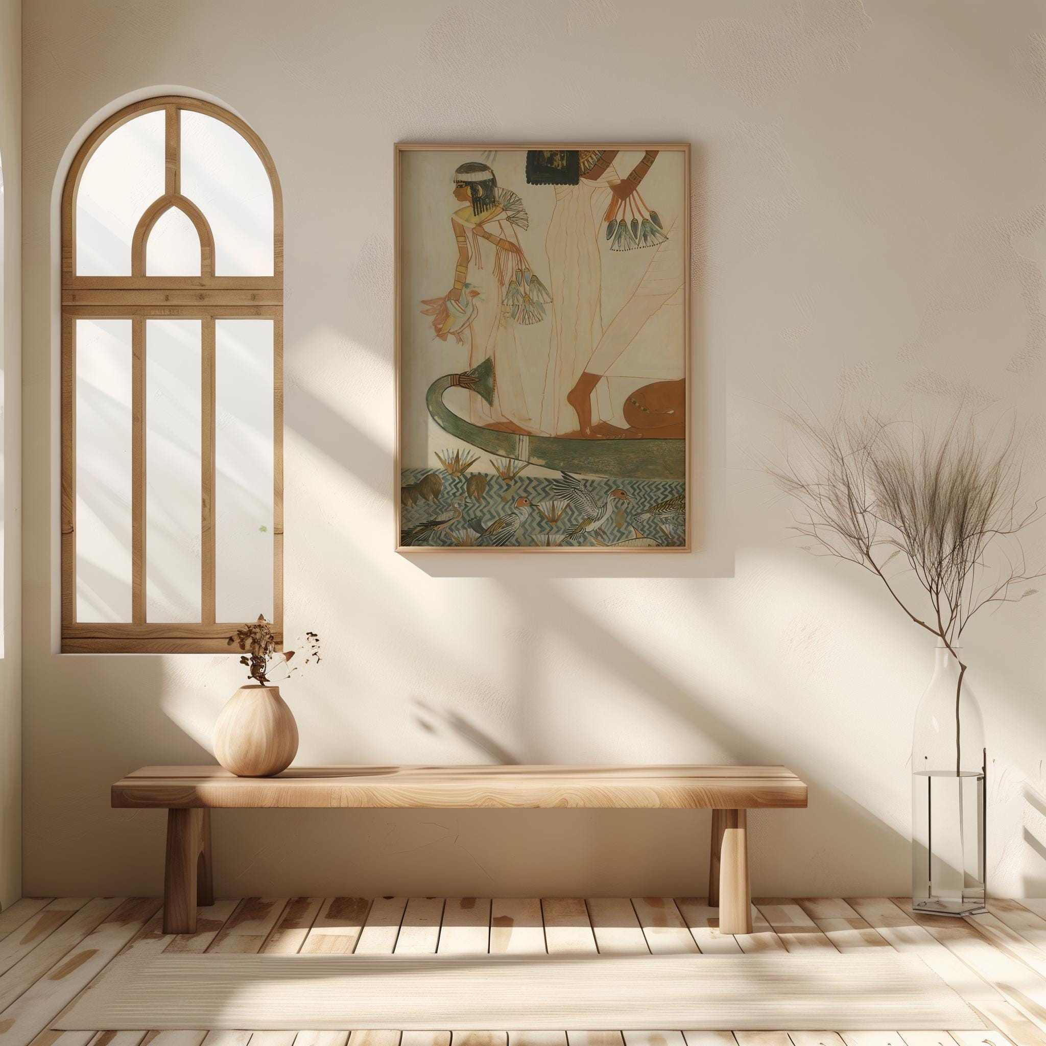 Digital Download | This digital download features a stunning art print inspired by the rich history of ancient Egyptian tomb paintings. The artwork captures a serene scene with a noble figure holding delicate lotus flowers and a bird, painted in beautiful earth tones of ochre, gold, and vibrant teal.