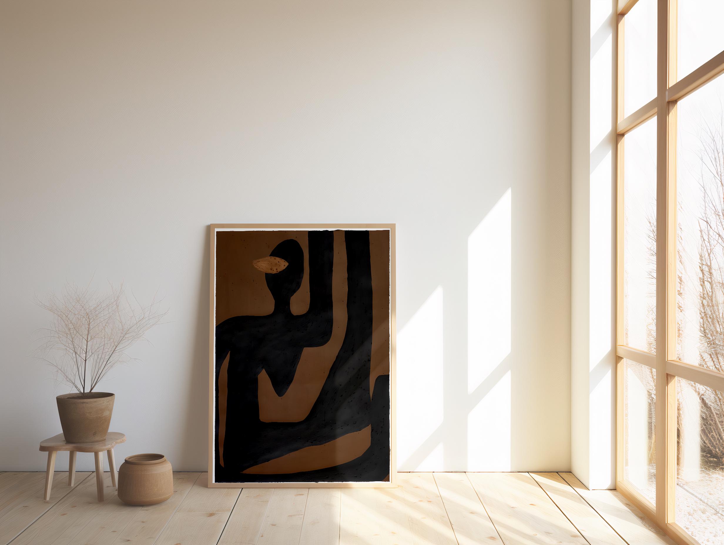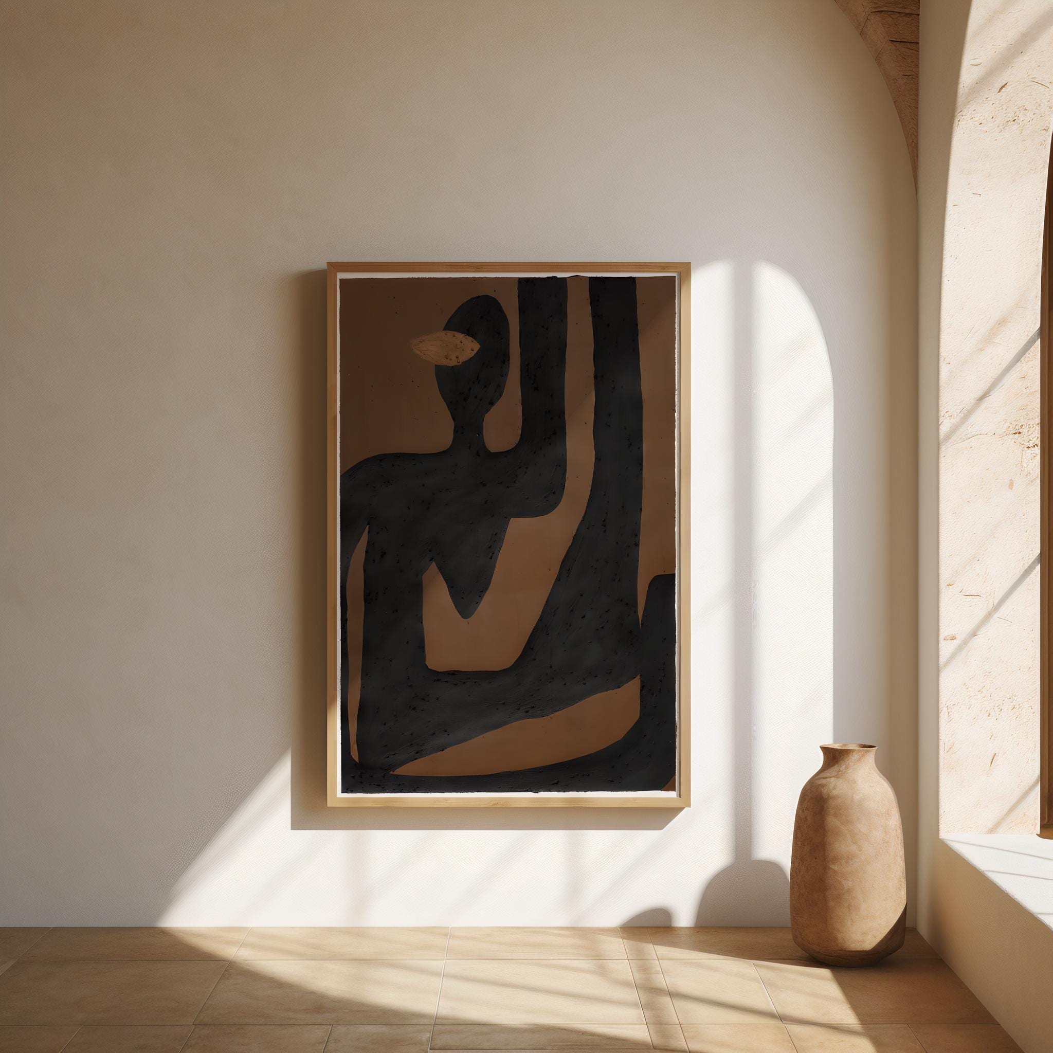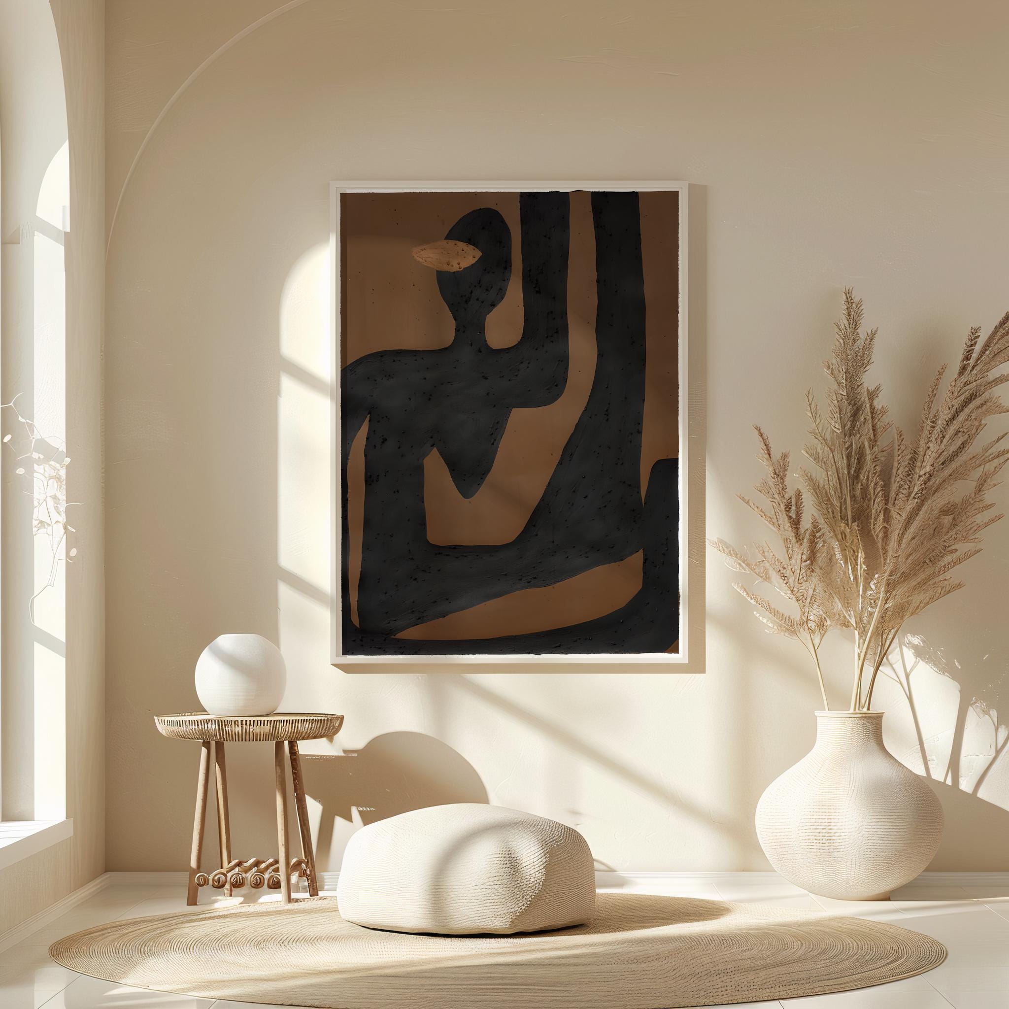Digital Download | This is a digital download of a contemporary abstract painting featuring bold black shapes on a warm brown background, accented with a subtle gold-toned oval. The minimalist design and earthy color palette create a striking yet understated piece of modern art.