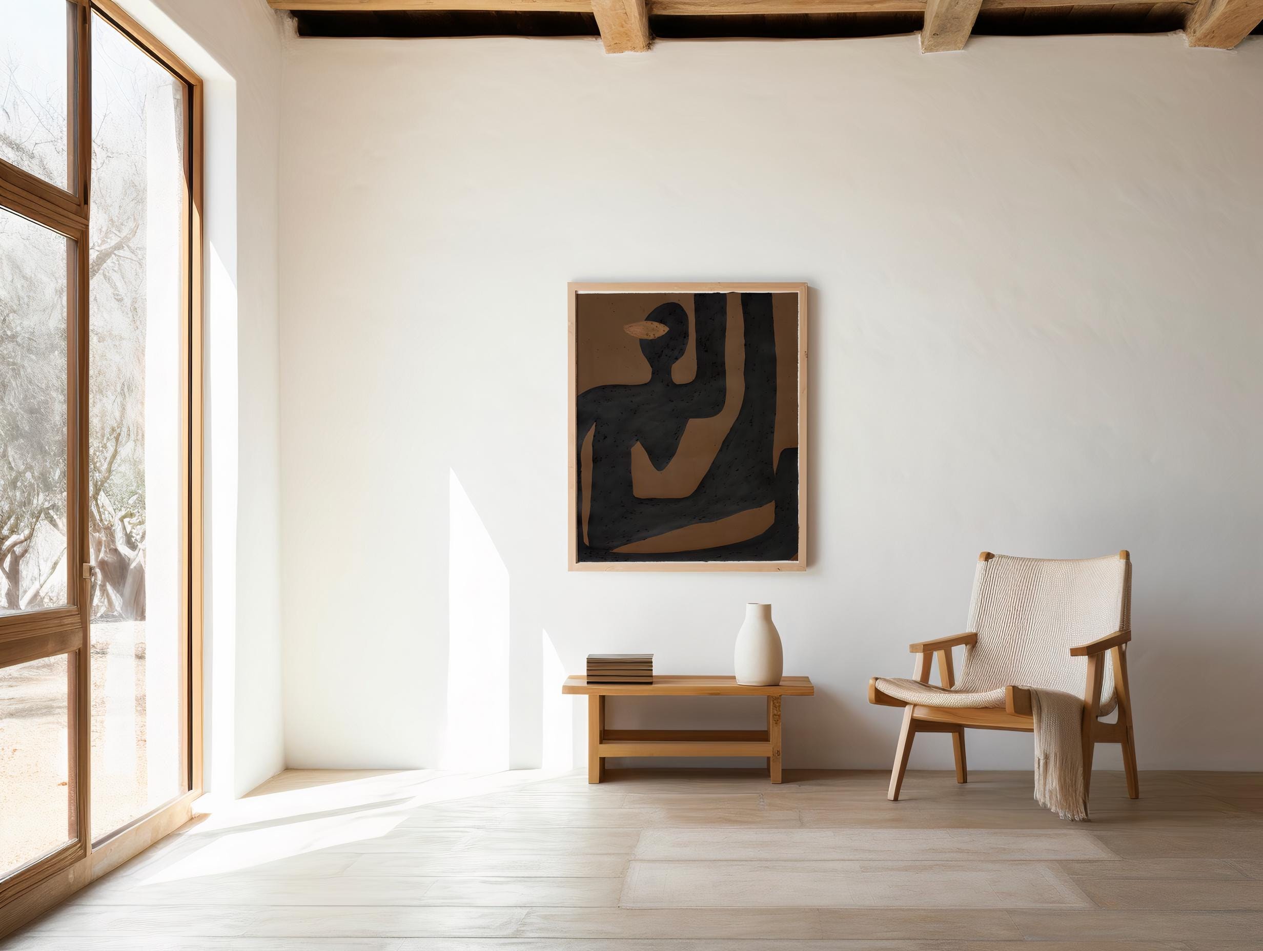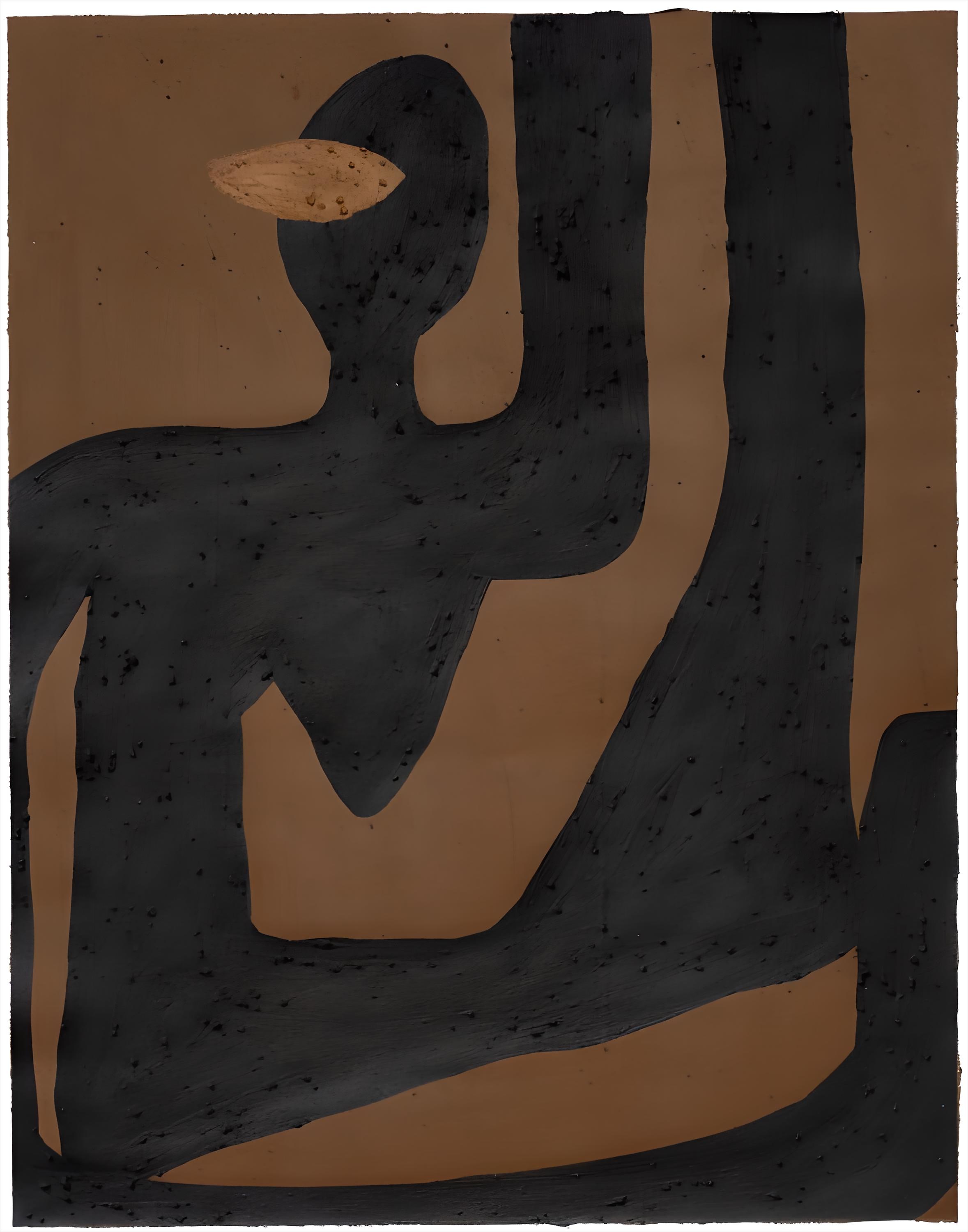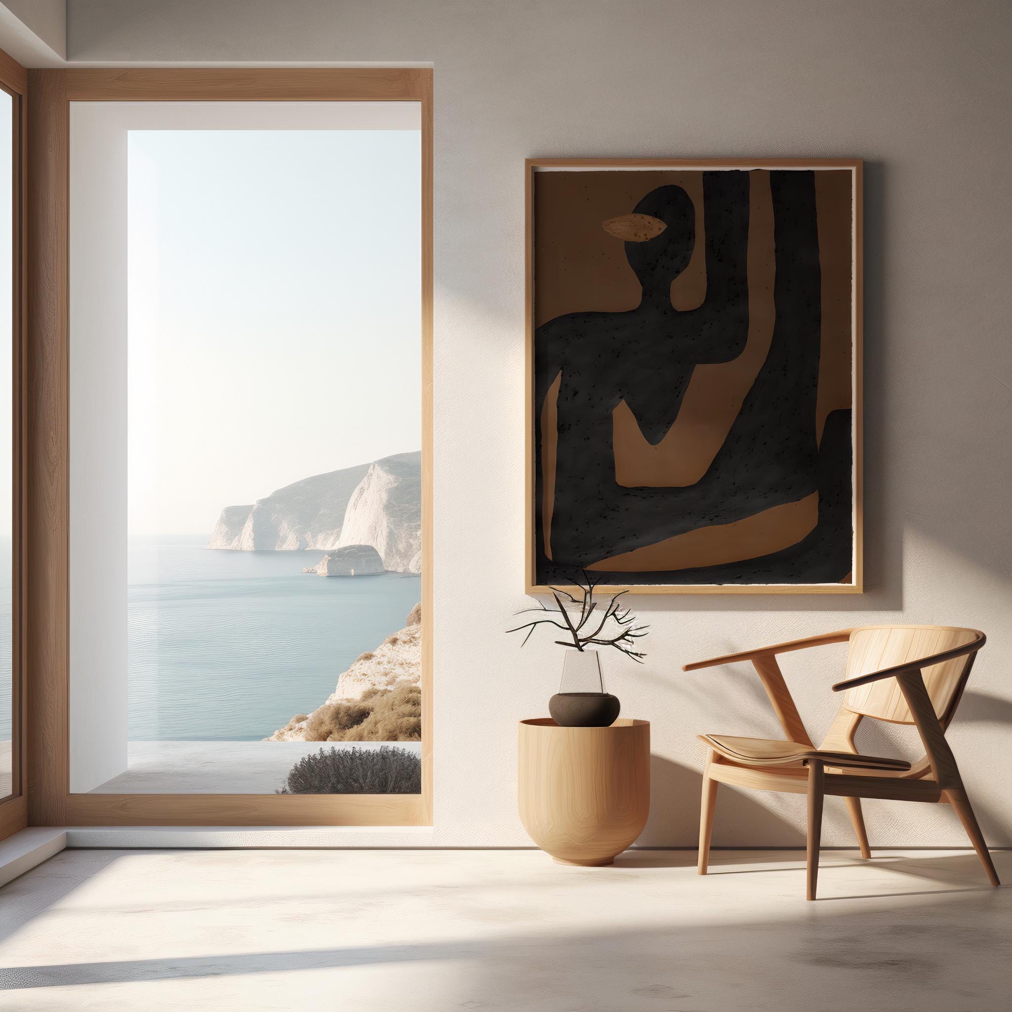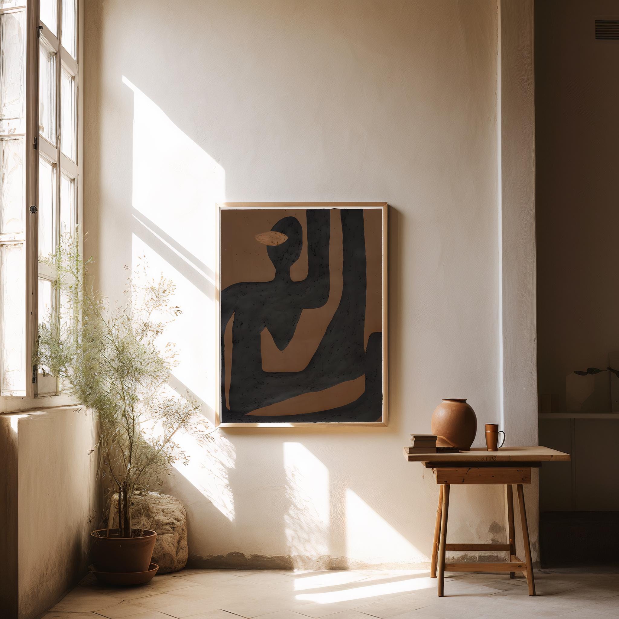 Digital Download | This is a digital download of a contemporary abstract painting featuring bold black shapes on a warm brown background, accented with a subtle gold-toned oval. The minimalist design and earthy color palette create a striking yet understated piece of modern art.