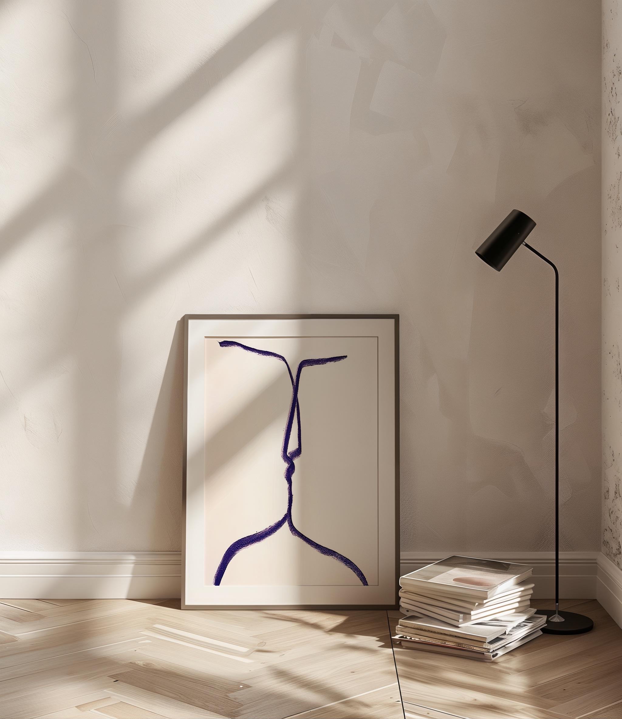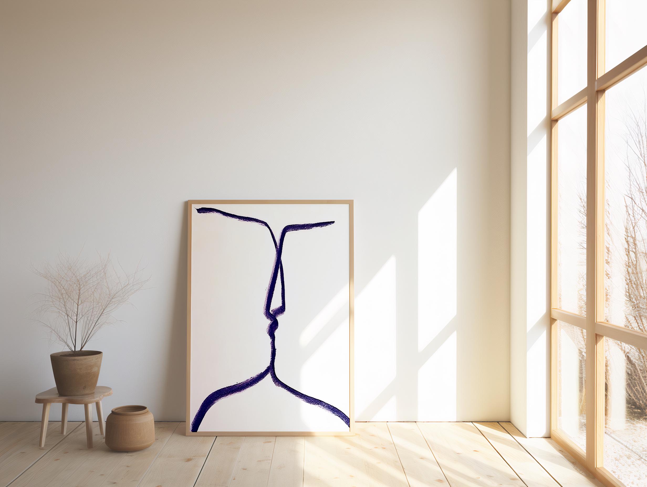 Digital Download | This is a digital download of a simple yet powerful abstract line drawing. The continuous, flowing line creates the delicate silhouettes of two faces leaning in for a kiss. The minimalist design in a beautiful blue-purple hue against a clean white background makes this piece both modern and deeply romantic.