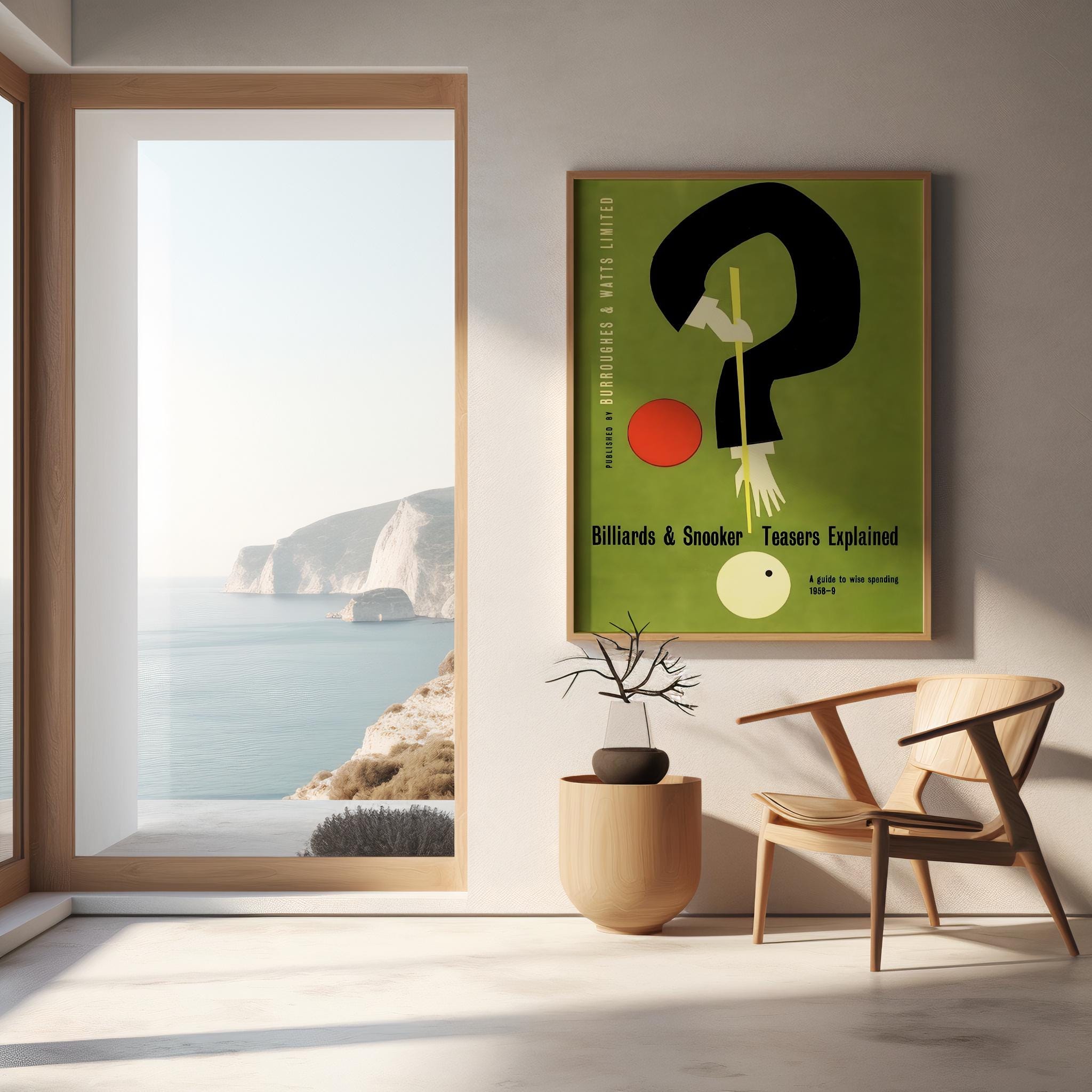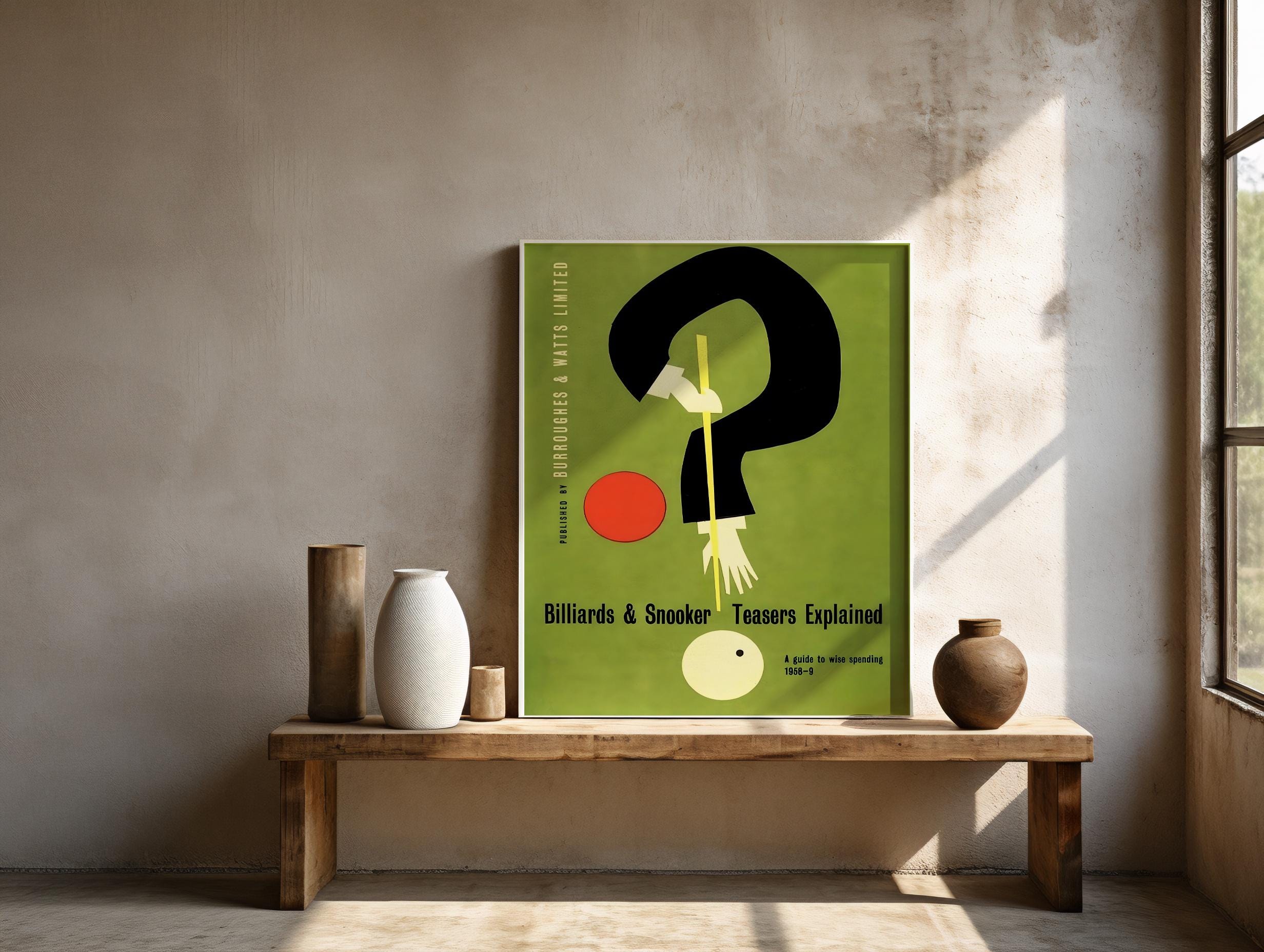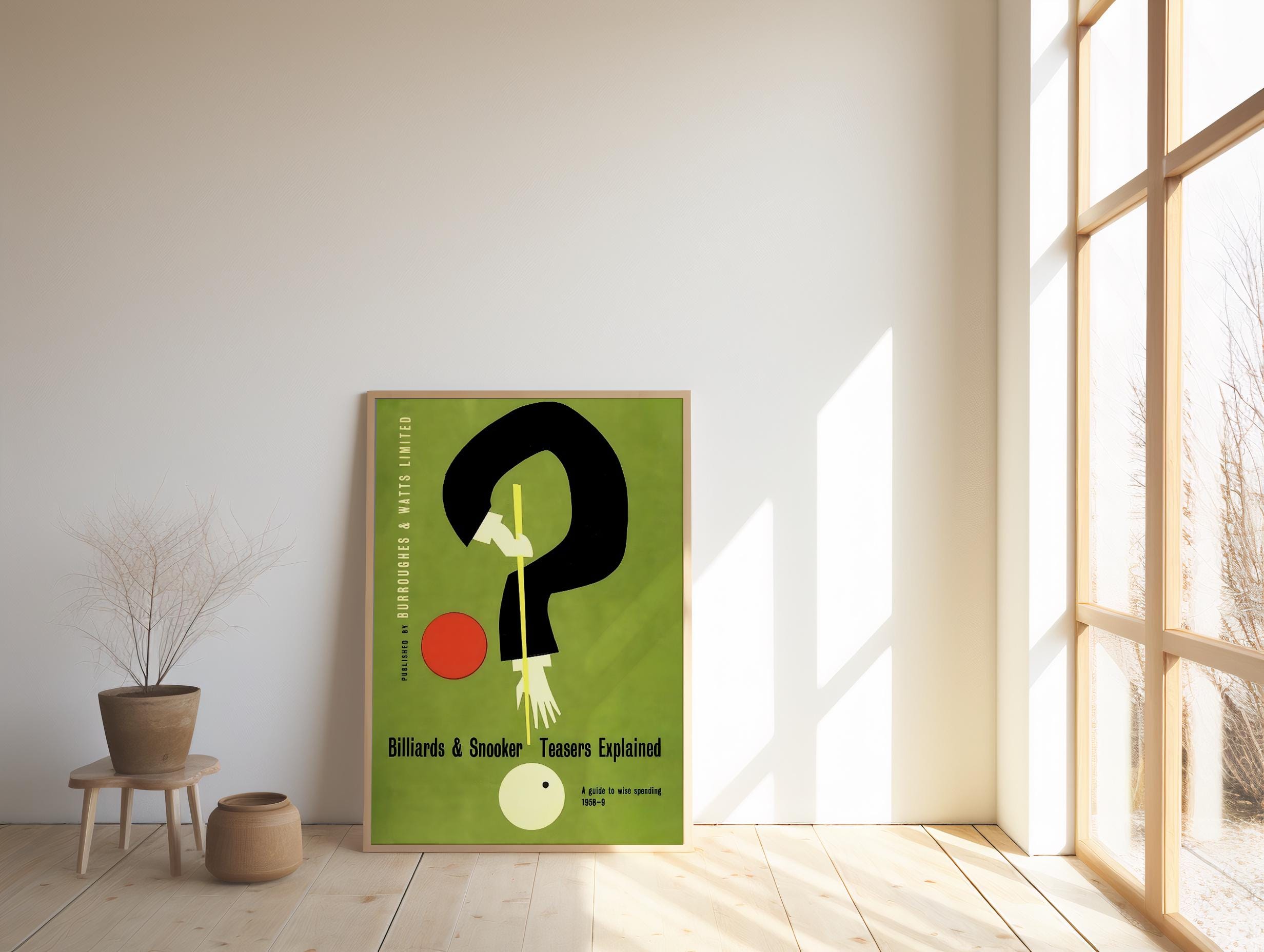 Digital Download | Add a touch of retro charm to your space with this digital download of a vintage billiards and snooker poster. Originally published in 1958, this print features a unique, stylized design with a question mark shape formed by a player's arm, creating a captivating and modern look. The rich, olive green background and bold, minimalist shapes make it a perfect fit for a game room, den, or office.