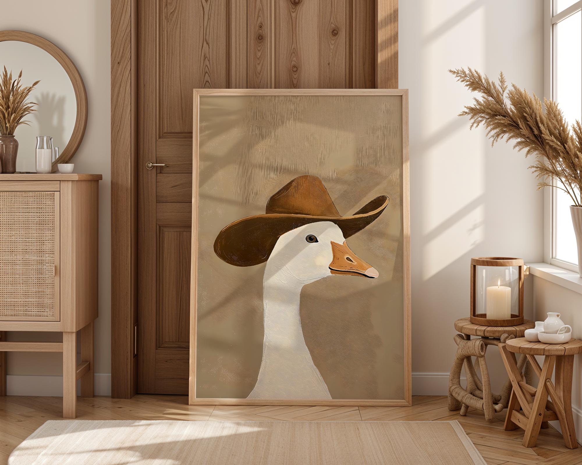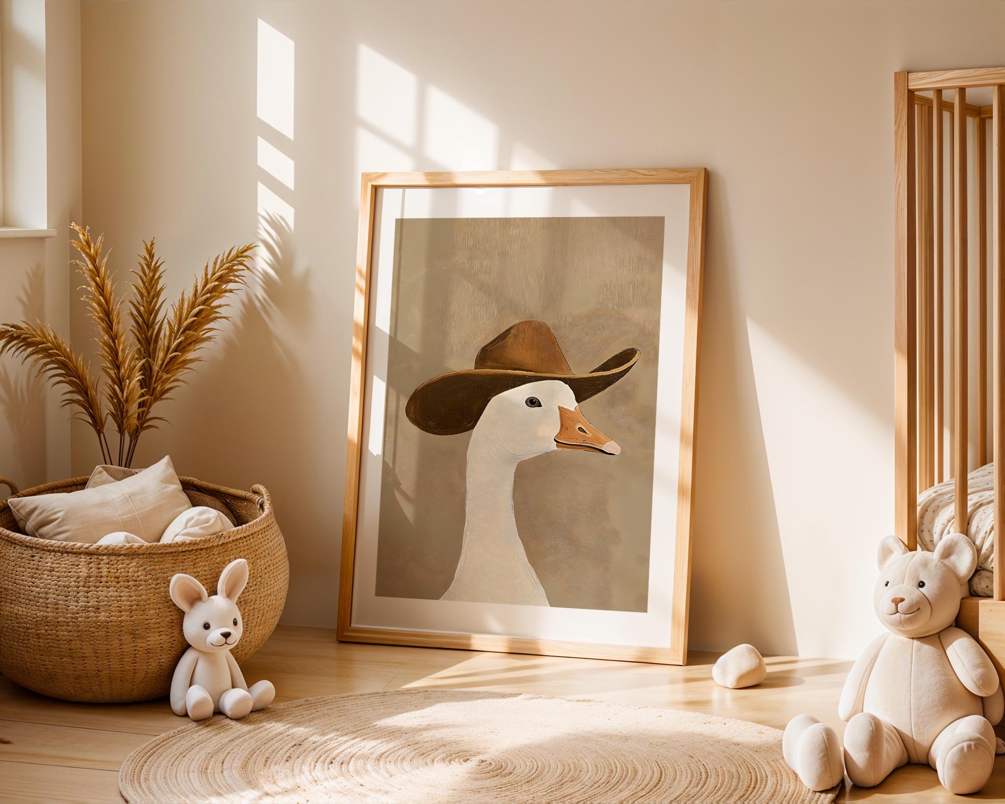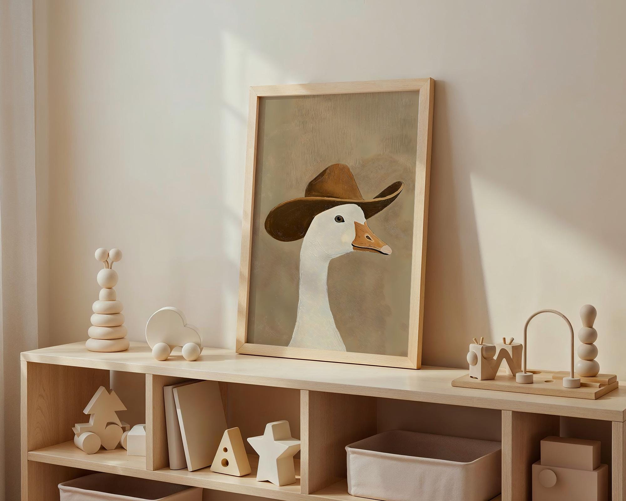 Well, howdy partner! Add a dash of playful, rustic charm to your space with this Cowboy Goose art print. Featuring a handsome goose tipping his cowboy hat, this piece is guaranteed to bring a smile to anyone's face.