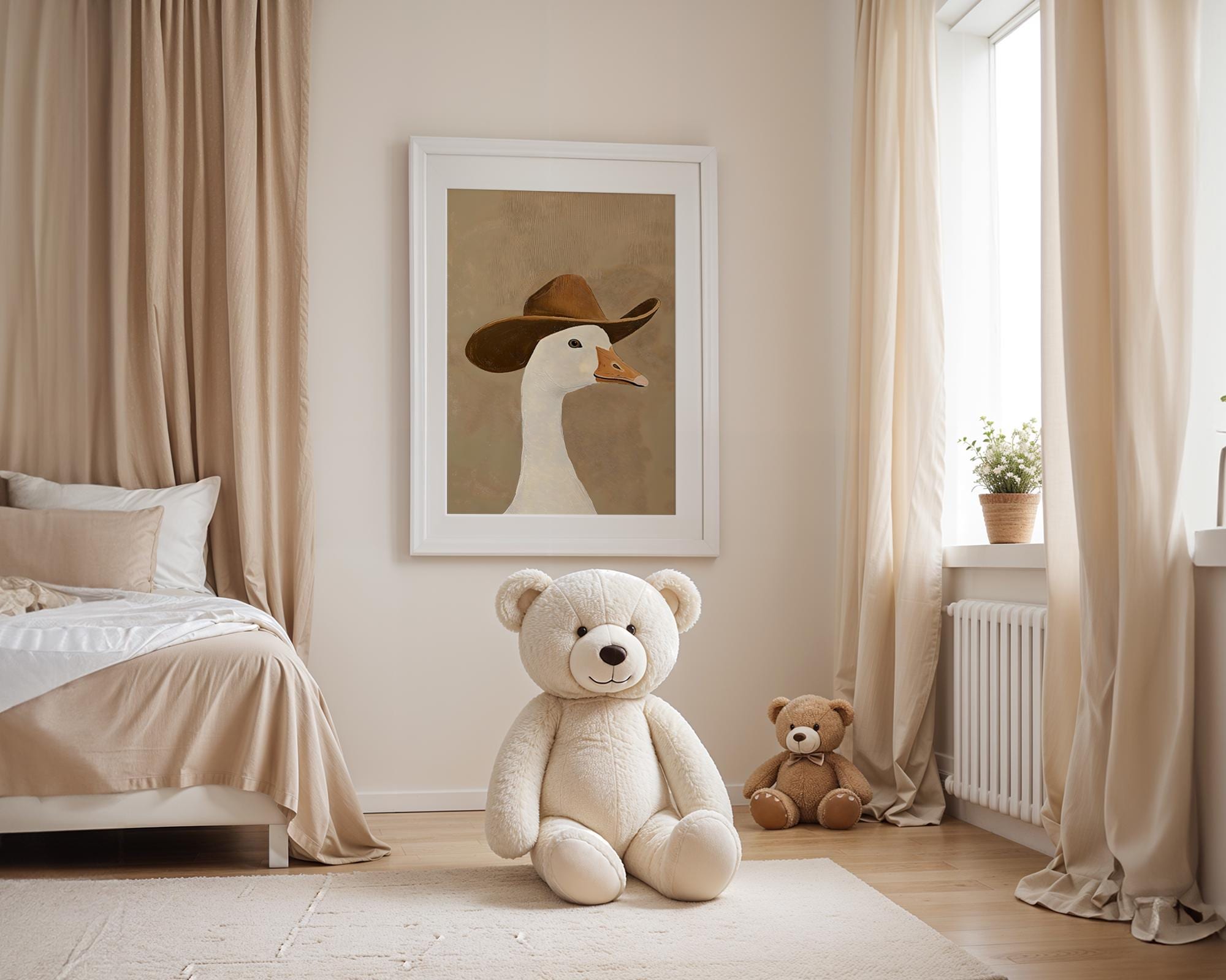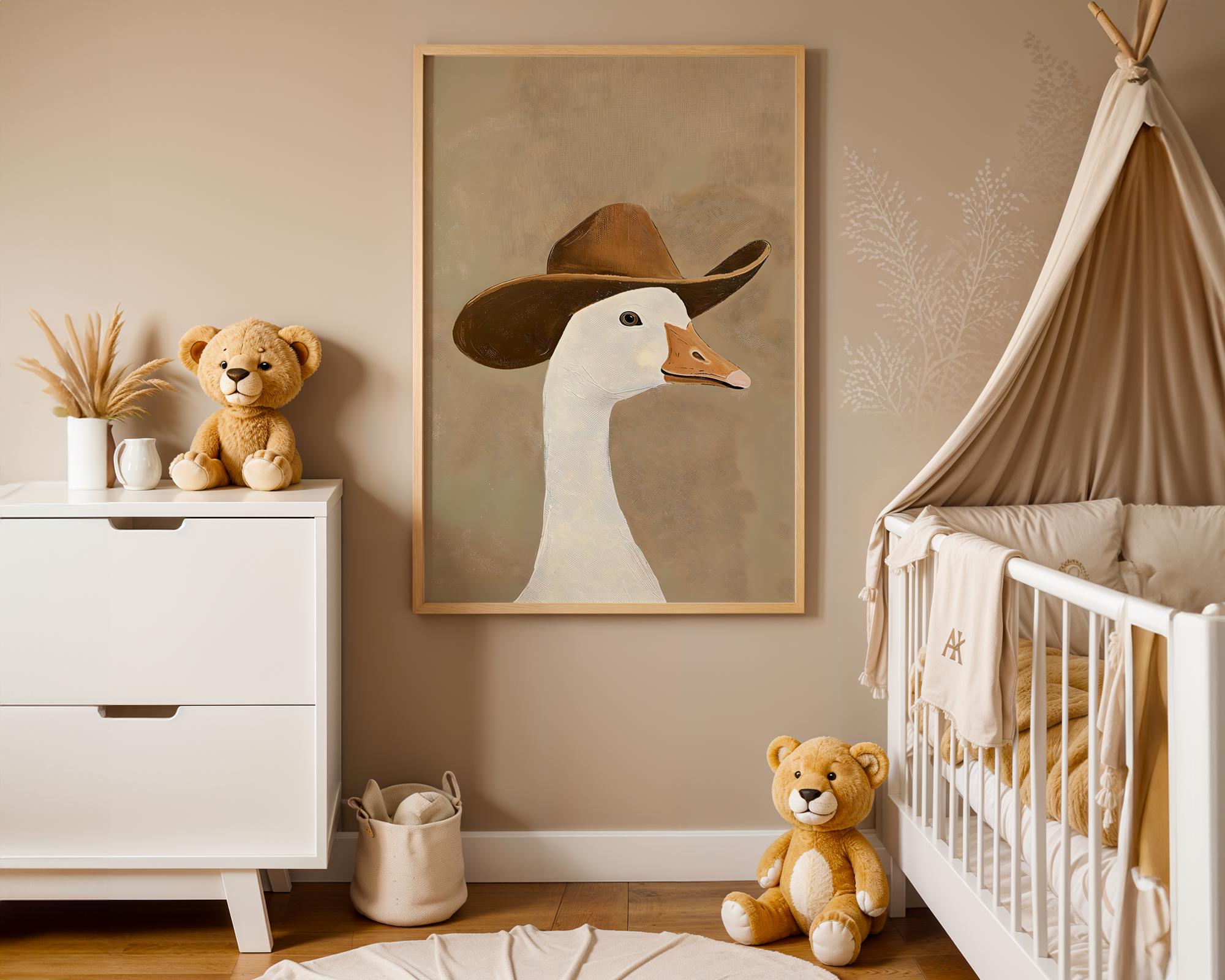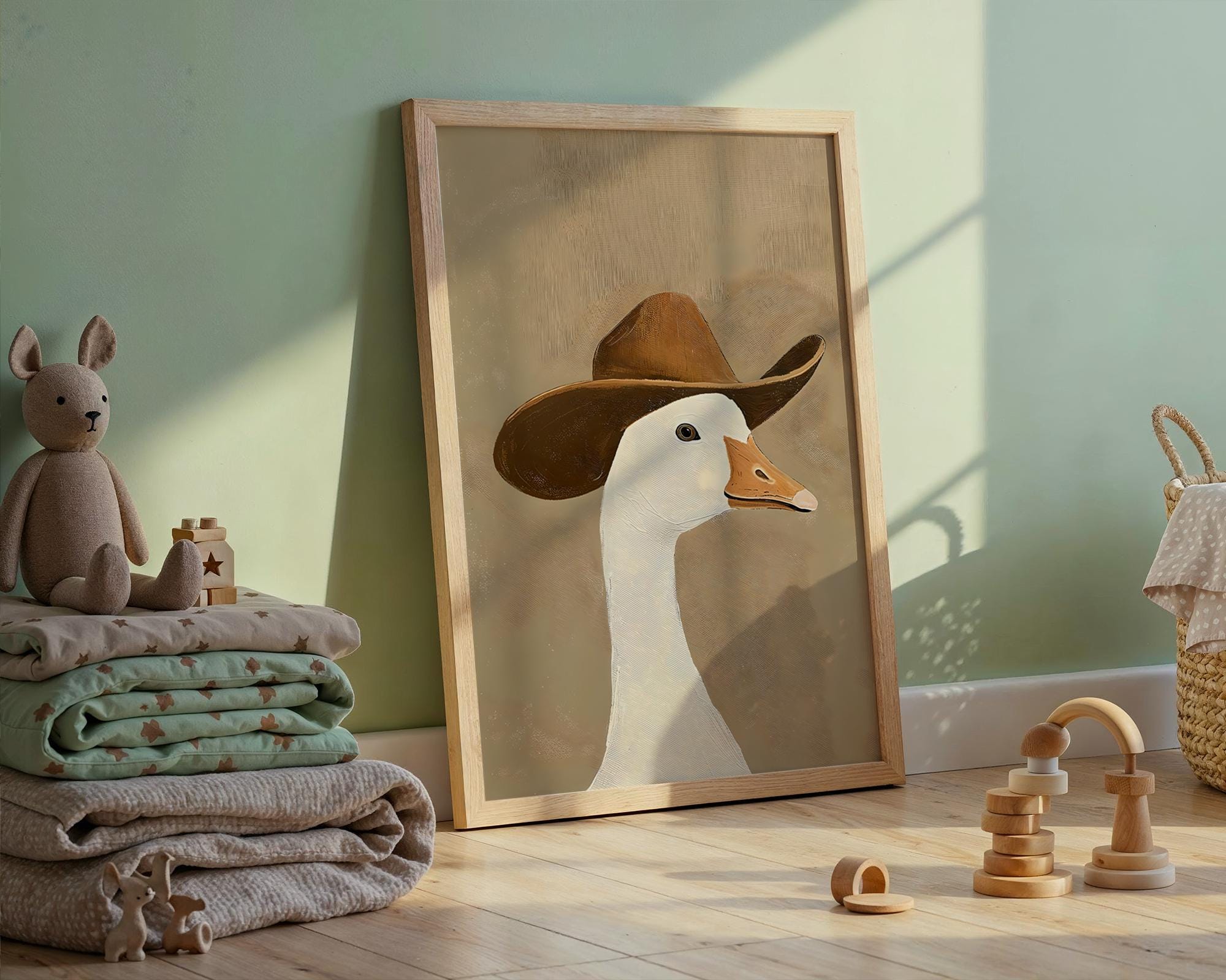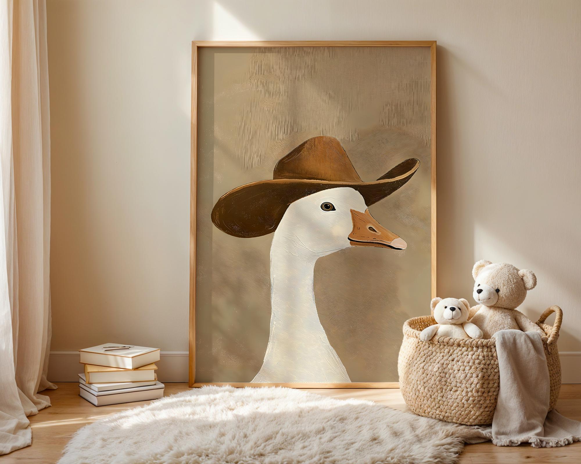 Well, howdy partner! Add a dash of playful, rustic charm to your space with this Cowboy Goose art print. Featuring a handsome goose tipping his cowboy hat, this piece is guaranteed to bring a smile to anyone's face.