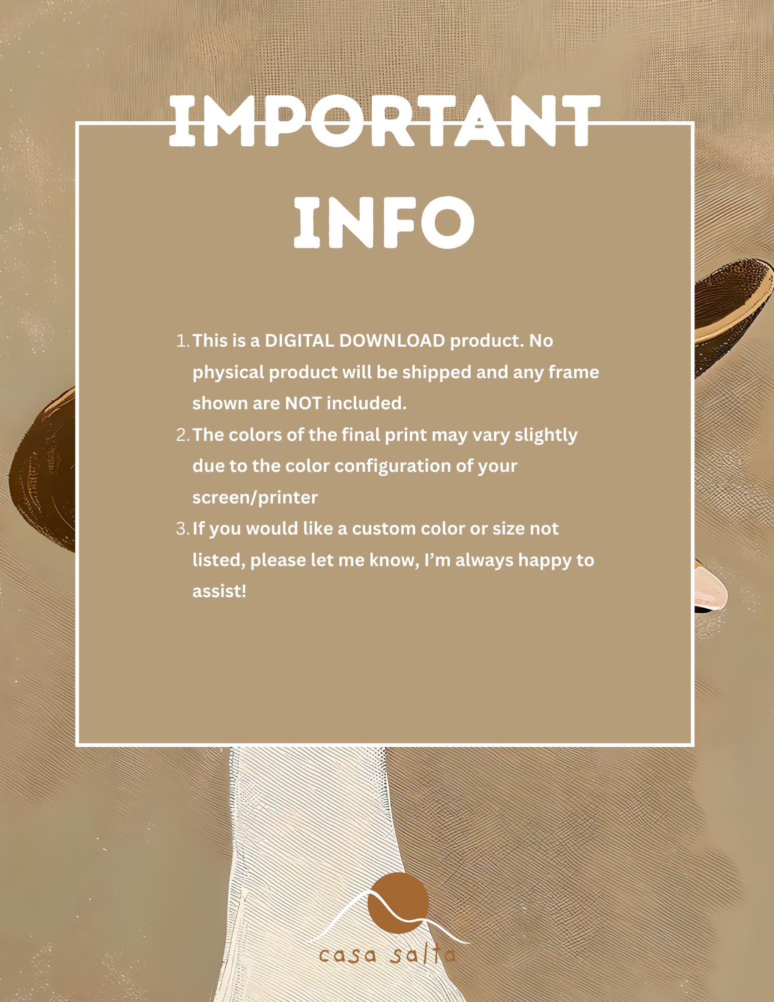 1. Purchase: After your purchase, you'll instantly get access to your downloadable files. 2. Print: Print the art at home, take it to a local print shop, or use an online service. 3. Decorate: Frame your new print and watch your space come to life!