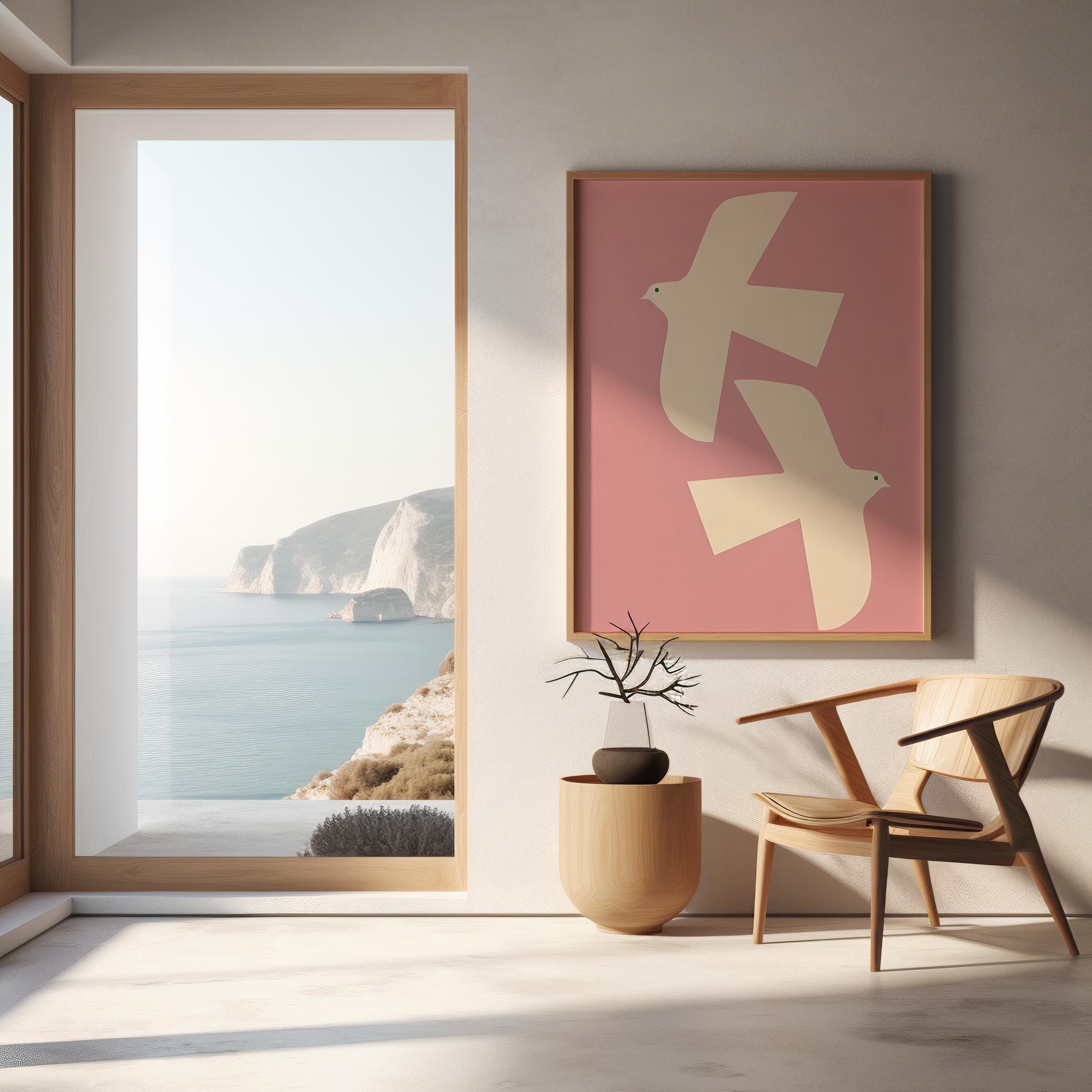 Bring a sense of peace and gentle serenity to your space with this beautiful Pink Dove art print. Featuring two gracefully silhouetted doves with a touch of green in their eyes, soaring across a soft pink background, this piece embodies tranquility and hope.