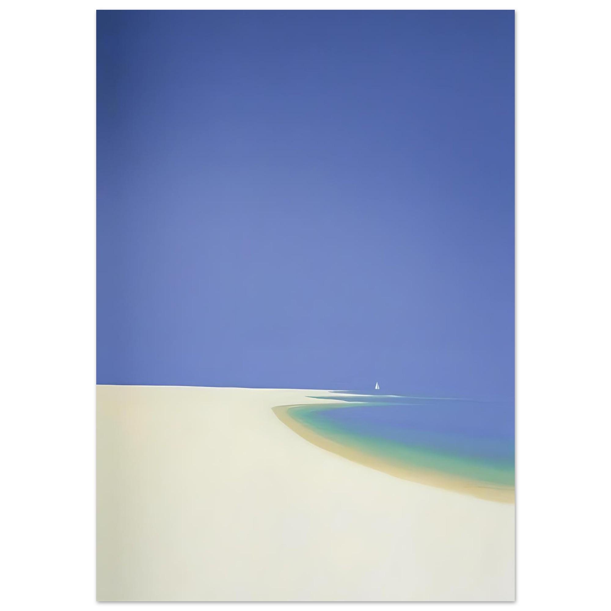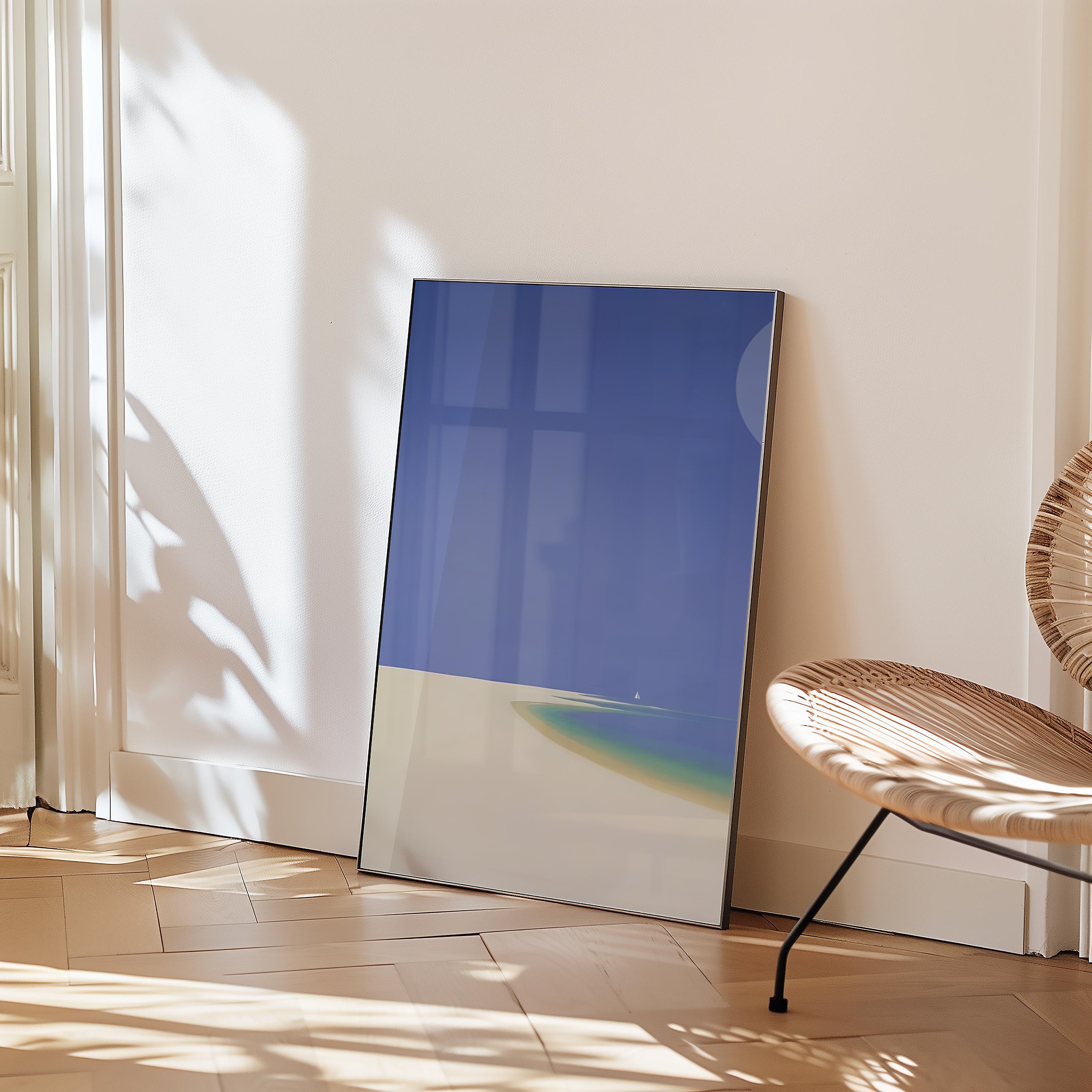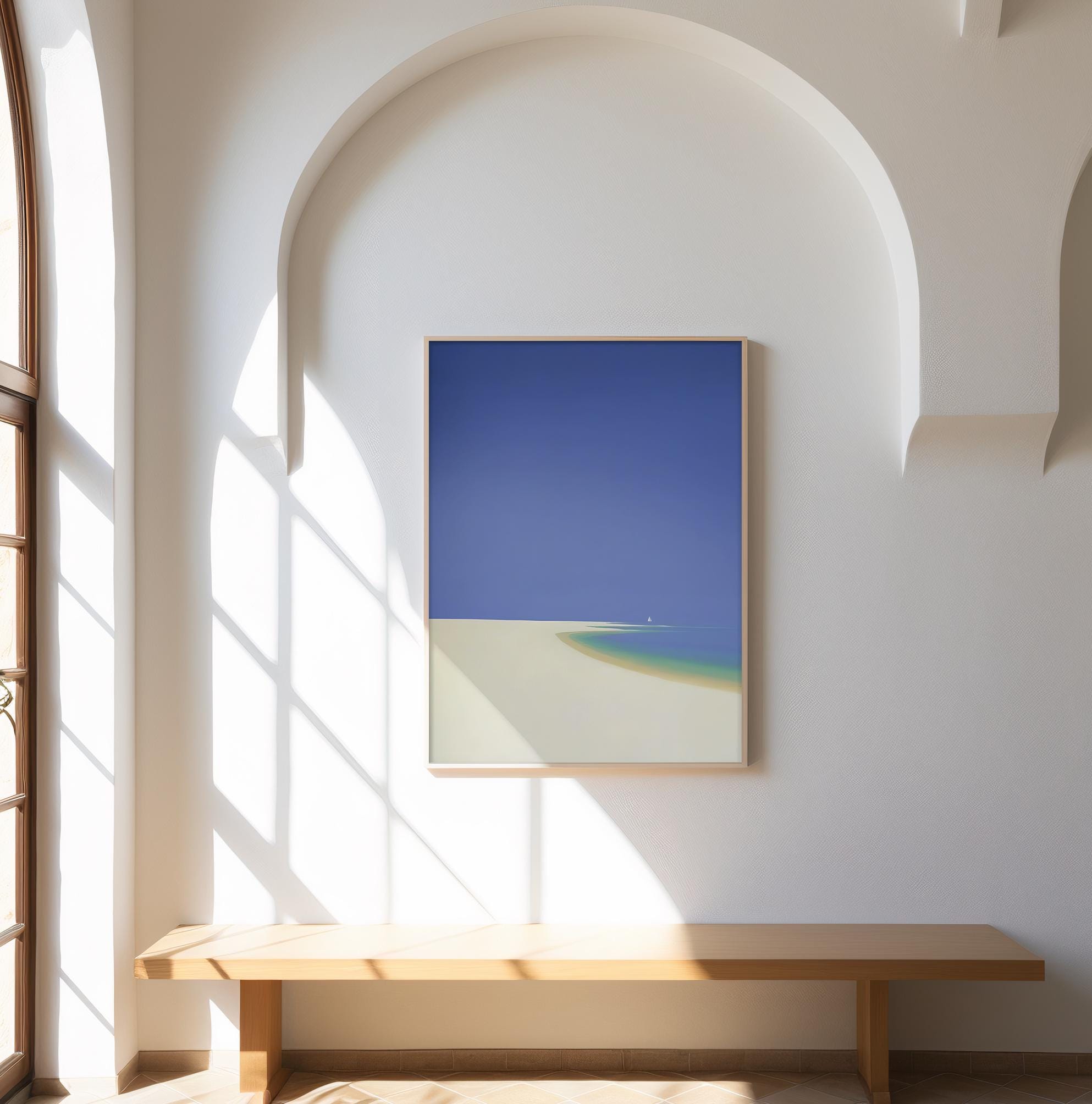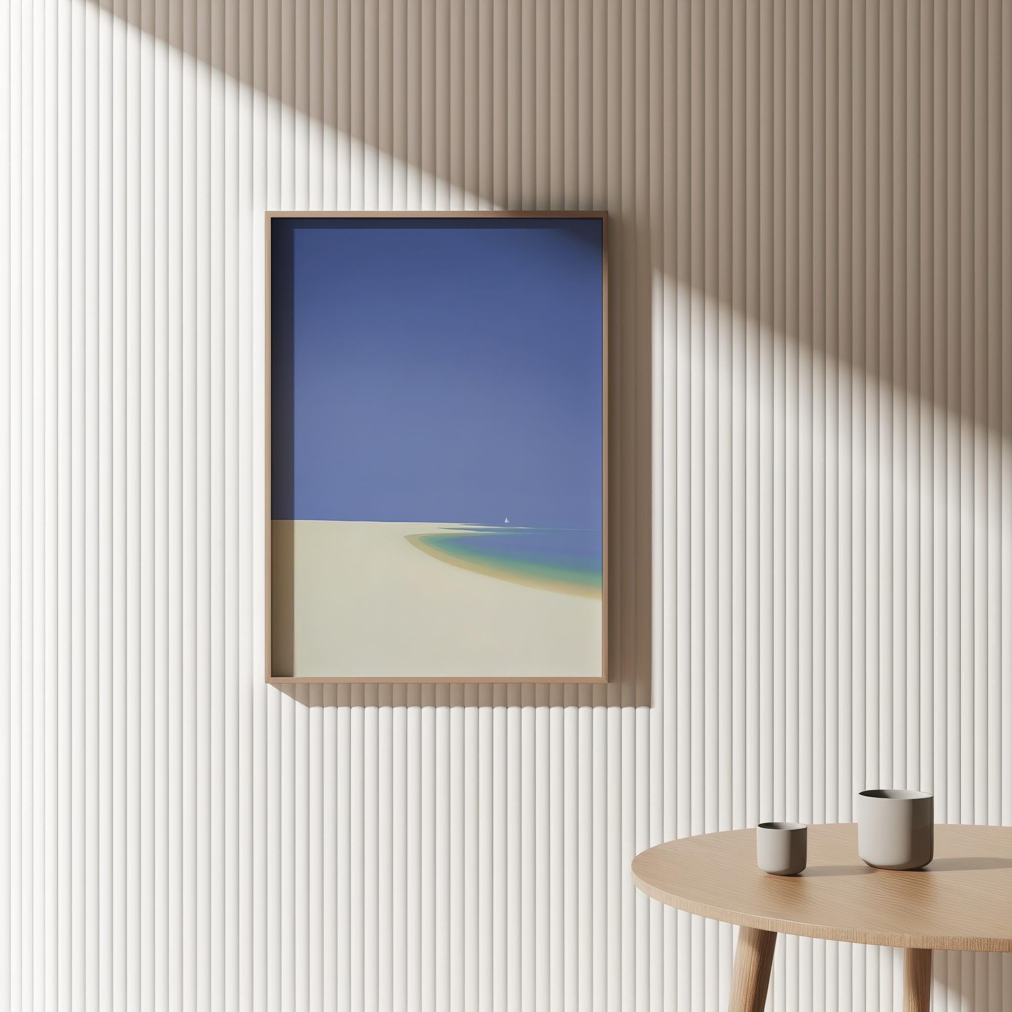 Escape to a world of calm with this serene and minimalist beachscape print. Featuring a vast, tranquil sky meeting a pristine stretch of sand, this artwork captures a fleeting moment of peace as a lone sailboat glides across the water. The clean lines and soothing color palette make it a perfect statement piece for any space that needs a touch of modern coastal elegance.