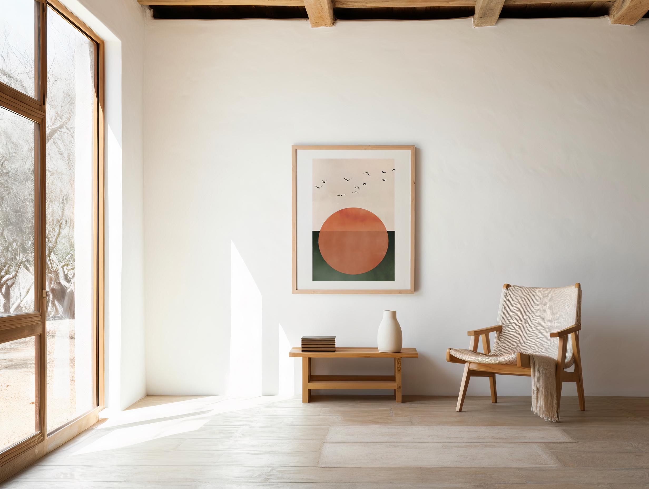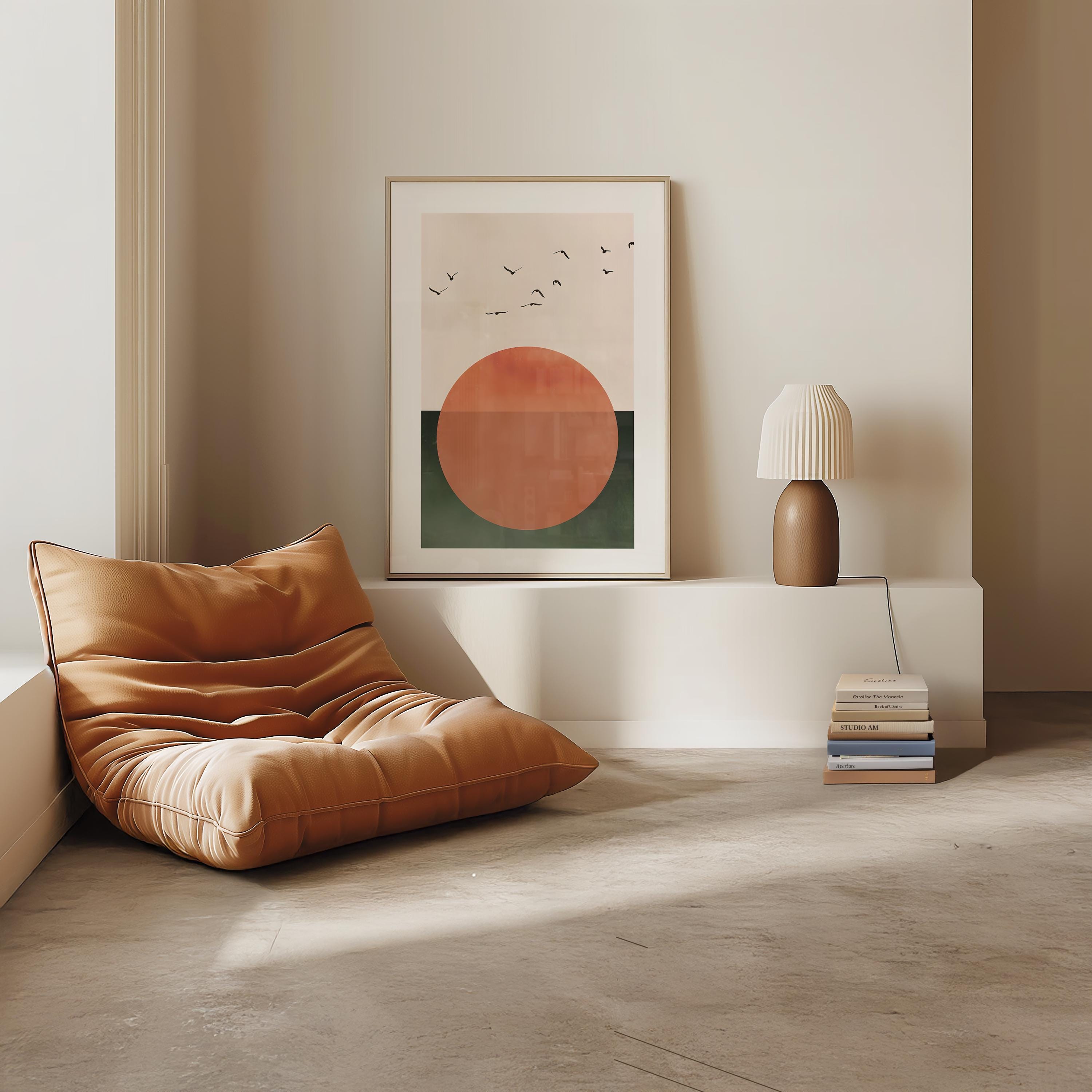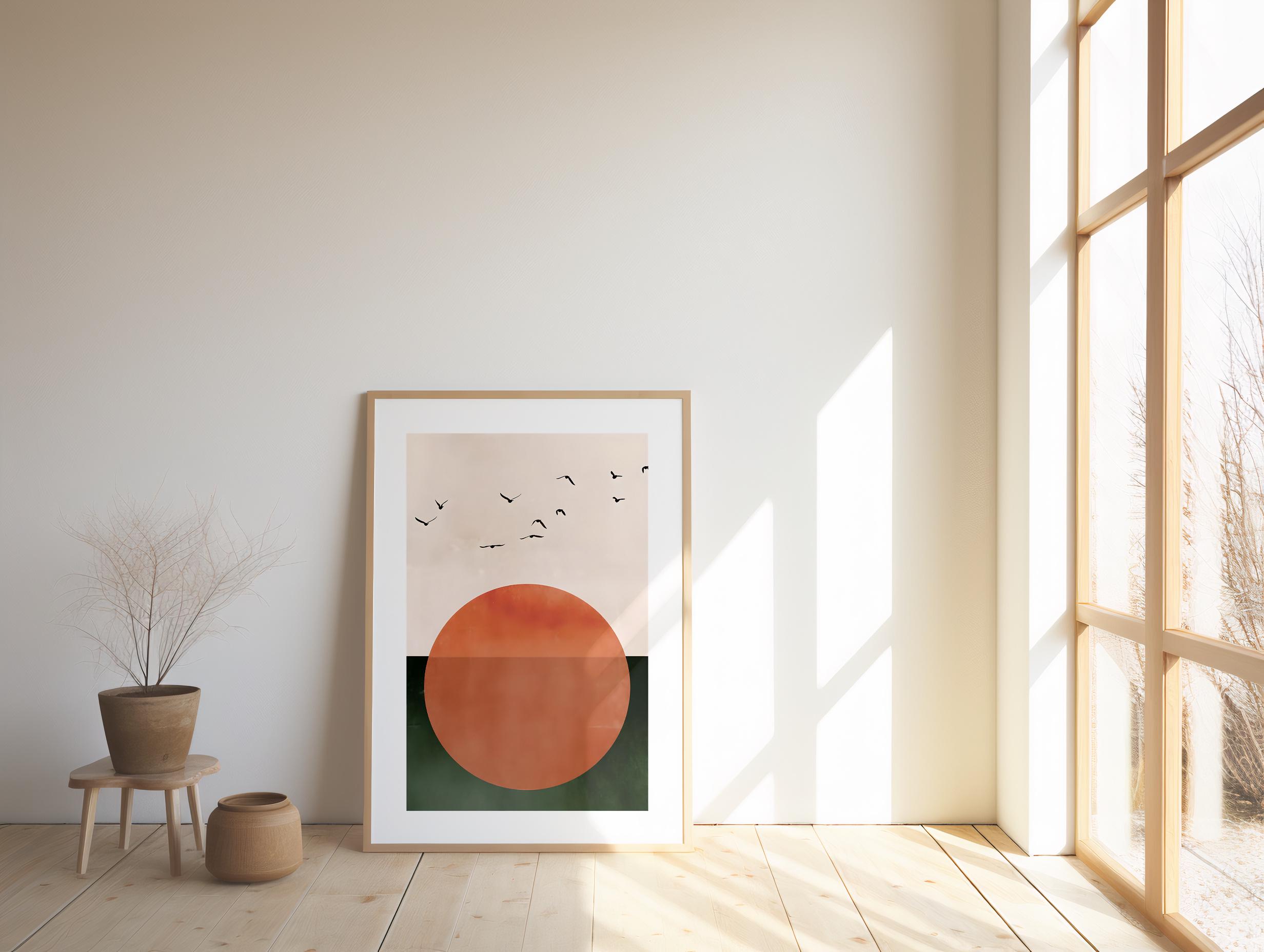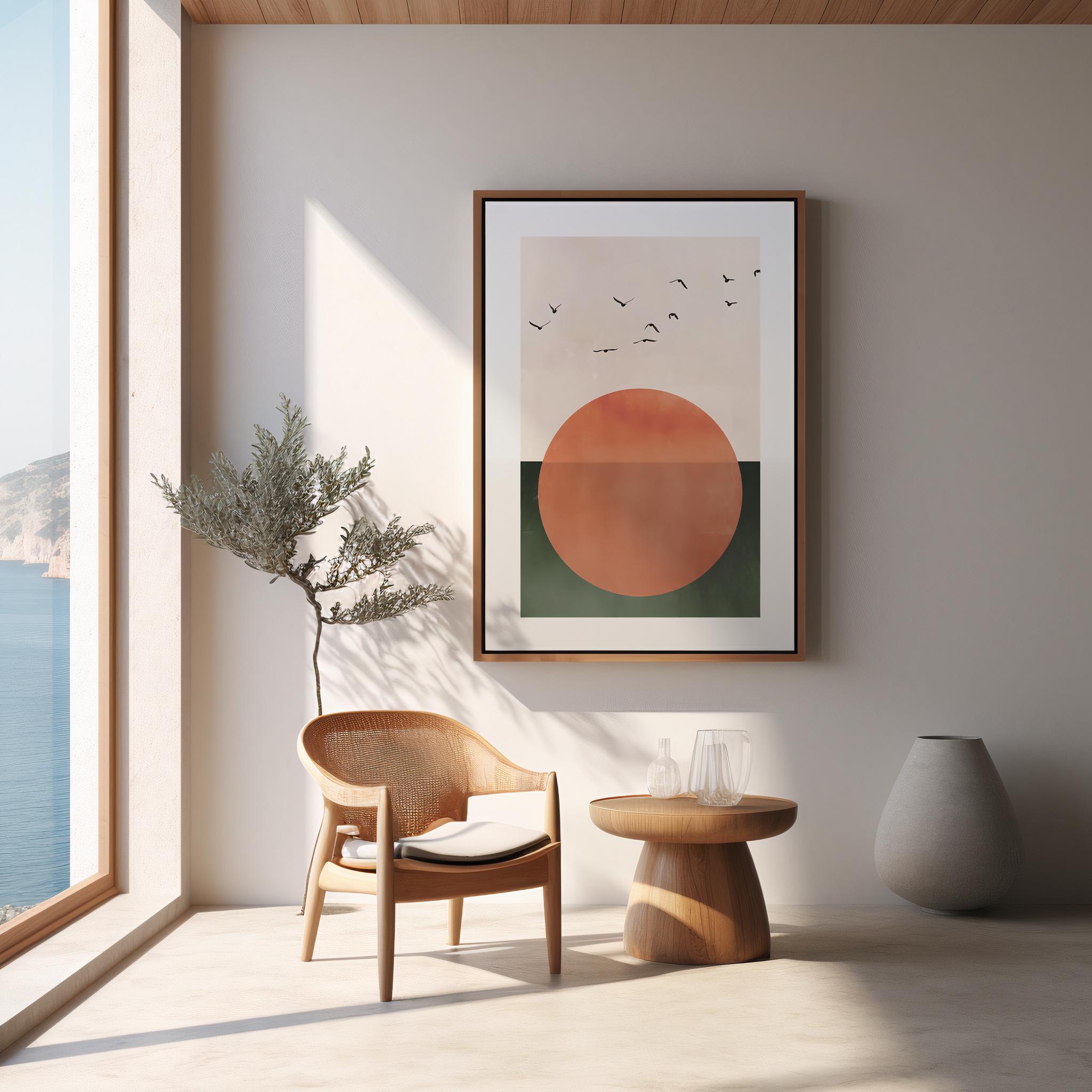 The warm terracotta sun contrasts beautifully with the deep green earth and neutral sky, making it a perfect statement piece for any room. Its minimalist, Japandi-inspired aesthetic is ideal for enhancing your living room, bedroom, office, or entryway.