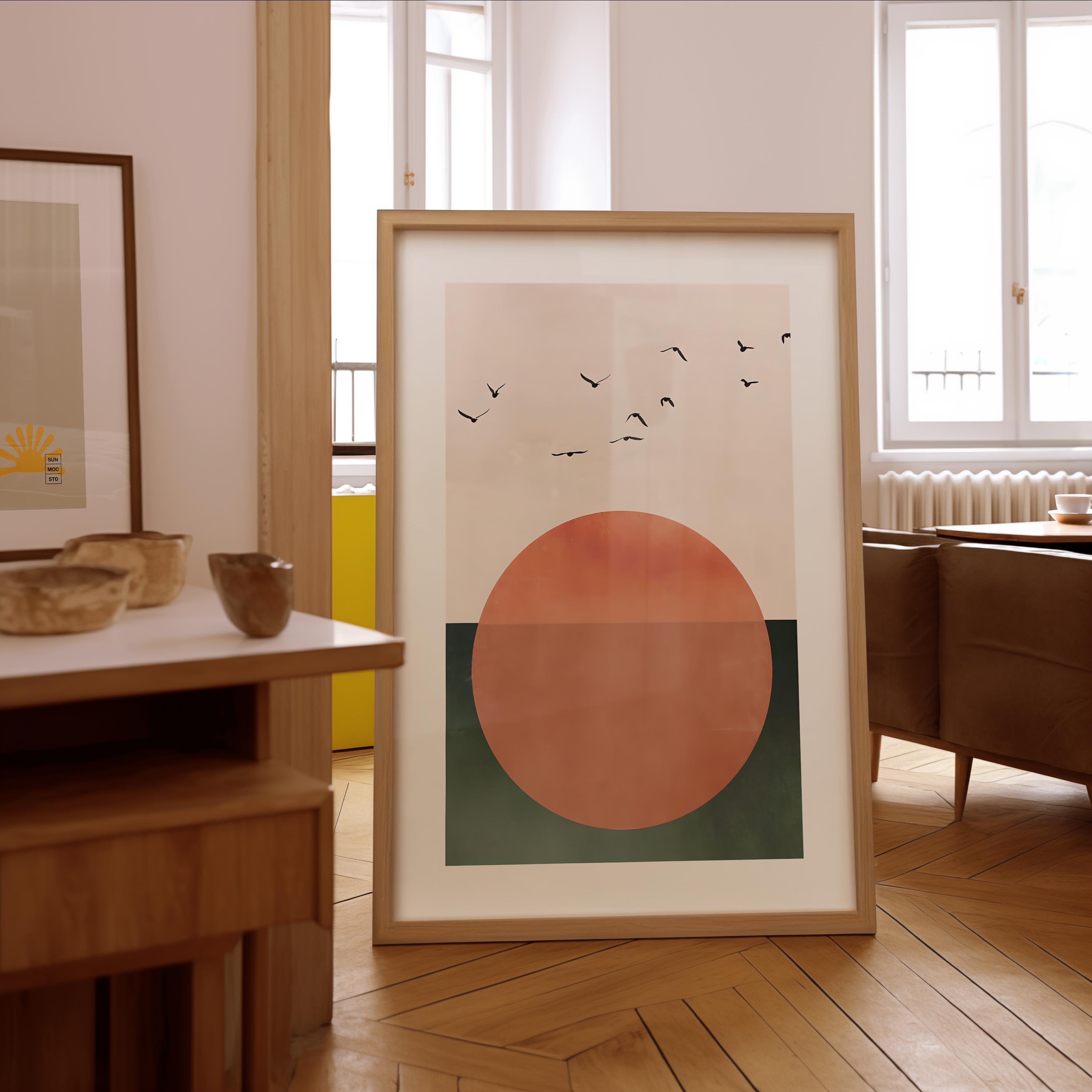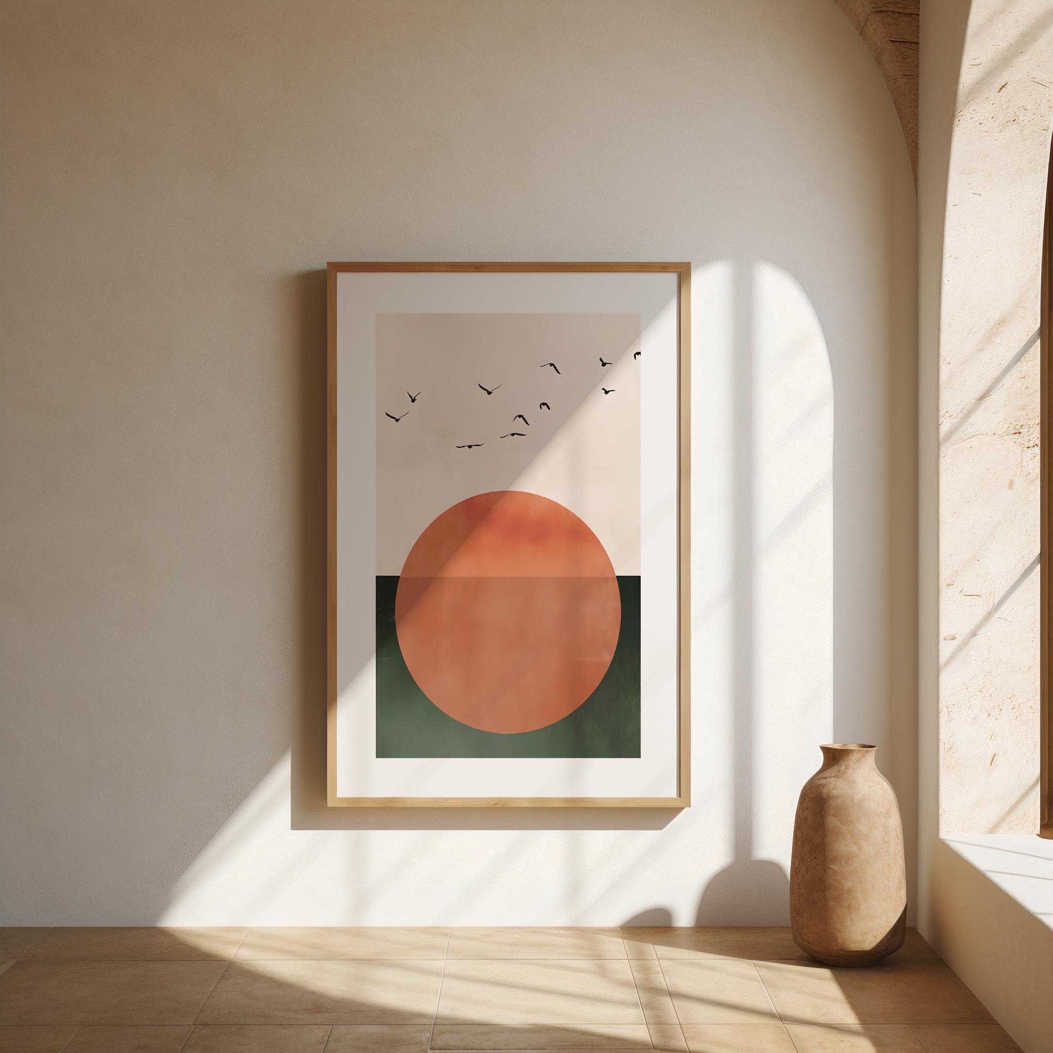 Digital Download | Bring a sense of calm and modern elegance to your space with this beautiful abstract art print. Featuring a flock of birds against a serene, color-blocked landscape, this piece captures the tranquility of a setting sun.