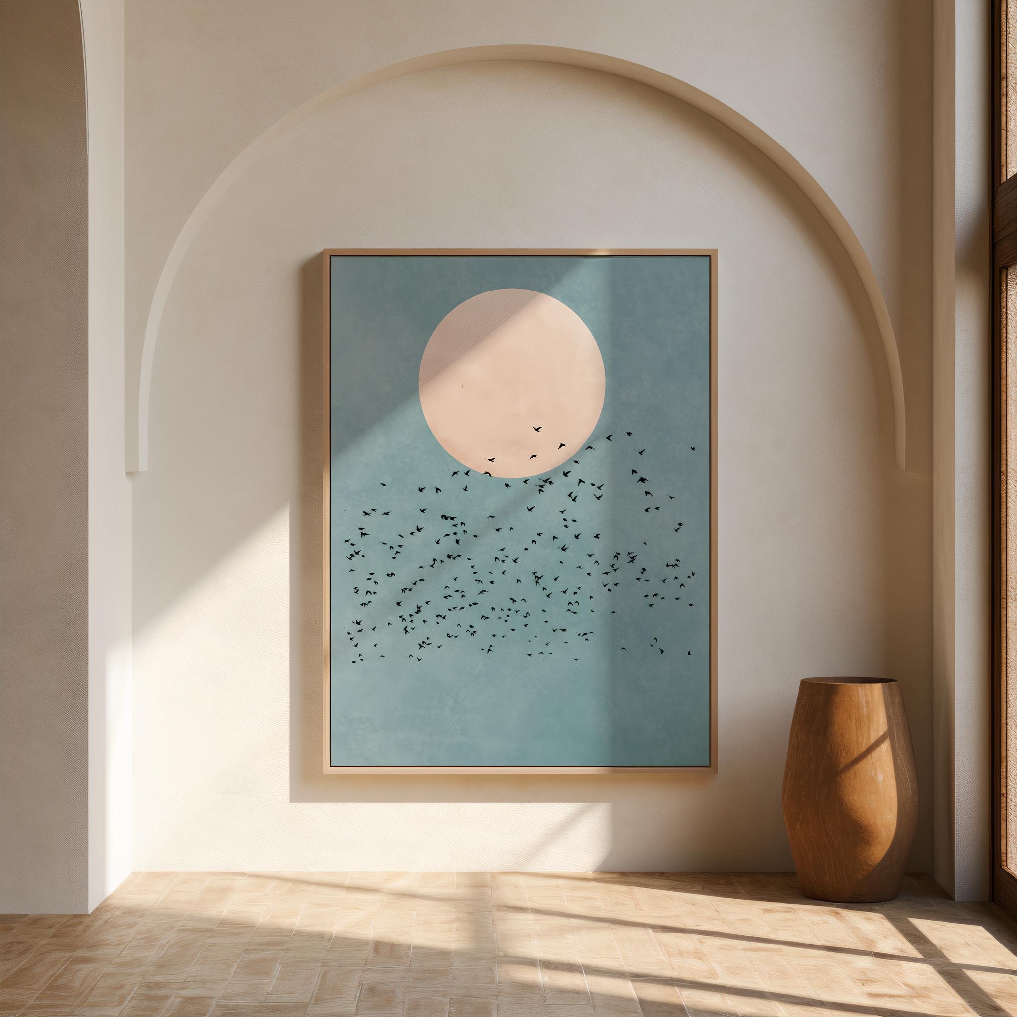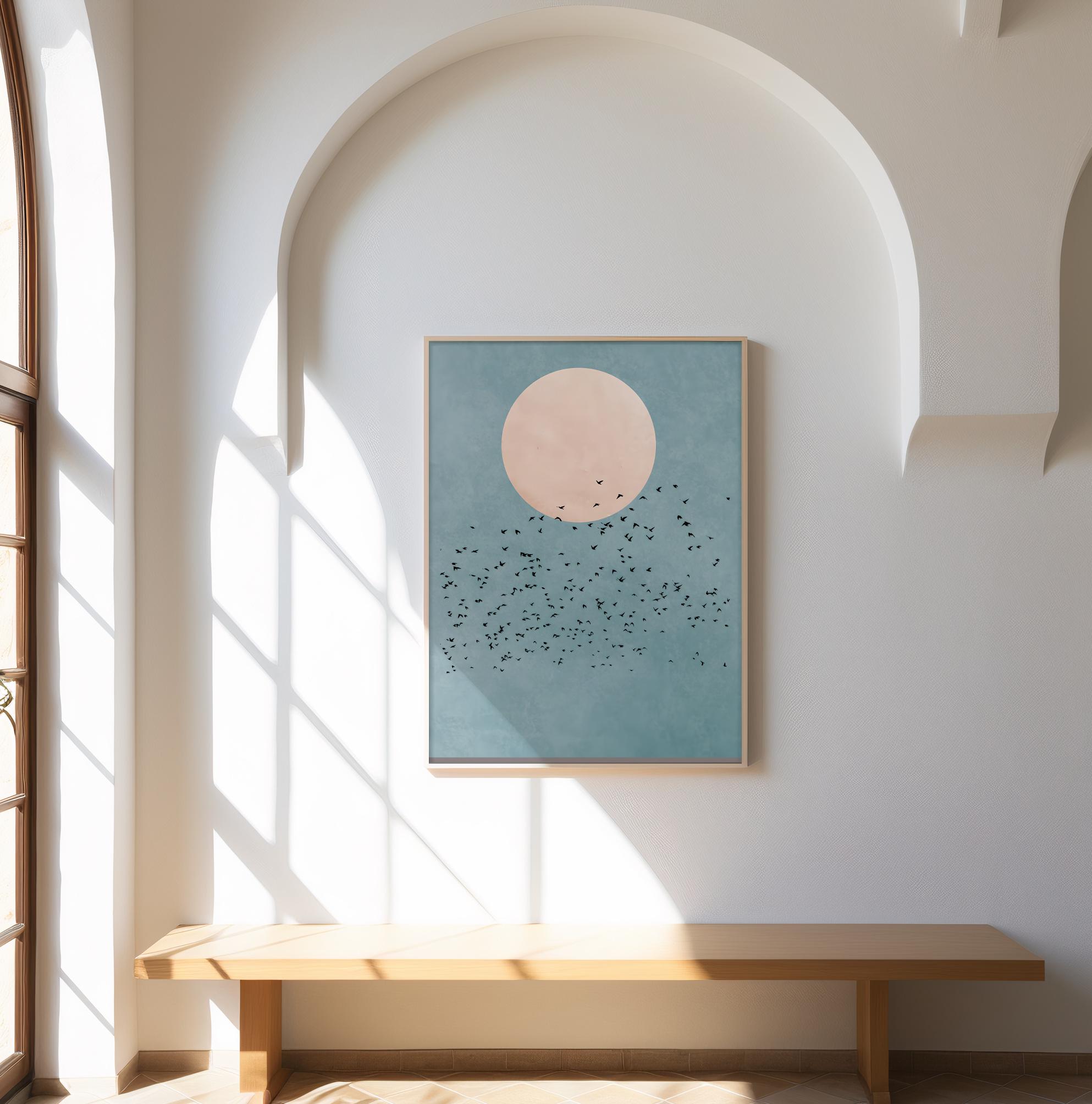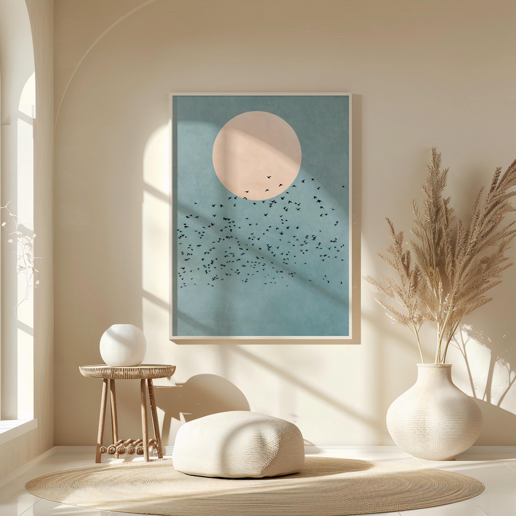 Digital Download | Bring a sense of serene beauty and natural elegance into your home with this minimalist bird silhouette print. Featuring a graceful flock of birds against a large, tranquil sun and a beautifully textured, muted blue background, this piece is the perfect addition to any modern, Japandi, Scandinavian, or boho-inspired space.