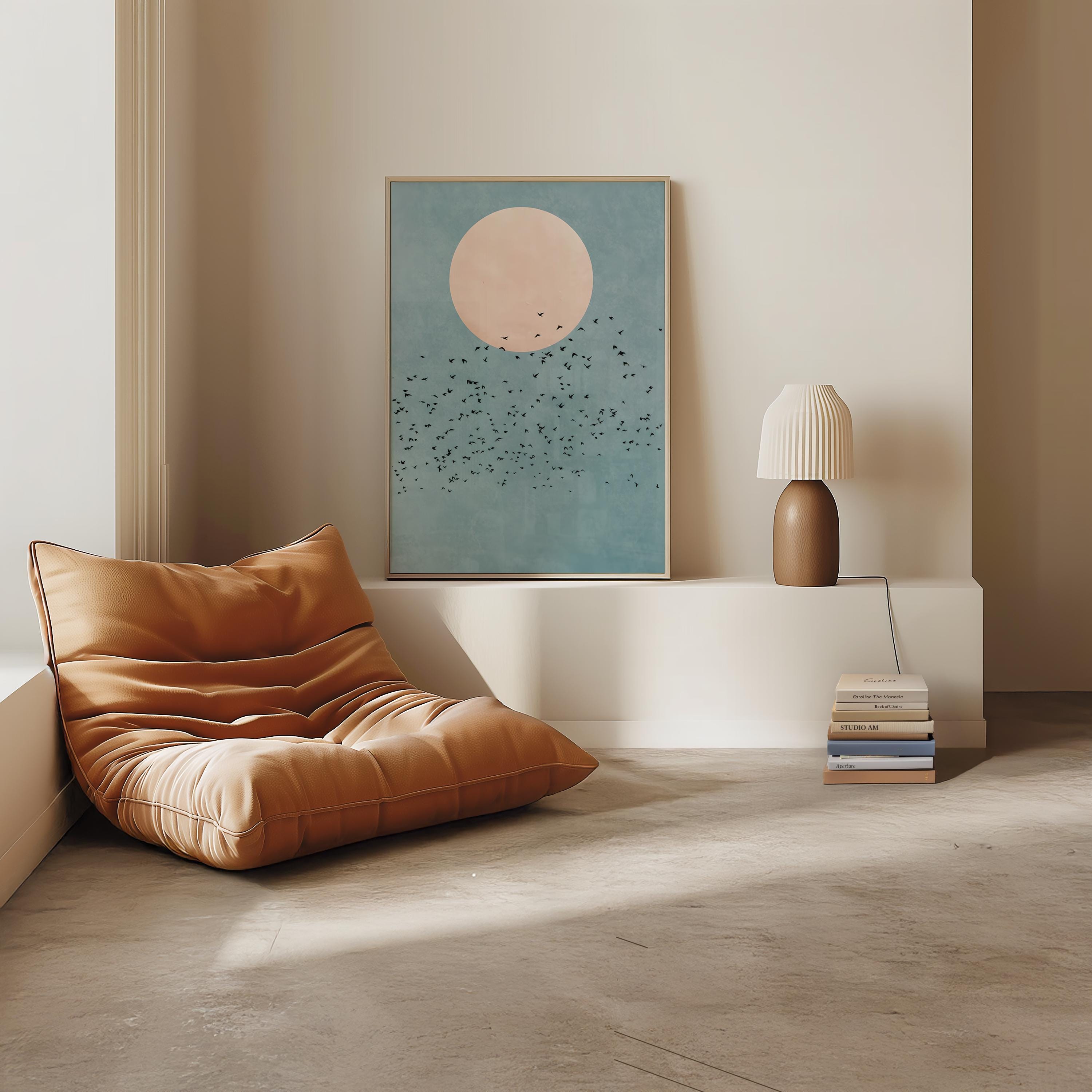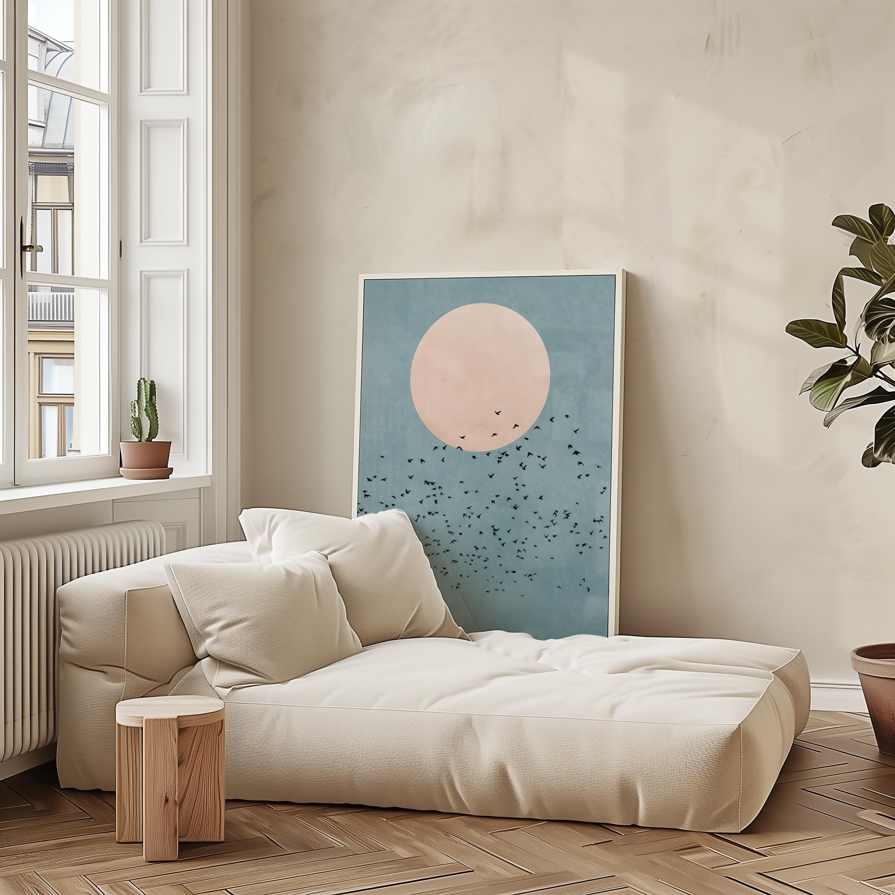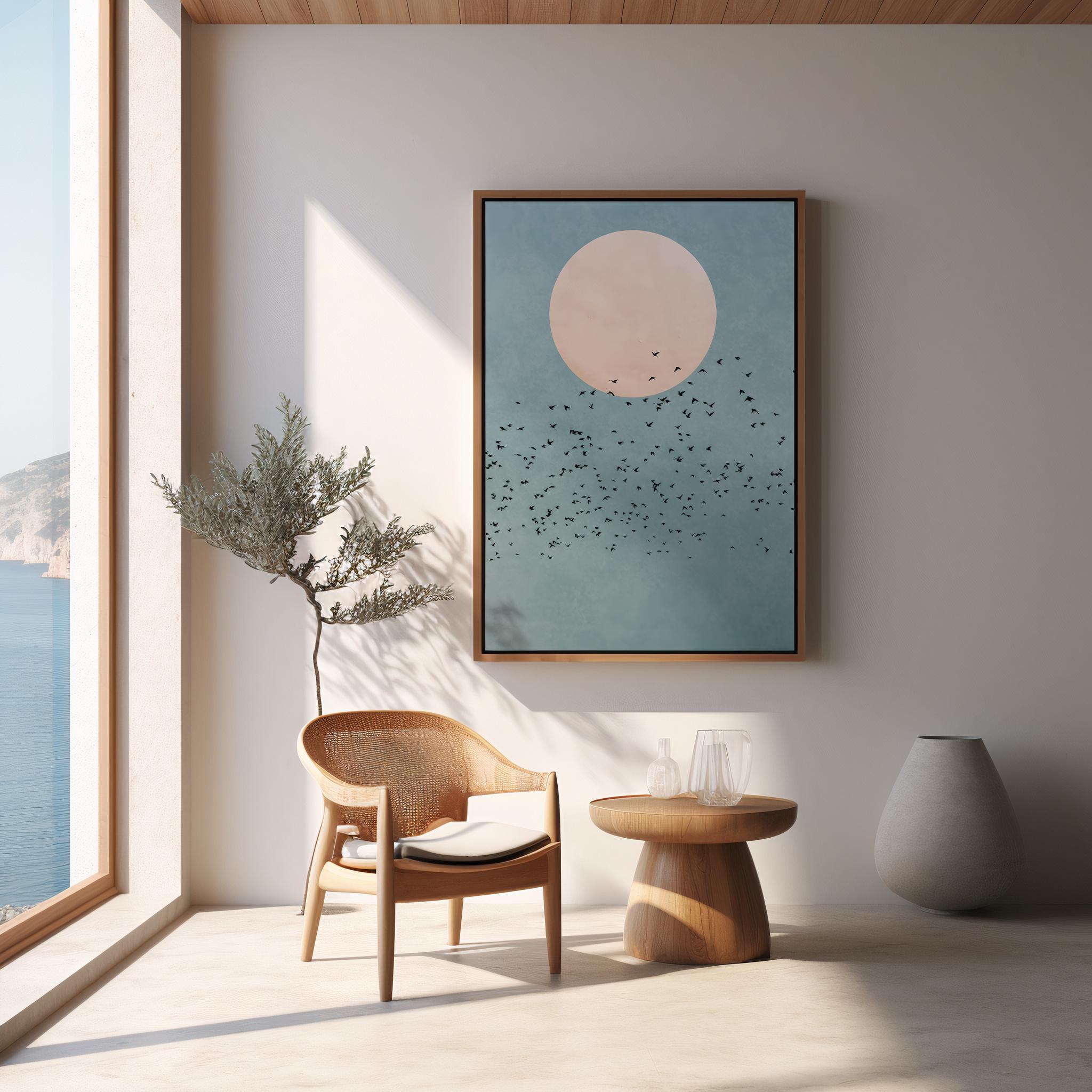 Digital Download | Bring a sense of serene beauty and natural elegance into your home with this minimalist bird silhouette print. Featuring a graceful flock of birds against a large, tranquil sun and a beautifully textured, muted blue background, this piece is the perfect addition to any modern, Japandi, Scandinavian, or boho-inspired space.