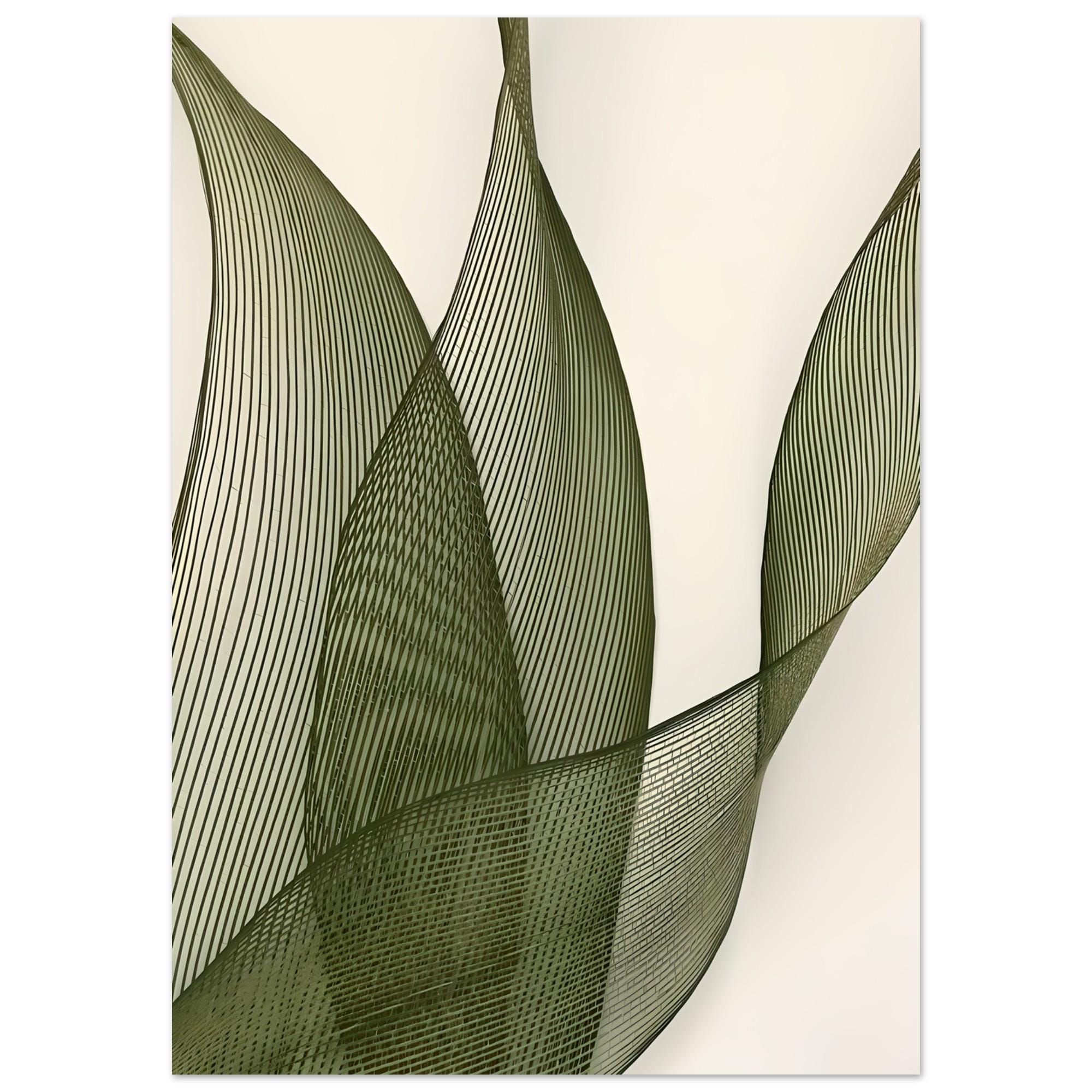 This captivating fine art print features elegant, flowing forms in a sophisticated palette of deep olive and sage green. The interplay of light, shadow, and fine geometric lines creates a mesmerizing, sculptural effect, evoking a feeling of serene movement.