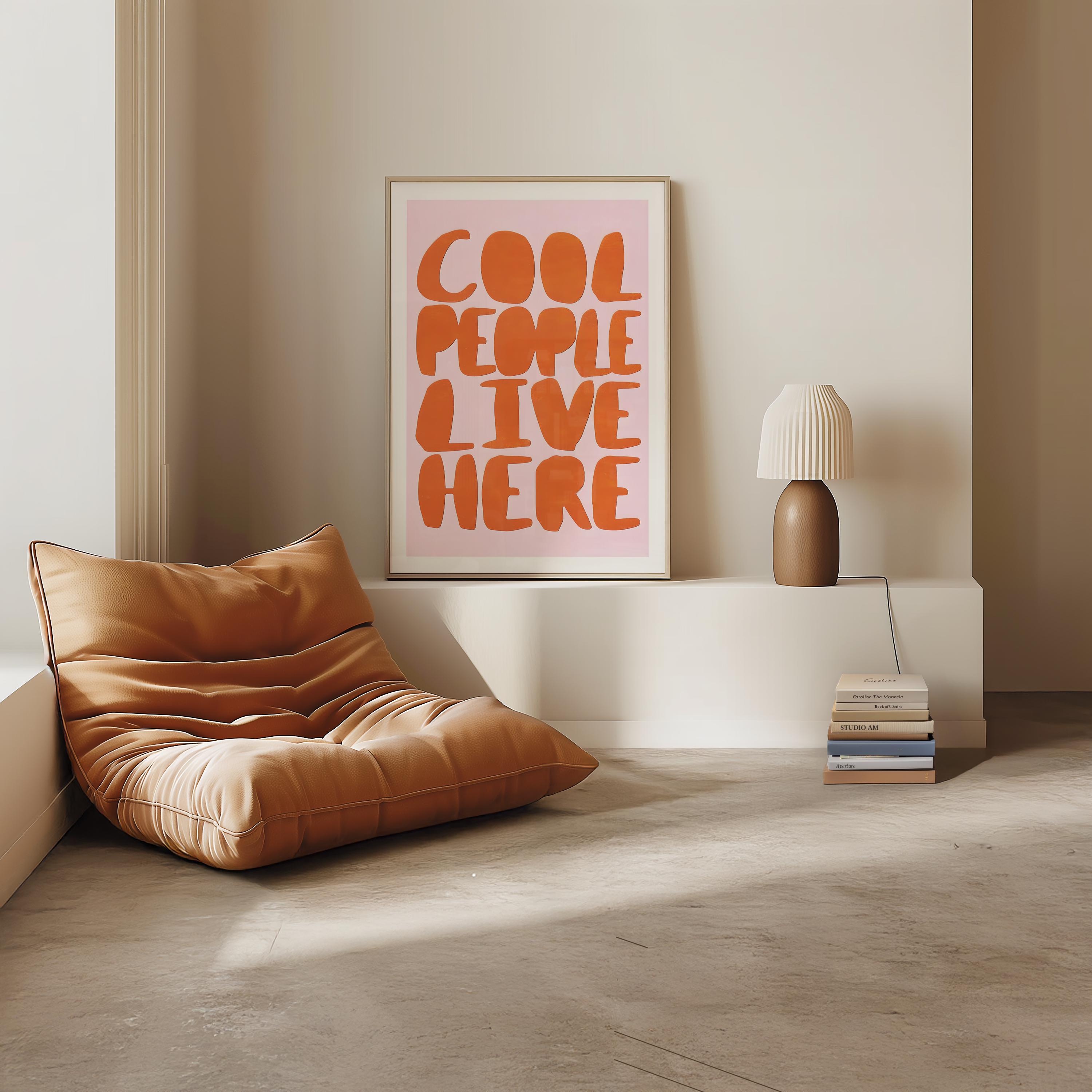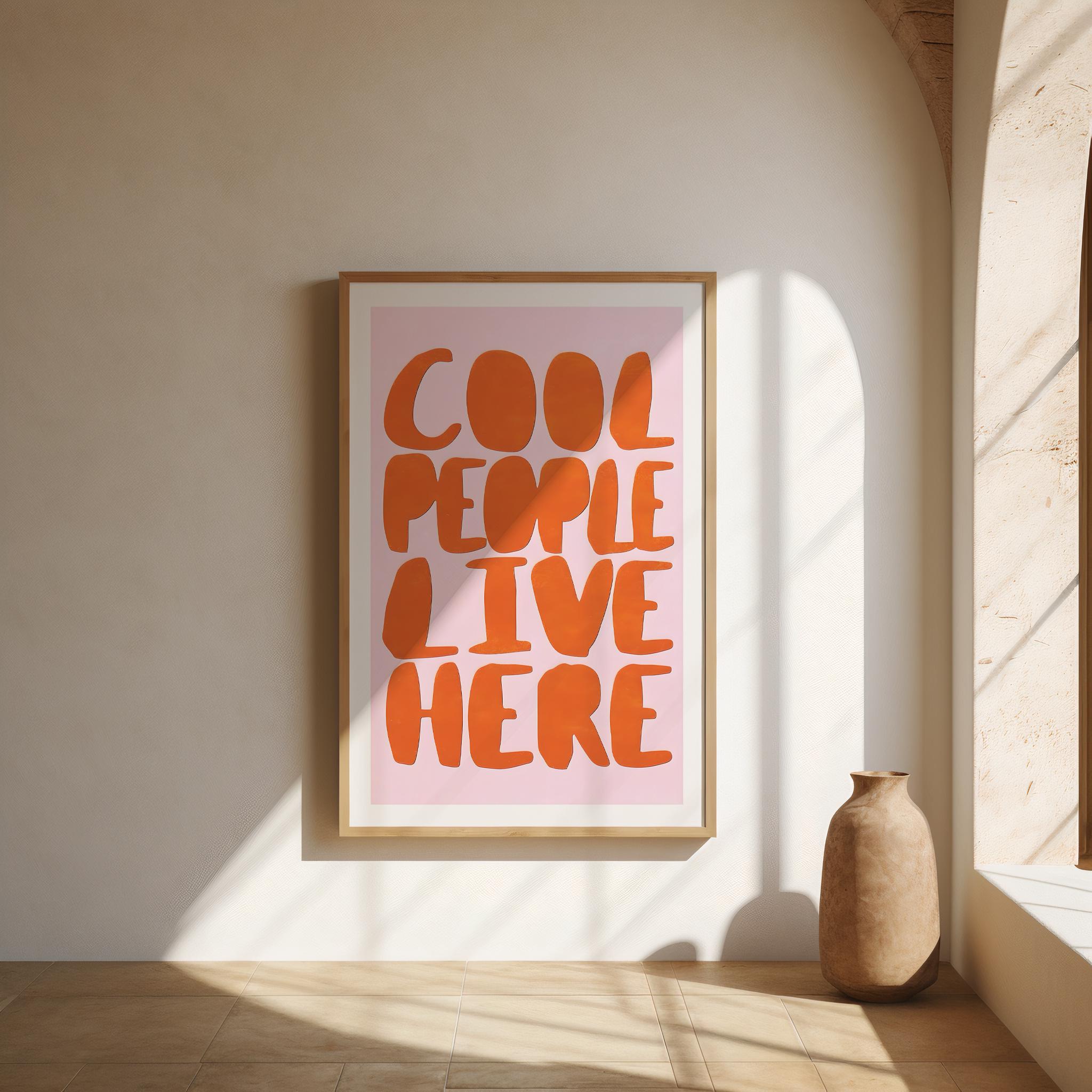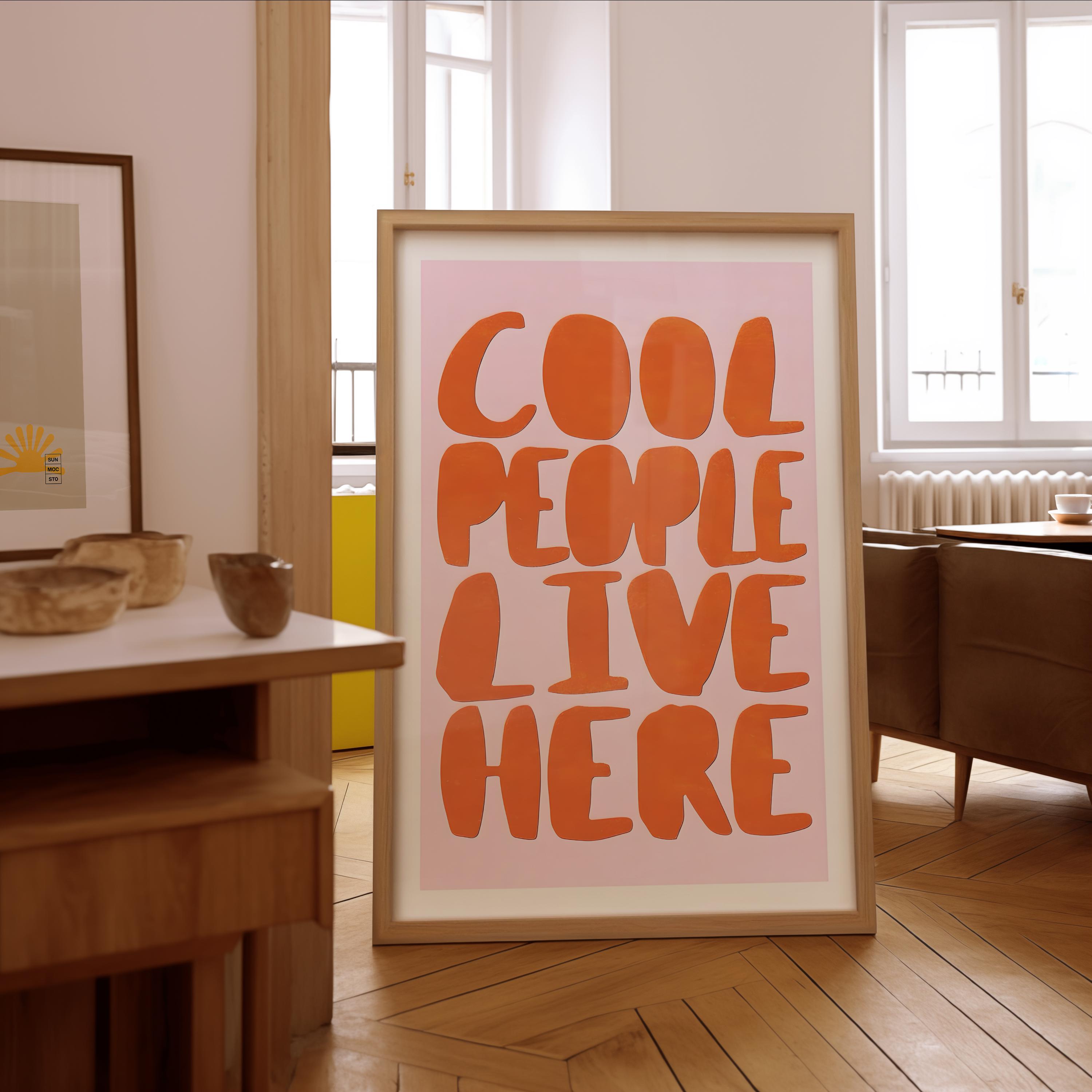 Make a fun and funky statement with our "Cool People Live Here" art print! Featuring groovy, retro-inspired typography in a bold orange and pink colorway, this piece is the perfect dose of dopamine decor for your space. Instantly download and print to add a playful vibe to your entryway, living room, or gallery wall.