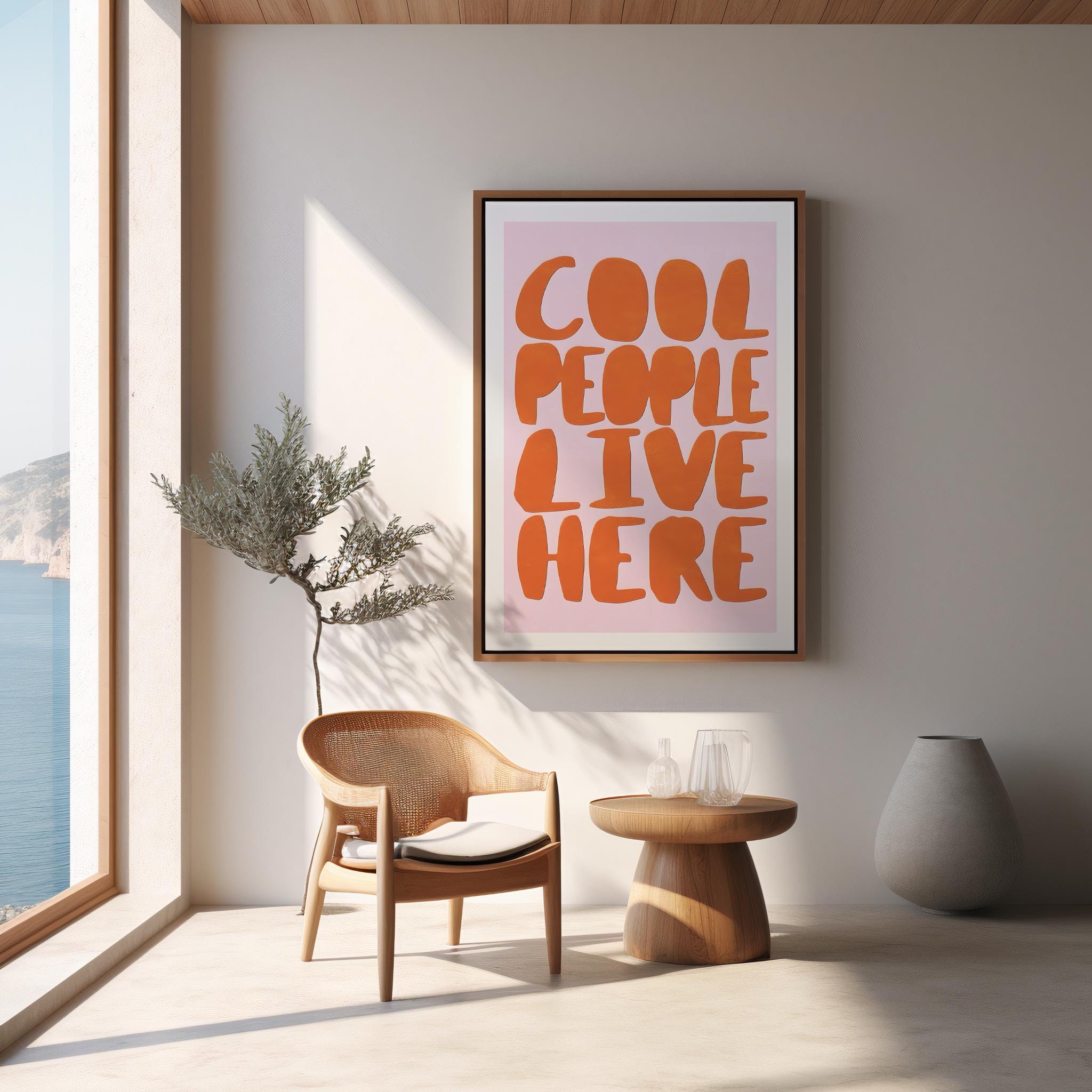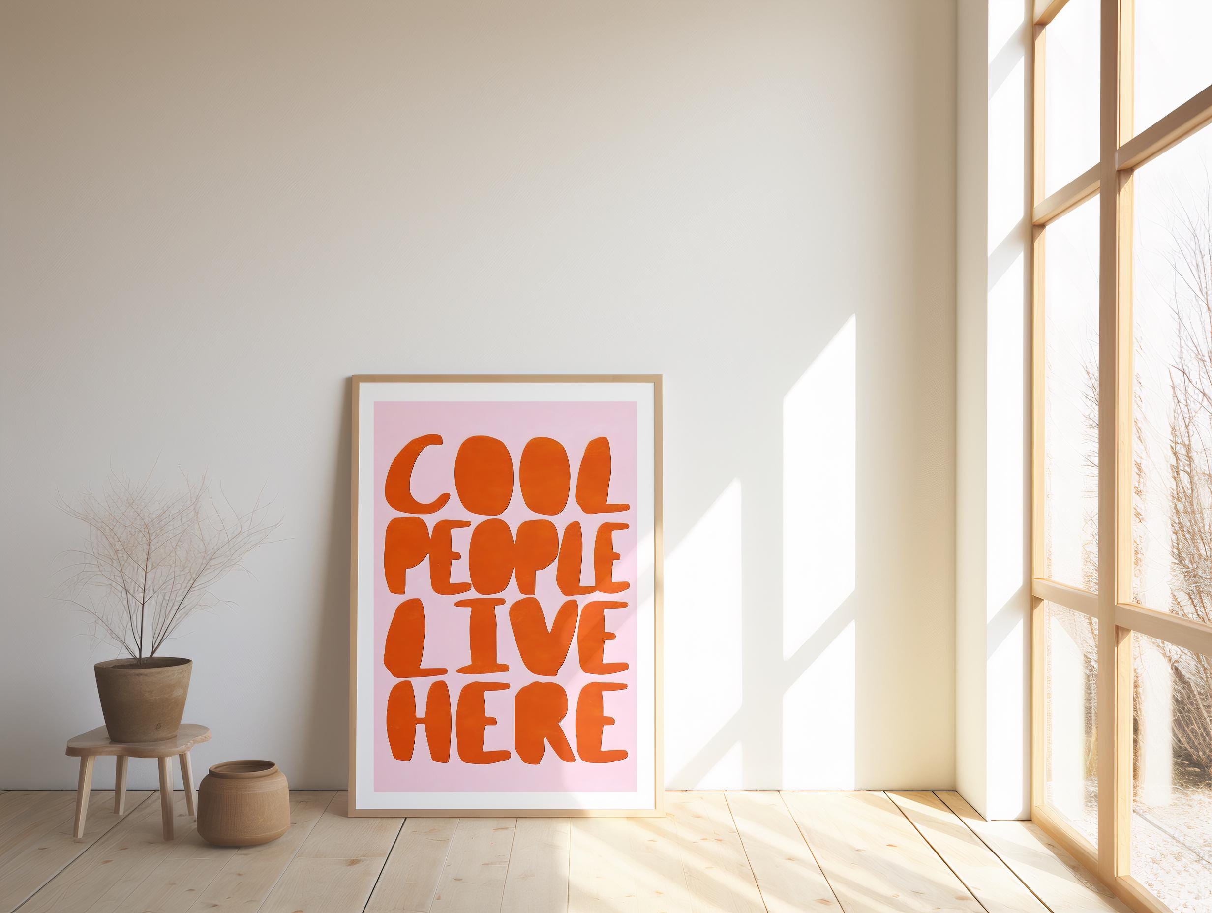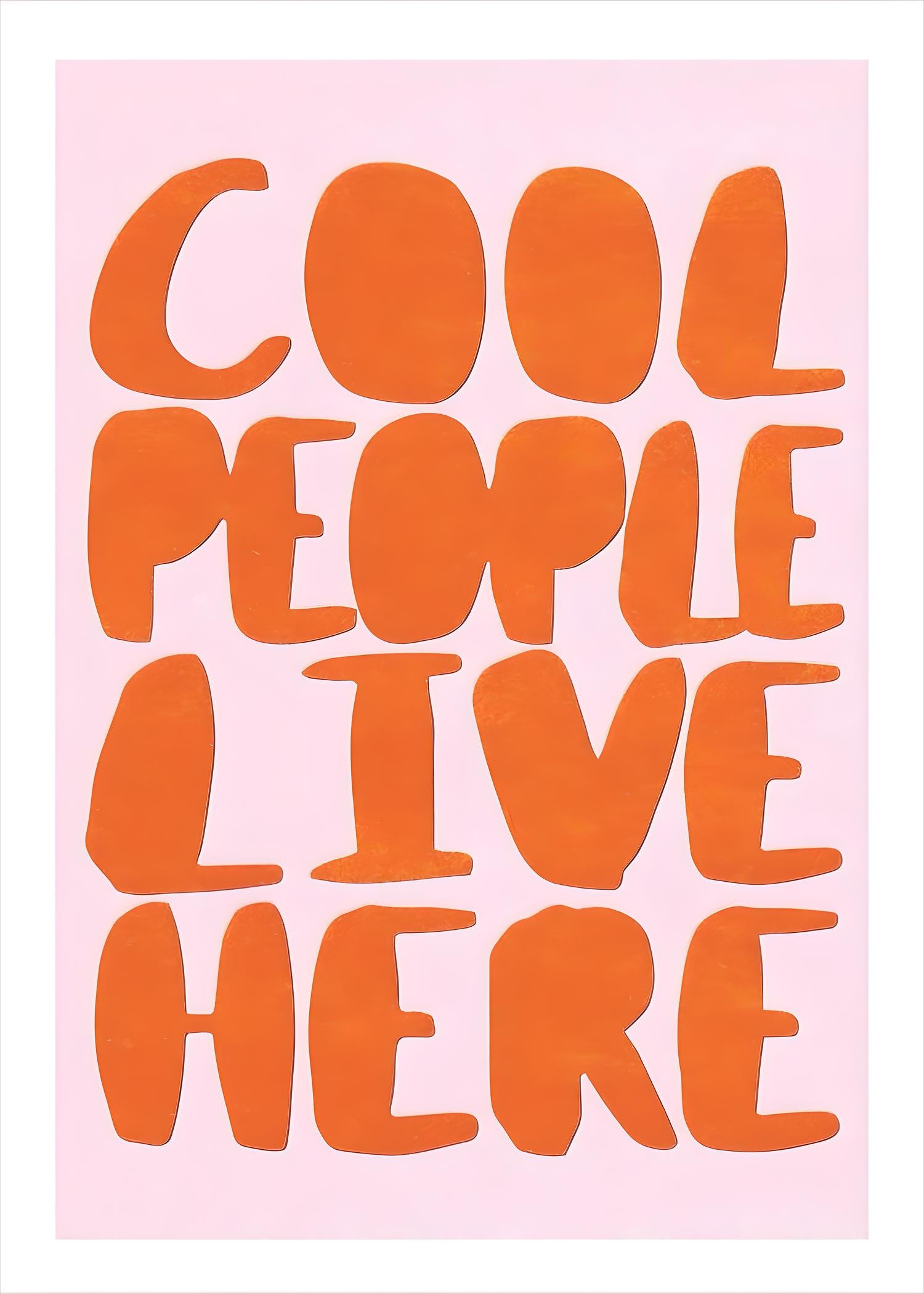 Make a fun and funky statement with our "Cool People Live Here" art print! Featuring groovy, retro-inspired typography in a bold orange and pink colorway, this piece is the perfect dose of dopamine decor for your space. Instantly download and print to add a playful vibe to your entryway, living room, or gallery wall.