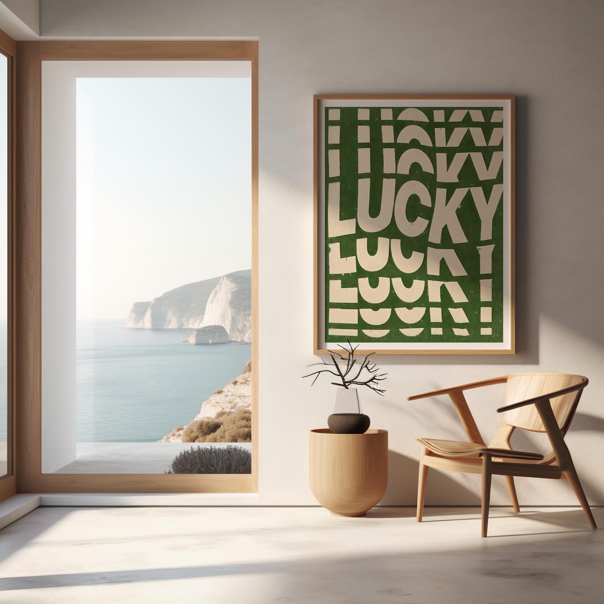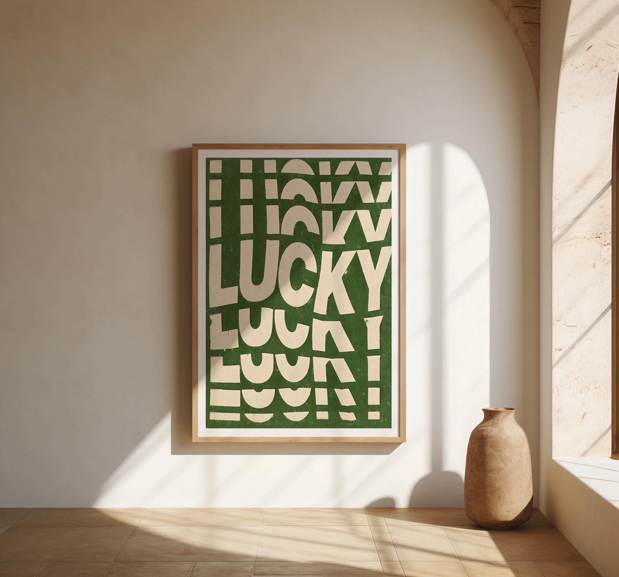 Add a dose of good fortune and modern style to your walls with this "Lucky" typographic art print. Featuring bold, deconstructed lettering in a rich green and cream palette, this piece creates a dynamic abstract pattern that's both eye-catching and uplifting.