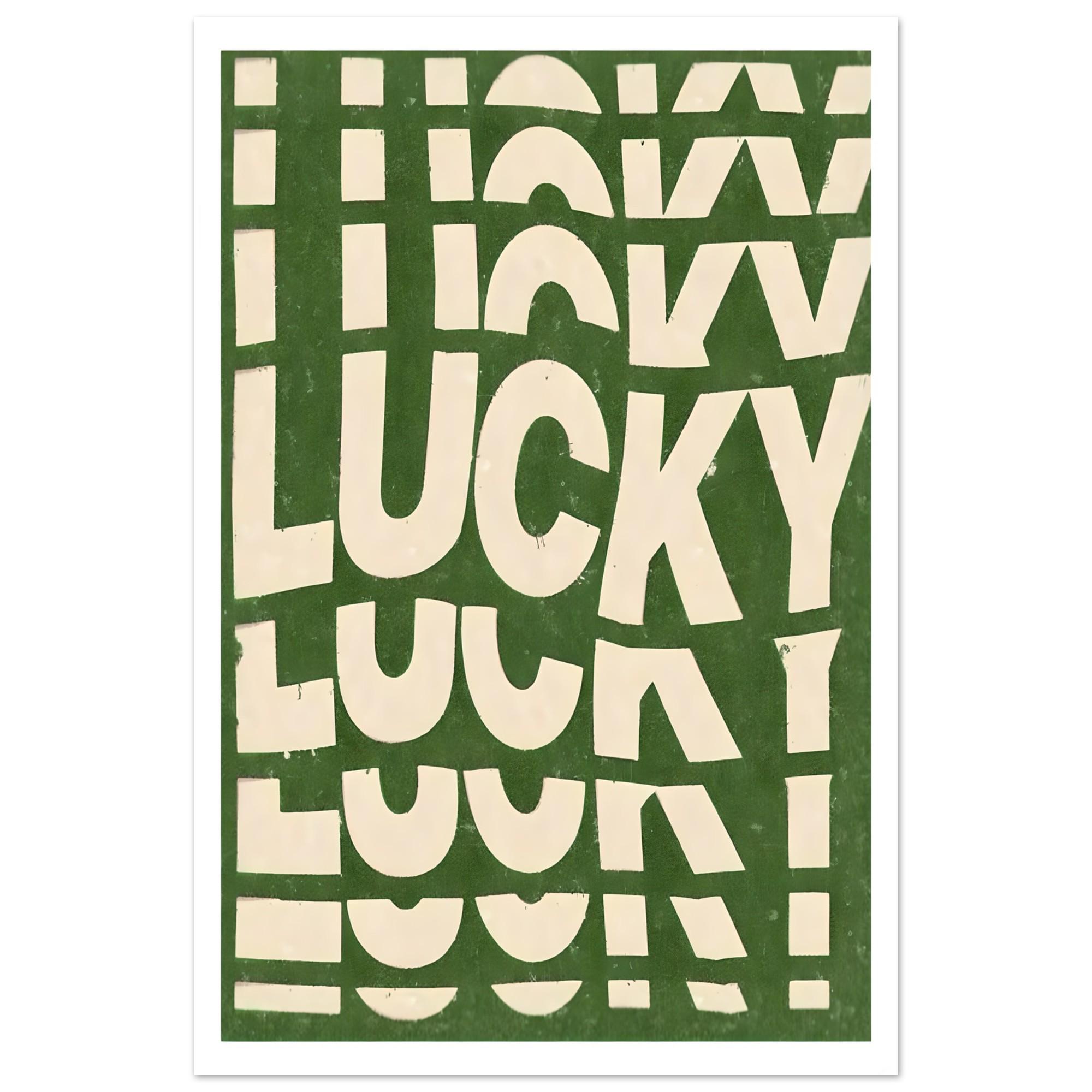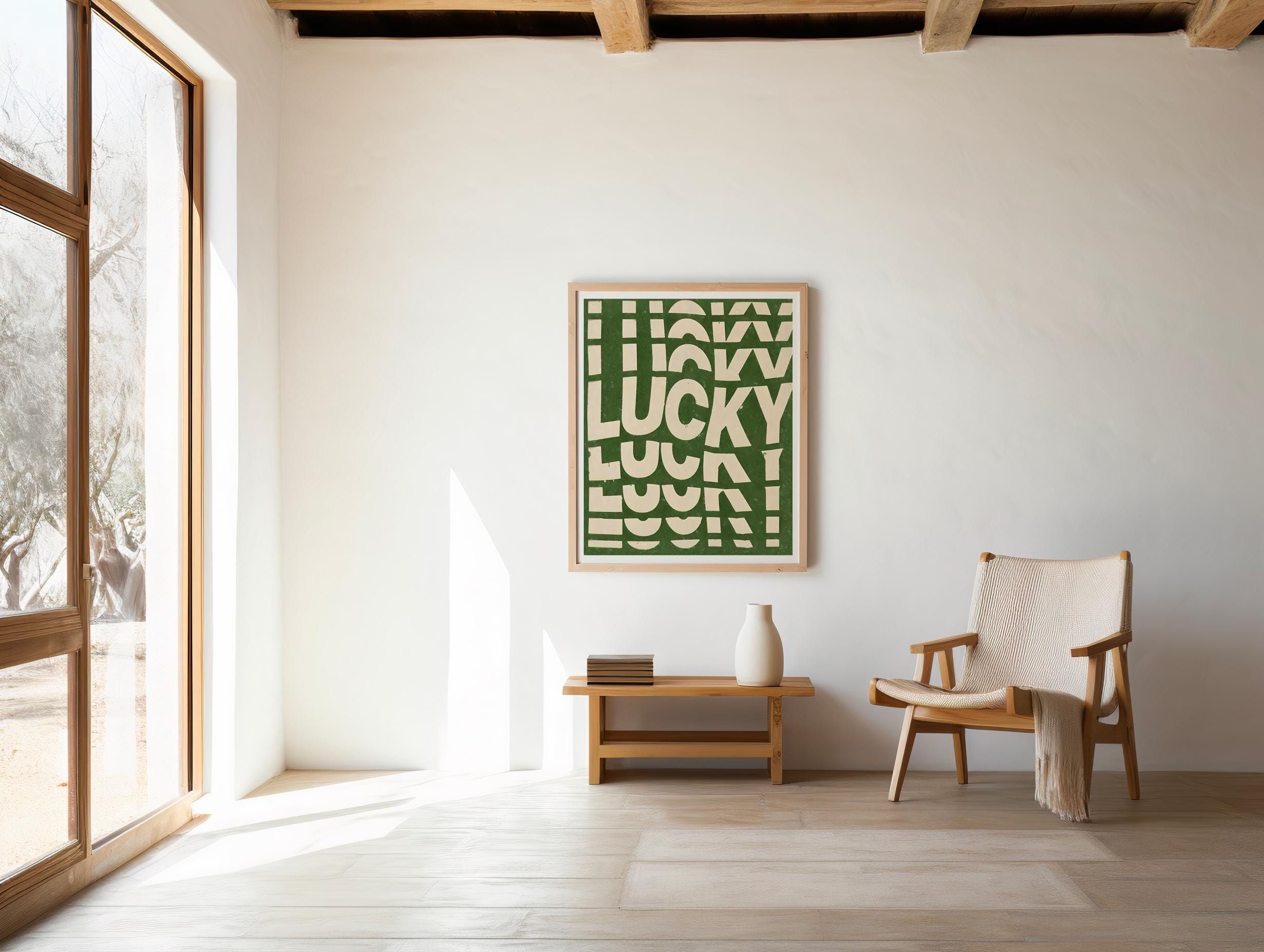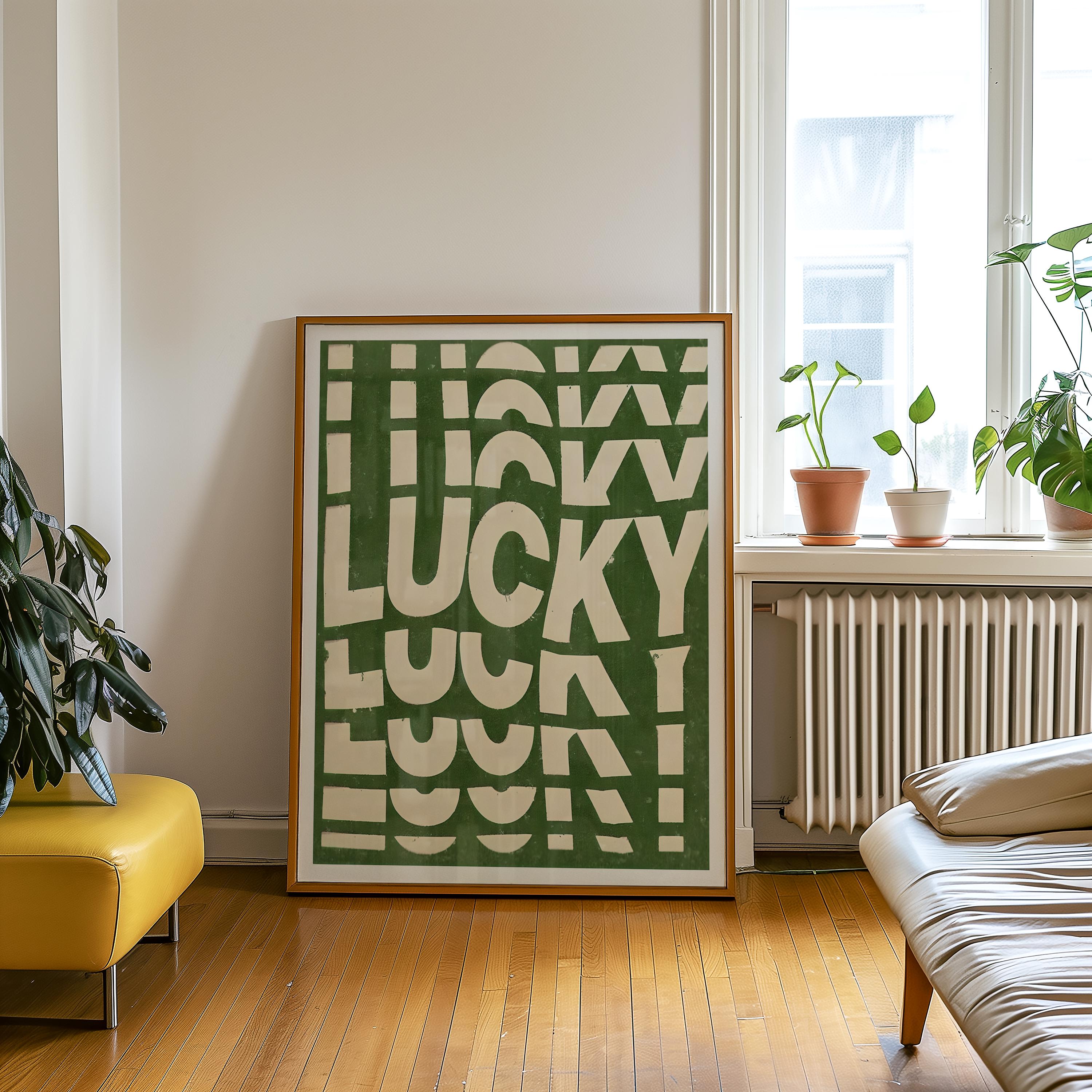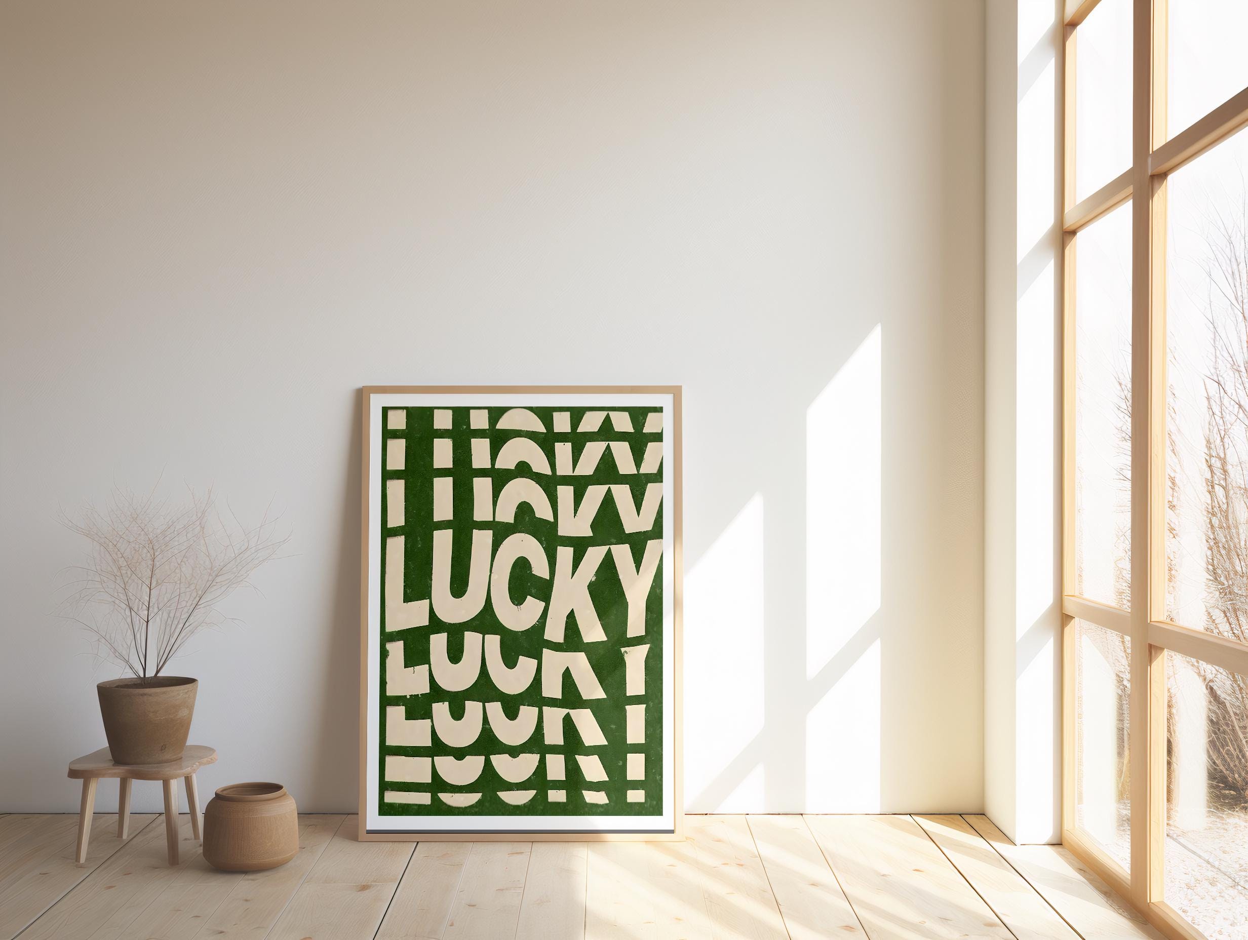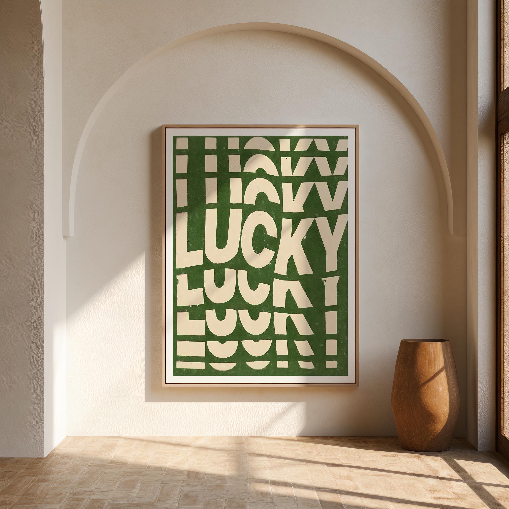 Add a dose of good fortune and modern style to your walls with this "Lucky" typographic art print. Featuring bold, deconstructed lettering in a rich green and cream palette, this piece creates a dynamic abstract pattern that's both eye-catching and uplifting.
