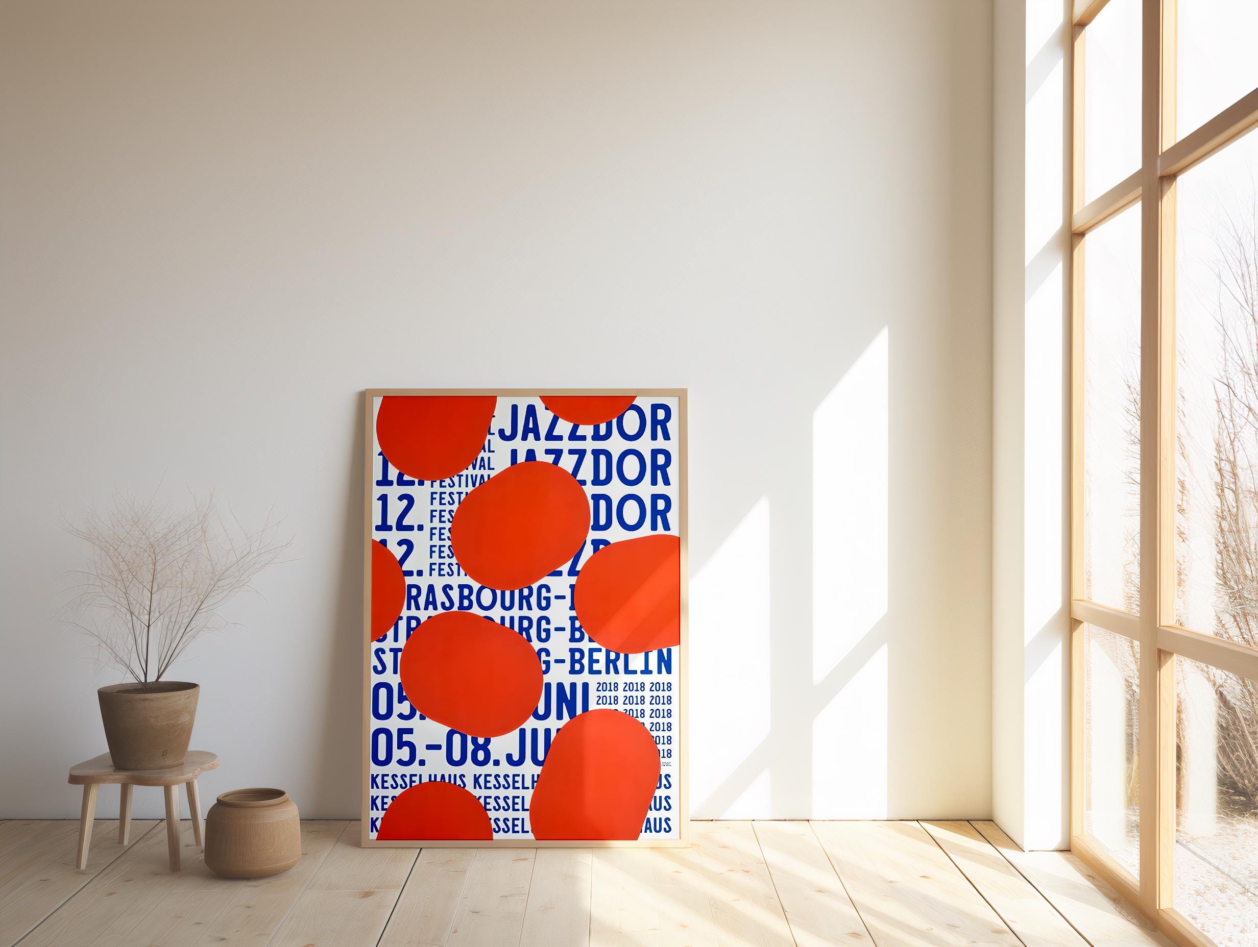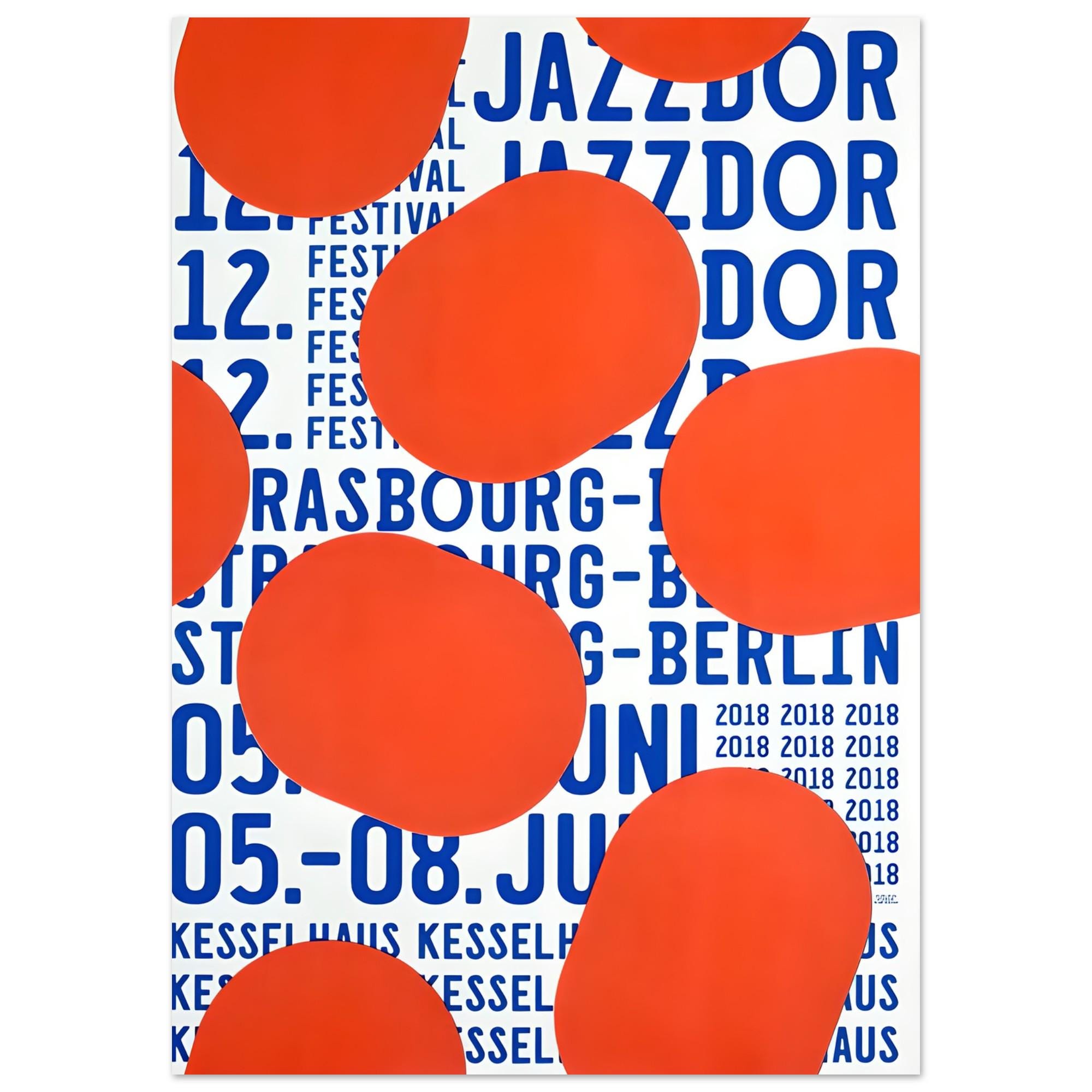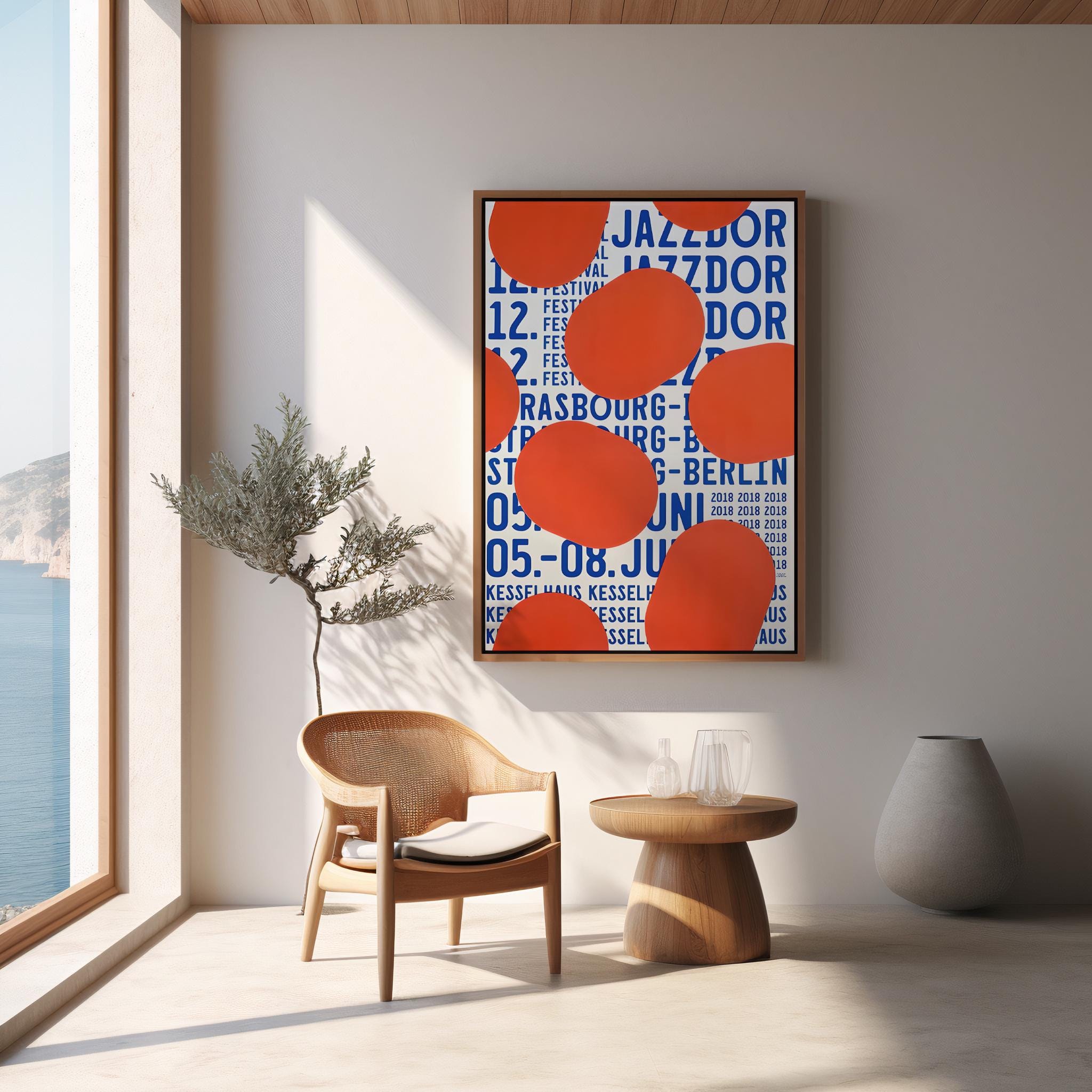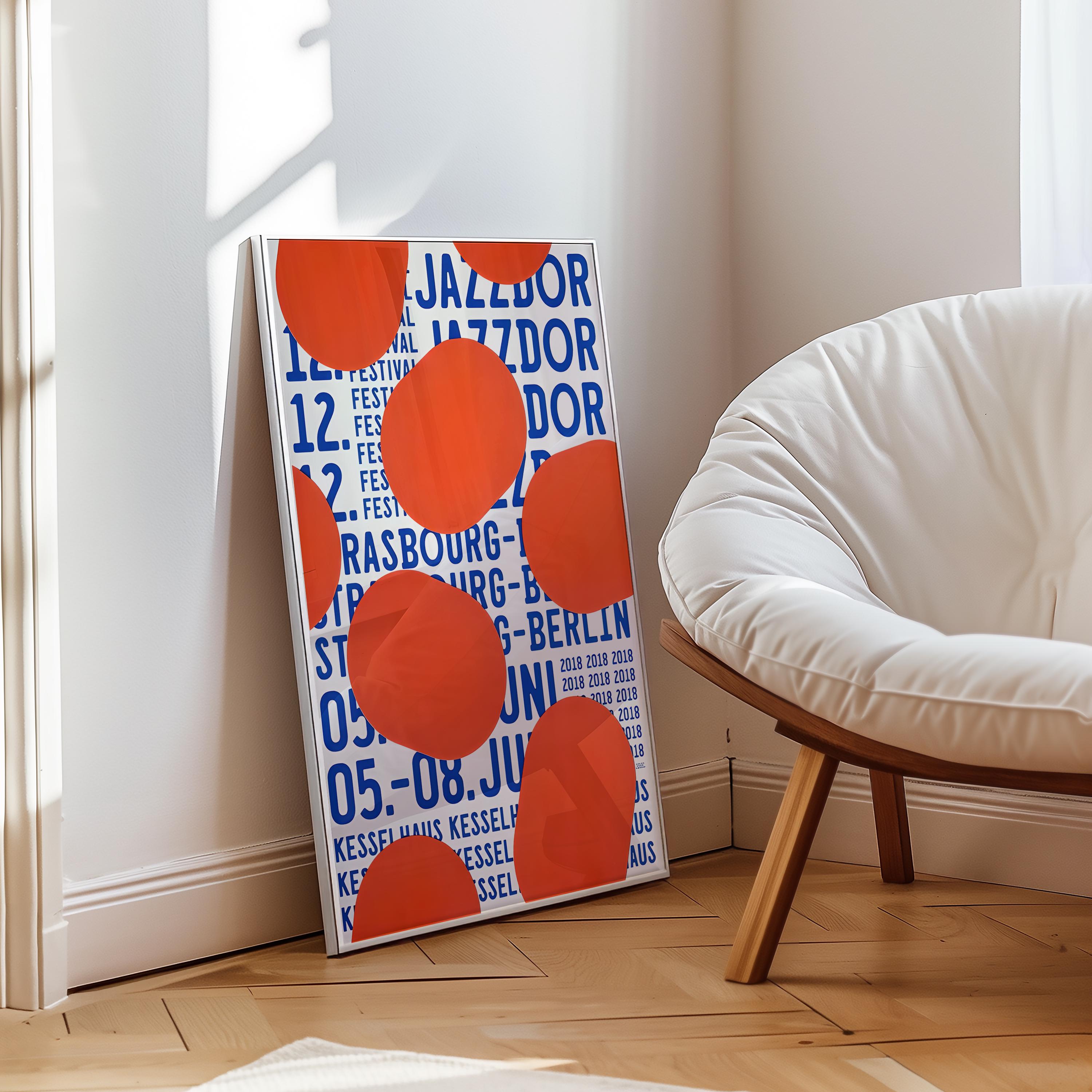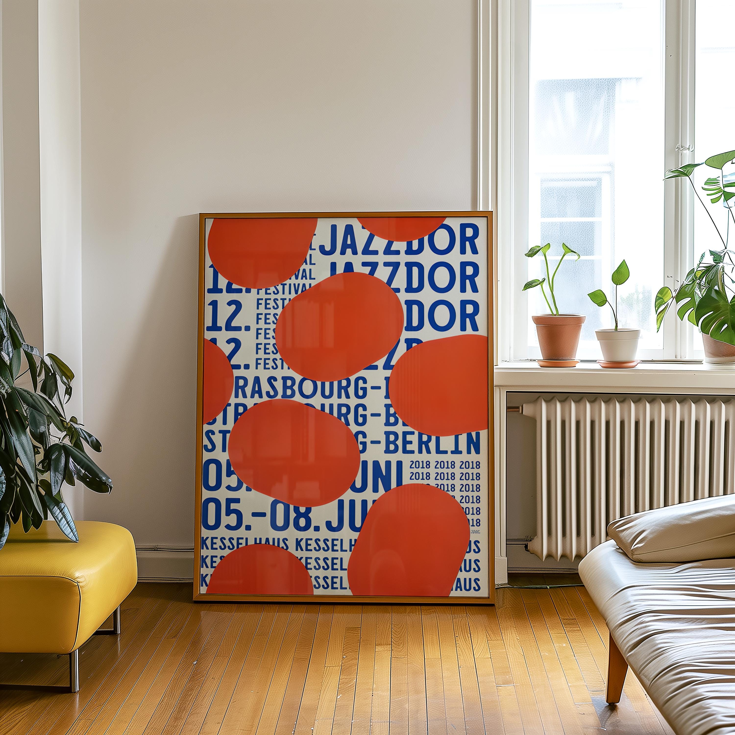 Infuse your space with the vibrant, rhythmic energy of a modern jazz festival with this museum-quality Giclée print. A perfect statement piece for any wall, this artwork is inspired by the timeless principles of Swiss Design. It features bold, abstract orange shapes layered over crisp blue typography, creating a dynamic and sophisticated composition that commands attention.