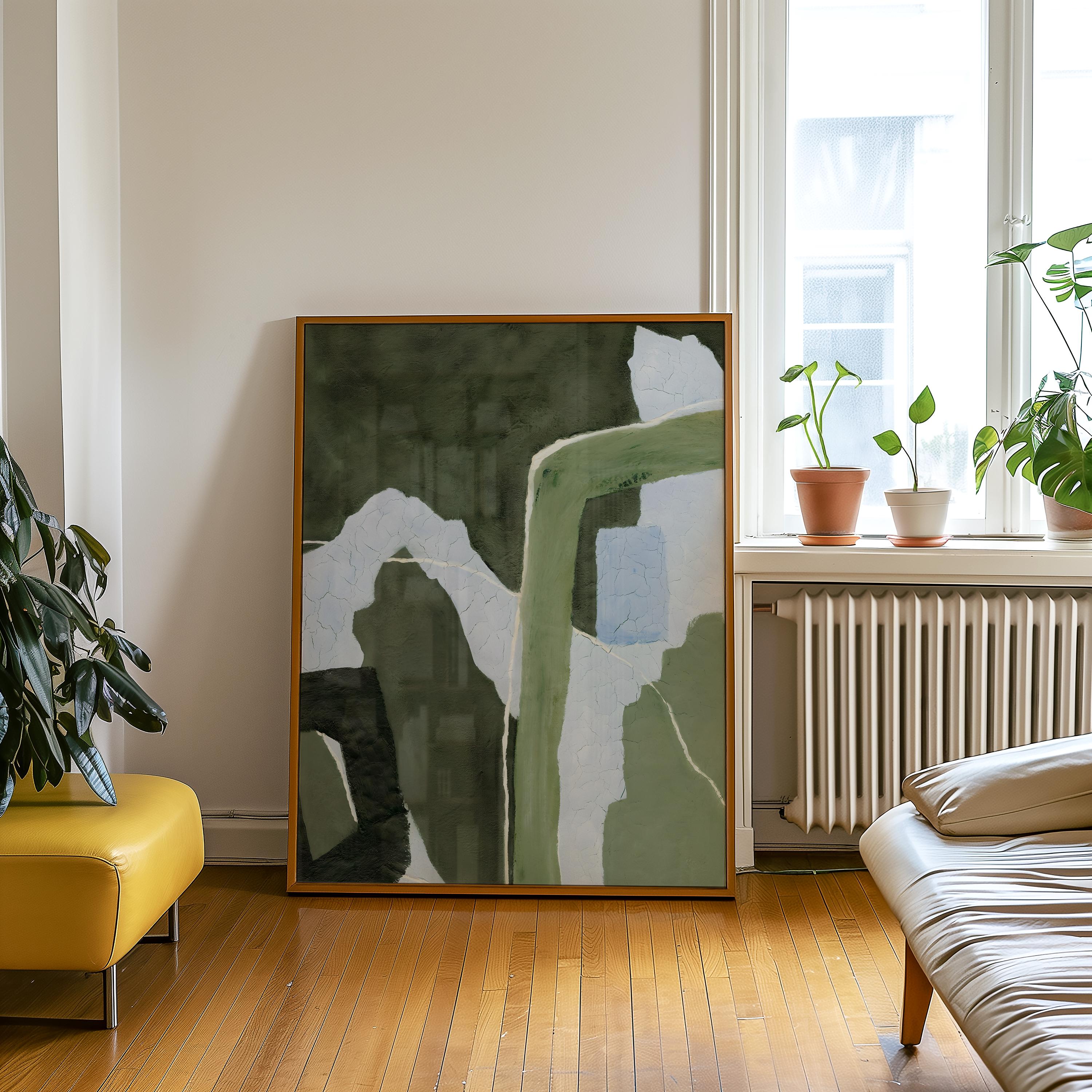 Digital Download | Transform your space with this stunning abstract art print, featuring a sophisticated palette of deep olive, sage green, and earthy charcoal tones. The textured, crackled details in the lighter sections add a layer of depth and character, evoking a sense of calm and organic beauty.