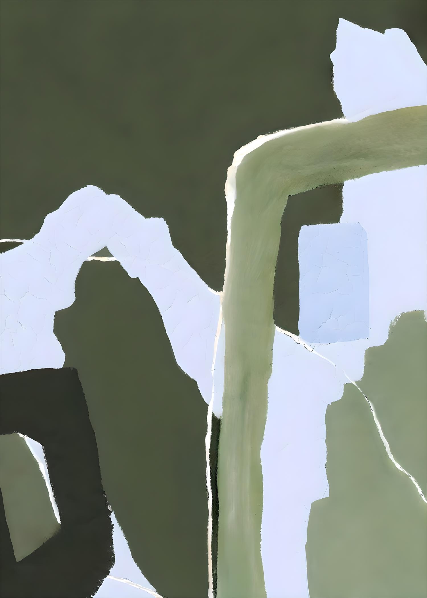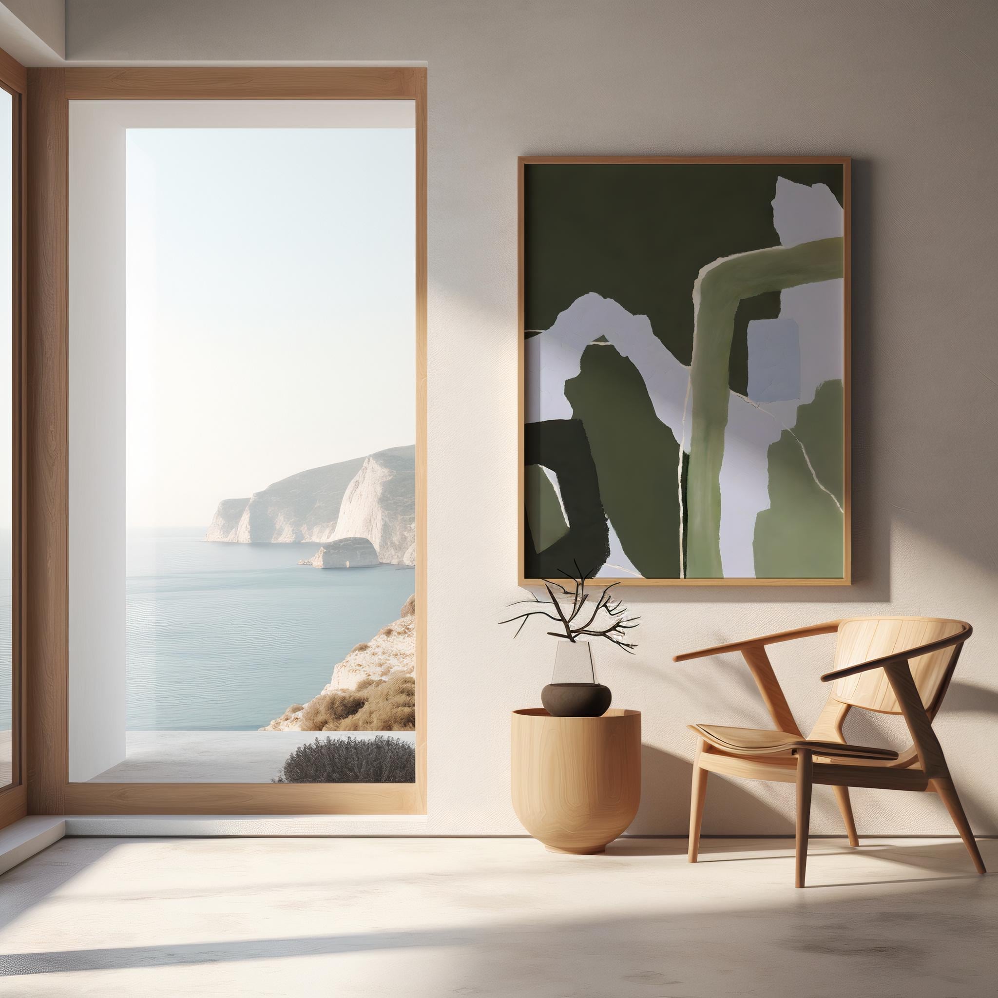 This striking color-block abstract brings a fresh, grounded vitality to any space. The palette of deep olive, sage, and cool periwinkle makes it a natural fit for organic modern, botanical, Japandi, and nature-inspired interiors. A powerful statement piece on its own or a bold anchor for a gallery wall.