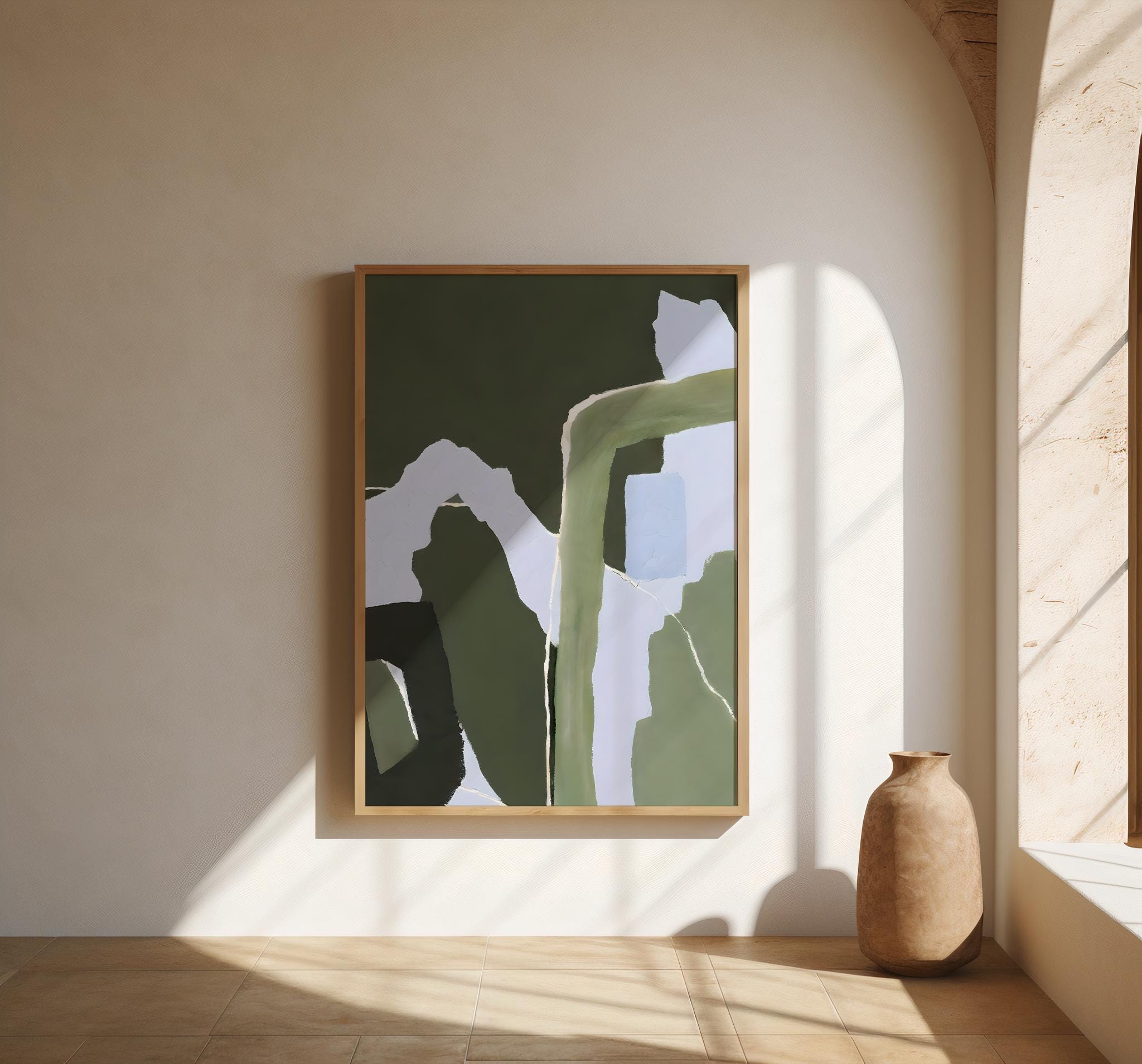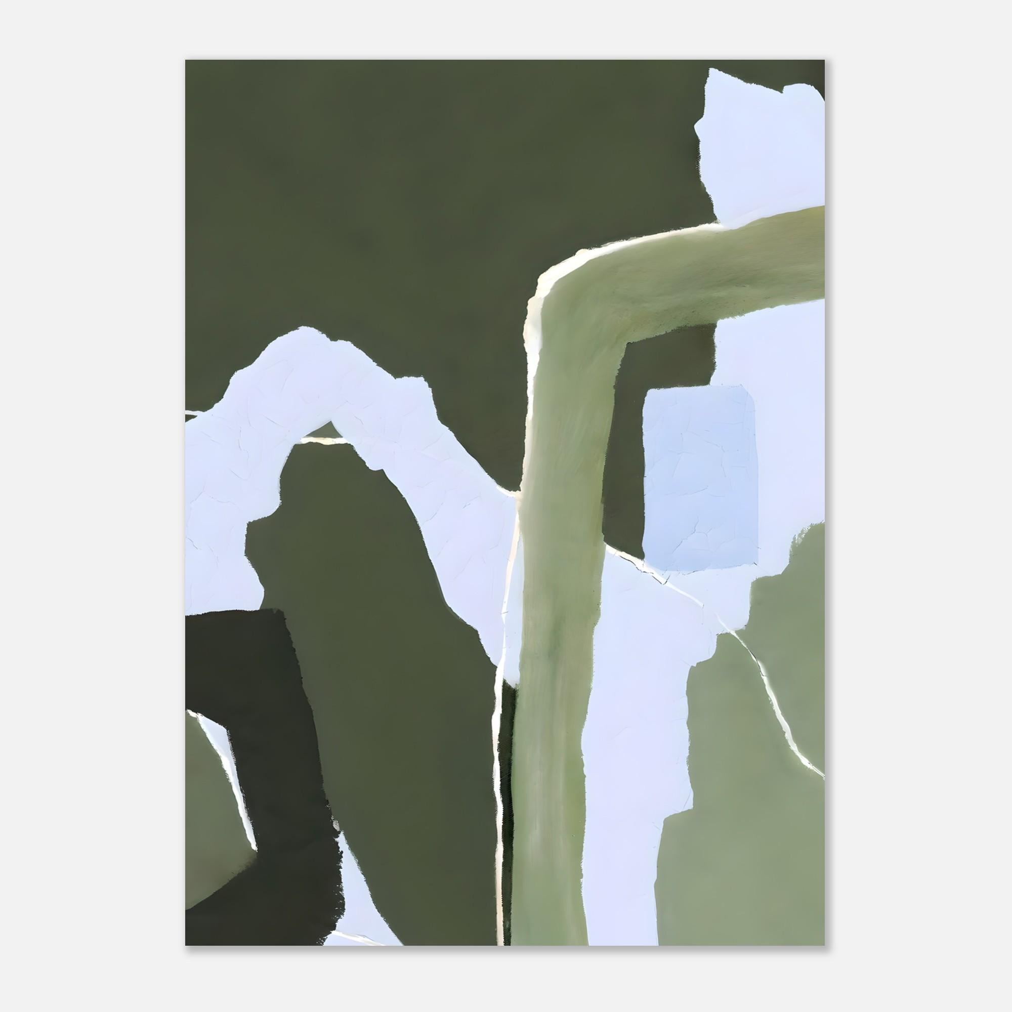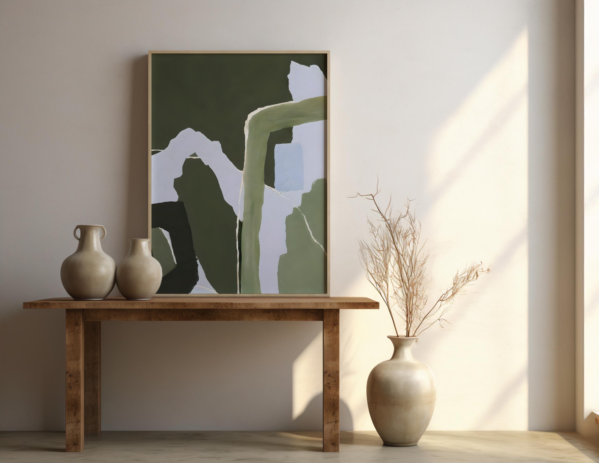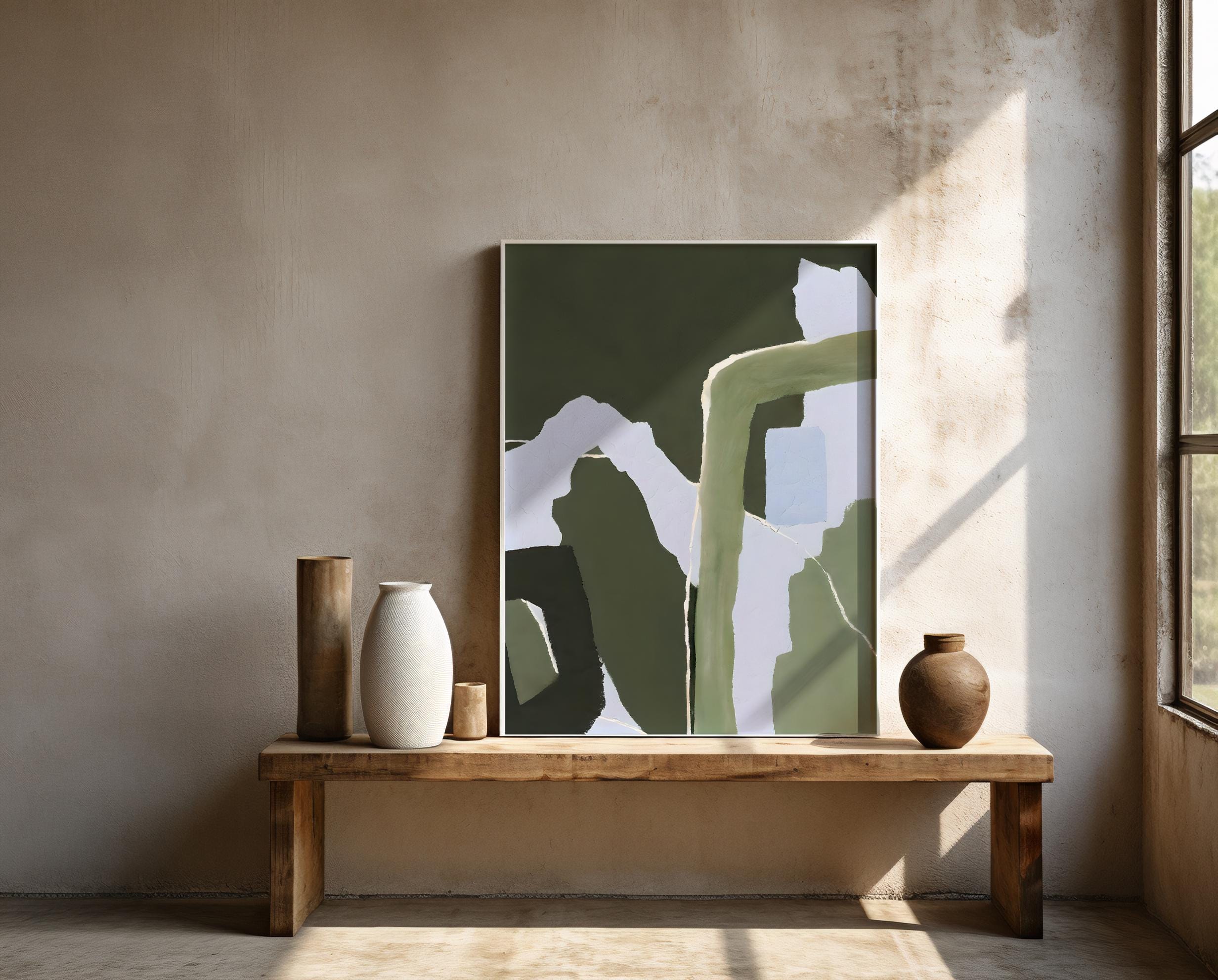 A modern abstract composition featuring layered olive and deep green tones balanced with soft off-white negative space. Organic, flowing forms and subtle textural variation create a calm, grounded visual rhythm inspired by nature and earthy interiors. Refined, contemporary, and designed to bring depth without overwhelming the space.