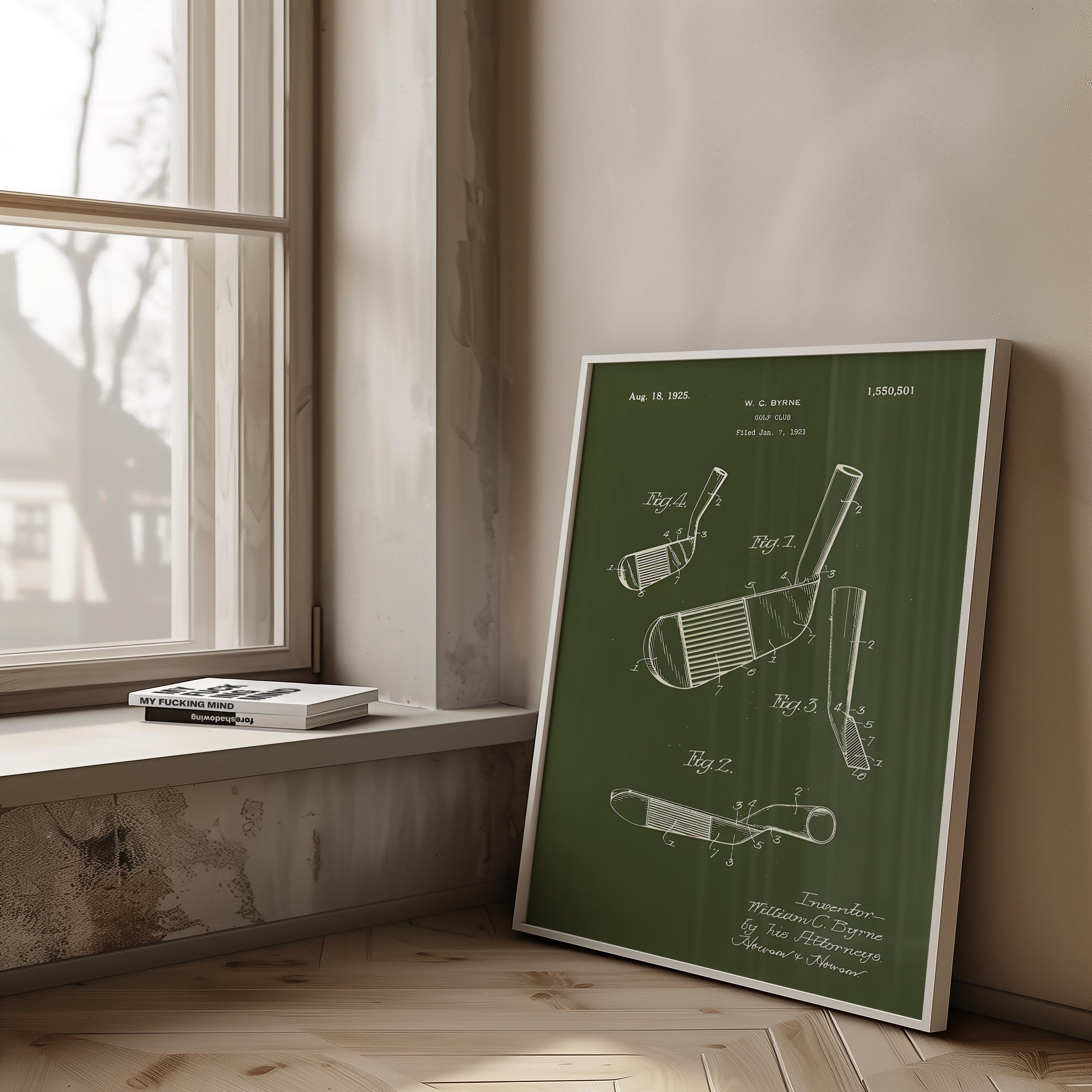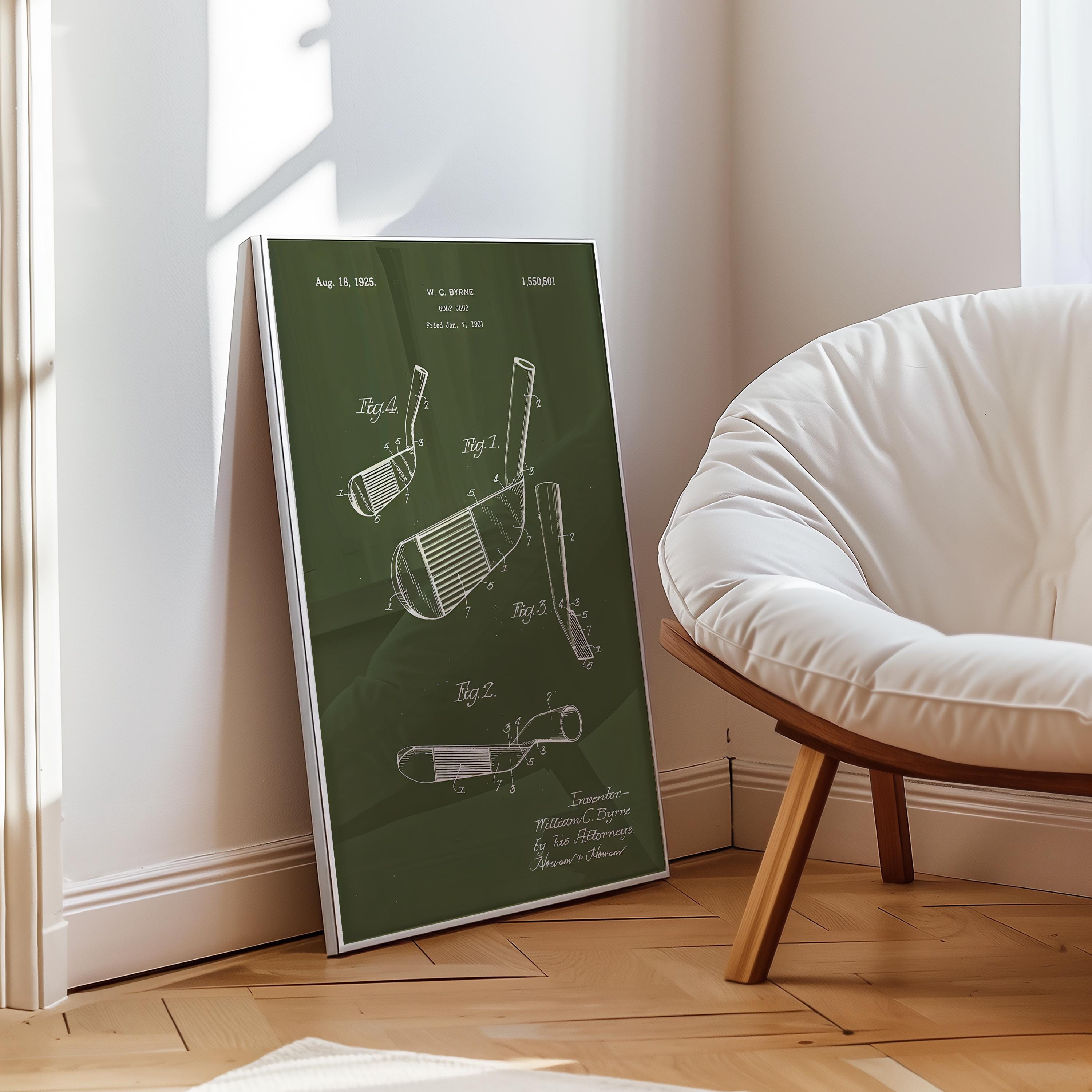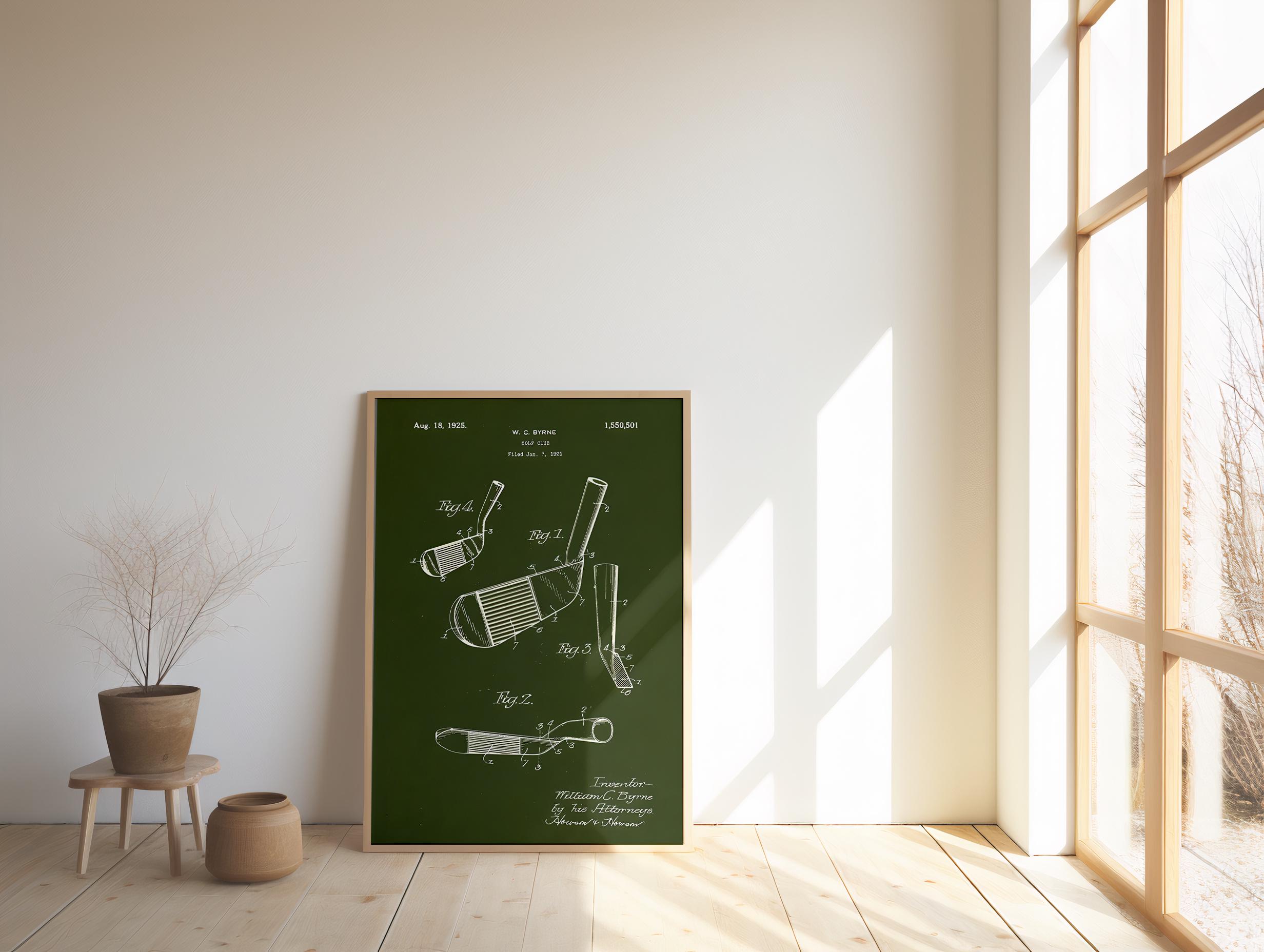 Step onto the green with a piece of history! This striking digital art print showcases the original patent design for a golf club, filed by W.C. Byrne on August 18, 1925. Rendered in a classic blueprint style against a rich, deep olive green background, this artwork exudes timeless elegance and a passion for the sport.