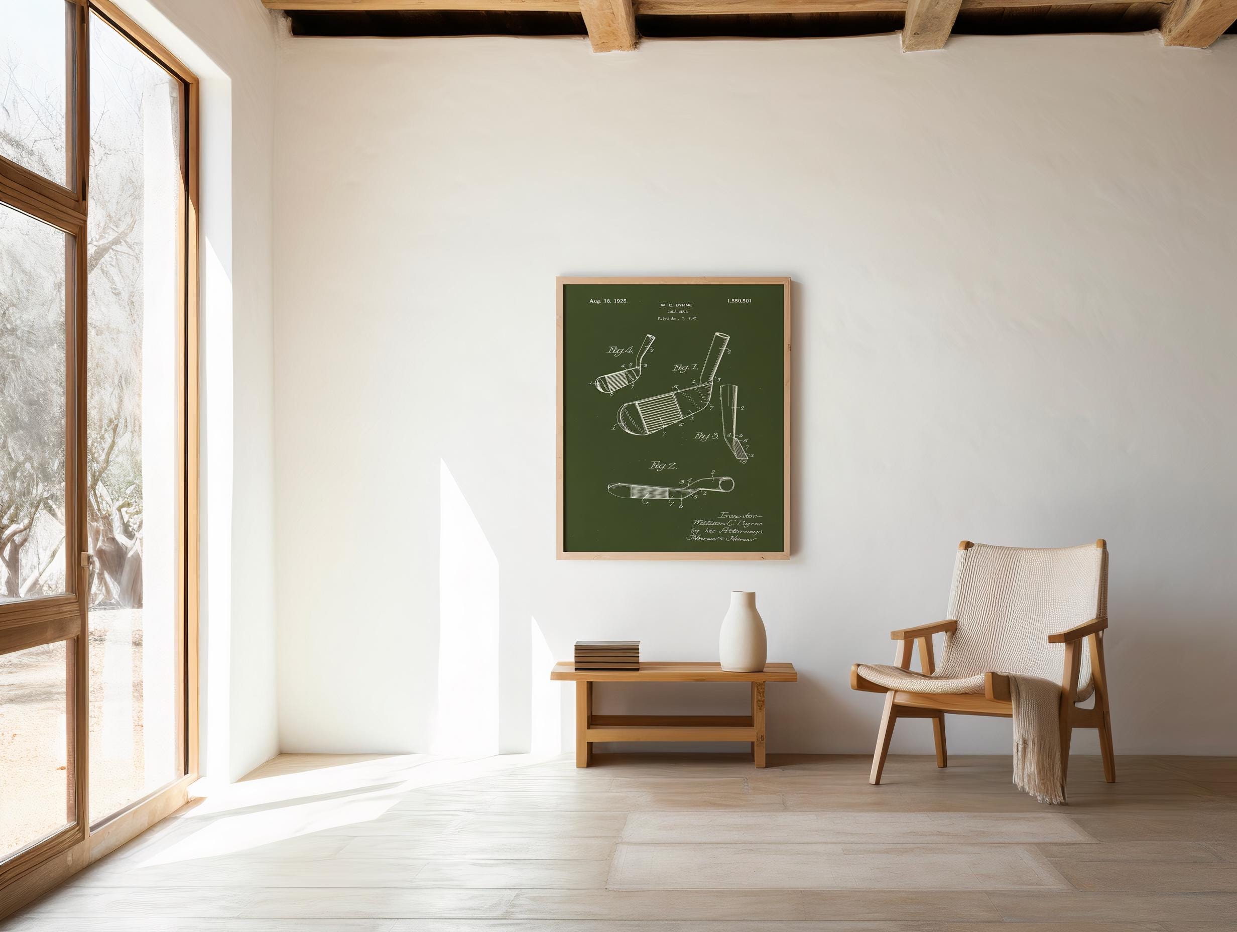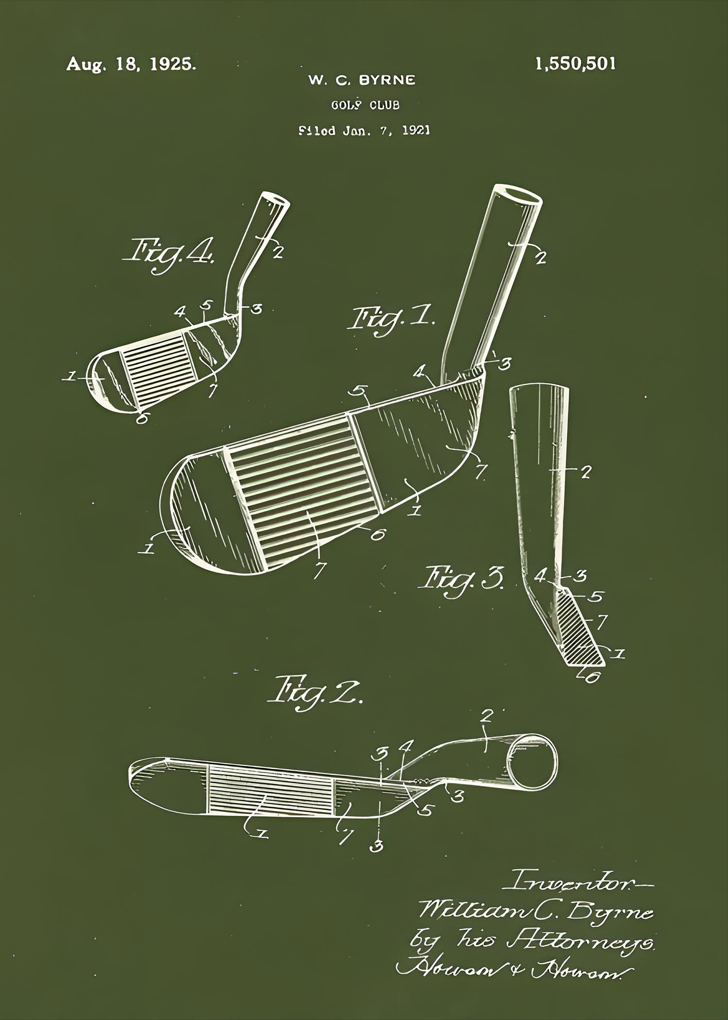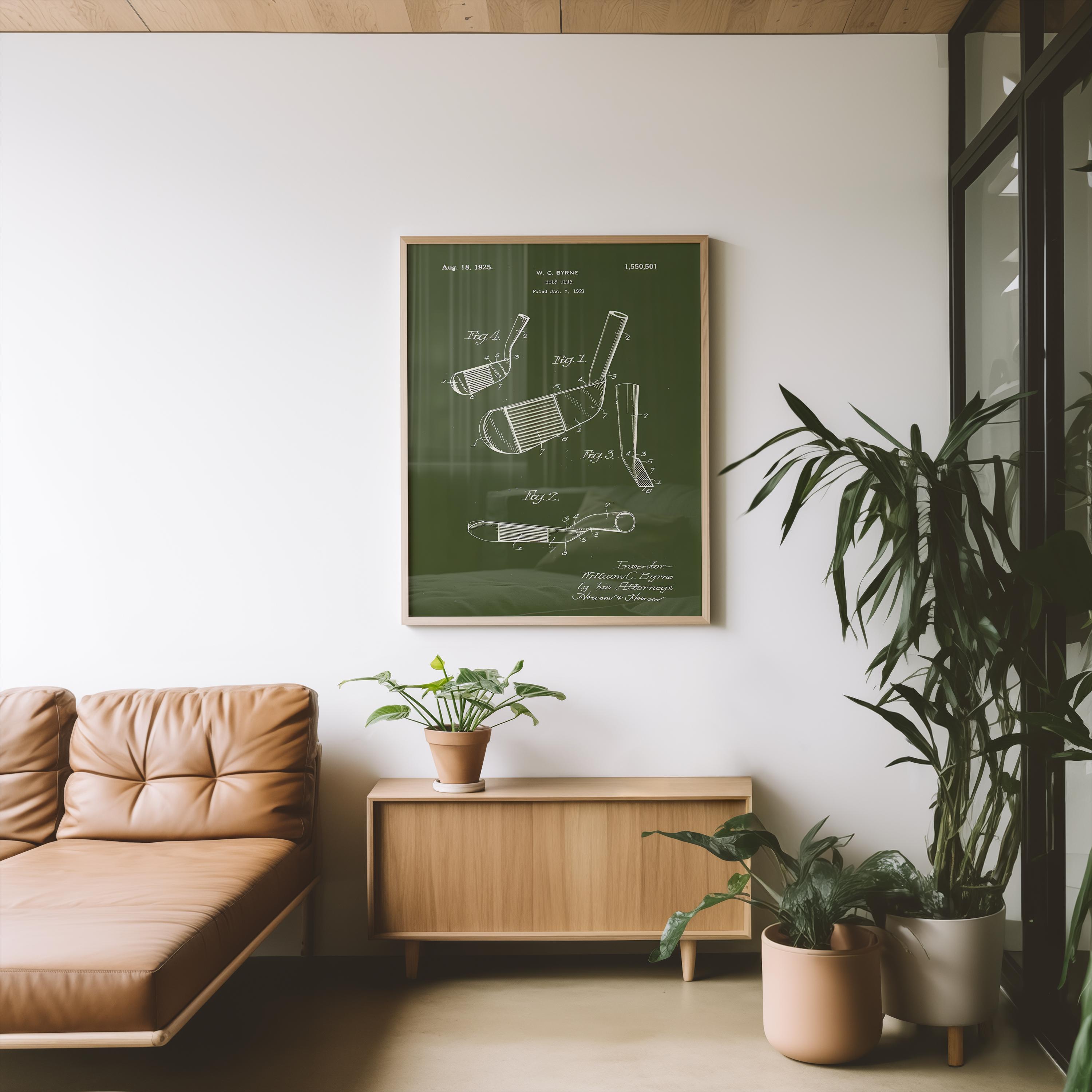 Step onto the green with a piece of history! This striking digital art print showcases the original patent design for a golf club, filed by W.C. Byrne on August 18, 1925. Rendered in a classic blueprint style against a rich, deep olive green background, this artwork exudes timeless elegance and a passion for the sport.
