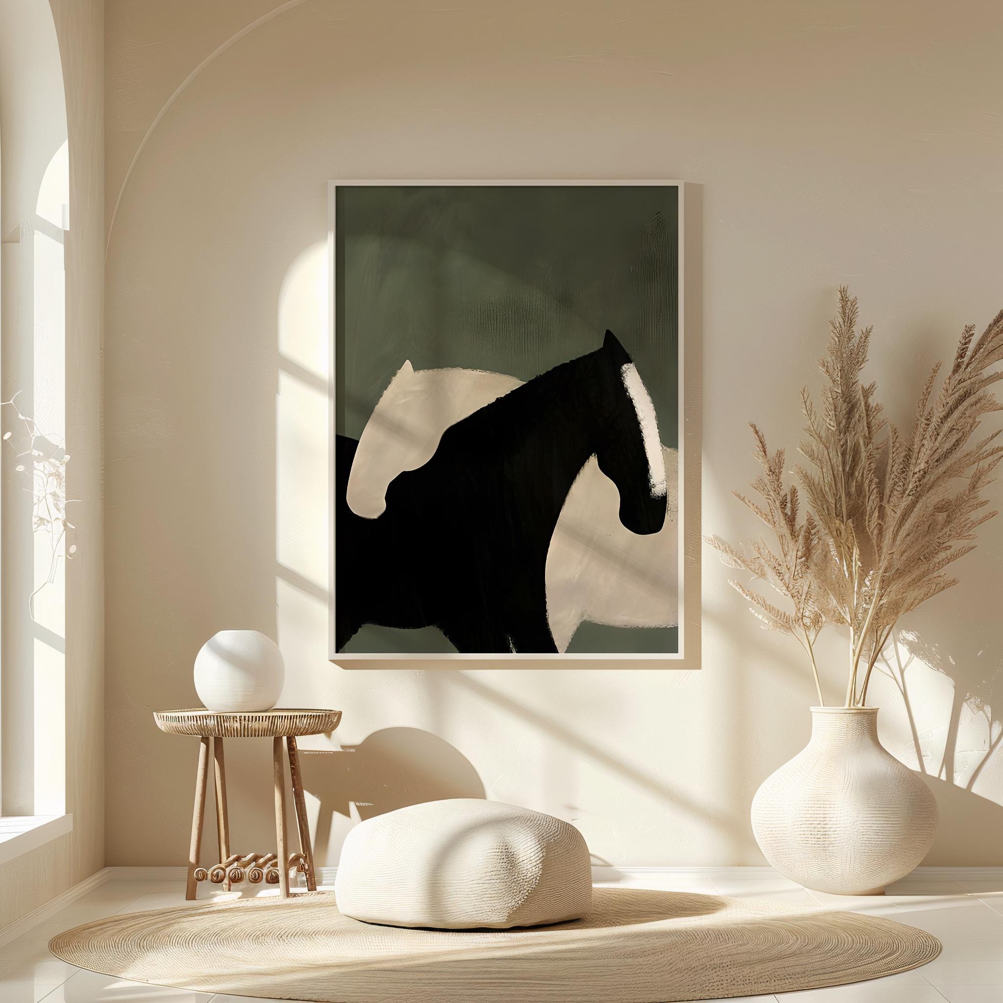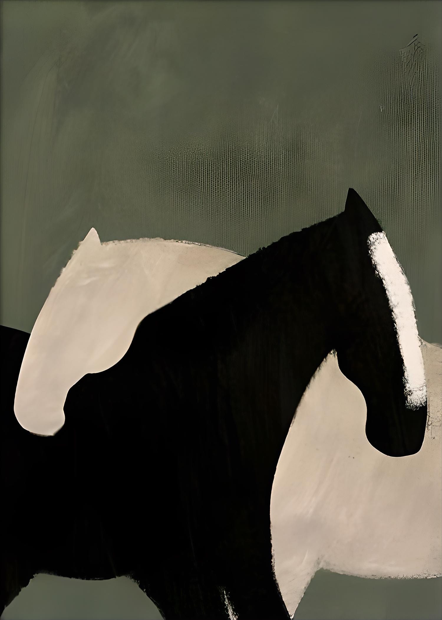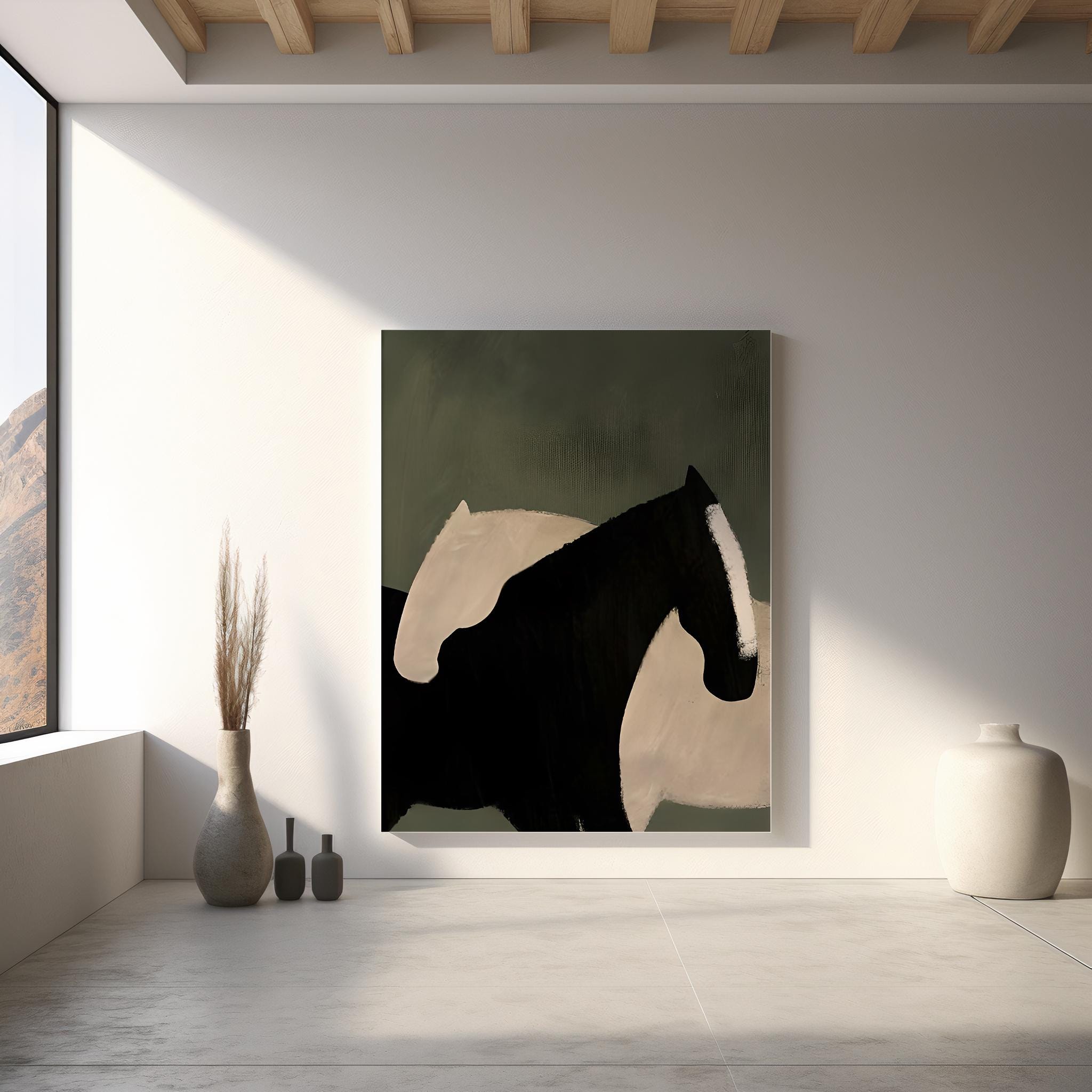 Bring a touch of modern elegance and serene power to your home with this stunning abstract horse painting. Featuring a minimalist design of two horses in contrasting black and off-white against a moody, deep sage green background, this piece is a perfect statement for any contemporary, modern farmhouse, or rustic interior.