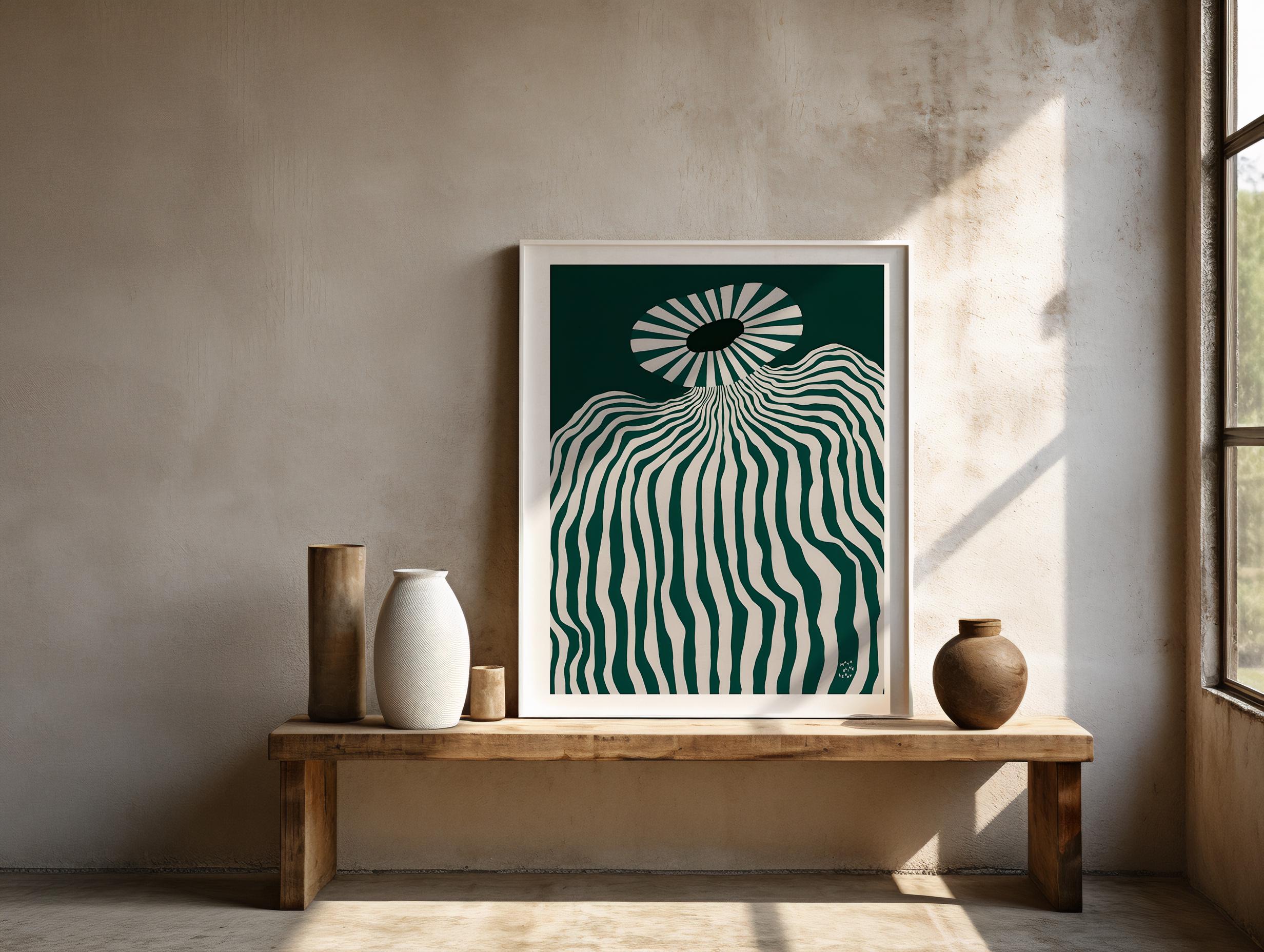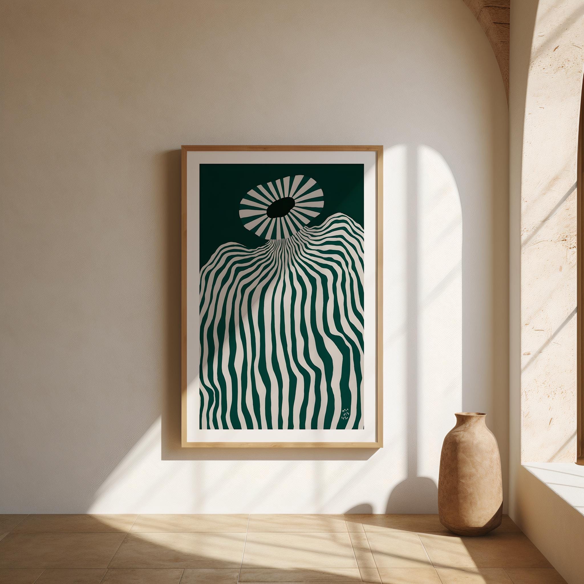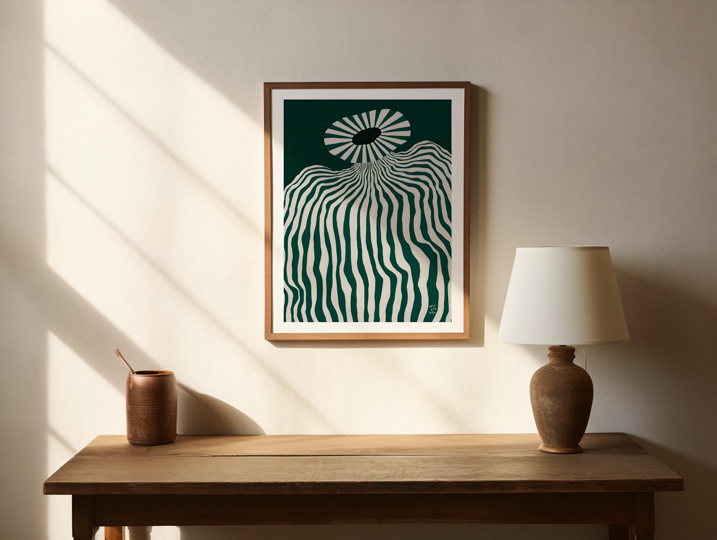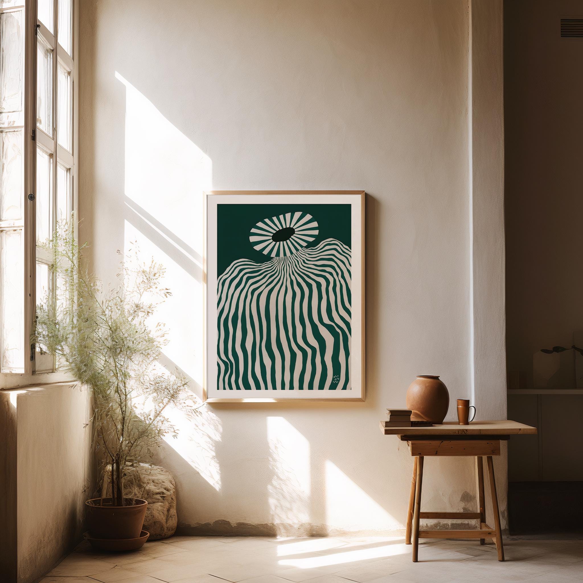 Bring bold modern style into your home with this striking abstract op art print. Featuring flowing green and white wavy lines that create a mesmerizing sense of movement, this piece is perfect for lovers of minimalist, contemporary, and geometric art. Designed to fit seamlessly with modern interiors, this high-resolution digital download can be printed and framed to suit your space.