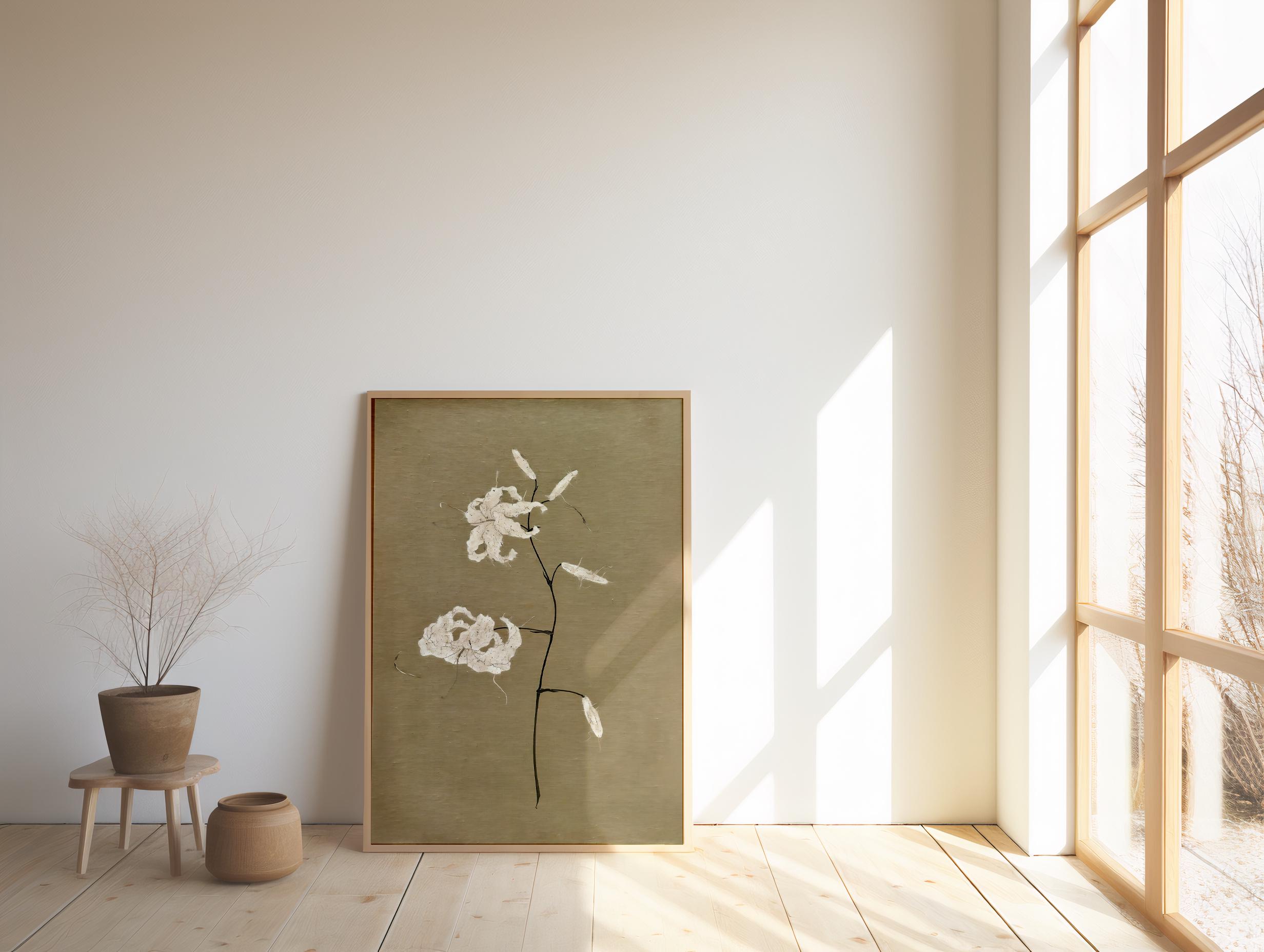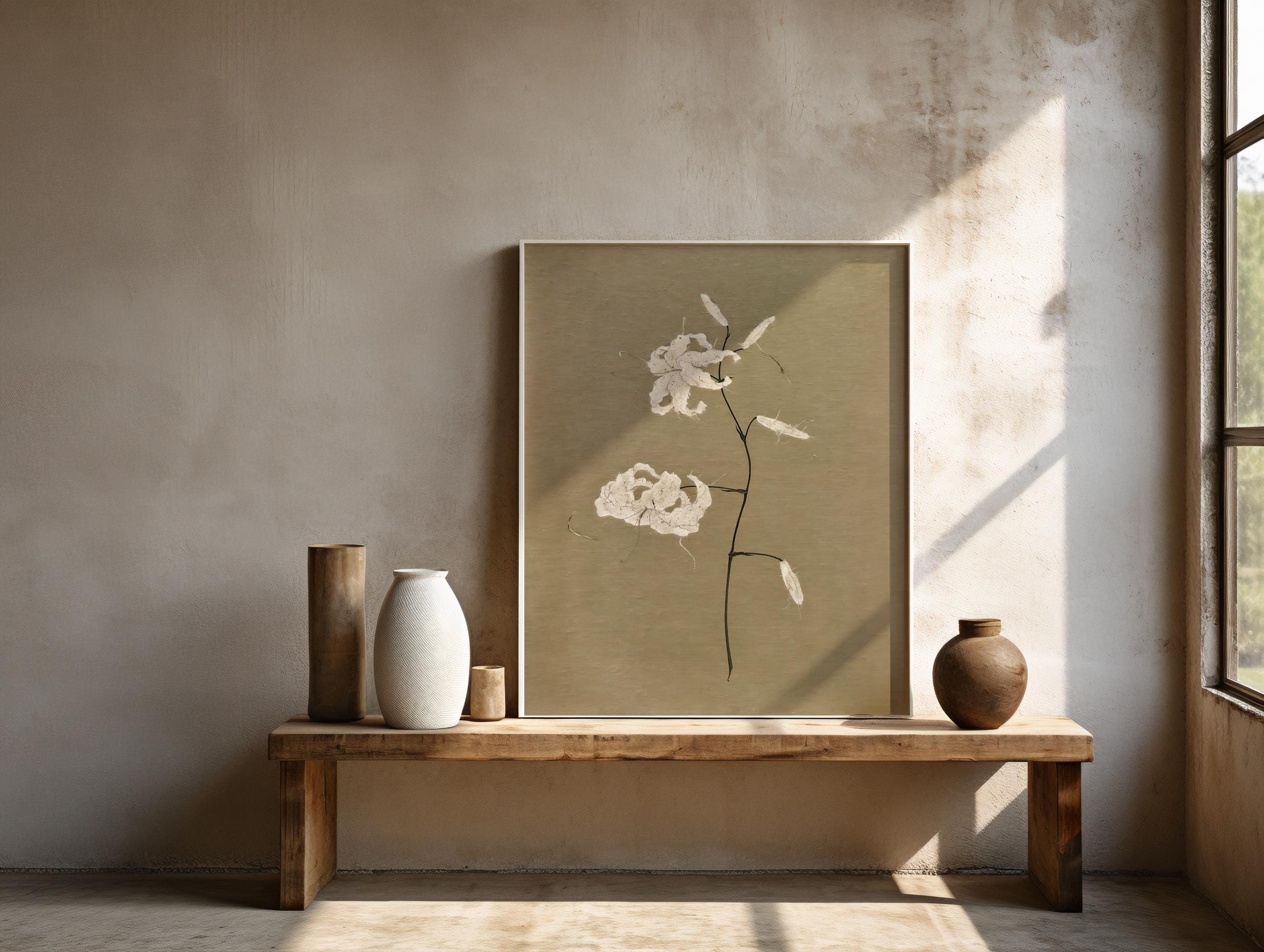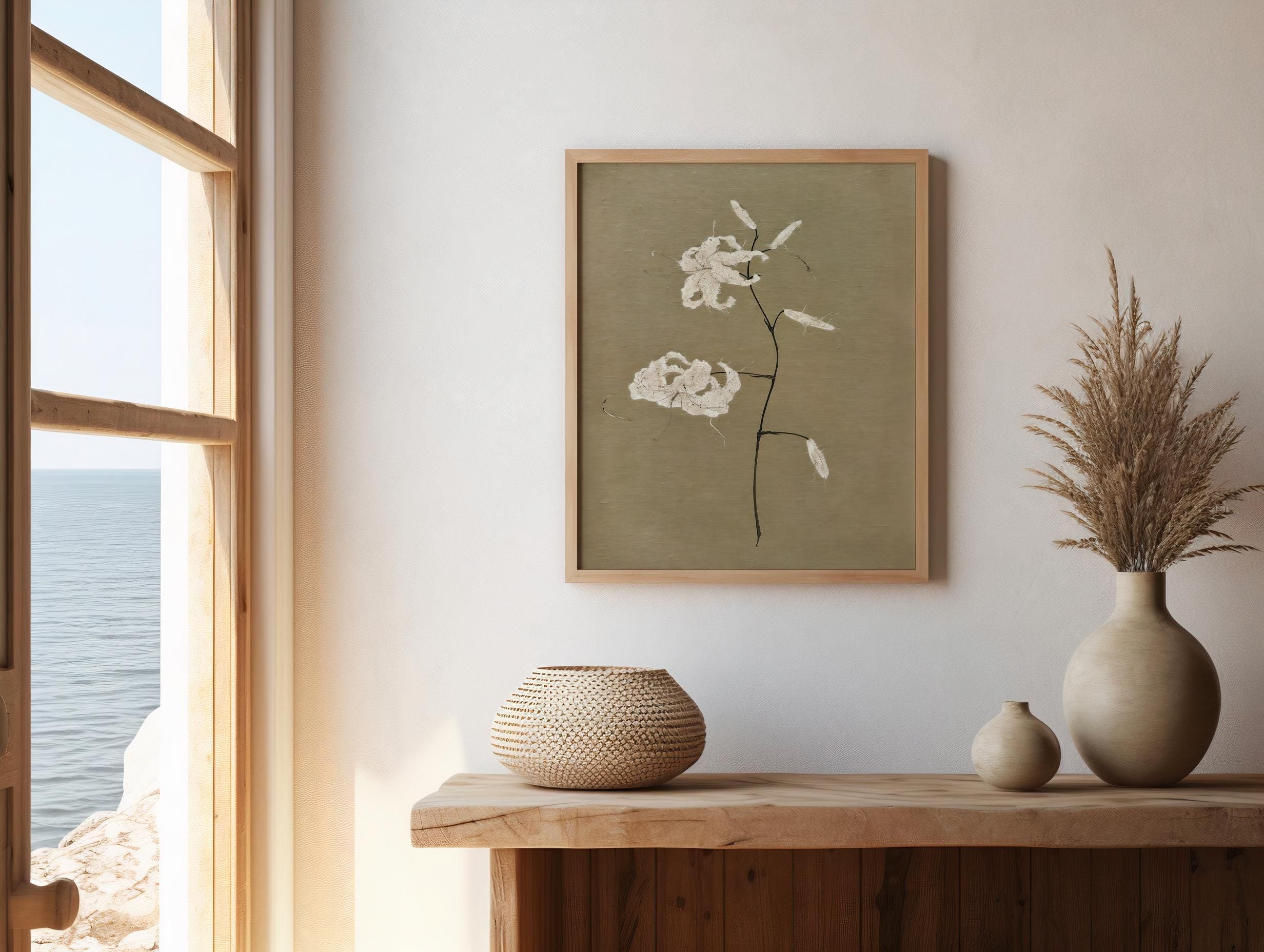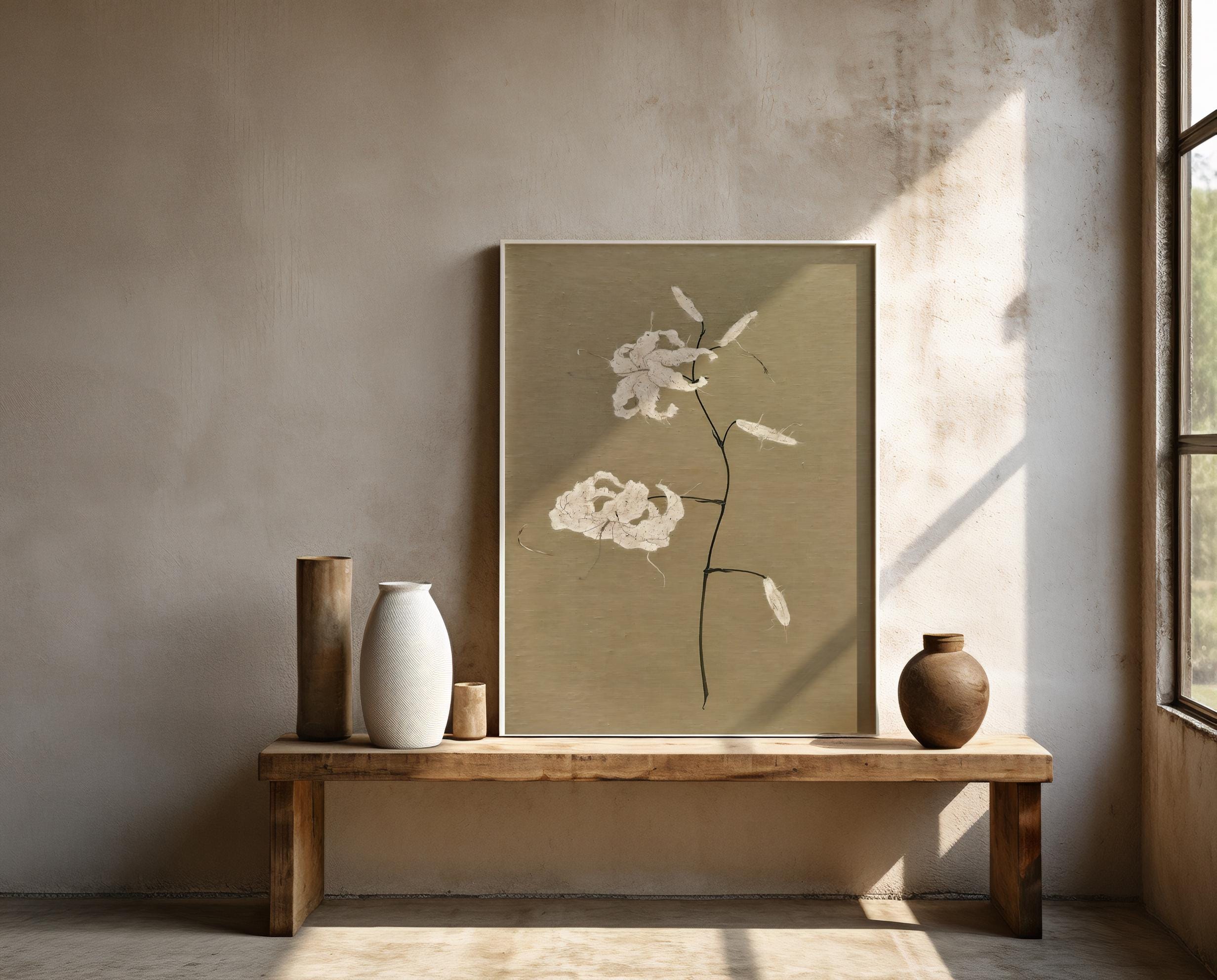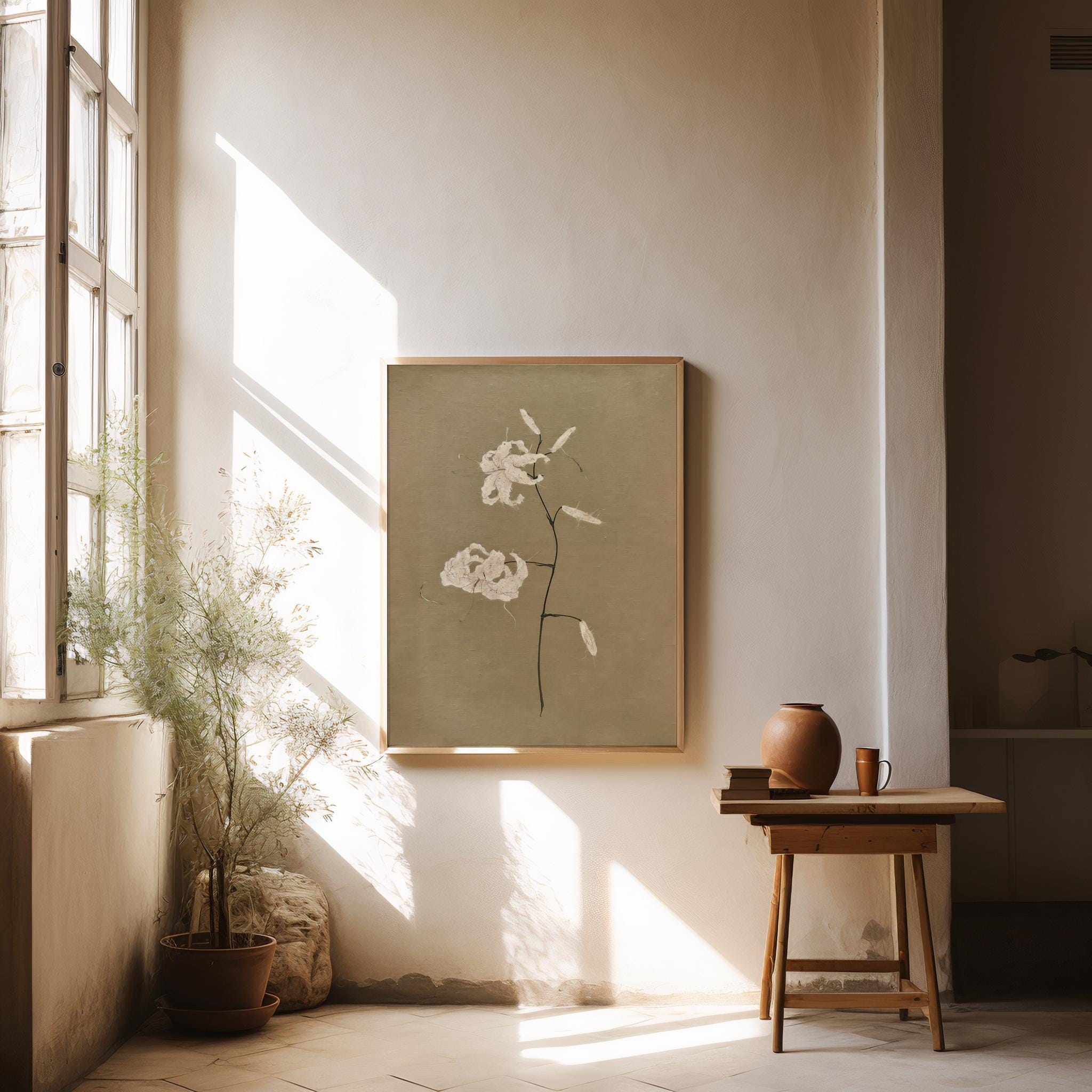 Elegant and timeless, this minimalist floral artwork features delicate white blossoms on a neutral taupe background. The subtle texture and organic lines bring calm and sophistication to any space. Perfect for modern, Japandi, or minimalist interiors — this digital download is ideal for bedrooms, living rooms, or studios seeking serene botanical charm.