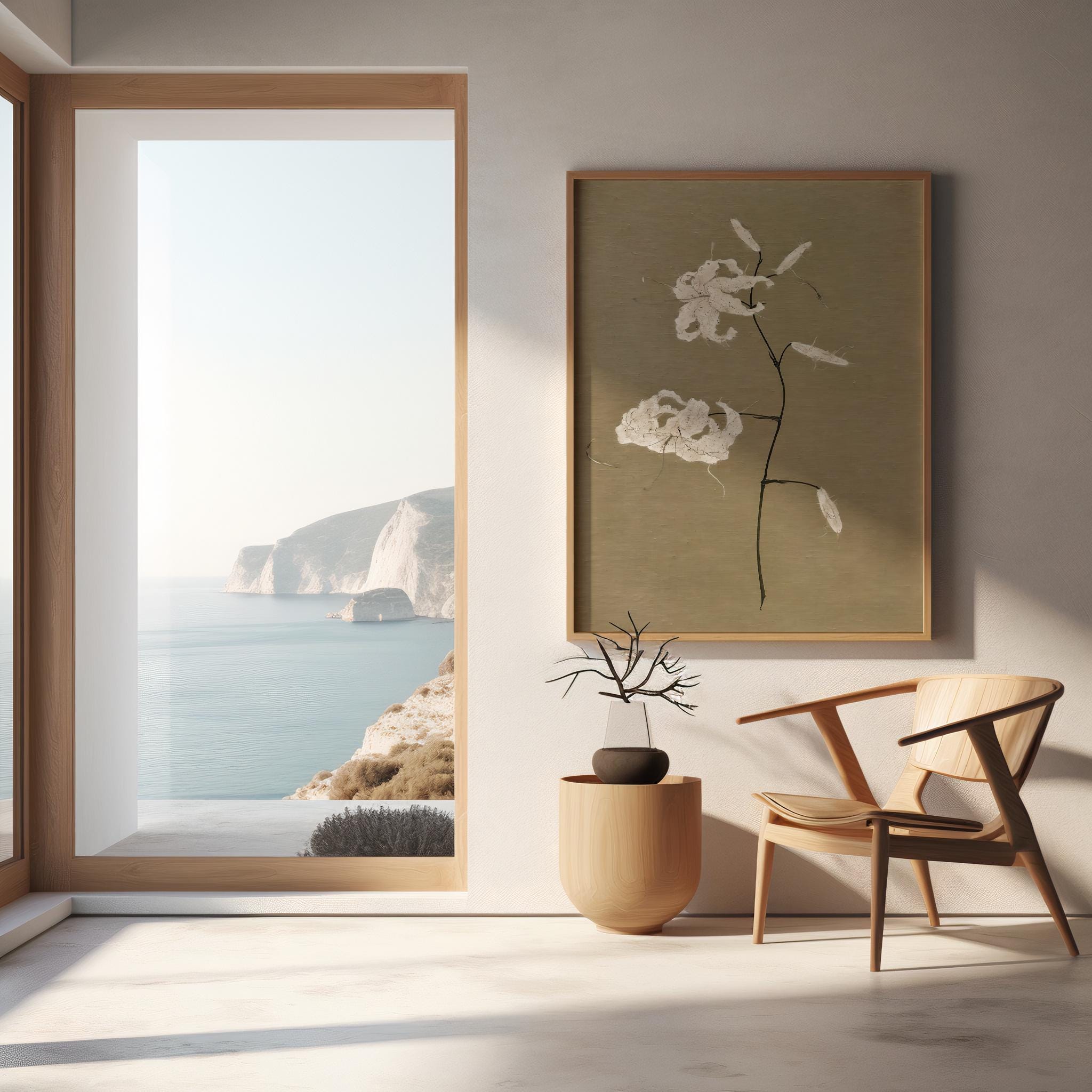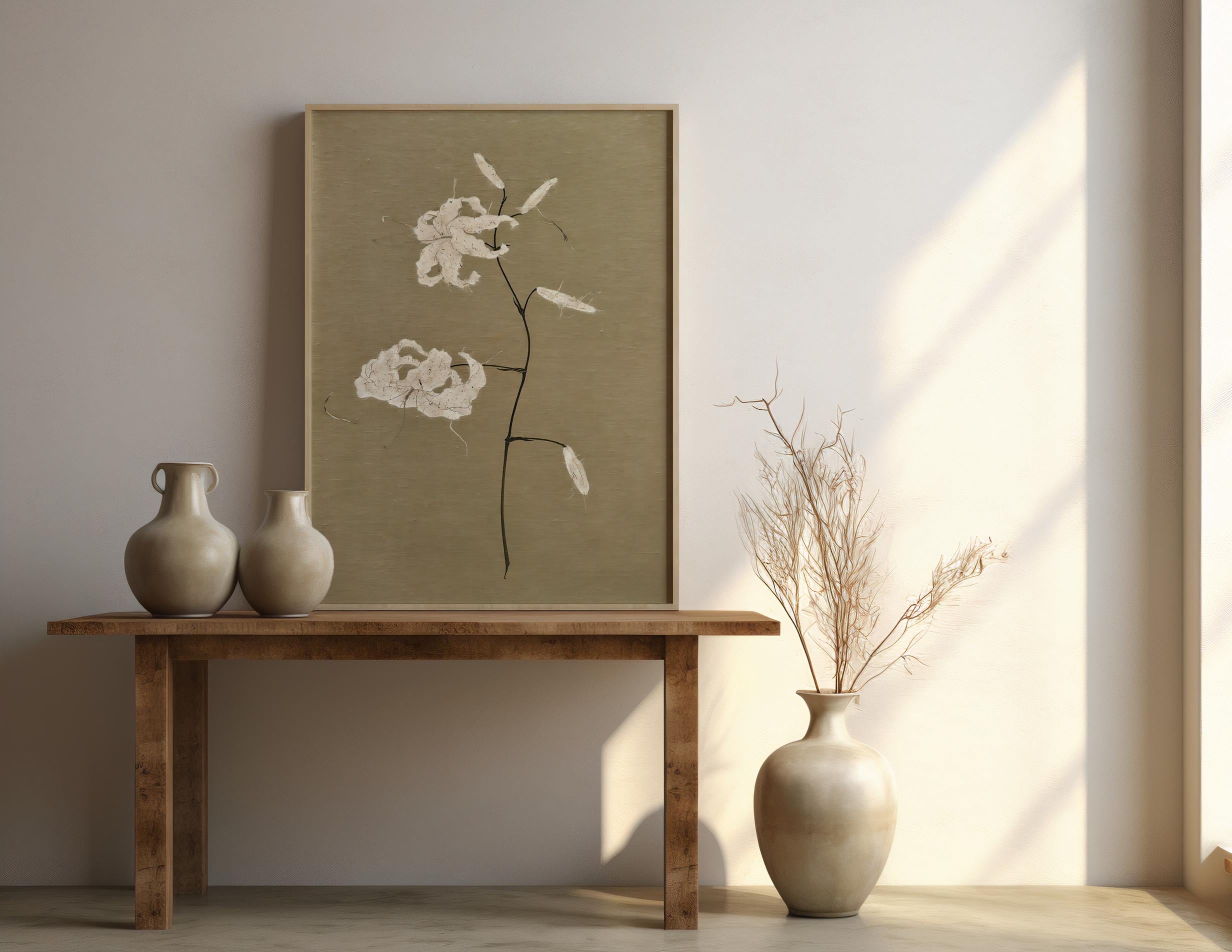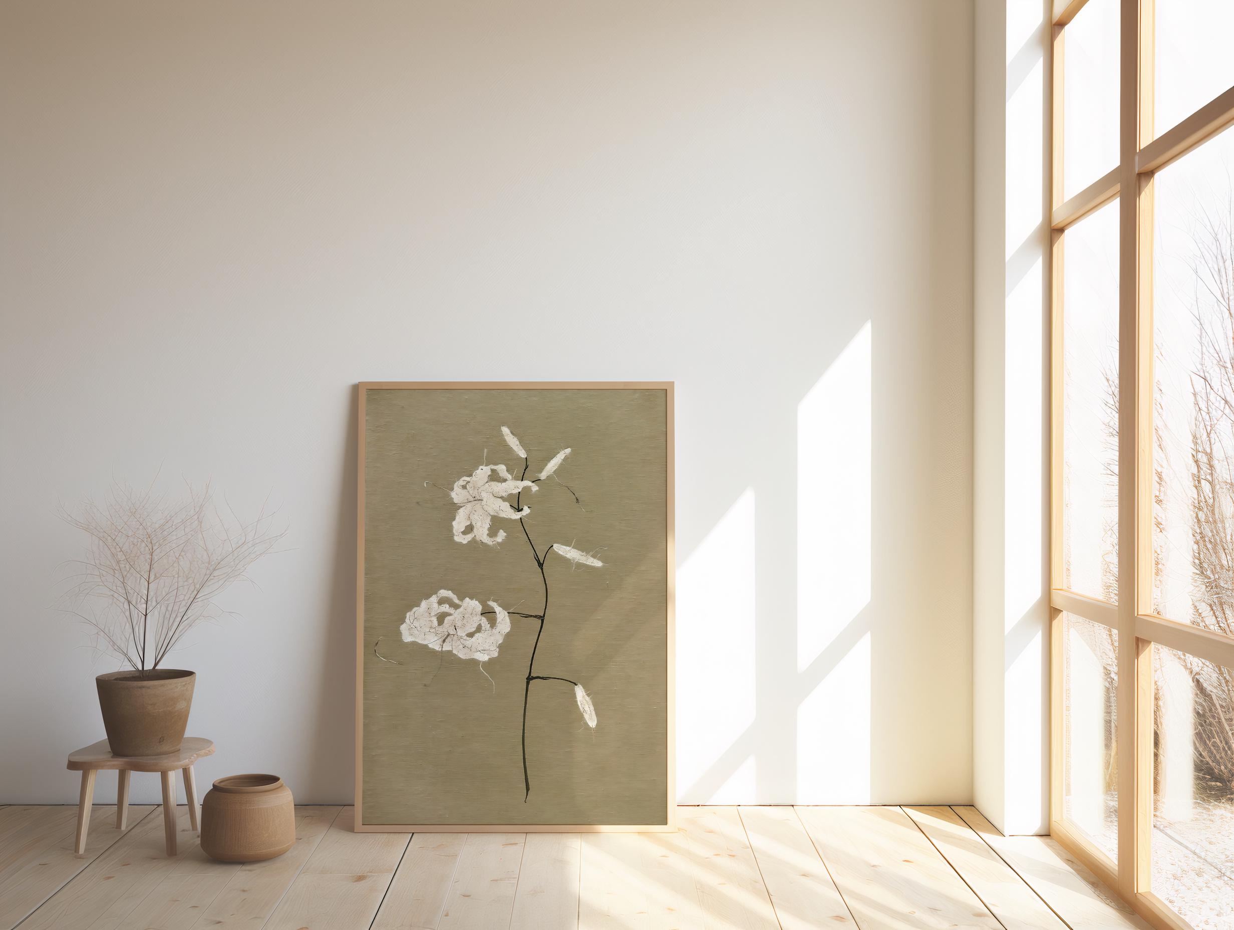 A refined botanical composition featuring delicate ivory blossoms on a warm beige background. Subtle texture and organic detailing create a calm, elevated piece designed for serene interiors inspired by Japandi and organic modern aesthetics.