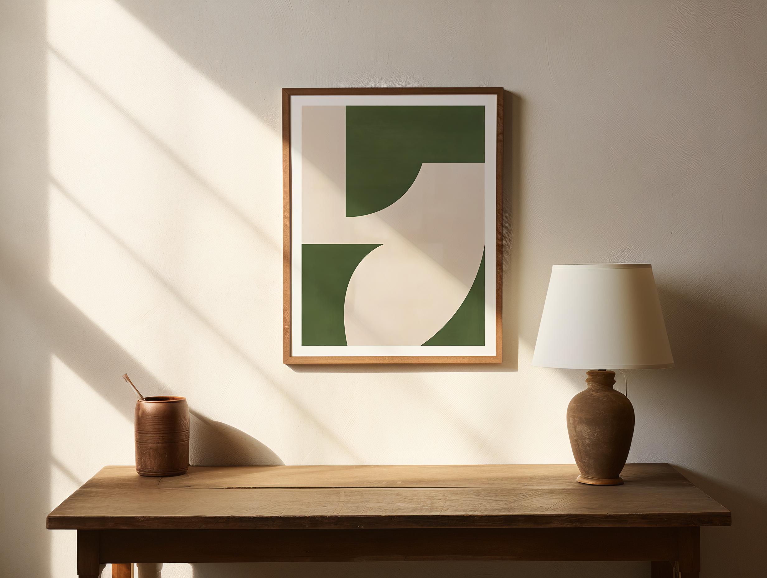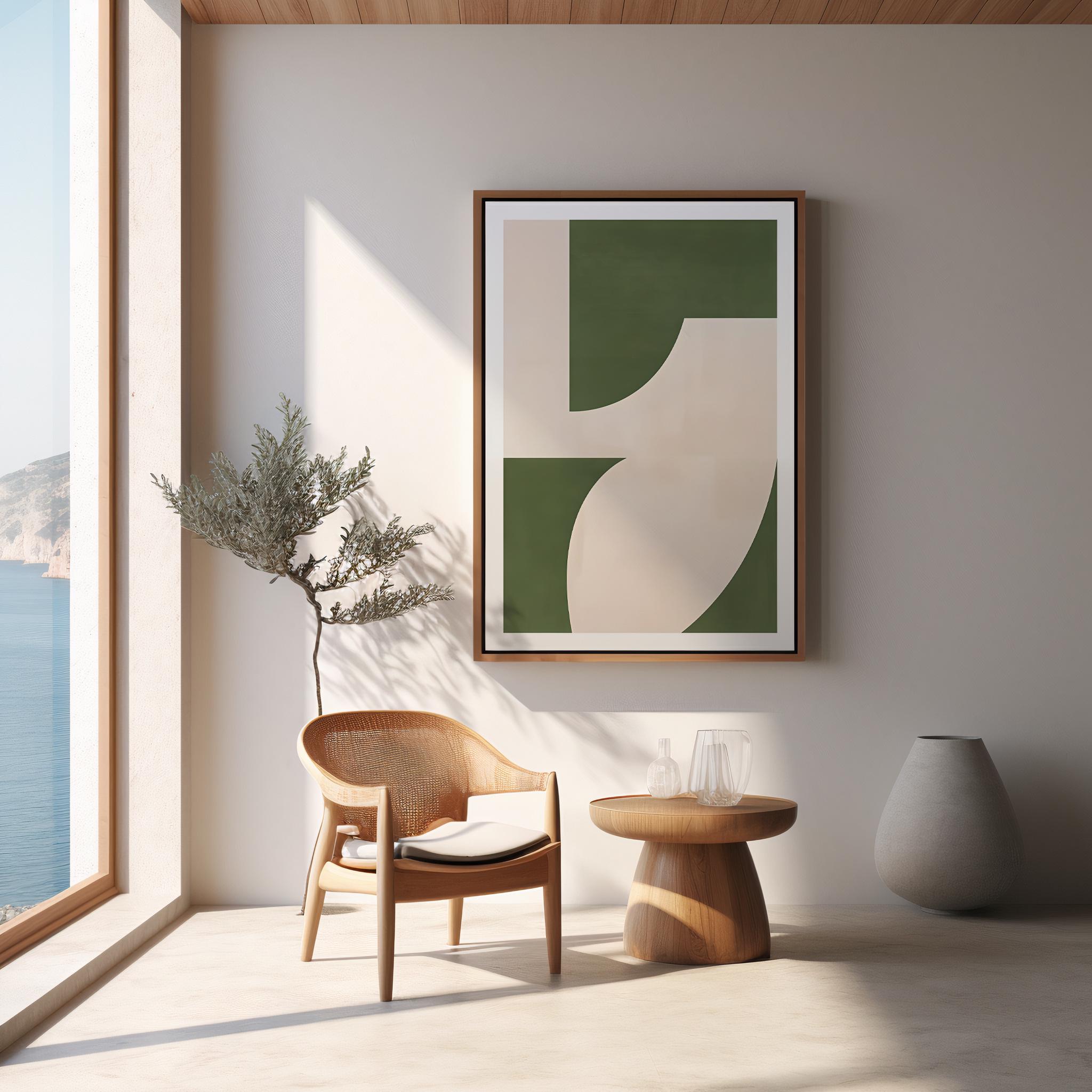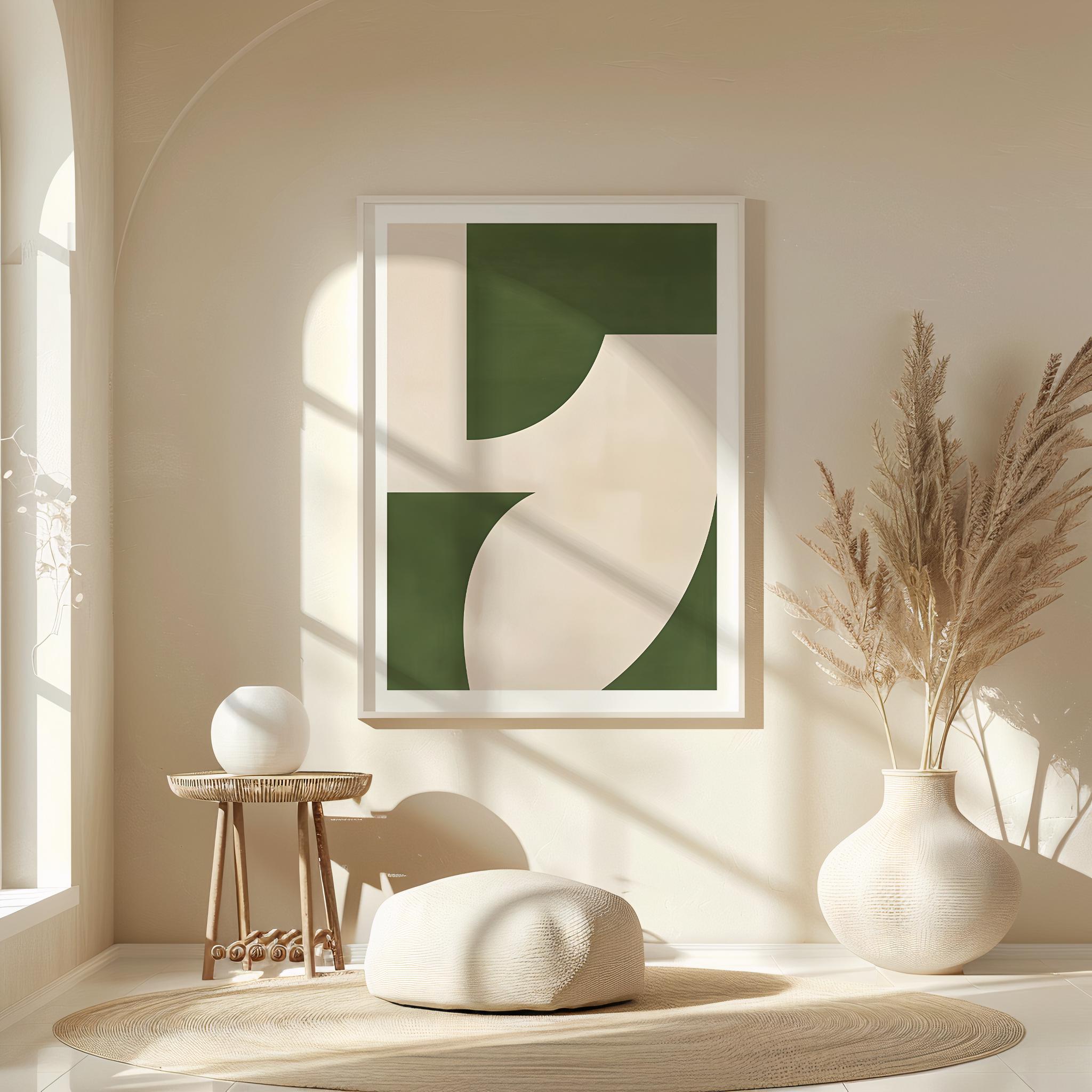 This contemporary geometric artwork combines deep green and soft beige tones in clean, organic shapes — a perfect balance of structure and calm. Ideal for modern, Scandinavian, or mid-century interiors, this abstract digital download adds sophistication and depth to any room. Display it in your living room, bedroom, or workspace for a refined minimalist aesthetic.