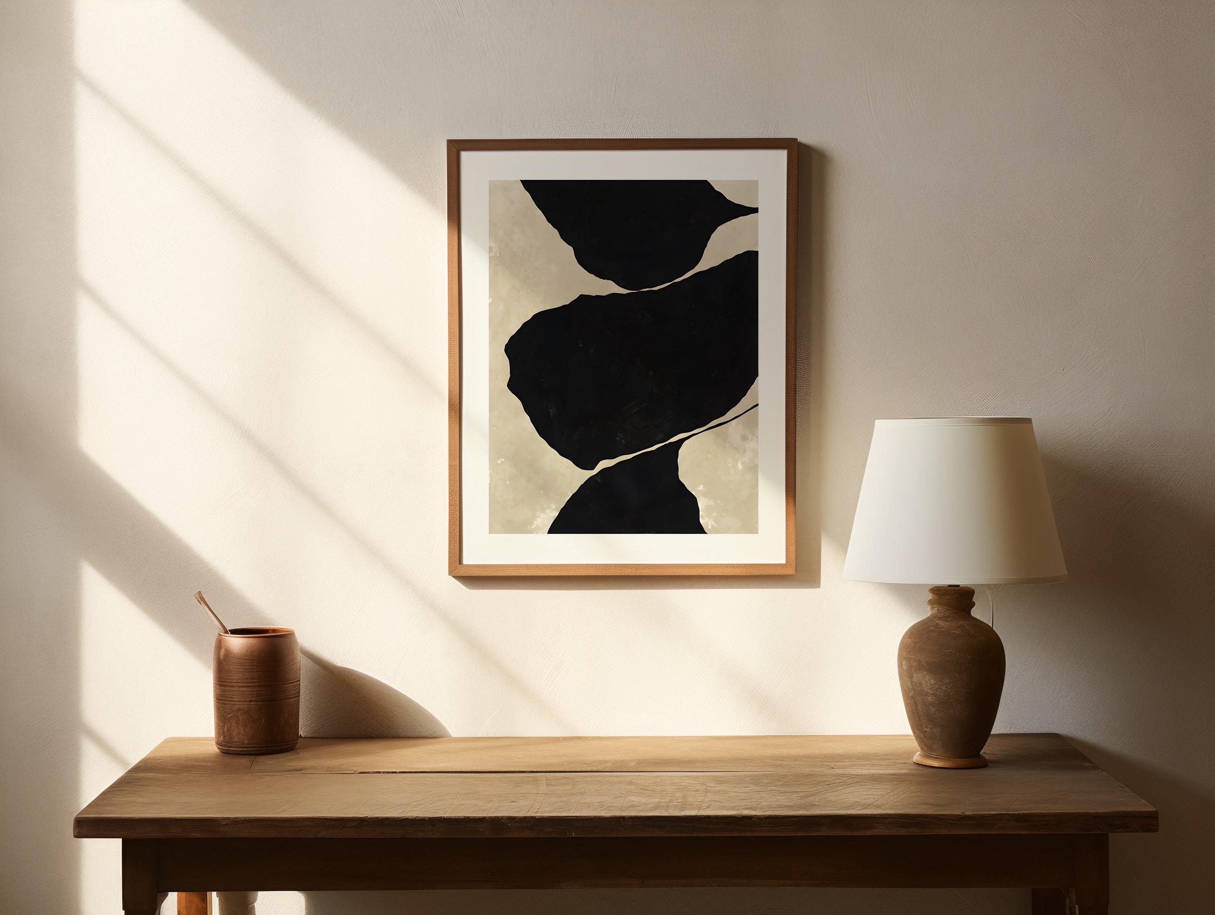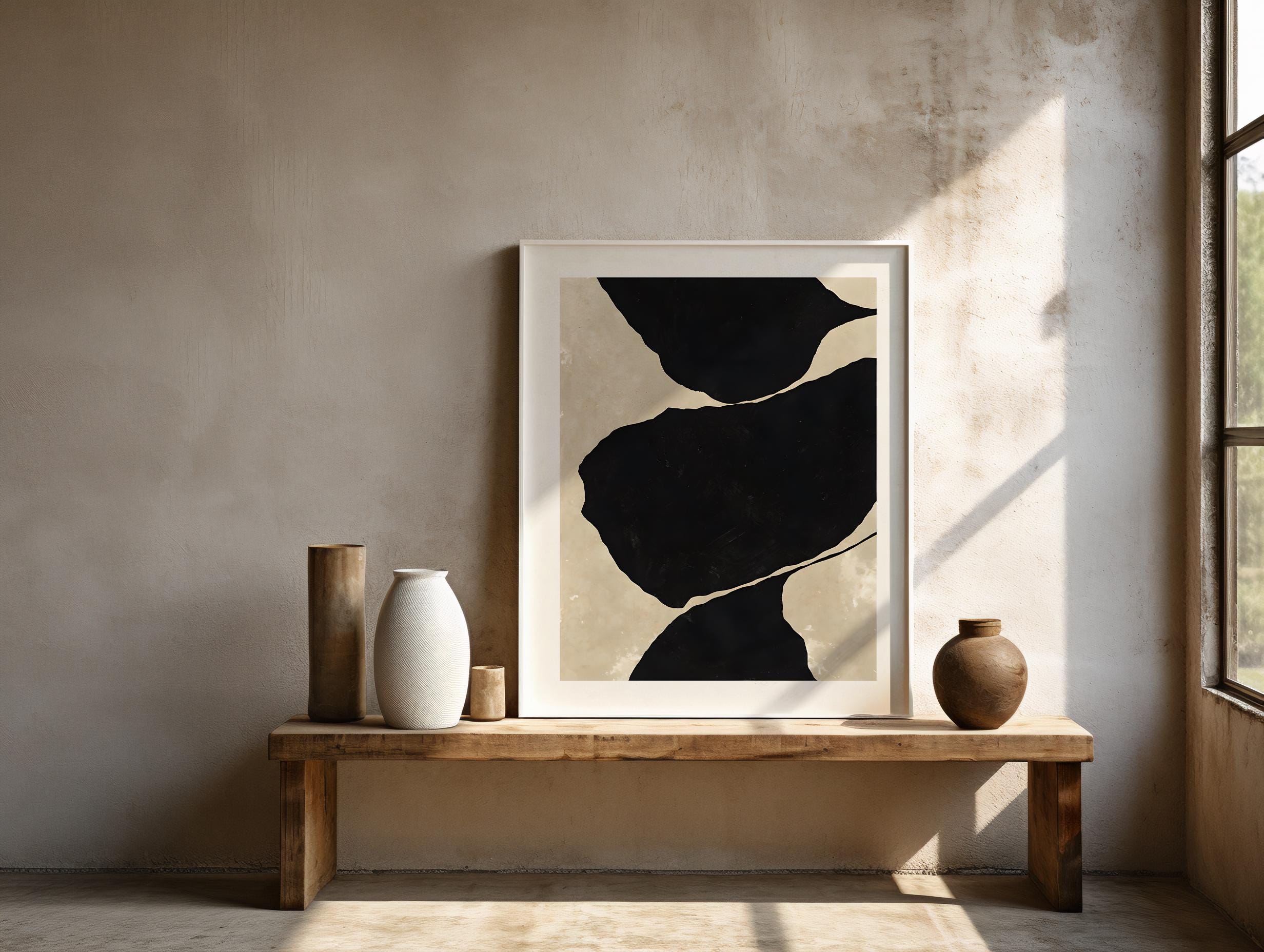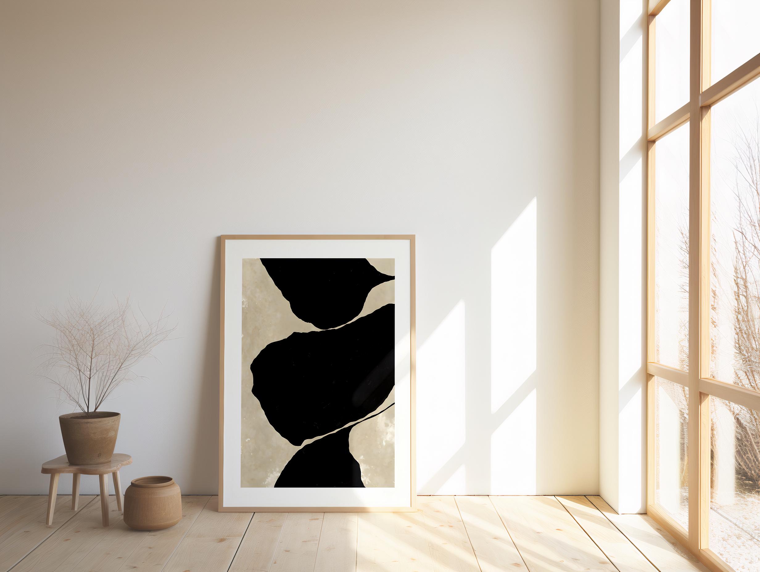 Instantly elevate your space with this minimalist abstract art print. Featuring bold black organic forms over a soft beige background, this digital artwork brings a sense of balance, depth, and sophistication to any room. Perfect for modern, Scandinavian, or Japandi interiors.