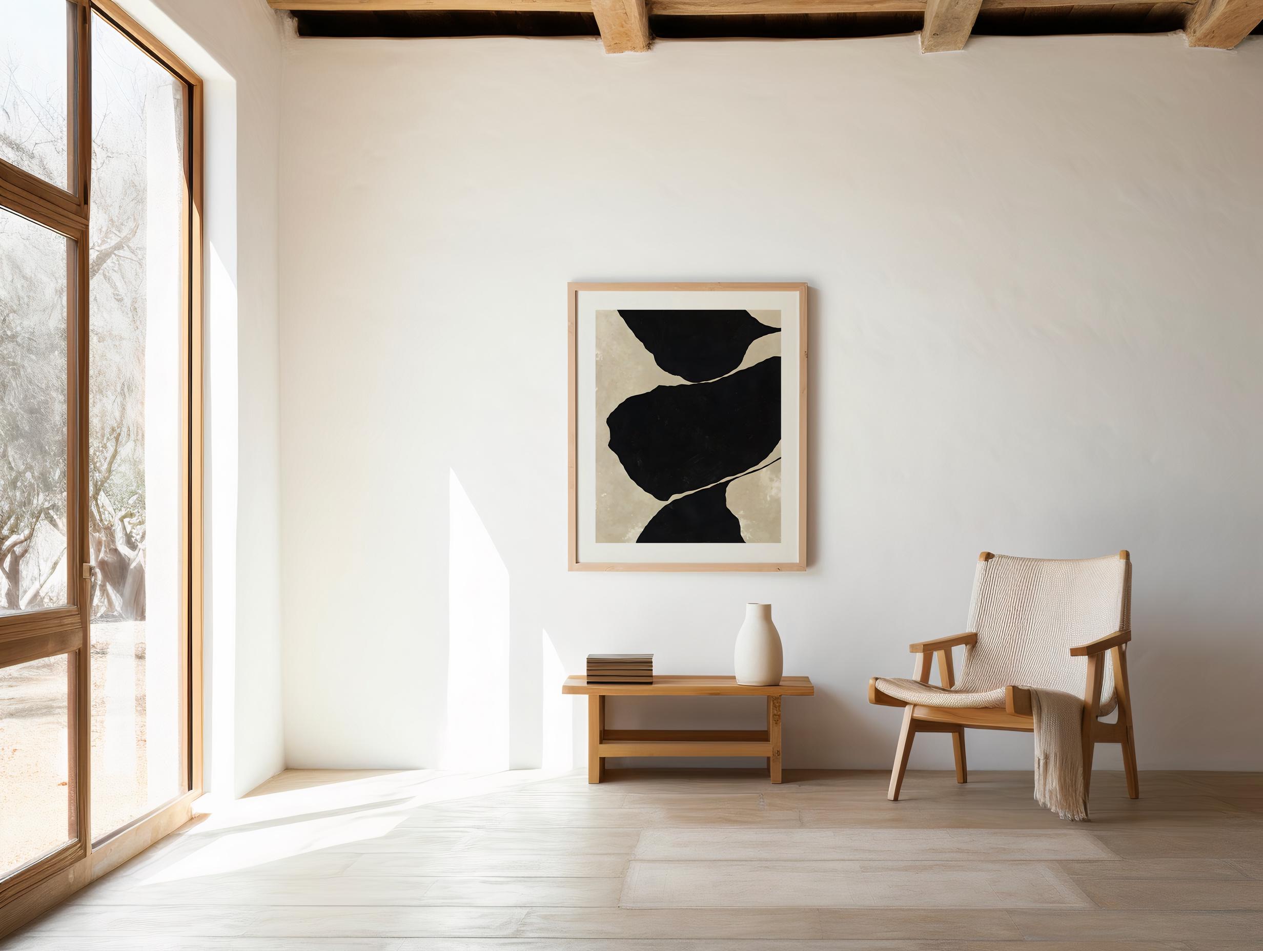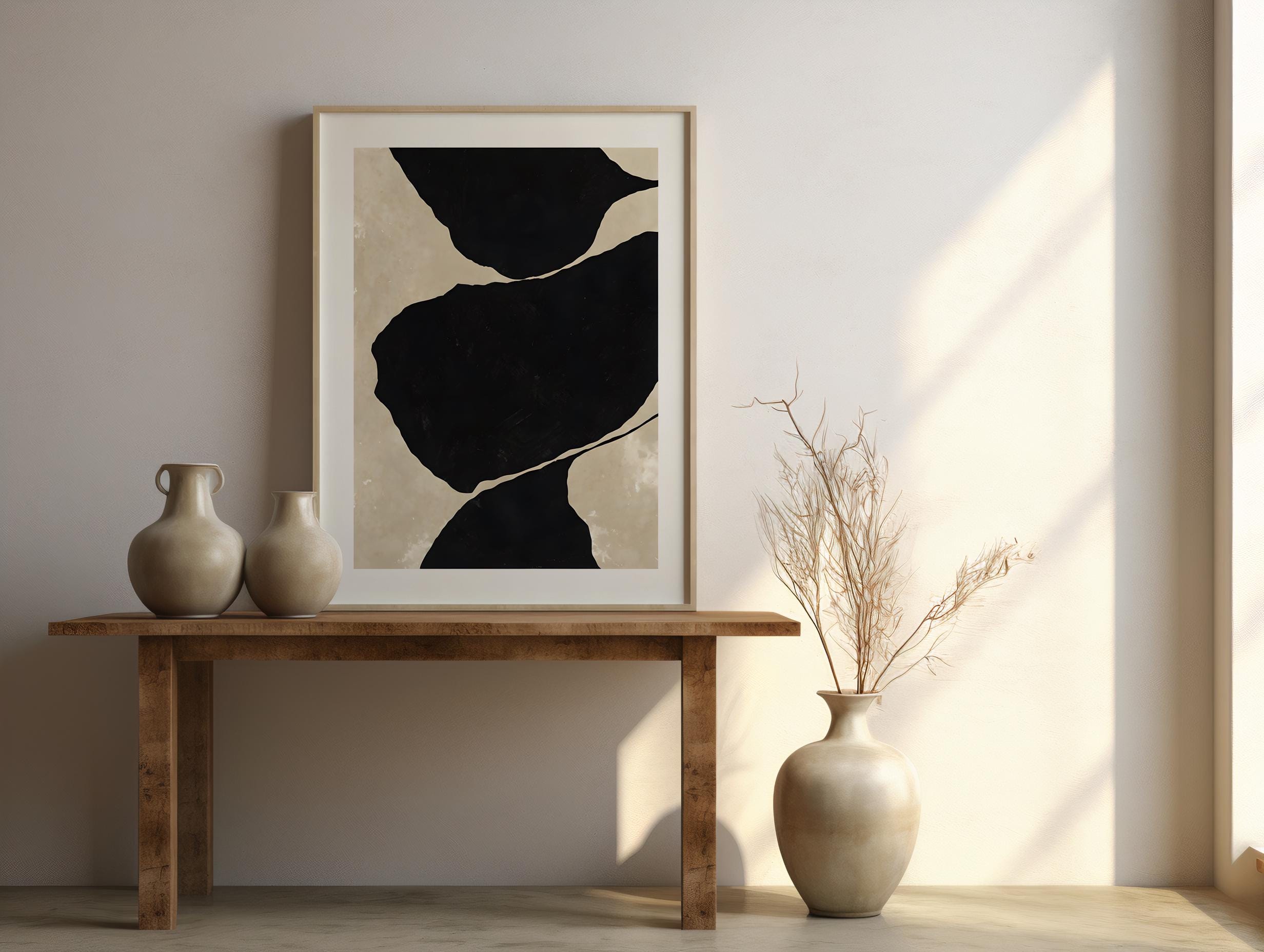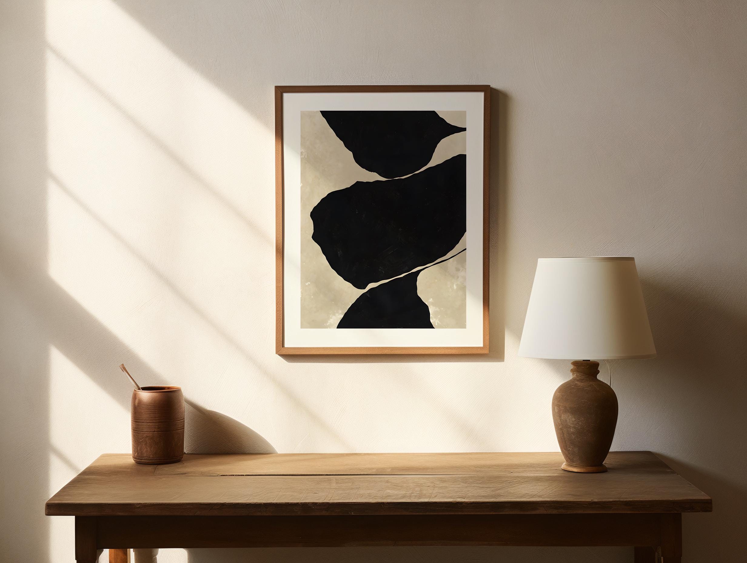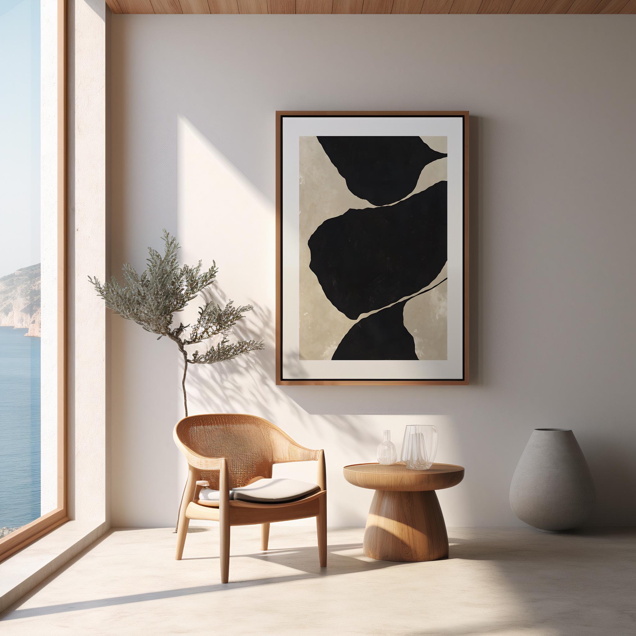 Transform your space with timeless simplicity. This minimalist fine art print combines bold black organic forms with soft neutral tones, creating a statement piece that feels both grounded and sophisticated. The textured beige backdrop and flowing abstract shapes evoke balance and calm, making it the perfect addition to modern, Japandi, or Scandinavian interiors.