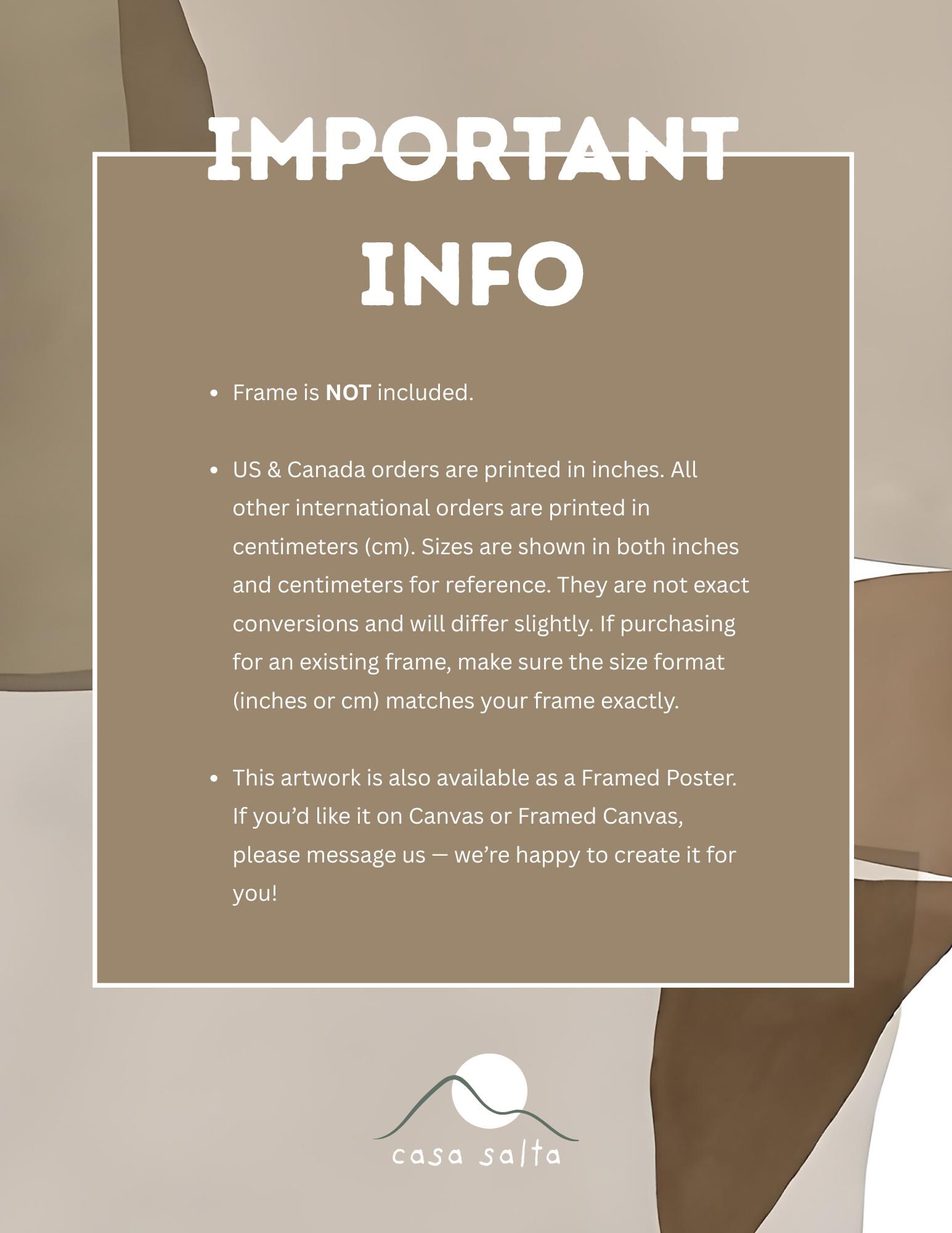 • Posters are produced according to regional print standards — inches in US & Canada, centimeters internationally. Sizes shown in both formats are not exact conversions.