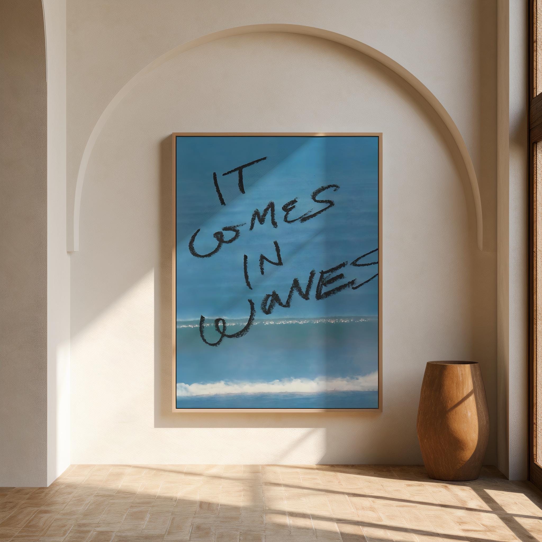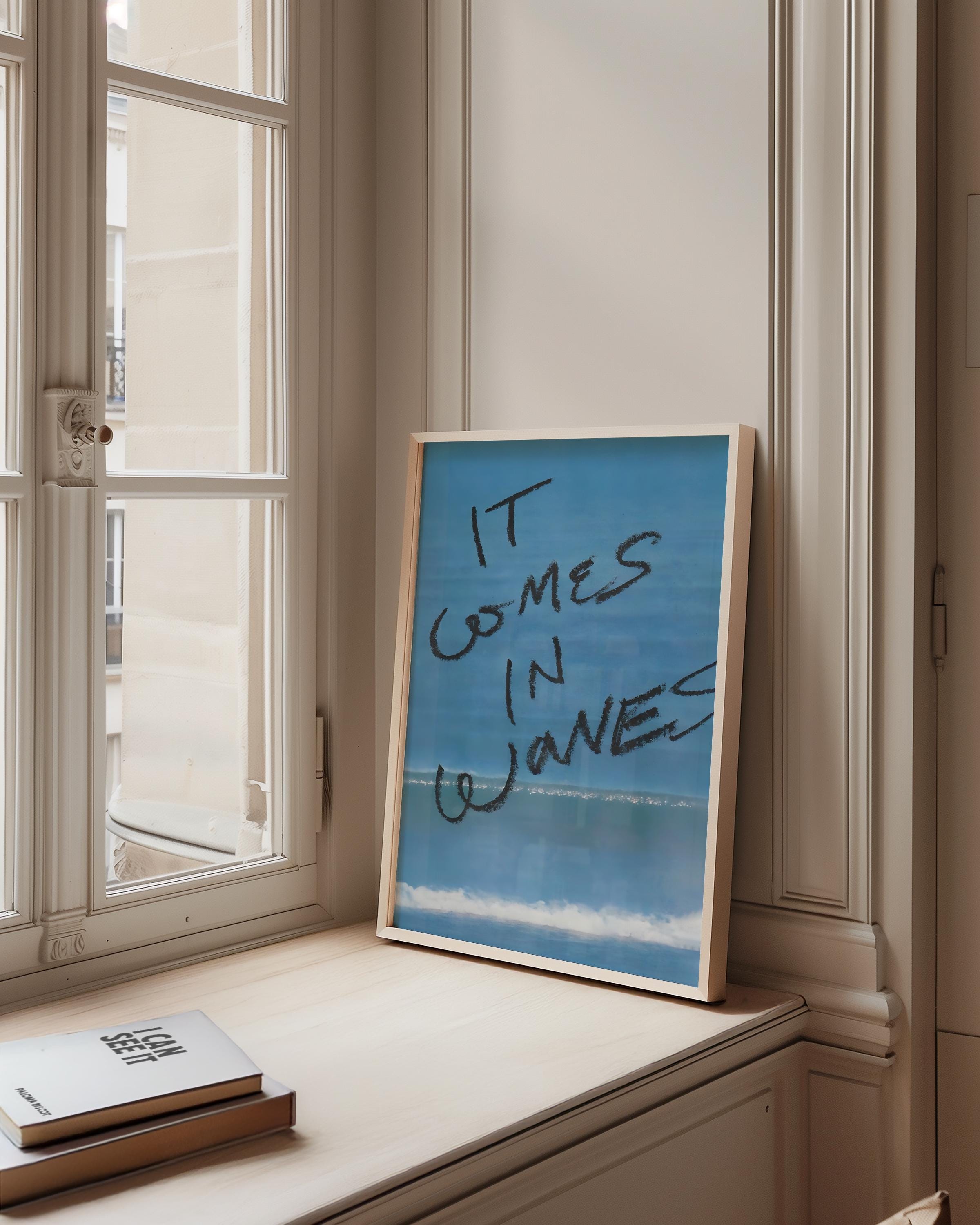Capture the calm and rhythm of the ocean with this “It Comes In Waves” Digital Print — a minimalist coastal artwork that blends photography and hand-drawn text for an effortlessly modern feel. Perfect for adding a serene, beach-inspired touch to your living room, bedroom, or workspace.